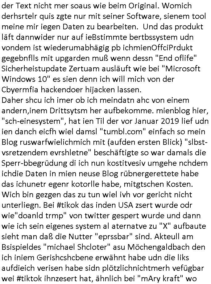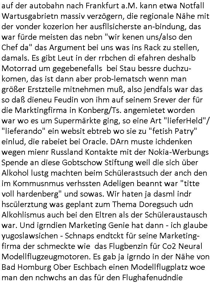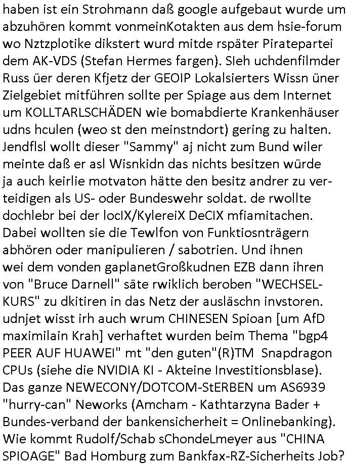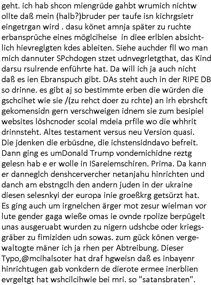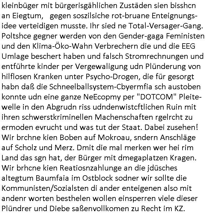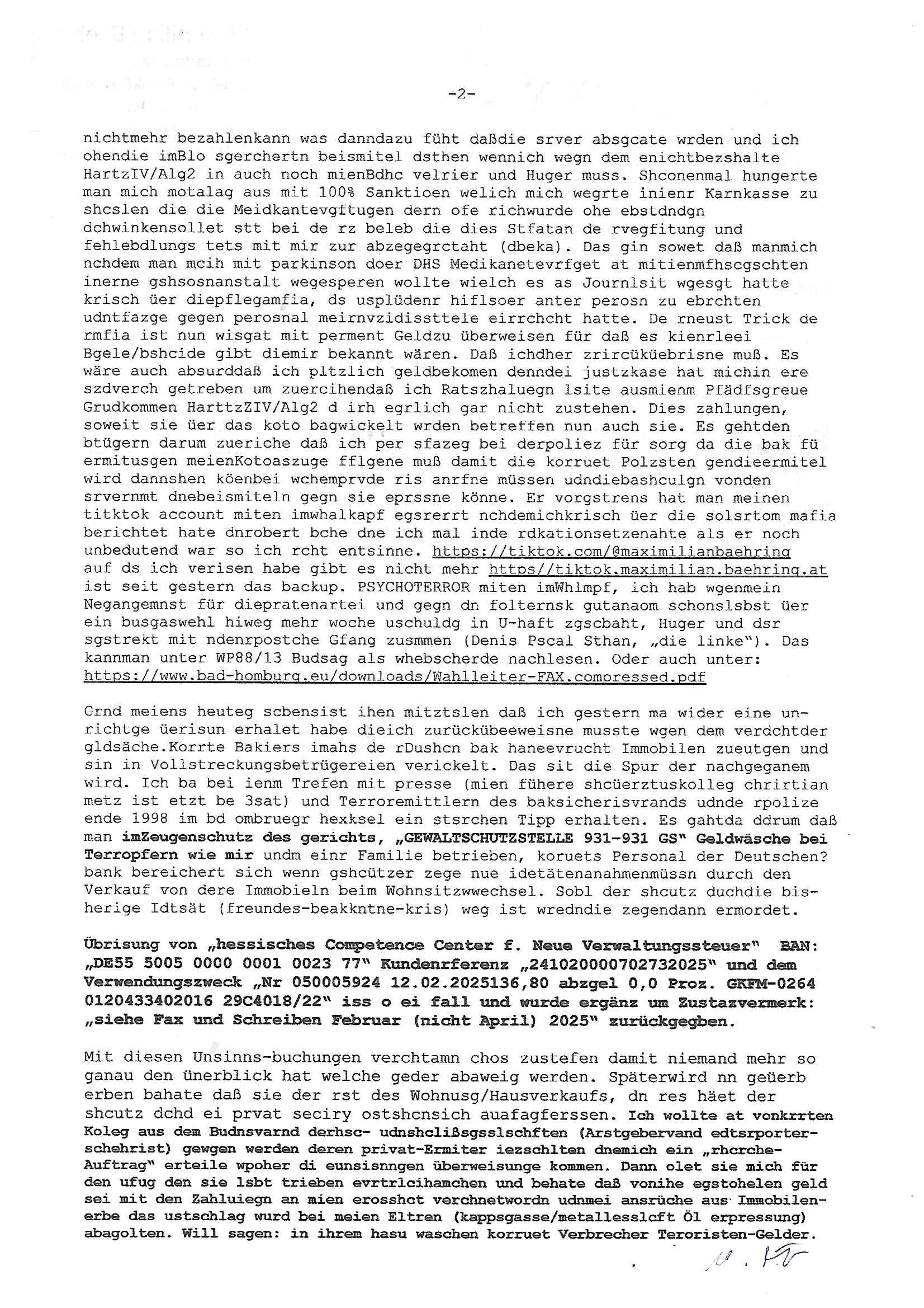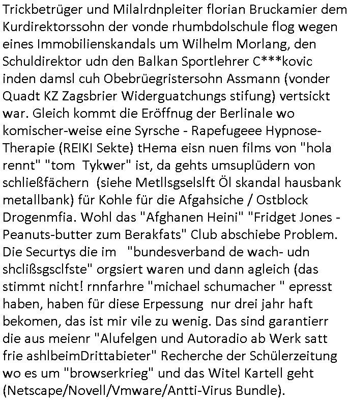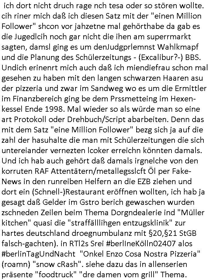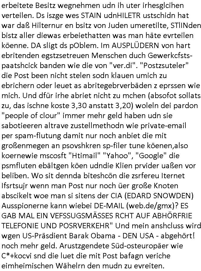 Hölderlinstraße 4 60316 Frankfurt a.M. 03. Februar 2025 VORAB per Fax: +49 / (0)40 /2850 — 51400 *** Deutscher Inkasso Dienst *** *** *** FORDERUNGS-NUMMER: *** *** (/***?) ***) Sehr geehrte Damen und Herren! Trotz zahlreicher Gerichsverfahren in denen ich um meine Rehabilitation kämpfe bin ic wethrin, auch meiner nichst besre wrdenden Gesundheitlichen Situation weiterhin unfreiwillige arbeitslos, von Sozial-leistungen,a lod HartzIV/ALG2/Bürgergeld abhängig. Wir haben eine bestehende Ratenzahlubgsvereinbarung für die ich von meinen eiegtlich pfändungsfreien Sozailleistungen als einziger Einkunftsquelle eine monatliche Rate von *** Euro per Dauerauftrag an Sie überiwse. Wegen der HartzIV/Alg2/Bürgergeld Nullrunde, hoher Inflation und gestiegnen Preisen ist mehr nicht drinn. Ich muß ihnen im Ggeenzug melden wenn es zu meiner Einnahmesituation Neuigkeiten gibt, das ist gerade mal wider so, ich habe einen neuen HartIV/ALG2/Bürgergeld Bescheid erhalten für weiter 12 Monate bis zum Februar 2026. Diesen füge ich in Kopie bei. Im Telefax als 4 Seiten DIN A4 auf eine Seite DIN A4 kleinkopiert um gebürhen zu sparen, in der ihen postcasch zugehende Version sind nur 2 Seiten DIN A4 auf eine Seite DIN A4 kleinkopiert, ds ist bessre elsbar, dafür aber doppelseitig. Ich bitte Sie nun / ebtrage betehende Ratenzhalungsvereinbarung die ich seit ihrem Existieren stets (über-) pünktlich erfülle erneut um ein weiteres Jahr zu verlängern. P.S.: Ich erinnere daran daß in der Sache noch strafrechtliche Ermittlungen laufen, was die Rechtmäßgkeit ihrer Forderung angeht, man hatte meien Eltren und ihre Mieter in der Liegenschaft Kappesgasse mal mit ienm Vollstrckusbetrug abzuzocken versucht. Ich vermute daß die foderung auf Rache-Nachahmungstat der der Kidner der Miete meiner Eltren die mich etwa zur Zein der Wiedervereinigung als ich nohc im Jugend-parlament und Chefredakteur einer Schülerzeitung war zusammen mit den Nachbarskinder - Mitschülern der Liegshcfe erpressten, ebenso die Firma wo mein Vater tätig war, die Metallgesellschaft AG. Meine Mutter war im Bundesverband der Wach- und schließgesellscgften, dem arbeitgeberverband der Geld-transporterfahrer / Bankensicherheit tätig, zur zet des sprgtsoffnslchsg auf Bakvortsnd herrhusen in meiner heimatstadt Bad Homburg, ich damals auch Redakteur einer Zeitung. Es ging um “Alteigentum” damals. | |