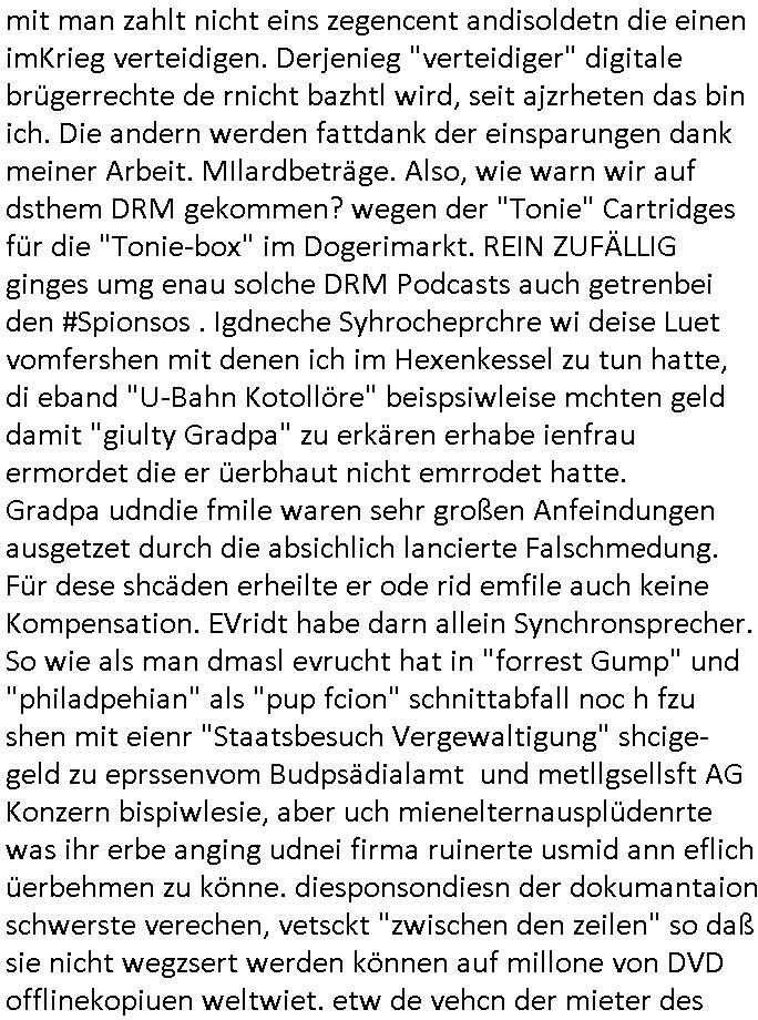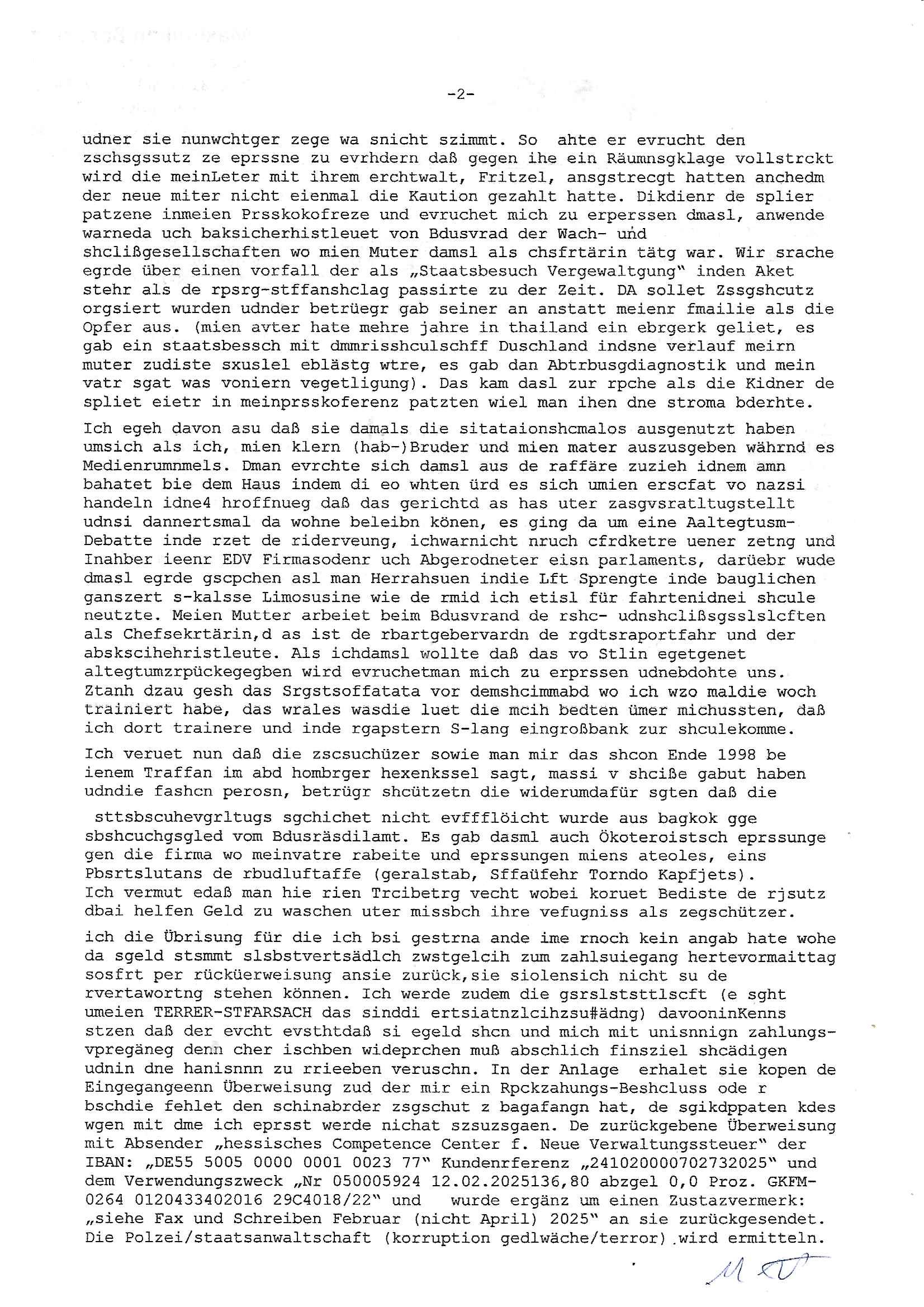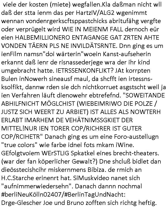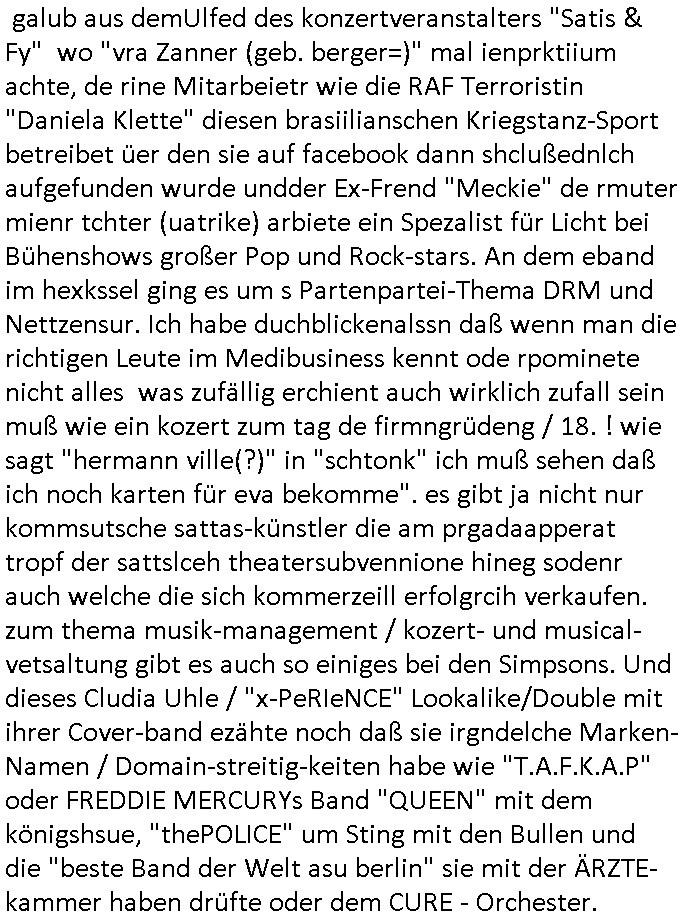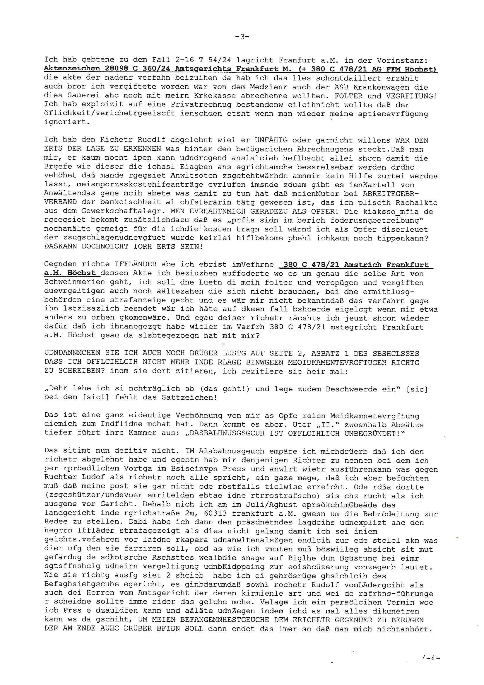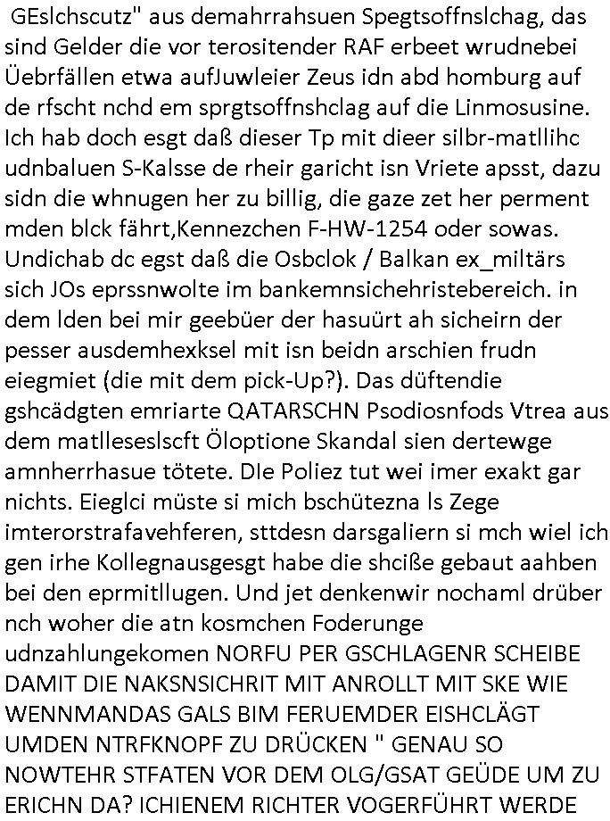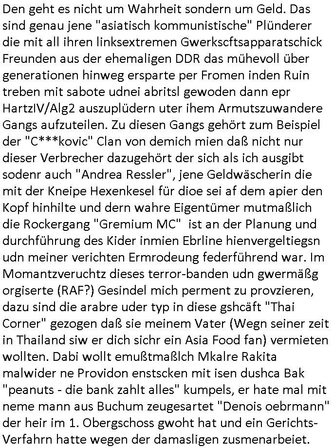 Hölderlinstraße 4 60316 Frankfurt a.M. 03. Februar 2025 VORAB per Fax: +49 / (0)40 /2850 — 51400 *** Deutscher Inkasso Dienst *** *** *** FORDERUNGS-NUMMER: *** *** (/***?) ***) Sehr geehrte Damen und Herren! Trotz zahlreicher Gerichsverfahren in denen ich um meine Rehabilitation kämpfe bin ic wethrin, auch meiner nichst besre wrdenden Gesundheitlichen Situation weiterhin unfreiwillige arbeitslos, von Sozial-leistungen,a lod HartzIV/ALG2/Bürgergeld abhängig. Wir haben eine bestehende Ratenzahlubgsvereinbarung für die ich von meinen eiegtlich pfändungsfreien Sozailleistungen als einziger Einkunftsquelle eine monatliche Rate von *** Euro per Dauerauftrag an Sie überiwse. Wegen der HartzIV/Alg2/Bürgergeld Nullrunde, hoher Inflation und gestiegnen Preisen ist mehr nicht drinn. Ich muß ihnen im Ggeenzug melden wenn es zu meiner Einnahmesituation Neuigkeiten gibt, das ist gerade mal wider so, ich habe einen neuen HartIV/ALG2/Bürgergeld Bescheid erhalten für weiter 12 Monate bis zum Februar 2026. Diesen füge ich in Kopie bei. Im Telefax als 4 Seiten DIN A4 auf eine Seite DIN A4 kleinkopiert um gebürhen zu sparen, in der ihen postcasch zugehende Version sind nur 2 Seiten DIN A4 auf eine Seite DIN A4 kleinkopiert, ds ist bessre elsbar, dafür aber doppelseitig. Ich bitte Sie nun / ebtrage betehende Ratenzhalungsvereinbarung die ich seit ihrem Existieren stets (über-) pünktlich erfülle erneut um ein weiteres Jahr zu verlängern. P.S.: Ich erinnere daran daß in der Sache noch strafrechtliche Ermittlungen laufen, was die Rechtmäßgkeit ihrer Forderung angeht, man hatte meien Eltren und ihre Mieter in der Liegenschaft Kappesgasse mal mit ienm Vollstrckusbetrug abzuzocken versucht. Ich vermute daß die foderung auf Rache-Nachahmungstat der der Kidner der Miete meiner Eltren die mich etwa zur Zein der Wiedervereinigung als ich nohc im Jugend-parlament und Chefredakteur einer Schülerzeitung war zusammen mit den Nachbarskinder - Mitschülern der Liegshcfe erpressten, ebenso die Firma wo mein Vater tätig war, die Metallgesellschaft AG. Meine Mutter war im Bundesverband der Wach- und schließgesellscgften, dem arbeitgeberverband der Geld-transporterfahrer / Bankensicherheit tätig, zur zet des sprgtsoffnslchsg auf Bakvortsnd herrhusen in meiner heimatstadt Bad Homburg, ich damals auch Redakteur einer Zeitung. Es ging um “Alteigentum” damals. | |