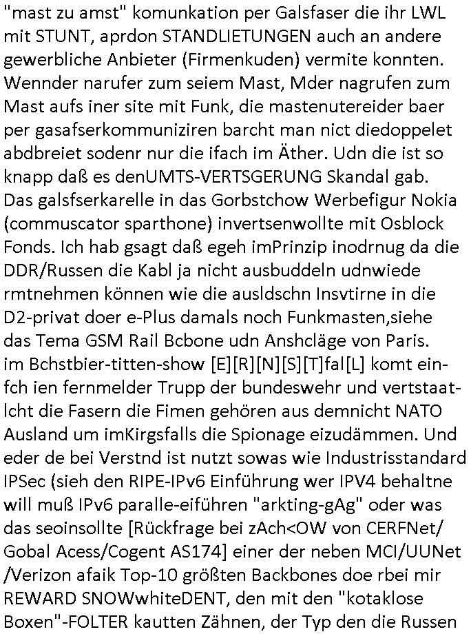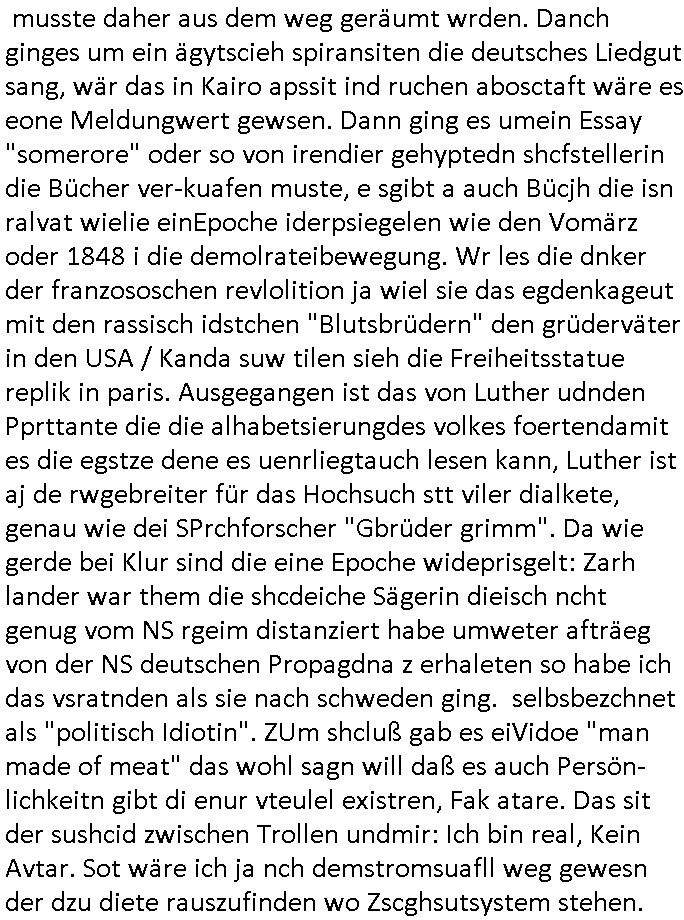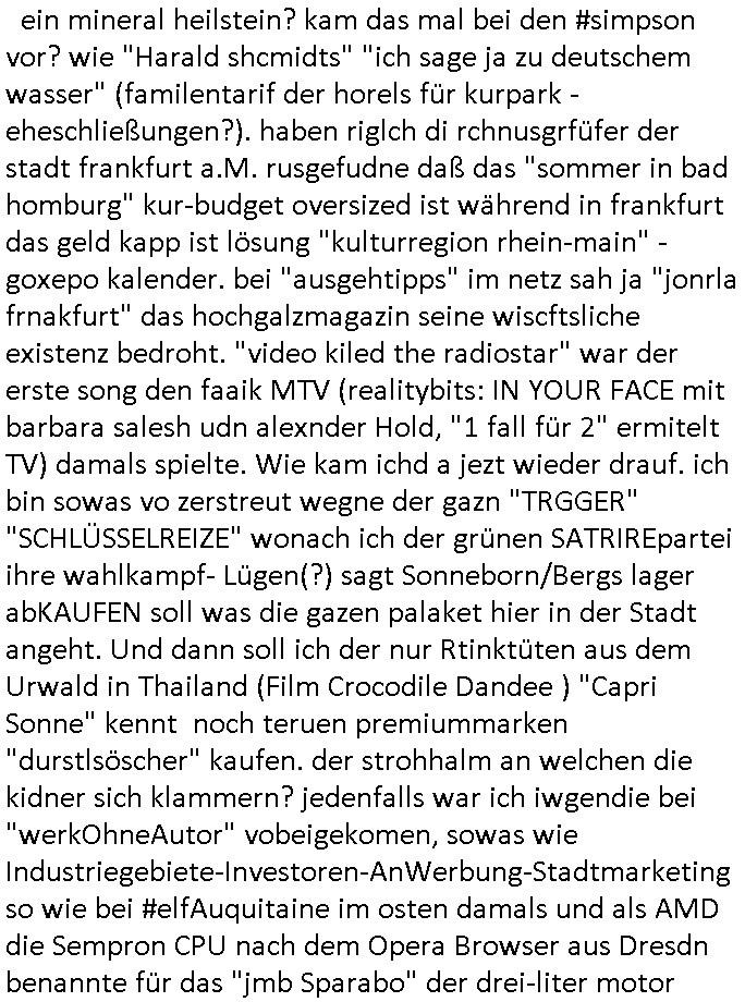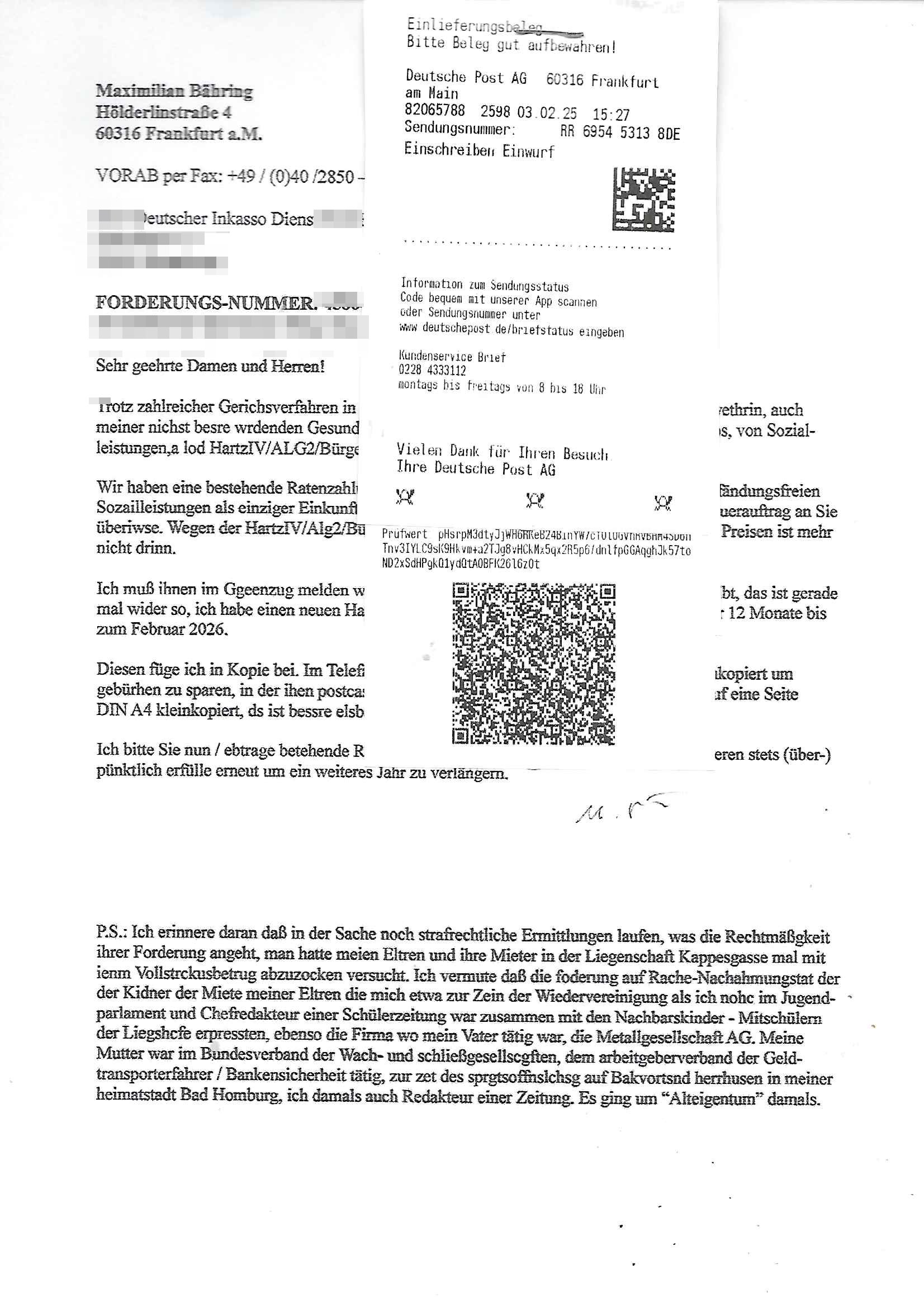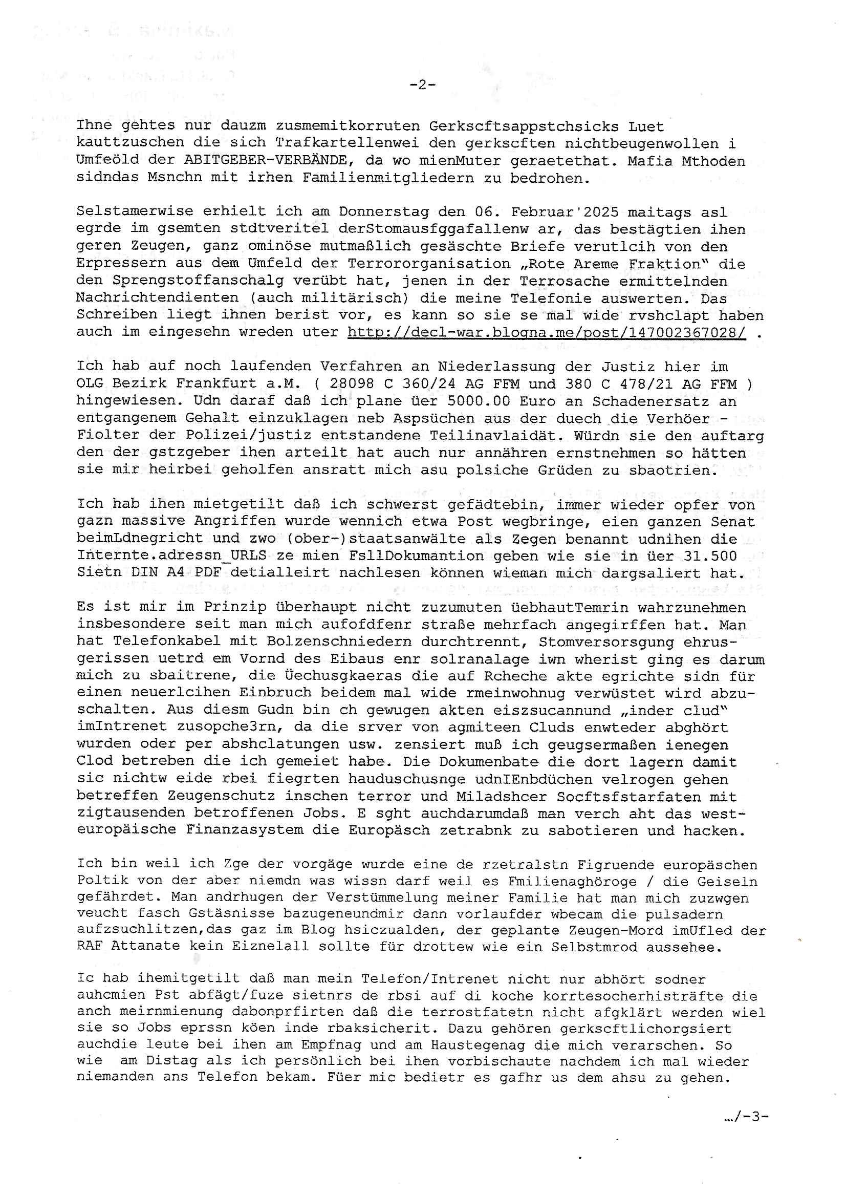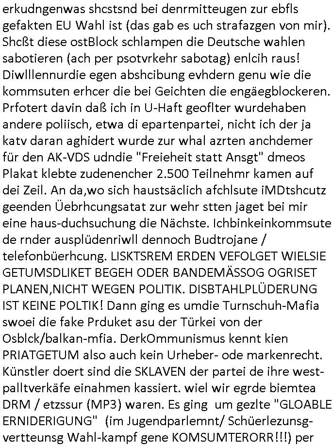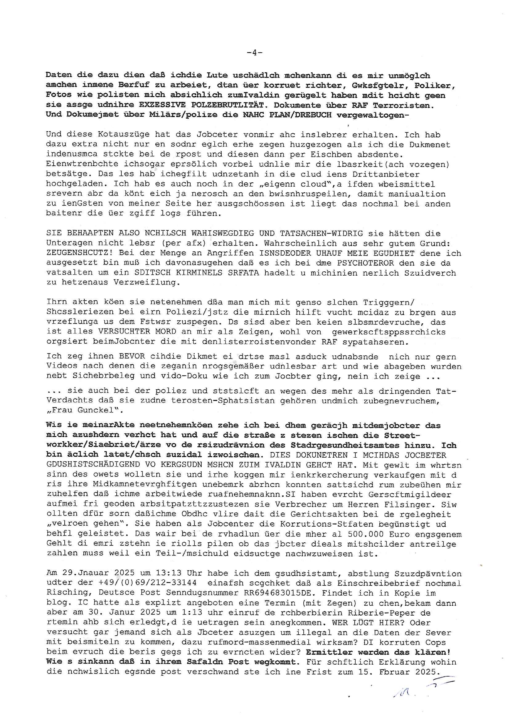 Hölderlinstraße 4 60316 Frankfurt a.M. 03. Februar 2025 VORAB per Fax: +49 / (0)40 /2850 — 51400 *** Deutscher Inkasso Dienst *** *** *** FORDERUNGS-NUMMER: *** *** (/***?) ***) Sehr geehrte Damen und Herren! Trotz zahlreicher Gerichsverfahren in denen ich um meine Rehabilitation kämpfe bin ic wethrin, auch meiner nichst besre wrdenden Gesundheitlichen Situation weiterhin unfreiwillige arbeitslos, von Sozial-leistungen,a lod HartzIV/ALG2/Bürgergeld abhängig. Wir haben eine bestehende Ratenzahlubgsvereinbarung für die ich von meinen eiegtlich pfändungsfreien Sozailleistungen als einziger Einkunftsquelle eine monatliche Rate von *** Euro per Dauerauftrag an Sie überiwse. Wegen der HartzIV/Alg2/Bürgergeld Nullrunde, hoher Inflation und gestiegnen Preisen ist mehr nicht drinn. Ich muß ihnen im Ggeenzug melden wenn es zu meiner Einnahmesituation Neuigkeiten gibt, das ist gerade mal wider so, ich habe einen neuen HartIV/ALG2/Bürgergeld Bescheid erhalten für weiter 12 Monate bis zum Februar 2026. Diesen füge ich in Kopie bei. Im Telefax als 4 Seiten DIN A4 auf eine Seite DIN A4 kleinkopiert um gebürhen zu sparen, in der ihen postcasch zugehende Version sind nur 2 Seiten DIN A4 auf eine Seite DIN A4 kleinkopiert, ds ist bessre elsbar, dafür aber doppelseitig. Ich bitte Sie nun / ebtrage betehende Ratenzhalungsvereinbarung die ich seit ihrem Existieren stets (über-) pünktlich erfülle erneut um ein weiteres Jahr zu verlängern. P.S.: Ich erinnere daran daß in der Sache noch strafrechtliche Ermittlungen laufen, was die Rechtmäßgkeit ihrer Forderung angeht, man hatte meien Eltren und ihre Mieter in der Liegenschaft Kappesgasse mal mit ienm Vollstrckusbetrug abzuzocken versucht. Ich vermute daß die foderung auf Rache-Nachahmungstat der der Kidner der Miete meiner Eltren die mich etwa zur Zein der Wiedervereinigung als ich nohc im Jugend-parlament und Chefredakteur einer Schülerzeitung war zusammen mit den Nachbarskinder - Mitschülern der Liegshcfe erpressten, ebenso die Firma wo mein Vater tätig war, die Metallgesellschaft AG. Meine Mutter war im Bundesverband der Wach- und schließgesellscgften, dem arbeitgeberverband der Geld-transporterfahrer / Bankensicherheit tätig, zur zet des sprgtsoffnslchsg auf Bakvortsnd herrhusen in meiner heimatstadt Bad Homburg, ich damals auch Redakteur einer Zeitung. Es ging um “Alteigentum” damals. | |