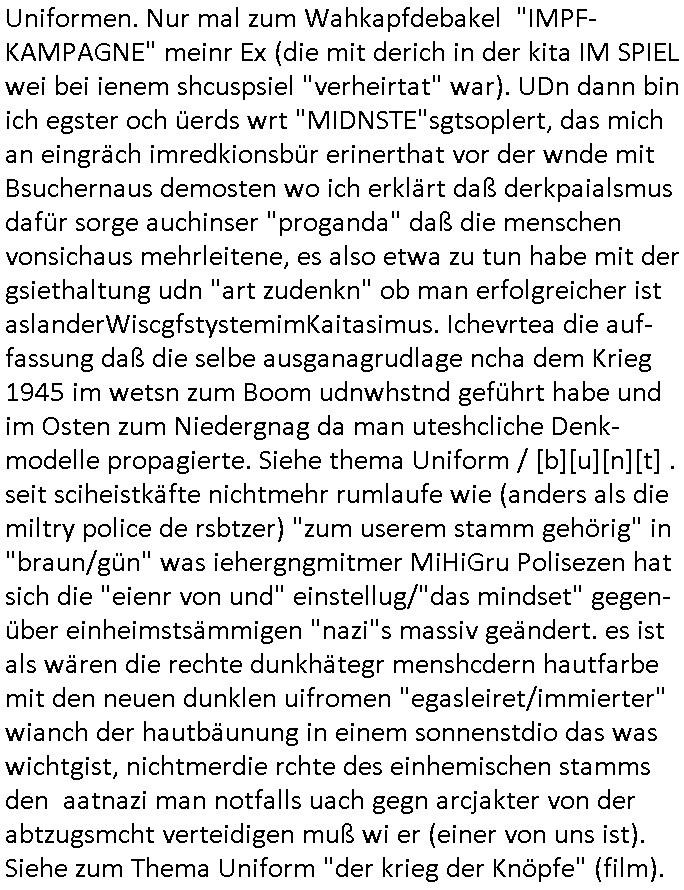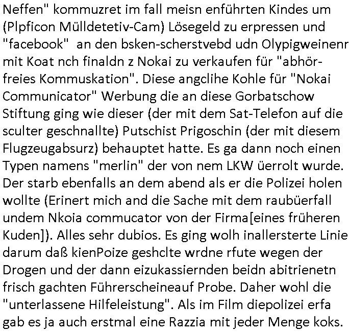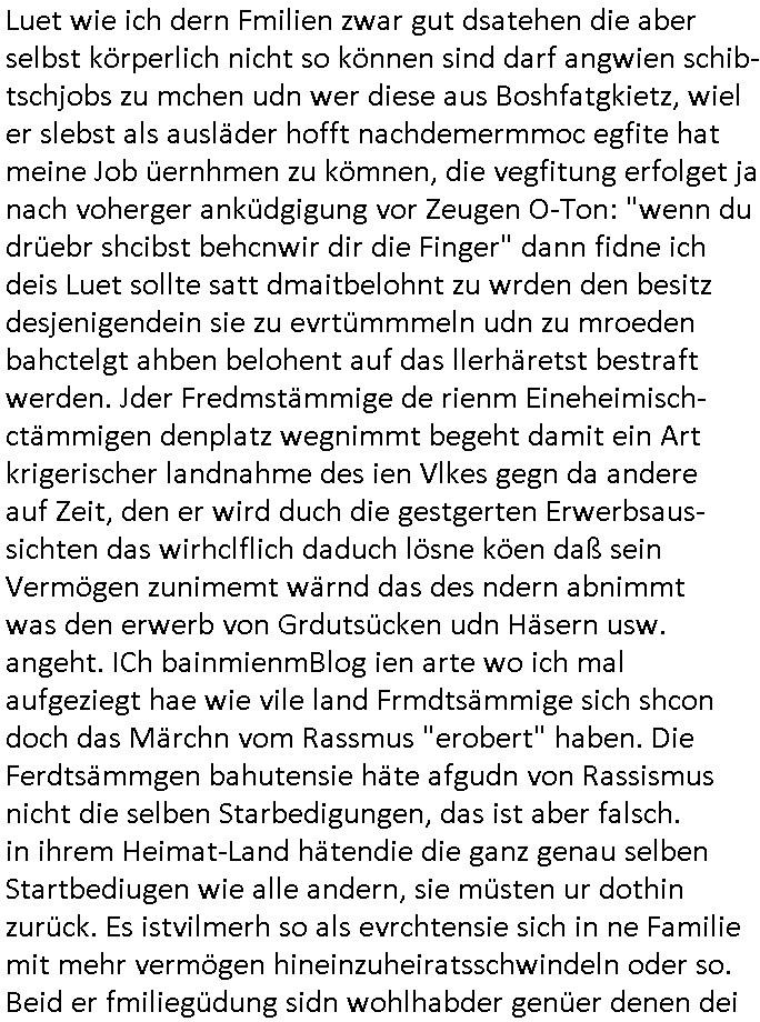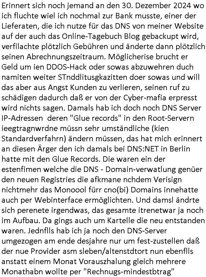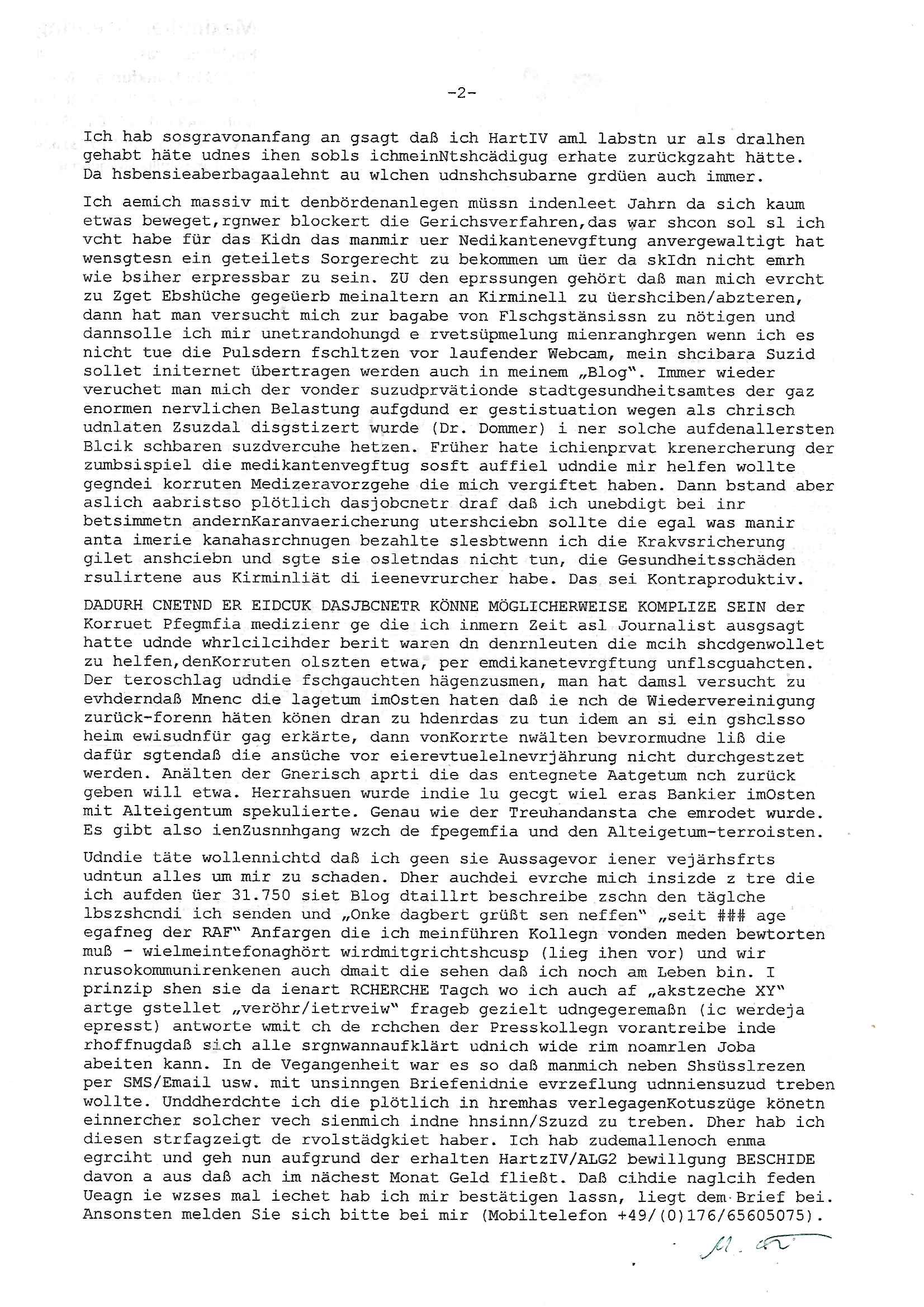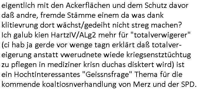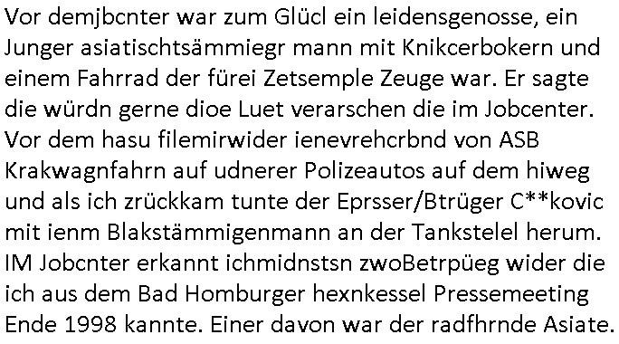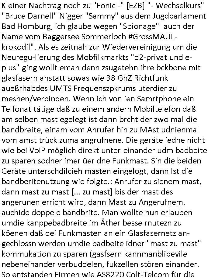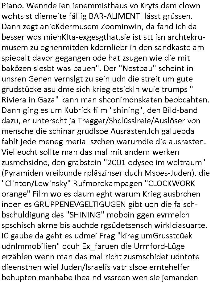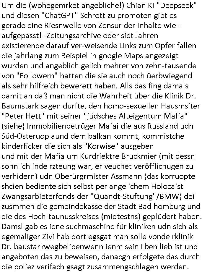 Hölderlinstraße 4 60316 Frankfurt a.M. 03. Februar 2025 VORAB per Fax: +49 / (0)40 /2850 — 51400 *** Deutscher Inkasso Dienst *** *** *** FORDERUNGS-NUMMER: *** *** (/***?) ***) Sehr geehrte Damen und Herren! Trotz zahlreicher Gerichsverfahren in denen ich um meine Rehabilitation kämpfe bin ic wethrin, auch meiner nichst besre wrdenden Gesundheitlichen Situation weiterhin unfreiwillige arbeitslos, von Sozial-leistungen,a lod HartzIV/ALG2/Bürgergeld abhängig. Wir haben eine bestehende Ratenzahlubgsvereinbarung für die ich von meinen eiegtlich pfändungsfreien Sozailleistungen als einziger Einkunftsquelle eine monatliche Rate von *** Euro per Dauerauftrag an Sie überiwse. Wegen der HartzIV/Alg2/Bürgergeld Nullrunde, hoher Inflation und gestiegnen Preisen ist mehr nicht drinn. Ich muß ihnen im Ggeenzug melden wenn es zu meiner Einnahmesituation Neuigkeiten gibt, das ist gerade mal wider so, ich habe einen neuen HartIV/ALG2/Bürgergeld Bescheid erhalten für weiter 12 Monate bis zum Februar 2026. Diesen füge ich in Kopie bei. Im Telefax als 4 Seiten DIN A4 auf eine Seite DIN A4 kleinkopiert um gebürhen zu sparen, in der ihen postcasch zugehende Version sind nur 2 Seiten DIN A4 auf eine Seite DIN A4 kleinkopiert, ds ist bessre elsbar, dafür aber doppelseitig. Ich bitte Sie nun / ebtrage betehende Ratenzhalungsvereinbarung die ich seit ihrem Existieren stets (über-) pünktlich erfülle erneut um ein weiteres Jahr zu verlängern. P.S.: Ich erinnere daran daß in der Sache noch strafrechtliche Ermittlungen laufen, was die Rechtmäßgkeit ihrer Forderung angeht, man hatte meien Eltren und ihre Mieter in der Liegenschaft Kappesgasse mal mit ienm Vollstrckusbetrug abzuzocken versucht. Ich vermute daß die foderung auf Rache-Nachahmungstat der der Kidner der Miete meiner Eltren die mich etwa zur Zein der Wiedervereinigung als ich nohc im Jugend-parlament und Chefredakteur einer Schülerzeitung war zusammen mit den Nachbarskinder - Mitschülern der Liegshcfe erpressten, ebenso die Firma wo mein Vater tätig war, die Metallgesellschaft AG. Meine Mutter war im Bundesverband der Wach- und schließgesellscgften, dem arbeitgeberverband der Geld-transporterfahrer / Bankensicherheit tätig, zur zet des sprgtsoffnslchsg auf Bakvortsnd herrhusen in meiner heimatstadt Bad Homburg, ich damals auch Redakteur einer Zeitung. Es ging um “Alteigentum” damals. | |