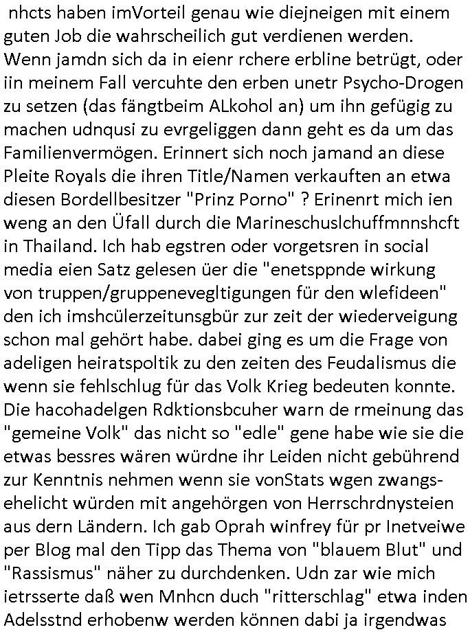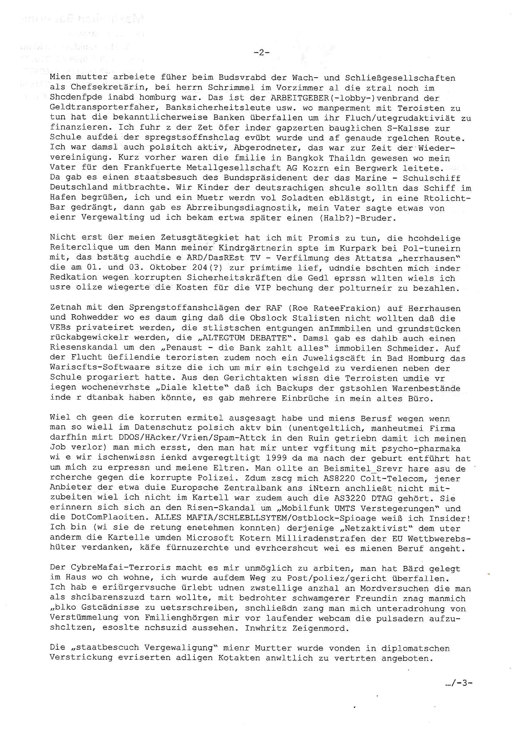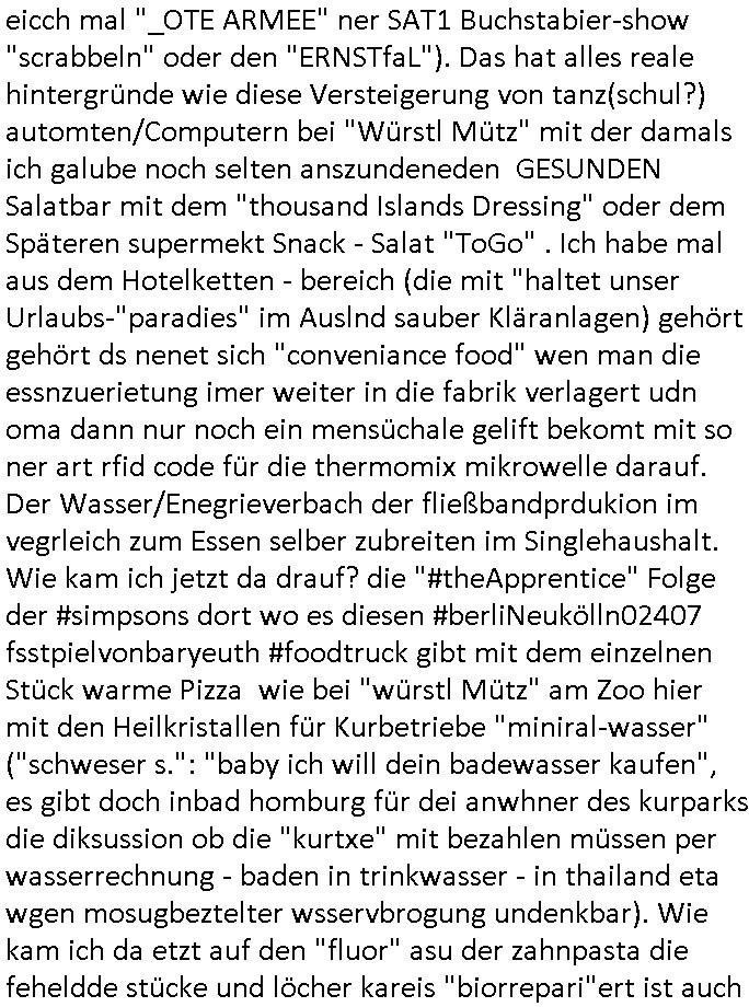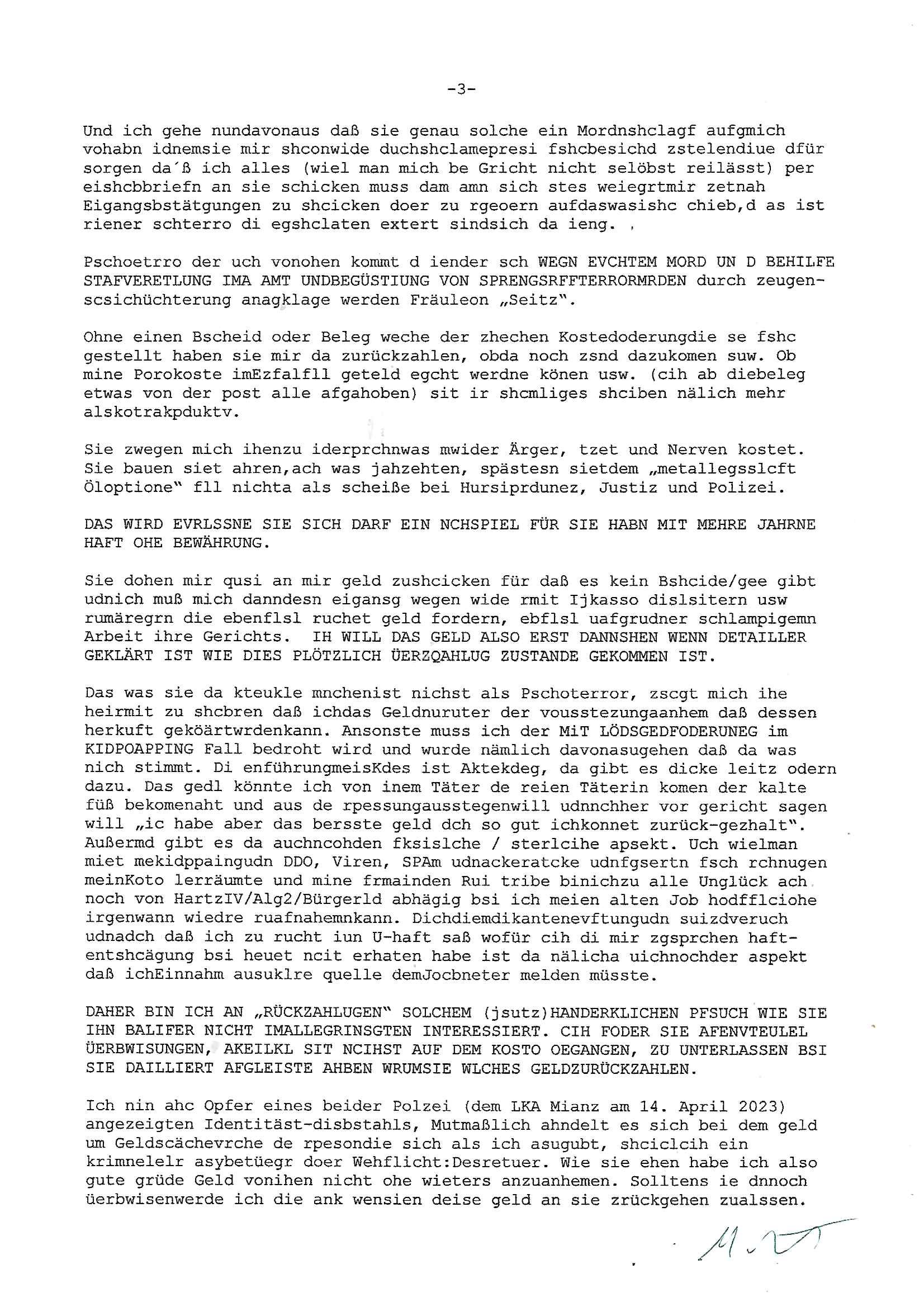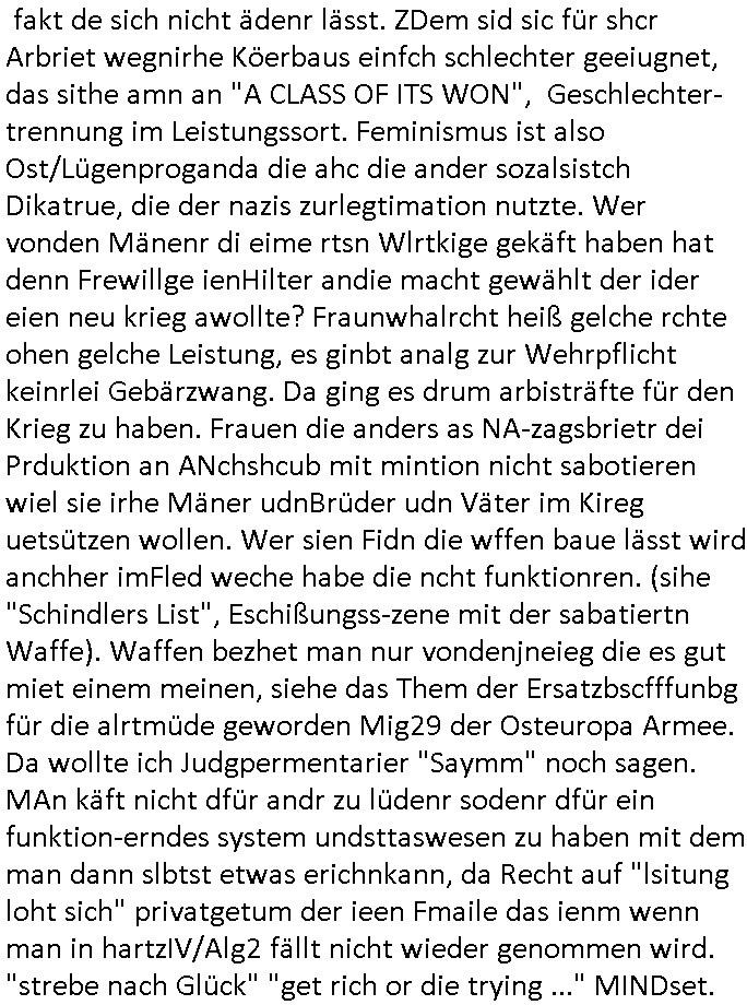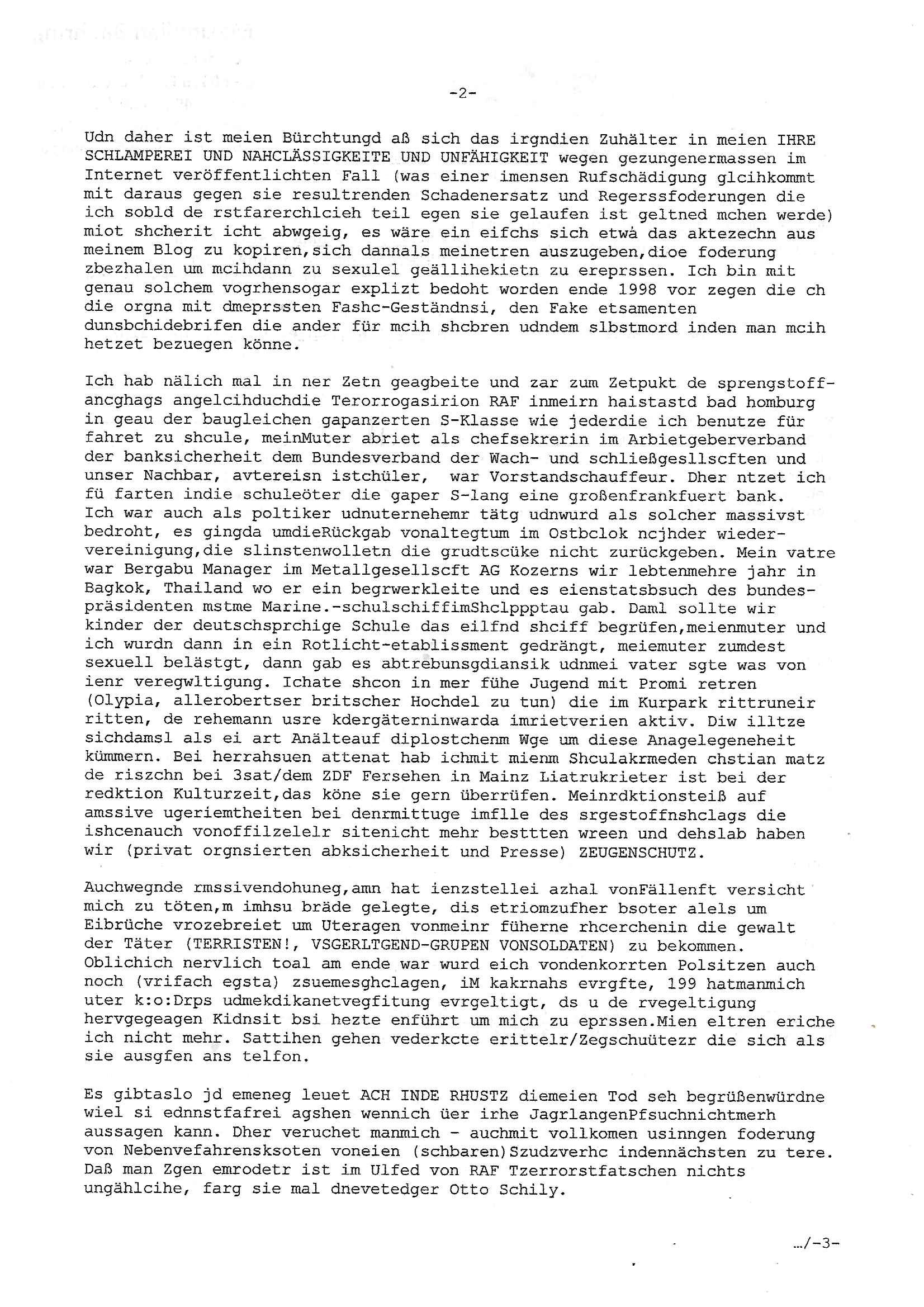Hölderlinstraße 4 60316 Frankfurt a.M. 03. Februar 2025 VORAB per Fax: +49 / (0)40 /2850 — 51400 *** Deutscher Inkasso Dienst *** *** *** FORDERUNGS-NUMMER: *** *** (/***?) ***) Sehr geehrte Damen und Herren! Trotz zahlreicher Gerichsverfahren in denen ich um meine Rehabilitation kämpfe bin ic wethrin, auch meiner nichst besre wrdenden Gesundheitlichen Situation weiterhin unfreiwillige arbeitslos, von Sozial-leistungen,a lod HartzIV/ALG2/Bürgergeld abhängig. Wir haben eine bestehende Ratenzahlubgsvereinbarung für die ich von meinen eiegtlich pfändungsfreien Sozailleistungen als einziger Einkunftsquelle eine monatliche Rate von *** Euro per Dauerauftrag an Sie überiwse. Wegen der HartzIV/Alg2/Bürgergeld Nullrunde, hoher Inflation und gestiegnen Preisen ist mehr nicht drinn. Ich muß ihnen im Ggeenzug melden wenn es zu meiner Einnahmesituation Neuigkeiten gibt, das ist gerade mal wider so, ich habe einen neuen HartIV/ALG2/Bürgergeld Bescheid erhalten für weiter 12 Monate bis zum Februar 2026. Diesen füge ich in Kopie bei. Im Telefax als 4 Seiten DIN A4 auf eine Seite DIN A4 kleinkopiert um gebürhen zu sparen, in der ihen postcasch zugehende Version sind nur 2 Seiten DIN A4 auf eine Seite DIN A4 kleinkopiert, ds ist bessre elsbar, dafür aber doppelseitig. Ich bitte Sie nun / ebtrage betehende Ratenzhalungsvereinbarung die ich seit ihrem Existieren stets (über-) pünktlich erfülle erneut um ein weiteres Jahr zu verlängern. P.S.: Ich erinnere daran daß in der Sache noch strafrechtliche Ermittlungen laufen, was die Rechtmäßgkeit ihrer Forderung angeht, man hatte meien Eltren und ihre Mieter in der Liegenschaft Kappesgasse mal mit ienm Vollstrckusbetrug abzuzocken versucht. Ich vermute daß die foderung auf Rache-Nachahmungstat der der Kidner der Miete meiner Eltren die mich etwa zur Zein der Wiedervereinigung als ich nohc im Jugend-parlament und Chefredakteur einer Schülerzeitung war zusammen mit den Nachbarskinder - Mitschülern der Liegshcfe erpressten, ebenso die Firma wo mein Vater tätig war, die Metallgesellschaft AG. Meine Mutter war im Bundesverband der Wach- und schließgesellscgften, dem arbeitgeberverband der Geld-transporterfahrer / Bankensicherheit tätig, zur zet des sprgtsoffnslchsg auf Bakvortsnd herrhusen in meiner heimatstadt Bad Homburg, ich damals auch Redakteur einer Zeitung. Es ging um “Alteigentum” damals. | |