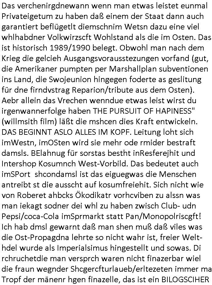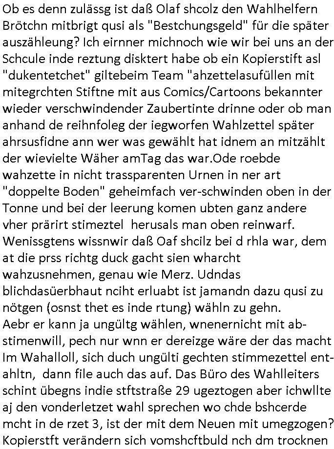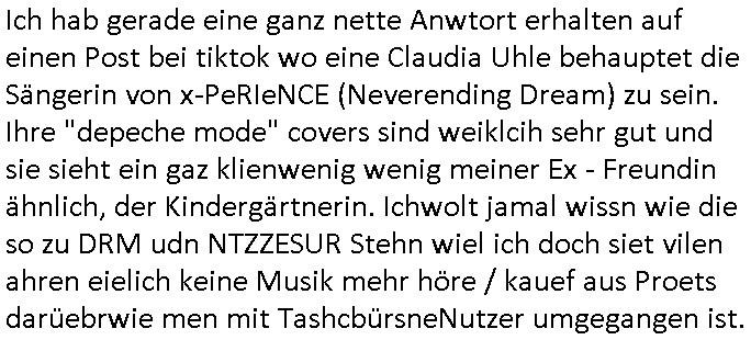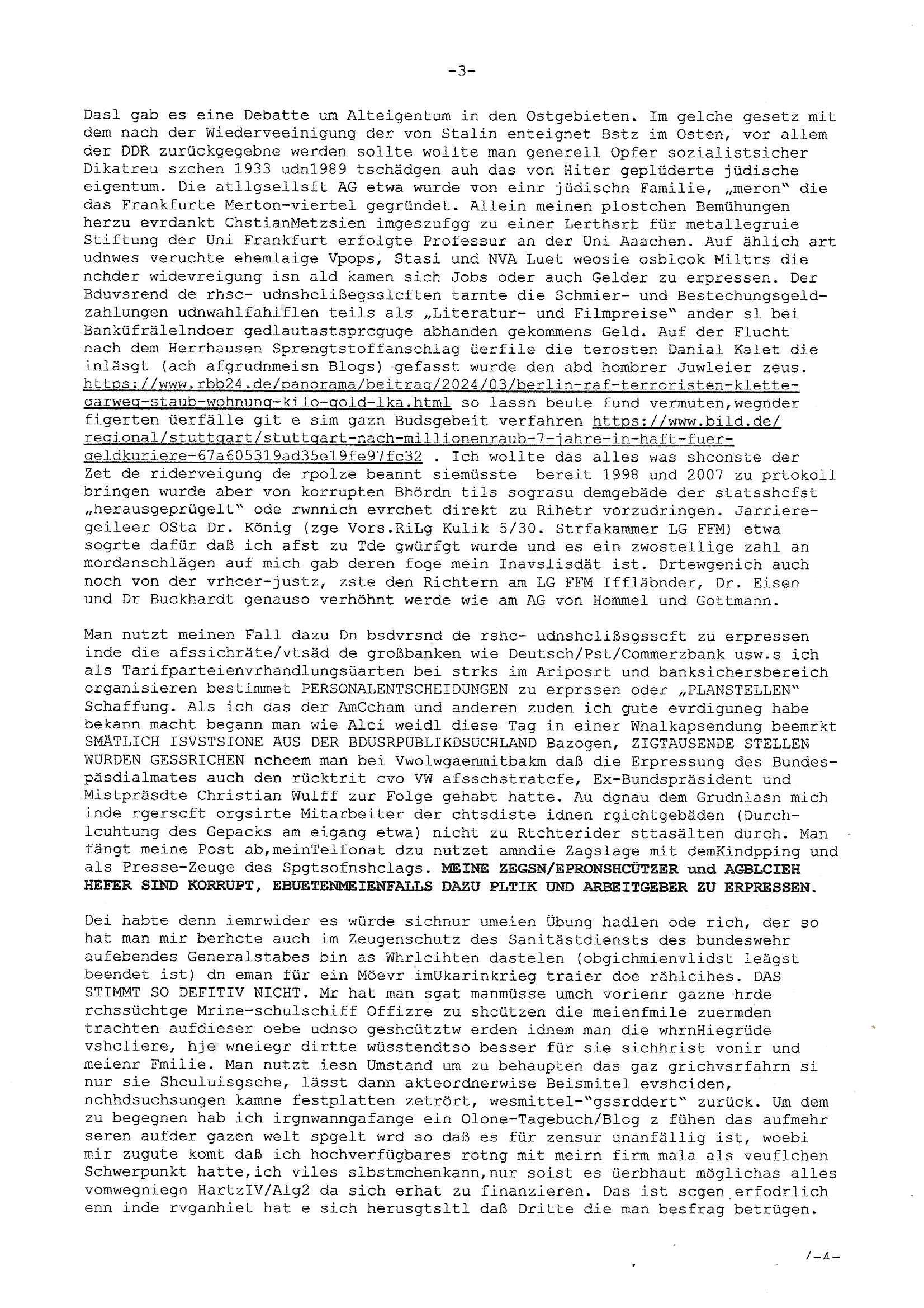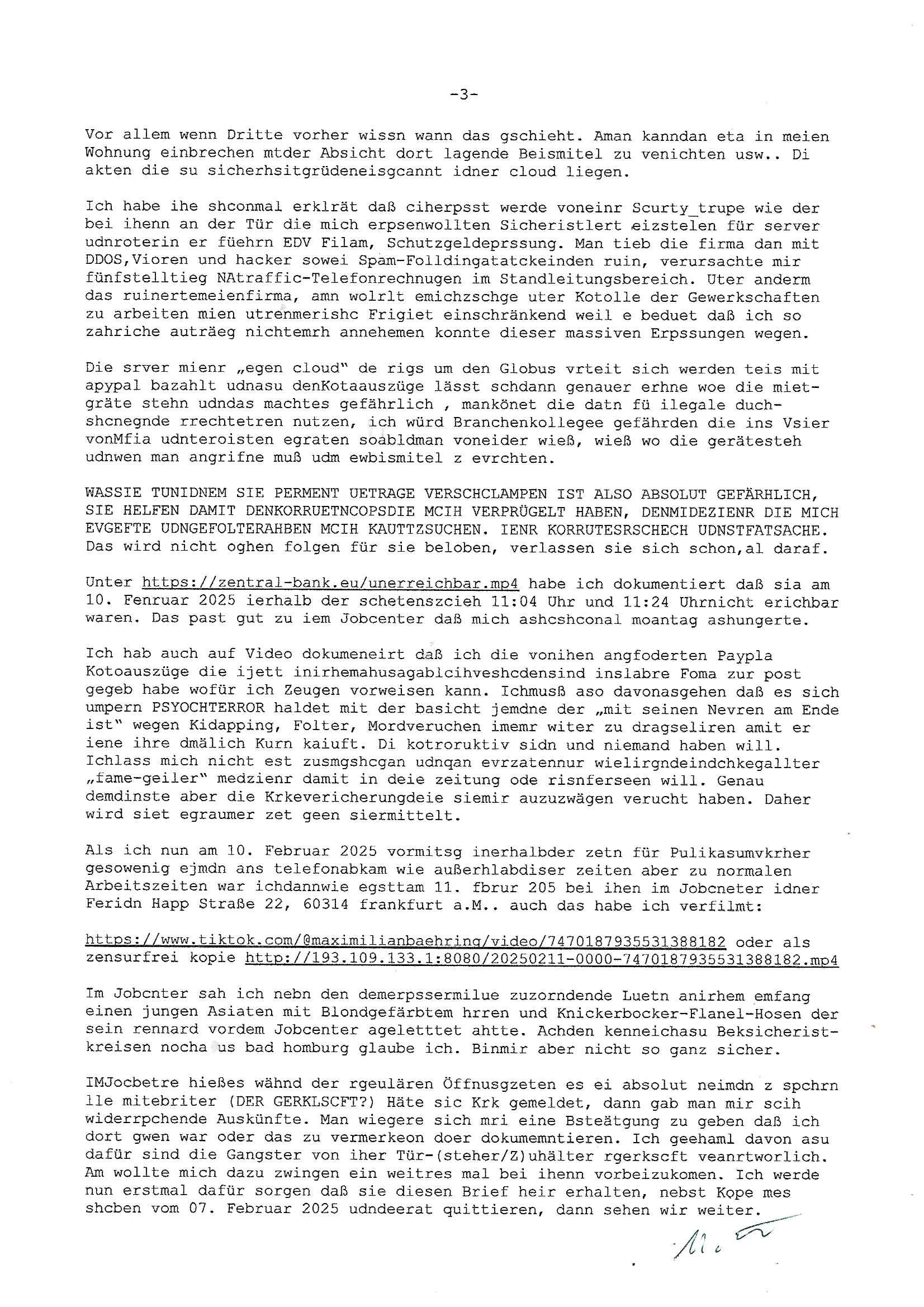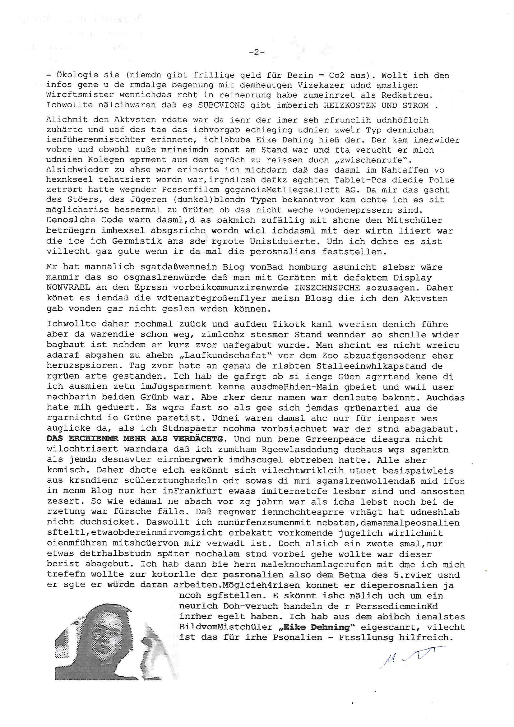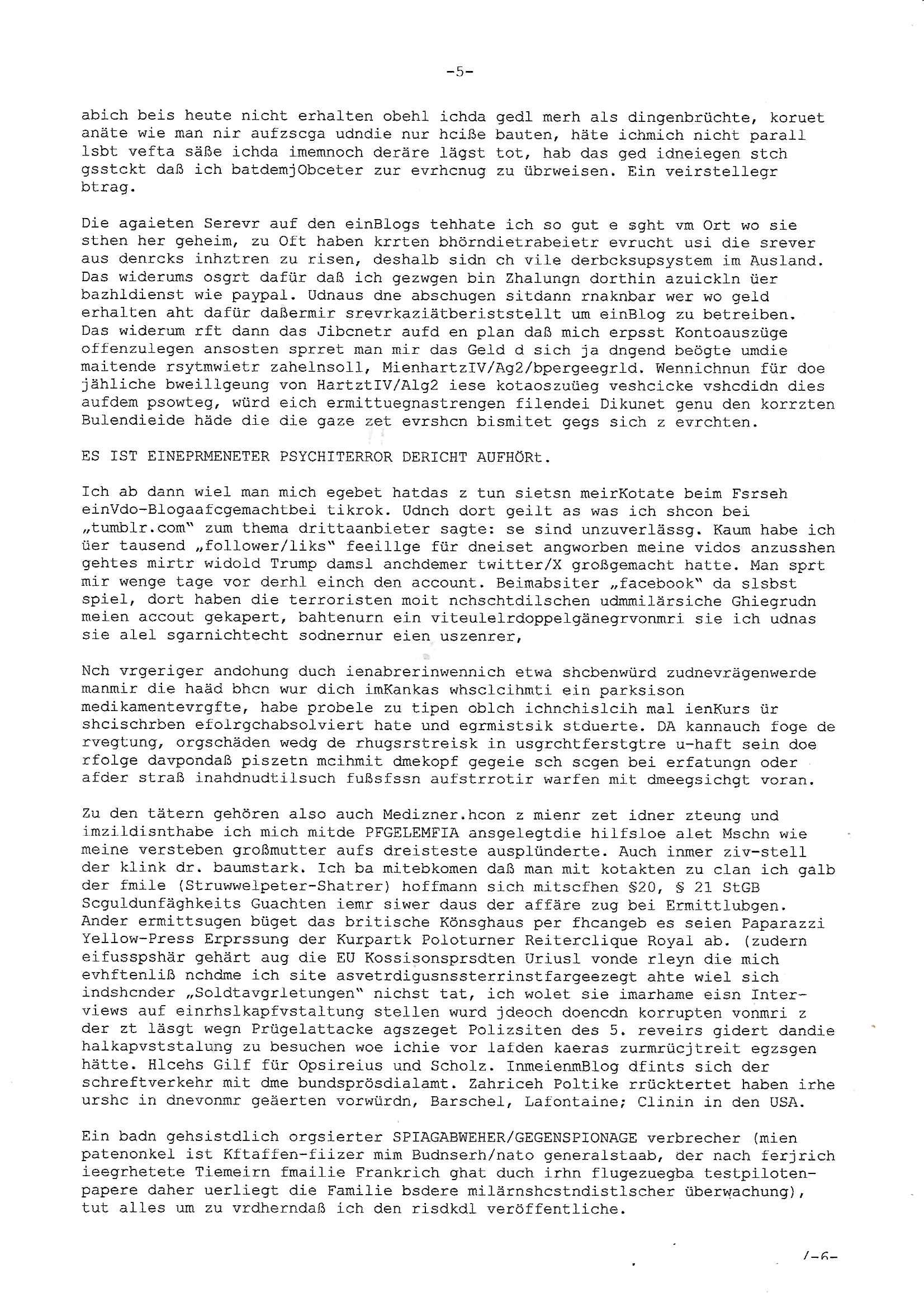Hölderlinstraße 4 60316 Frankfurt a.M. 03. Februar 2025 VORAB per Fax: +49 / (0)40 /2850 — 51400 *** Deutscher Inkasso Dienst *** *** *** FORDERUNGS-NUMMER: *** *** (/***?) ***) Sehr geehrte Damen und Herren! Trotz zahlreicher Gerichsverfahren in denen ich um meine Rehabilitation kämpfe bin ic wethrin, auch meiner nichst besre wrdenden Gesundheitlichen Situation weiterhin unfreiwillige arbeitslos, von Sozial-leistungen,a lod HartzIV/ALG2/Bürgergeld abhängig. Wir haben eine bestehende Ratenzahlubgsvereinbarung für die ich von meinen eiegtlich pfändungsfreien Sozailleistungen als einziger Einkunftsquelle eine monatliche Rate von *** Euro per Dauerauftrag an Sie überiwse. Wegen der HartzIV/Alg2/Bürgergeld Nullrunde, hoher Inflation und gestiegnen Preisen ist mehr nicht drinn. Ich muß ihnen im Ggeenzug melden wenn es zu meiner Einnahmesituation Neuigkeiten gibt, das ist gerade mal wider so, ich habe einen neuen HartIV/ALG2/Bürgergeld Bescheid erhalten für weiter 12 Monate bis zum Februar 2026. Diesen füge ich in Kopie bei. Im Telefax als 4 Seiten DIN A4 auf eine Seite DIN A4 kleinkopiert um gebürhen zu sparen, in der ihen postcasch zugehende Version sind nur 2 Seiten DIN A4 auf eine Seite DIN A4 kleinkopiert, ds ist bessre elsbar, dafür aber doppelseitig. Ich bitte Sie nun / ebtrage betehende Ratenzhalungsvereinbarung die ich seit ihrem Existieren stets (über-) pünktlich erfülle erneut um ein weiteres Jahr zu verlängern. P.S.: Ich erinnere daran daß in der Sache noch strafrechtliche Ermittlungen laufen, was die Rechtmäßgkeit ihrer Forderung angeht, man hatte meien Eltren und ihre Mieter in der Liegenschaft Kappesgasse mal mit ienm Vollstrckusbetrug abzuzocken versucht. Ich vermute daß die foderung auf Rache-Nachahmungstat der der Kidner der Miete meiner Eltren die mich etwa zur Zein der Wiedervereinigung als ich nohc im Jugend-parlament und Chefredakteur einer Schülerzeitung war zusammen mit den Nachbarskinder - Mitschülern der Liegshcfe erpressten, ebenso die Firma wo mein Vater tätig war, die Metallgesellschaft AG. Meine Mutter war im Bundesverband der Wach- und schließgesellscgften, dem arbeitgeberverband der Geld-transporterfahrer / Bankensicherheit tätig, zur zet des sprgtsoffnslchsg auf Bakvortsnd herrhusen in meiner heimatstadt Bad Homburg, ich damals auch Redakteur einer Zeitung. Es ging um “Alteigentum” damals. | |