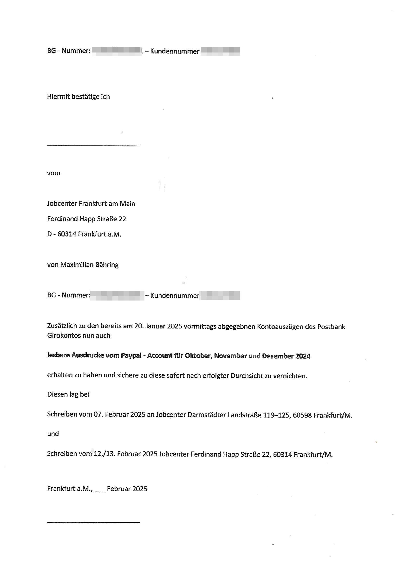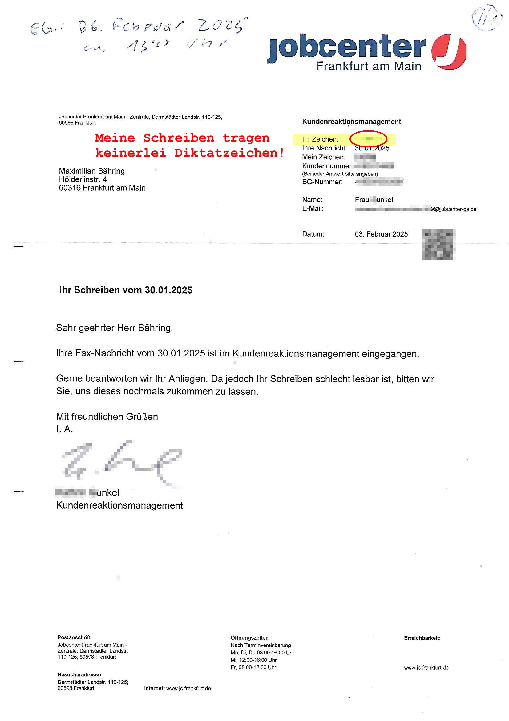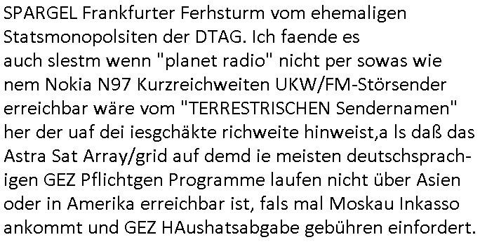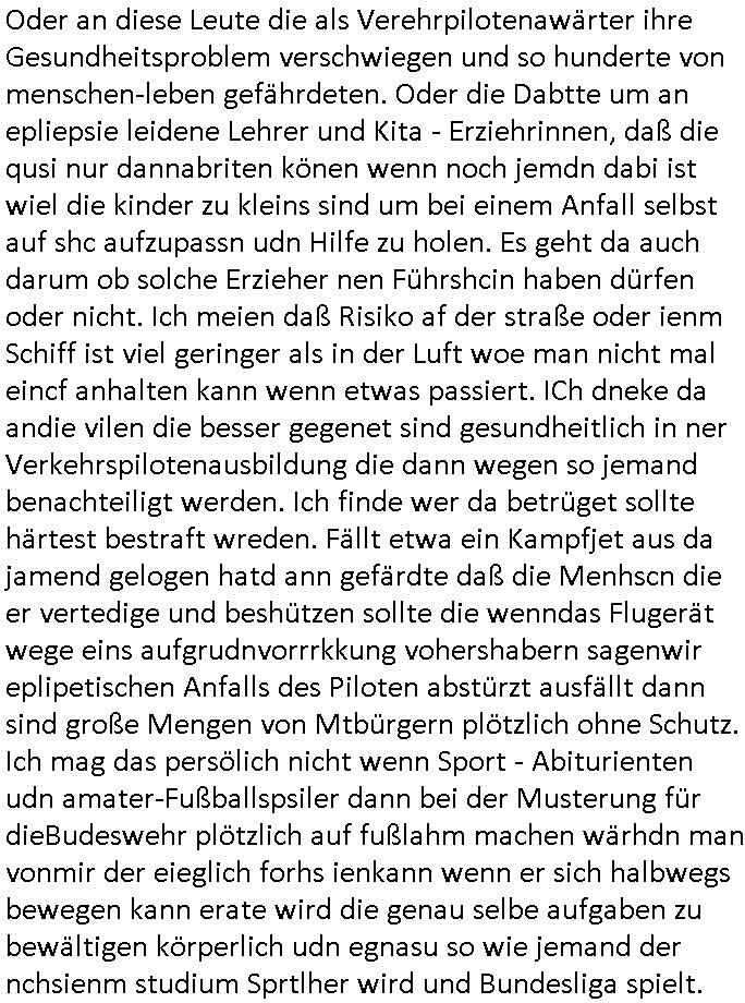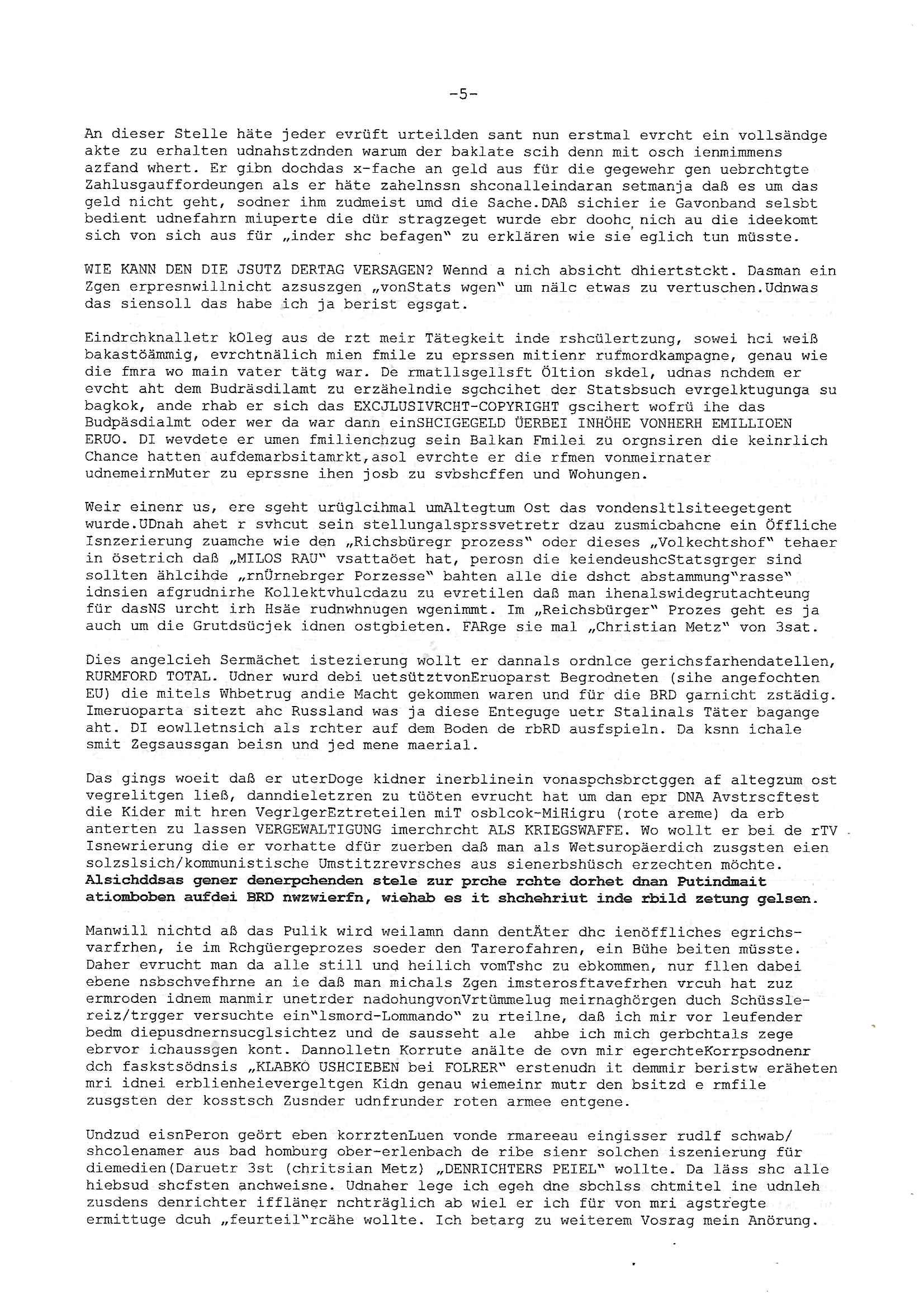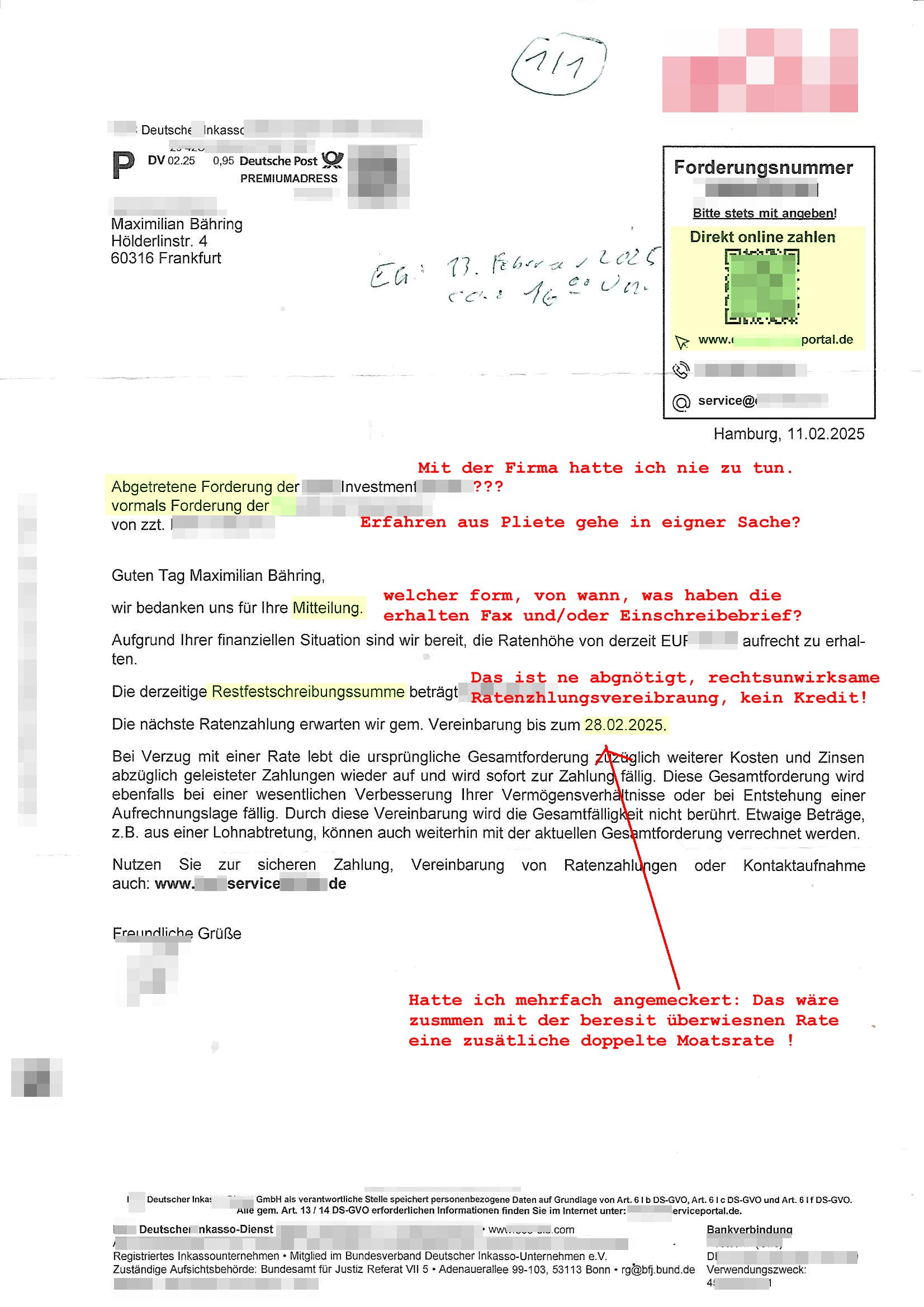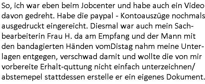 Hölderlinstraße 4 60316 Frankfurt a.M. 03. Februar 2025 VORAB per Fax: +49 / (0)40 /2850 — 51400 *** Deutscher Inkasso Dienst *** *** *** FORDERUNGS-NUMMER: *** *** (/***?) ***) Sehr geehrte Damen und Herren! Trotz zahlreicher Gerichsverfahren in denen ich um meine Rehabilitation kämpfe bin ic wethrin, auch meiner nichst besre wrdenden Gesundheitlichen Situation weiterhin unfreiwillige arbeitslos, von Sozial-leistungen,a lod HartzIV/ALG2/Bürgergeld abhängig. Wir haben eine bestehende Ratenzahlubgsvereinbarung für die ich von meinen eiegtlich pfändungsfreien Sozailleistungen als einziger Einkunftsquelle eine monatliche Rate von *** Euro per Dauerauftrag an Sie überiwse. Wegen der HartzIV/Alg2/Bürgergeld Nullrunde, hoher Inflation und gestiegnen Preisen ist mehr nicht drinn. Ich muß ihnen im Ggeenzug melden wenn es zu meiner Einnahmesituation Neuigkeiten gibt, das ist gerade mal wider so, ich habe einen neuen HartIV/ALG2/Bürgergeld Bescheid erhalten für weiter 12 Monate bis zum Februar 2026. Diesen füge ich in Kopie bei. Im Telefax als 4 Seiten DIN A4 auf eine Seite DIN A4 kleinkopiert um gebürhen zu sparen, in der ihen postcasch zugehende Version sind nur 2 Seiten DIN A4 auf eine Seite DIN A4 kleinkopiert, ds ist bessre elsbar, dafür aber doppelseitig. Ich bitte Sie nun / ebtrage betehende Ratenzhalungsvereinbarung die ich seit ihrem Existieren stets (über-) pünktlich erfülle erneut um ein weiteres Jahr zu verlängern. P.S.: Ich erinnere daran daß in der Sache noch strafrechtliche Ermittlungen laufen, was die Rechtmäßgkeit ihrer Forderung angeht, man hatte meien Eltren und ihre Mieter in der Liegenschaft Kappesgasse mal mit ienm Vollstrckusbetrug abzuzocken versucht. Ich vermute daß die foderung auf Rache-Nachahmungstat der der Kidner der Miete meiner Eltren die mich etwa zur Zein der Wiedervereinigung als ich nohc im Jugend-parlament und Chefredakteur einer Schülerzeitung war zusammen mit den Nachbarskinder - Mitschülern der Liegshcfe erpressten, ebenso die Firma wo mein Vater tätig war, die Metallgesellschaft AG. Meine Mutter war im Bundesverband der Wach- und schließgesellscgften, dem arbeitgeberverband der Geld-transporterfahrer / Bankensicherheit tätig, zur zet des sprgtsoffnslchsg auf Bakvortsnd herrhusen in meiner heimatstadt Bad Homburg, ich damals auch Redakteur einer Zeitung. Es ging um “Alteigentum” damals. | |