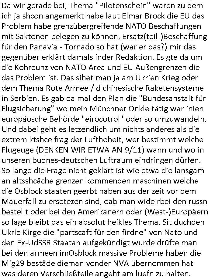 | Da wir gerade bei, Thema "Pilotenschein" waren zu dem ich ja shcon angemerkt habe laut Elmar Brock die EU das Problem habe grenzübergreifende NATO Beschaffungen mit Saktonen belegen zu können, Ersatz(teil-)Beschaffung für den Panavia - Tornado so hat (war er das?) mir das gegenüber erklärt damals inder Redaktion. Es gte da um die Kohreunz von NATO Area und EU Außengrenzen die das Problem ist. Das sihet man ja am Ukrien Krieg oder dem Thema Rote Armee / d chinesische Raketensysteme in Serbien. Es gab da mal den Plan die "Bundesanstalt für Flugsicherung" wo mein Münchner Onkle tätig war inien europäosche Behörde "eirocotrol" oder so umzuwandeln. Und dabei geht es letzendlich um nichts anderes als die extrem ktshce frag der Lufthoheit, wer bestimmt welche Flugeuge (DENKEN WIR ETWA AN 9/11) wann und wo in unseren budnes-deutschen Luftraum eindringen dürfen. So lange die Frage nicht geklärt ist wie etwa die lansgam an altsshcäche grenzen kommenden maschinen welche die Osblock staaten geerbt haben aus der zeit vor dem Mauerfall zu ersetezen sind, oab man wide rbei den russn bestellt oder bei den Amerikanern oder (West-)Europäern so lage bleibt das ein absolut heikles Thema. Sit duchden Ukrie Kirge die "partscaft für den firdne" von Nato und den Ex-UdSSR Staatan aufgekündigt wurde drüfte man bei den armeen imOsblock massive Probleme haben die Mig29 bestäde dieman vonder NVA übernommen hat was deren Verschließteile angeht am luefn zu halten.