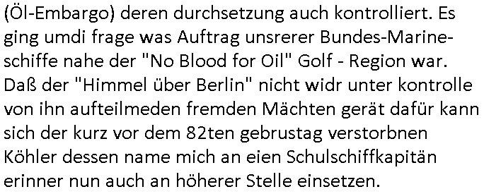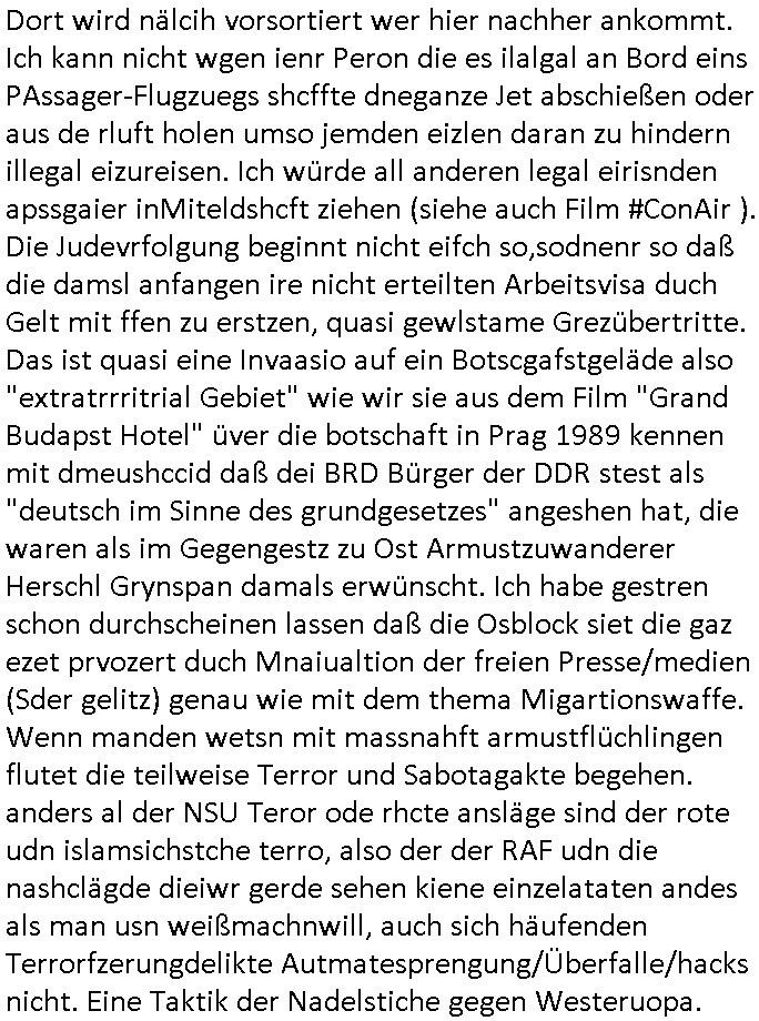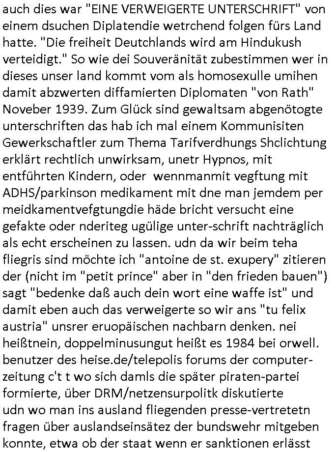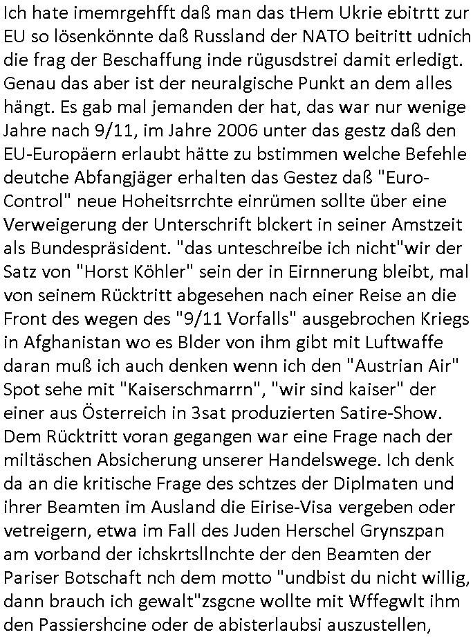 Ich hate imemrgehfft daß man das tHem Ukrie ebitrtt zur EU so lösenkönnte daß Russland der NATO beitritt udnich die frag der Beschaffung inde rügusdstrei damit erledigt. Genau das aber ist der neuralgische Punkt an dem alles hängt. Es gab mal jemanden der hat, das war nur wenige Jahre nach 9/11, im Jahre 2006 unter das gestz daß den EU-Europäern erlaubt hätte zu bstimmen welche Befehle deutche Abfangjäger erhalten das Gestez daß "Euro-Control" neue Hoheitsrrchte einrümen sollte über eine Verweigerung der Unterschrift blckert in seiner Amstzeit als Bundespräsident. "das unteschreibe ich nicht"wir der Satz von "Horst Köhler" sein der in Eirnnerung bleibt, mal von seinem Rücktritt abgesehen nach einer Reise an die Front des wegen des "9/11 Vorfalls" ausgebrochen Kriegs in Afghanistan wo es Blder von ihm gibt mit Luftwaffe daran muß ich auch denken wenn ich den "Austrian Air" Spot sehe mit "Kaiserschmarrn", "wir sind kaiser" der einer aus Österreich in 3sat produzierten Satire-Show. Dem Rücktritt voran gegangen war eine Frage nach der miltäschen Absicherung unserer Handelswege. Ich denk da an die kritische Frage des schtzes der Diplmaten und ihrer Beamten im Ausland die Eirise-Visa vergeben oder vetreigern, etwa im Fall des Juden Herschel Grynszpan am vorband der ichskrtsllnchte der den Beamten der Pariser Botschaft nch dem motto "undbist du nicht willig, dann brauch ich gewalt"zsgcne wollte mit Wffegwlt ihm den Passiershcine oder de abisterlaubsi auszustellen, auch dies war "EINE VERWEIGERTE UNTERSCHRIFT" von einem dsuchen Diplatendie wetrchend folgen fürs Land hatte. "Die freiheit Deutchlands wird am Hindukush verteidigt." So wie dei Souveränität zubestimmen wer in dieses unser land kommt vom als homosexulle umihen damit abzwerten diffamierten Diplomaten "von Rath" Noveber 1939. Zum Glück sind gewaltsam abgenötogte unterschriften das hab ich mal einem Kommunisiten Gewerkschaftler zum Thema Tarifverdhungs Shclichtung erklärt rechtlich unwirksam, unetr Hypnos, mit entführten Kindern, oder wennmanmit vegftung mit ADHS/parkinson medikament mit dne man jemdem per meidkamentvefgtungdie häde bricht versucht eine gefakte oder nderiteg ugülige unter-schrift nachträglich als echt erscheinen zu lassen. udn da wir beim teha fliegris sind möchte ich "antoine de st. exupery" zitieren der (nicht im "petit prince" aber in "den frieden bauen") sagt "bedenke daß auch dein wort eine waffe ist" und damit eben auch das verweigerte so wir ans "tu felix austria" unsrer eruopäischen nachbarn denken. nei heißtnein, doppelminusungut heißt es 1984 bei orwell. benutzer des heise.de/telepolis forums der computer-zeitung c't t wo sich damls die später piraten-partei formierte, über DRM/netzensurpolitk diskutierte udn wo man ins ausland fliegenden presse-vertretetn fragen über auslandseinsätez der bundswehr mitgeben konnte, etwa ob der staat wenn er sanktionen erlässt (Öl-Embargo) deren durchsetzung auch kontrolliert. Es ging umdi frage was Auftrag unsrerer Bundes-Marine- schiffe nahe der "No Blood for Oil" Golf - Region war. Daß der "Himmel über Berlin" nicht widr unter kontrolle von ihn aufteilmeden fremden Mächten gerät dafür kann sich der kurz vor dem 82ten gebrustag verstorbnen Köhler dessen name mich an eien Schulschiffkapitän erinner nun auch an höherer Stelle einsetzen. | |