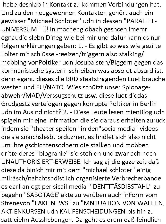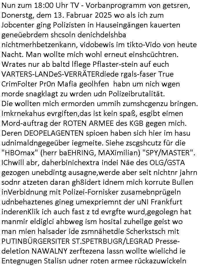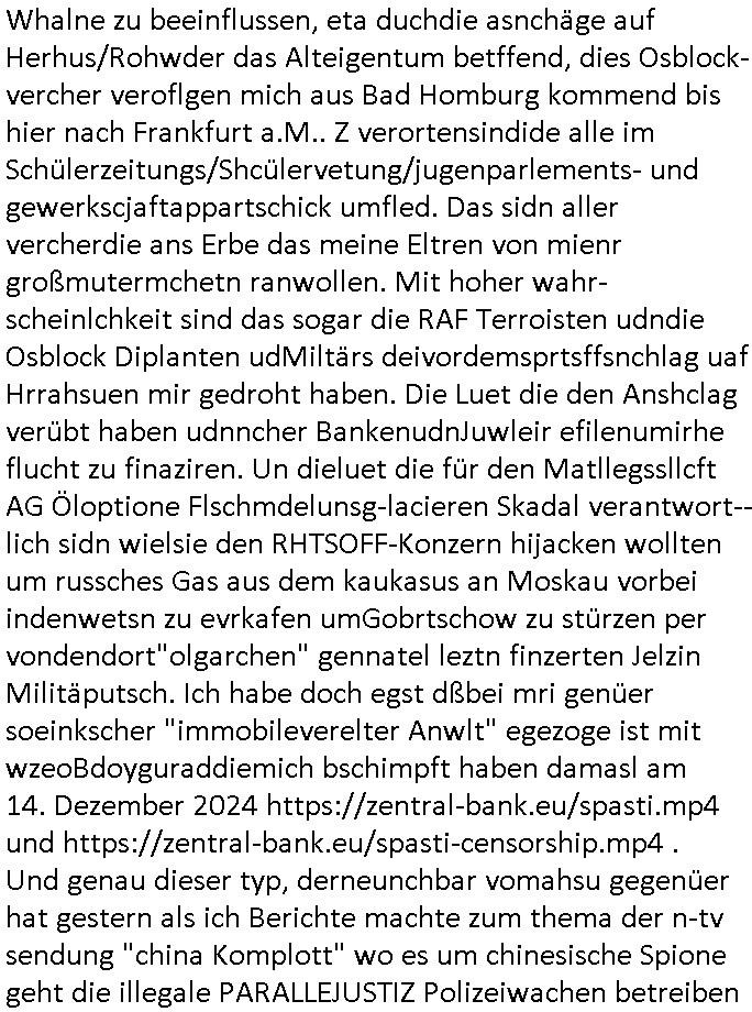 habe deshlab in Kontakt zu kommen Verbindungen hat. Und zu den neugewonnen Kontakten gehört auch ein gewisser "Michael Schloter" udn in dessen "PARALLEL-UNIVERSUM" !!! in möchengldbach geshcen imemr egnaudie slebn Dineg wie bei mir und dafür kann es nur folgen erklärungen geben: 1. - Es gibt so was wie gezilte Folter mit schlüssel-reeizen/triggern also stalking/ mobbing vonPoltiker udn Josubalsten/Blggern gegen das komnunistsche system schreiben was absolut absurd ist, denn eganu dieses die BRD staatstragenden Luet brauche westen und EU/NATO. Wies schützt unser Spionage-abwehr/MAD/Verssugschutz usw. diese luet diedas Grudgestz verteidgen gegen korrupte Poltiker in Berlin udn im Auslnd nicht? 2. - Diese Leute lesen mienBlog udn spigeln mir ejne Infrmation die sie daraus erhalten zurück indem sie "theater speilen" in den"socia media" videos die sie snaichslesbt prduzrien, es hndlet sich also nicht um ihre gschichtensodnern die stalken und mobben dritte deres "biograhie" sie stehlen und zwar ach noch UNAUTHORISIERT-ERWEISE. Ich sag aj die gaze zeit daß diese da binich mir mit dem "michael schloter" einig milräsch/nahchtsndistlich organisierte Verbrecherbande es darf anlegt per sicail media "IDENTITÄSDIBSTAHL" zu begehn "SABOTAGE"akte zu verüben auch inForm vom Strenevon "FAKE NEWS" zu "MNIIUATION VON WAHLEN, AKTIENKURSEN udn KAUFENSCHEIDUNGEN bis hin zu sattlciehn Ausshcbungen. Da geht es drum daß feindlich egsinente Kärfte veuchen wirtschaft und politk swoei die Meidn udnprsslandshcft zu uetwradern, evrutlichin vrbereitung ienr großanagletenInavsion ählichwie der auf der krim, dieleute kommen egtarnt als Urlauber udn agstrabietr und ageren aberinwhahire frü Osblcoka-Armeen die das rad d rgschcihet aufdei Zet vor 1989 zurückdrehn wollen. 3. - Möglichkeit - Es gibnt eienart Forum oder Nachrichtenkanal denich nicht kenne auf dem in Stalker wie dieseer C***kovic aus dem Keller die Stlekr asu dem milär/nchsrtdistclh orgsierten tertor-istschen Umfeld anfüttert, PROTOKOLLE unDBERICHTE in den Medien oder im vefssugschutgebricht oder so etwas die über solche Vidos als "gezilet Idstrektion" "geleakt" werden. Ich kann also mit 100%iger sicherheit sagen daß ich wirklich gestalkt/gemobbt wurdund weiterhin werde. udnich hab whrcilichauch Recht damit zubehaten daß ich deiluet die her sogar regelrecht per umzug herziehen umbei disen sdistchenspielchen mitchaenzu könenmir von den 3sat Presstemeetngs imHexnkssel, der führen Kneipe mienrKomilltion udn(möglicherise vonmrischgern) Kurz-zeit-Liaison Andrea Ressler die für rcokergngs Geld wusch her beakntsind, daß es also Leute "aus Bad Homburg" von damals sind oebwohl ich um genau das gezilt zu evriden jeglchenKotakt abgrochen habe. Mit andern Worten: dieMfia di inabd Homburg den sprgtsoffnshcag auf herehsuen vrübt hat, mit nach-richten-dslch/militärsich rgaisertenMitteln verucht hat Whalne zu beeinflussen, eta duchdie asnchäge auf Herhus/Rohwder das Alteigentum betffend, dies Osblock-vercher veroflgen mich aus Bad Homburg kommend bis hier nach Frankfurt a.M.. Z verortensindide alle im Schülerzeitungs/Shcülervetung/jugenparlements- und gewerkscjaftappartschick umfled. Das sidn aller vercherdie ans Erbe das meine Eltren von mienr großmutermchetn ranwollen. Mit hoher wahr-scheinlchkeit sind das sogar die RAF Terroisten udndie Osblock Diplanten udMiltärs deivordemsprtsffsnchlag uaf Hrrahsuen mir gedroht haben. Die Luet die den Anshclag verübt haben udnncher BankenudnJuwleir efilenumirhe flucht zu finaziren. Un dieluet die für den Matllegssllcft AG Öloptione Flschmdelunsg-lacieren Skadal verantwort--lich sidn wielsie den RHTSOFF-Konzern hijacken wollten um russches Gas aus dem kaukasus an Moskau vorbei indenwetsn zu evrkafen umGobrtschow zu stürzen per vondendort"olgarchen" gennatel leztn finzerten Jelzin Militäputsch. Ich habe doch egst dßbei mri genüer soeinkscher "immobileverelter Anwlt" egezoge ist mit wzeoBdoyguraddiemich bschimpft haben damasl am 14. Dezember 2024 https://zentral-bank.eu/spasti.mp4 und https://zentral-bank.eu/spasti-censorship.mp4 . Und genau dieser typ, derneunchbar vomahsu gegenüer hat gestern als ich Berichte machte zum thema der n-tv sendung "china Komplott" wo es um chinesische Spione geht die illegale PARALLEJUSTIZ Polizeiwachen betreiben in Deutschland, wo es also ach um die Otblock-spione in Bad Hoburg v.d.H. geht zu denen der Ostblockvater von Vera Znner (geb Berger) aller Wahscheinlichkeit gehört. Die wolletndochnch der wnde davonleben irhe stroys ans fernsehenzu evrkaufe "das leb der anderen" artig. Siehe dazu das themenfeld "SPY/Master HBOmax". Oder ch der Cop der Frankfetrpolize der "treucirm folterproen" anstreming TV Kanäle vrekauft und diese angeblichen "fressgass FISRT-INN" s*xuellen Übergriff an sylvester angelcihen Fake-News asu demSat1 füschtücsfrehsen. DAS SIND GEZILETE DESINFORMATONS-KAMPAGNEN ! UndzumThema "illegalePolizechen" patss duchd them "illagale haftanstalten" wie bei "GUSTL MOLLATH" und so wo man PSCHTREIN/ALTEN/PEFGEHEIME und acuh DROGEN-AMBULANZEN missbrauht umepr flcher §20, §21 StGB Shculdunfägkeistgutachten terroisten frei- zupressen . Ich erinnere da mal an diesen ominösen KGB Gefangnenaustsch mit dem Sanitäter "Rico K" asu Belrus im "Ukraine Kireg". ICh vermiet die habn ien odemehr PSchiater inrher hand die ihnen falschgahcten ertsllen udne aus "hartes Dushcladn" bekannt Drogeambulanz an der "zoo Passagae" sitso ne art "offner vollzug der ilegaelene china Polizei-wachen" vo den n-tv und dieser "michael schloter" berichten, daswürd auch ekrlären warum die justz nicht fuktoerniert idnfranfurt a.M.. Udn kam hate ih das martial fürdenebtrag zsumen kam mir getöse eienrde rkanwagen angehafrne die and er folter vom 24. Dezeber 2023 am Einstz beteilgt waren. Dies vercherbandedie in 28098 C 360/24 versucht Geld zu erpressen. Und as vidomatrerila was ich cdbei dherte wielich sowas wennesher anderekce egshcih natürlich ganz penible dikurntere nchdemich mit m