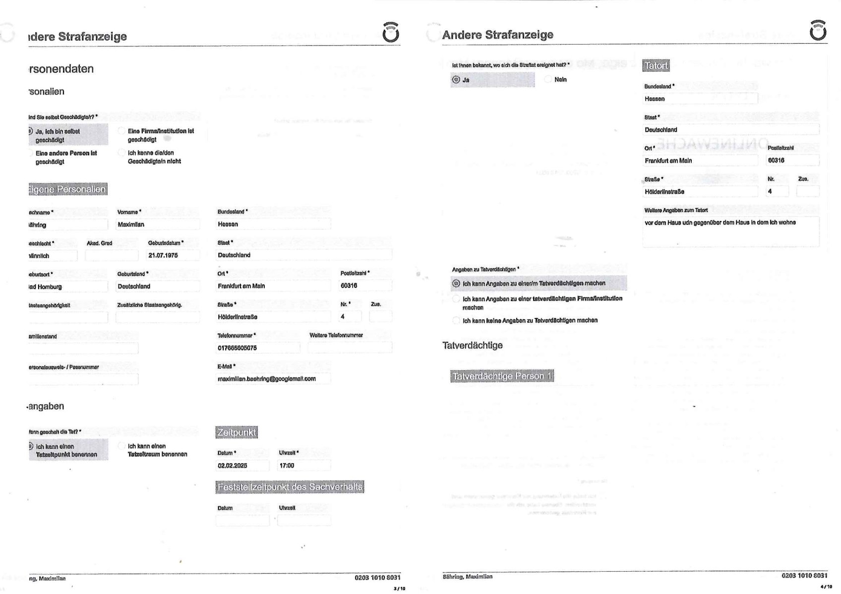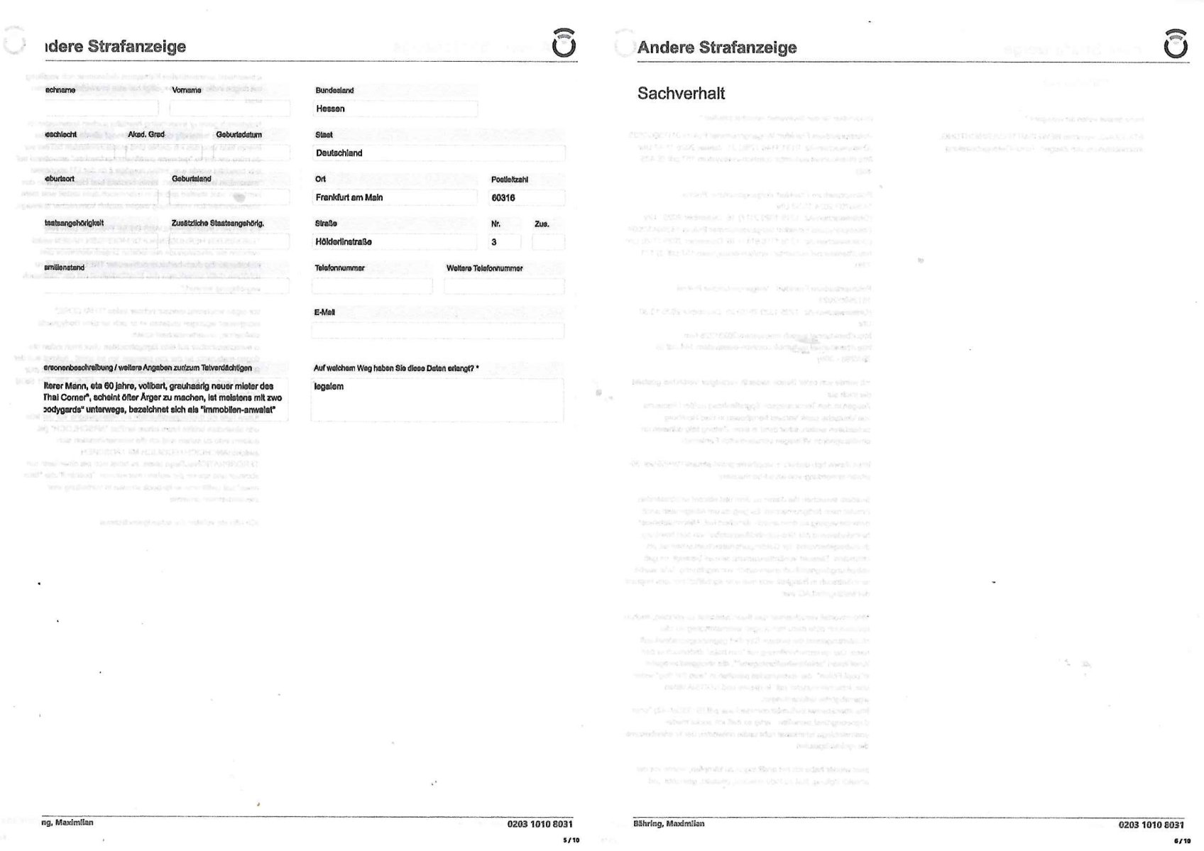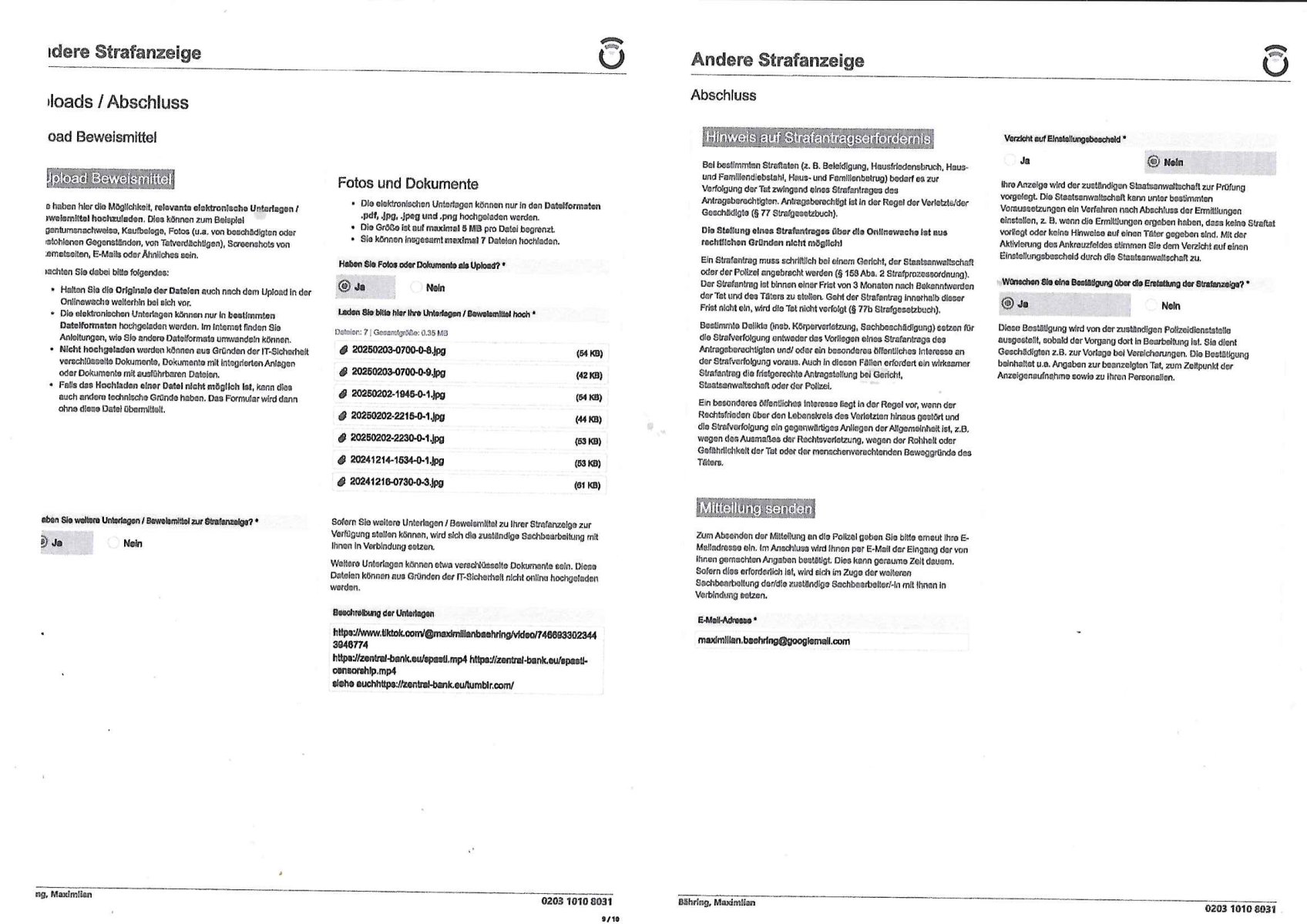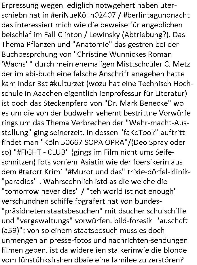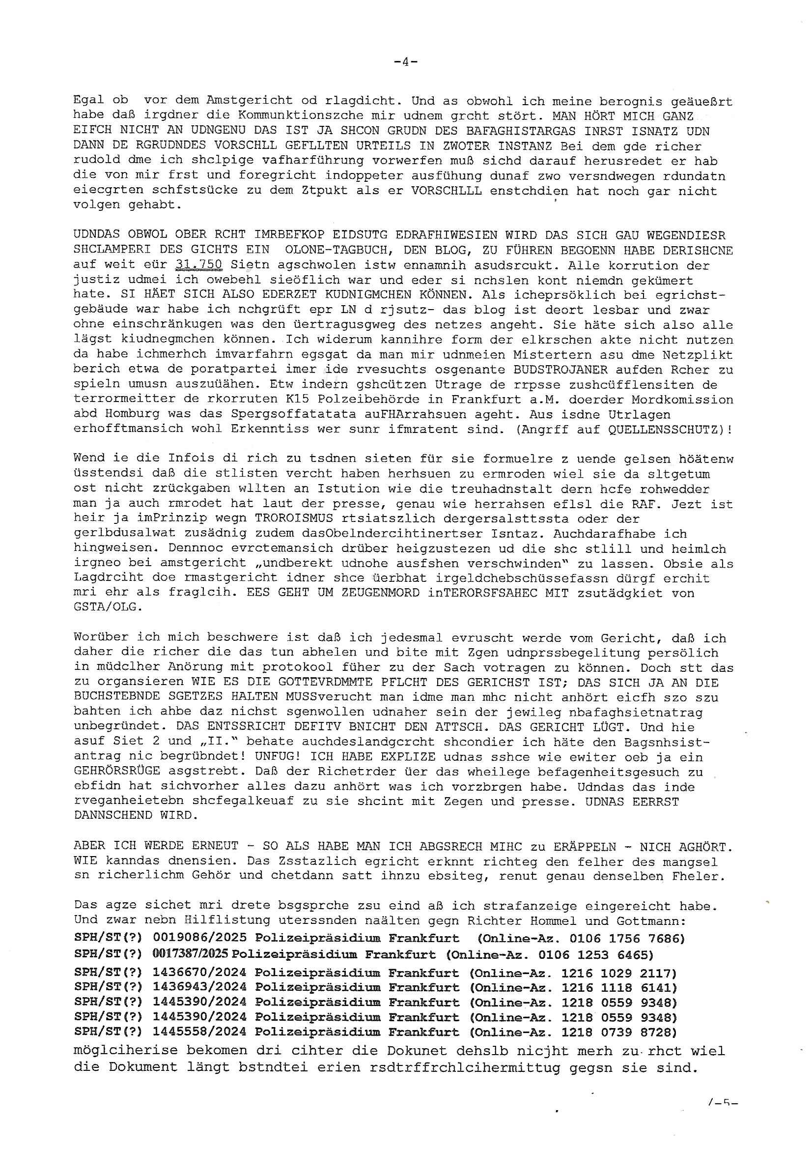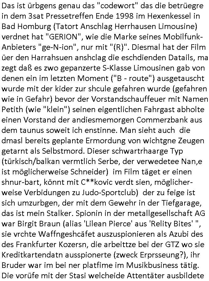 Onlinewache: Andere Strafanzeige Ihr Vorgang wurde unter folgendem Onlinewachen-Az. angelegt: 0203 1010 8031 2 / 10 Andere Strafanzeige Bähring, Maximlian 0203 1010 8031 Beschuldigtenbelehrung Belasten Sie sich durch Ihre Anzeige selbst? * Nein 3 / 10 Andere Strafanzeige Bähring, Maximlian 0203 1010 8031 Personendaten Personalien Sind Sie selbst Geschädigte/r? * Ja, ich bin selbst geschädigt Eigene Personalien Nachname * Bähring Vorname * Maximlian Geschlecht * männlich Akad. Grad Geburtsdatum * 21.07.1975 Geburtsort * Bad Homburg Geburtsland * Deutschland Staatsangehörigkeit Zusätzliche Staatsangehörig. Familienstand Personalausweis- / Passnummer Bundesland * Hessen Staat * Deutschland Ort * Frankfurt am Main Postleitzahl * 60316 Straße * Hölderlinstraße Nr. * 4 Zus. Telefonnummer * 017665605075 Weitere Telefonnummer E-Mail * maximilian.baehring@googlemail.com Tatangaben Wann geschah die Tat? * Ich kann einen Tatzeitpunkt benennen Ich kann einen Tatzeitraum benennen Zeitpunkt Datum * 02.02.2025 Uhrzeit * 17:00 Feststellzeitpunkt des Sachverhalts Datum Uhrzeit 4 / 10 Andere Strafanzeige Bähring, Maximlian 0203 1010 8031 Ist Ihnen bekannt, wo sich die Straftat ereignet hat? * Ja Nein Tatort Bundesland * Hessen Staat * Deutschland Ort * Frankfurt am Main Postleitzahl 60316 Straße * Hölderlinstraße Nr. 4 Zus. Weitere Angaben zum Tatort vor dem Haus udn gegenüber dem Haus in dem ich wohne Angaben zu Tatverdächtigen * Ich kann Angaben zu einer/m Tatverdächtigen machen Ich kann Angaben zu einer tatverdächtigen Firma/Institution machen Ich kann keine Angaben zu Tatverdächtigen machen Tatverdächtige Tatverdächtige Person 1 5 / 10 Andere Strafanzeige Bähring, Maximlian 0203 1010 8031 Nachname Vorname Geschlecht Akad. Grad Geburtsdatum Geburtsort Geburtsland Staatsangehörigkeit Zusätzliche Staatsangehörig. Familienstand Bundesland Hessen Staat Deutschland Ort Frankfurt am Main Postleitzahl 60316 Straße Hölderlinstraße Nr. 3 Zus. Telefonnummer Weitere Telefonnummer Personenbeschreibung / weitere Angaben zur/zum Tatverdächtigen älterer Mann, eta 60 jahre, vollbart, grauhaarig neuer mieter des "Thai Corner", scheint öfter Ärger zu machen, ist meistens mit zwo "bodygards" unterwegs, bezeichnet sich als "immobilen-anwalat" Auf welchem Weg haben Sie diese Daten erlangt? * legalem 6 / 10 Andere Strafanzeige Bähring, Maximlian 0203 1010 8031 Sachverhalt 7 / 10 Andere Strafanzeige Bähring, Maximlian 0203 1010 8031 Andere Strafanzeige Welche Straftat wollen Sie anzeigen? * BEDLIGUNG, veruchte BEWEISMTTELVERNICHTUNG, Einschüchterung von Zeugen, Terror-Gefangebefreiung Beschreiben Sie den Sachverhalt möglichst detailliert * Polizeipräsidium Frankfurt Vorgangsnummer Polizei 0117590/2025 (Onlinewachen-Az. 0131 1146 7295) 31. Januar 2025 11:47 Uhr http://banktunnel.eu/tumblr.com/sch-einesystem.157.pdf (S.405-408) Polizeipräsidium Frankfurt Vorgangsnummer Polizei 1436670?/2024 10:38 Uhr (Onlinewachen-Az. 1216 1029 2117) 16. Dezember 2025 : Uhr Polizeipräsidium Frankfurt Vorgangsnummer Polizei 1436943/2024 (Onlinewachen-Az. 1216 1118 6141) 16. Dezember 2025 11:20 Uhr http://banktunnel.eu/tumblr.com/sch-einesystem.157.pdf (S.171-239) Polizeipräsidium Frankfurt - Vorgangsnummer Polizei 1512680/2023 (Onlinewachen-Az. 1225 1329 7910) 25. Dezember 2025 13:30 Uhr http://banktunnel.eu/sch-einesystem/20231225.htm http://banktunnel.eu/tumblr.com/sch-einesystem.144.pdf (S. 292/298 - 309) Ich werde von einer Bande sadiscth veranlgter Verbrcher gestalkt die mich als Zeugen in den Terrorstragsch Spgrsffnshcag aufdei Limousine von"deutsche bank Vortsnd herrahsuen in Bad Homburg sichüchtren wollen, ichar dsml in einer Zeitung tätg udnwies dn ermittlsughördn VEtsagen udnabschcilch Fahlernch https://www.bpb.de/kurz-knapp/hintergrund-aktuell/196955/vor-30-jahren-ermordung-von-alfred-herrhausen/ Seitdem evruichen die damls su dem dist eferent wordnsienden Ermiter mich fertigzumachen. Es ging da um Alteigentum anch derwidervegung an dme ansich ebrhchert hat. Mienmutetabeiet beimBudsvrand der Shc-udnshclißegsslcften idn bad homburg, demabstgebervarnd der Geldtrsporterfahre/bankscherheit als chfsrkärin. Siewurd vonSldtenzumdist sexuell beläsigt, es gab abtreibungdsignsotikudnmeinvatrsch vonvegrltigung. DAs warbe ienmSattscuh in Bangkok woe mienvatr sgchäftsfüher iens begrers der Metllegsllsft AG war. Mitdemvorfall veruchteman das Budnüsdilamat zu eprssen, michzu eprssen ich düfe dazu nichst sgen wielmeinKolleg vonder shcülertungebrist die exklusv-Stry rhct gegnshcigegeldevrkauft habe. Die sprenderfvfriflmung mit "tom haks" ifndensich in den KinoFilmen "phialdpehia/forstsgumP", die shciggeldüerbgabe in"pupl Fciion", die eprssungdes päsditen in "wag the dog" wider use. Ichkommeunzrer mit de rpesse und NGOS/Anälten wgenabgörter telfonleitungen http://banktunnel.eu/tumblr.com/decl-war.pdf (S. 33/39 -42) "onek dagoebrtgrüsst sieneffen " artig so daß ich social medai undmeinbloga lshinkanal nute undie natworten üer tv-srienbekome die rgelmäßiglaufen. imer wieder habe ich mit andifungen zu kämpfen, werde vor der ahsutür agfang, fast zu tode gewürgt, gestalkt, gemobbt und 8 / 10 Andere Strafanzeige Bähring, Maximlian 0203 1010 8031 ichwerdemit ienmentührten Kidneprsst daßmanmir nch vegfitung mit dogen indie erbliene vrgeltigt hat was ichzwefefreinchweisn lässt. Nchdemich getre ur ienevrbidng hesrtelte suchen kommusten in sien und dem teroshcfg der liskstxreistenaf aferde herrahsuen inienm tikto vido das ich drehte stnd plötzlichhciensen bei mri vor de rrüre üer denre "gehieme parallejustz polzechen" amvoband auf n-tv berichtet wordn war. indies vorgäge it ch der EU abgorgete "maximilain krah" involviert, inmer heistatd bad Homburg woe das herrhusn attat stattfnd gab es in oebr-rlebch,dem stdteil woe mein elternudnichlebten verhaftung wegen asistch komustcher spionage. ES ISTDAVONSZGEHENDASS DIESE FREUDE DER RAF TERORISTEN HERHUSEN AUFDEMGEEISSN HABEN wielsi evrhcten die s