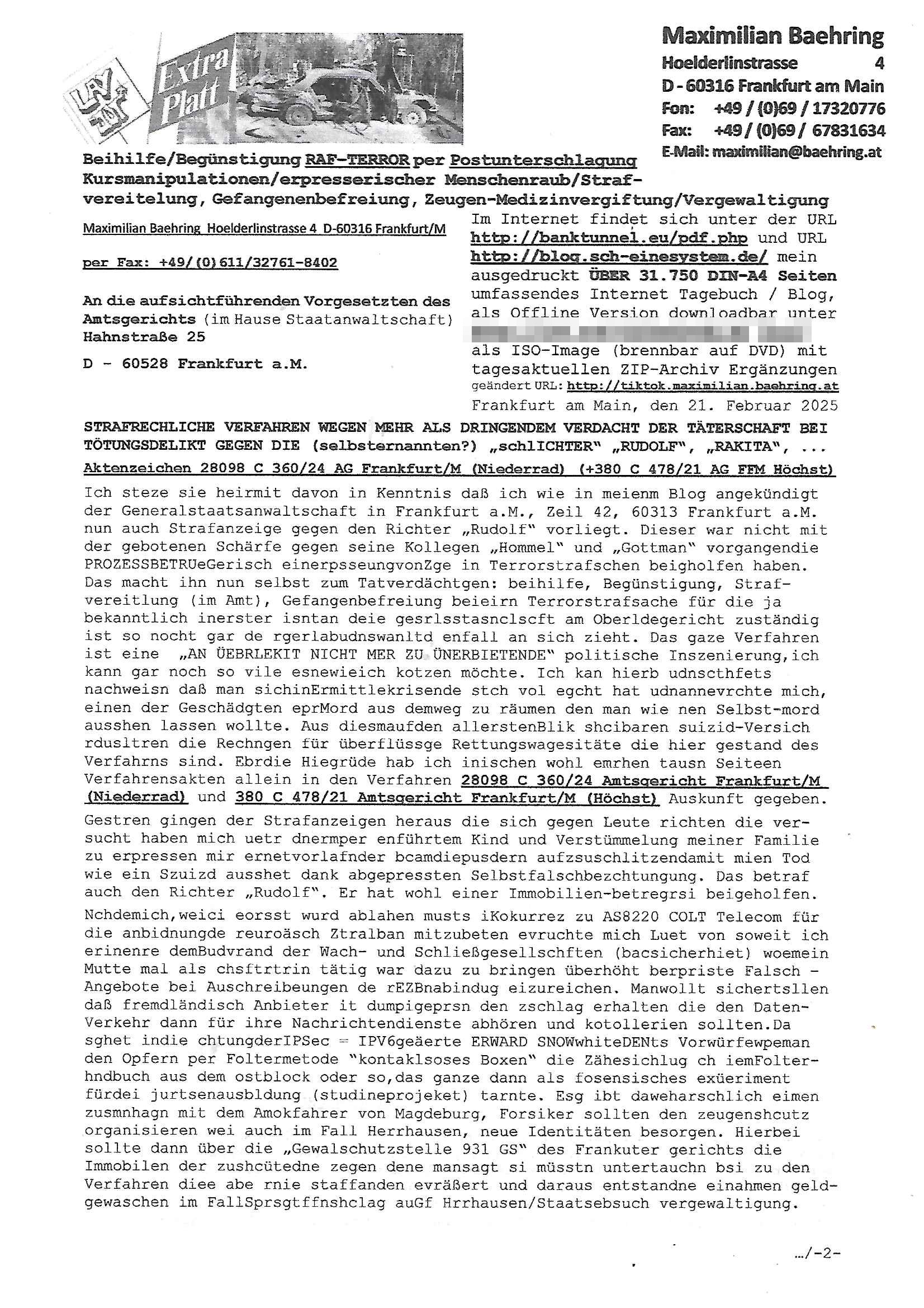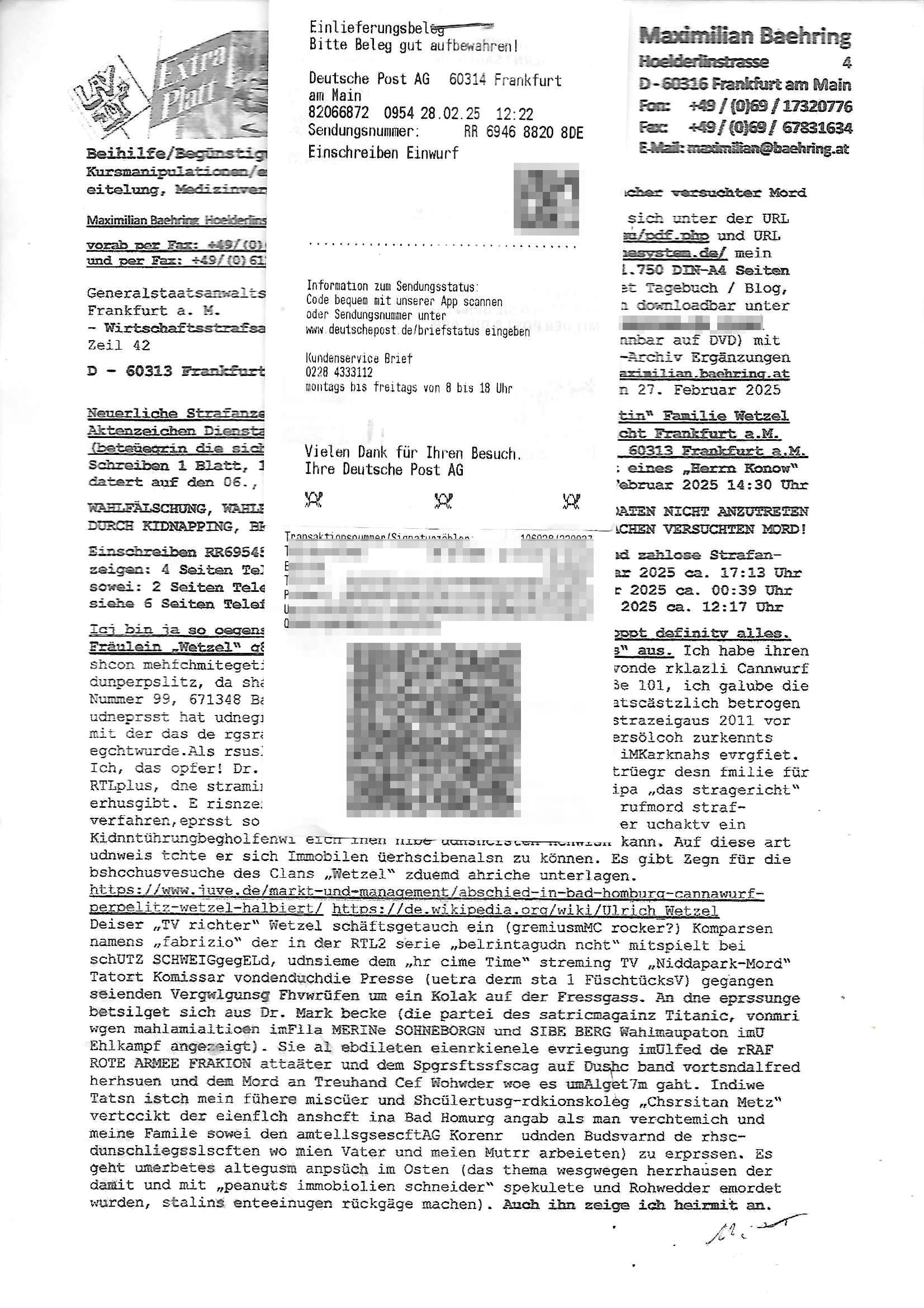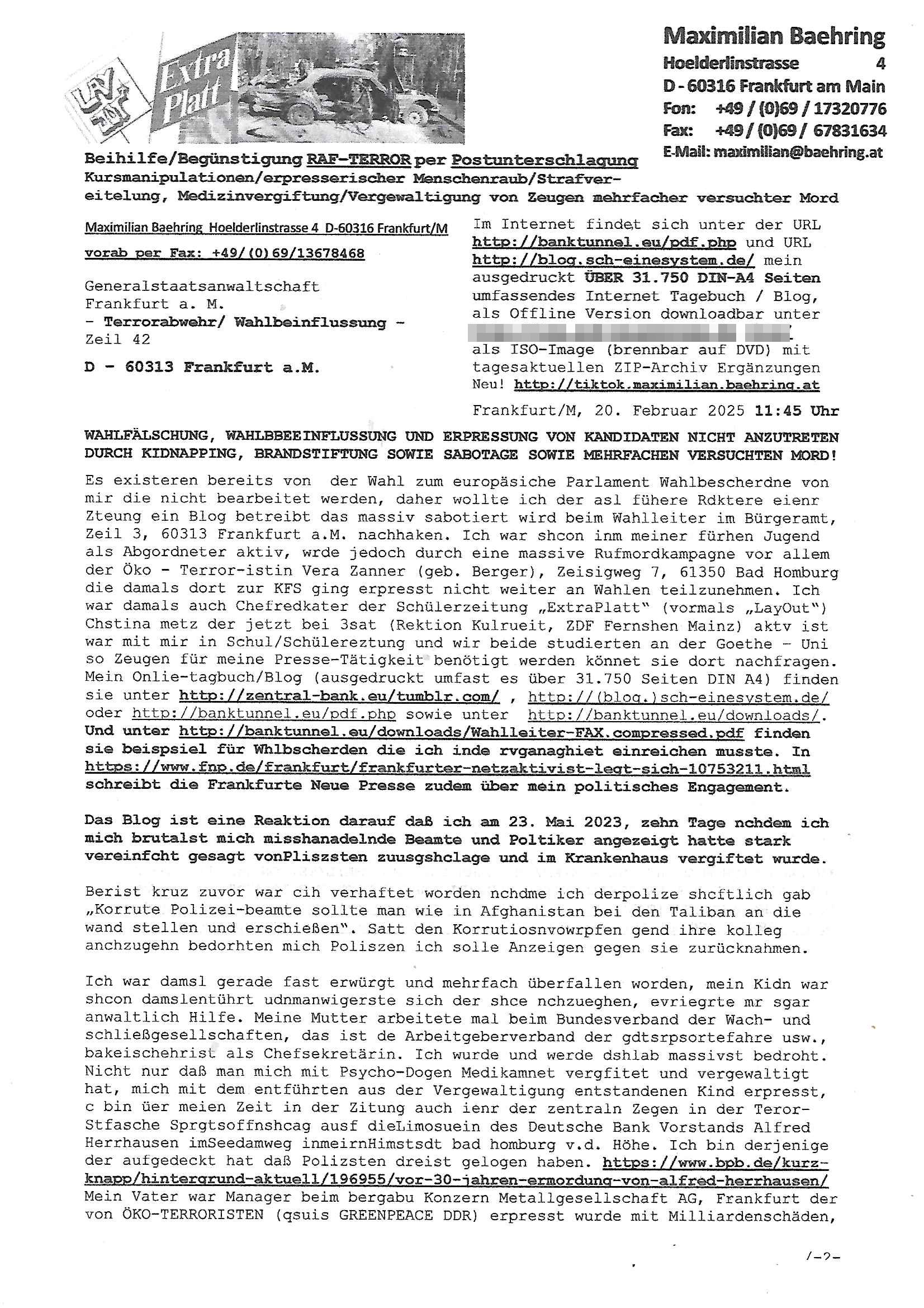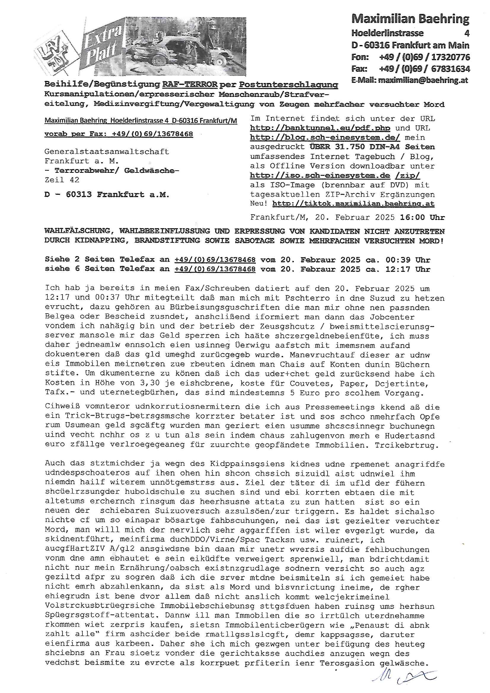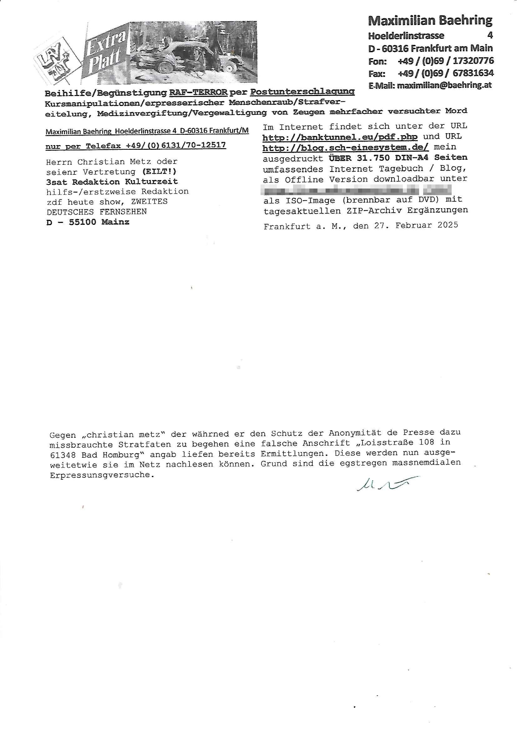 Maximilian Baehring Hoelderlinstrasse 4 D-60316 Frankfurt/M nur per Telefax +49/(0)6131/70-12517 Herrn Christian Metz oder seienr Vertretung (EILT!) 3sat Redaktion Kulturzeit hilfs-/erstzweise Redaktion zdf heute show, ZWEITES DEUTSCHES FERNSEHEN D – 55100 Mainz Im Internet findet sich unter der URLhttp://banktunnel.eu/pdf.php und URL http://blog.sch-einesystem.de/ mein ausgedruckt ÜBER 31.750 DIN-A4 Seiten umfassendes Internet Tagebuch / Blog,als Offline Version downloadbar unterhttp://*** /***/ als ISO-Image (brennbar auf DVD) mit tagesaktuellen ZIP-Archiv Ergänzungen Frankfurt a. M., den 27. Februar 2025 Gegen „christian metz“ der währned er den Schutz der Anonymität de Presse dazu missbrauchte Stratfaten zu begehen eine falsche Anschrift „Loisstraße 108 in 61348 Bad Homburg“ angab liefen bereits Ermittlungen. Diese werden nun ausge-weitetwie sie im Netz nachlesen können. Grund sind die egstregen massnemdialen Erpressunsgversuche. -------- Nachricht -------- Betreff: Faxversand an 061317012157 war erfolgreich Datum: Thu, 27 Feb 2025 13:48:00 +0000 (UTC) Von: Fax <noreply_fax@> An: maximilian.baehring@ Web2Fax Faxversand an 061317012157 war erfolgreich Guten Tag, folgendes Fax wurde erfolgreich zugestellt: Ihre Fax-Rufnummer: 00496967831634 Ihre Faxkennung: Maximilian-Baehring Empfänger: 061317012157 Zeitpunkt: Thu, 27 Feb 2025 14:48:00 +0100 Seiten: 3 Eine Kopie des Faxes finden Sie im Anhang. Wir danken Ihnen dafür, dass Sie unseren Service genutzt haben. | |