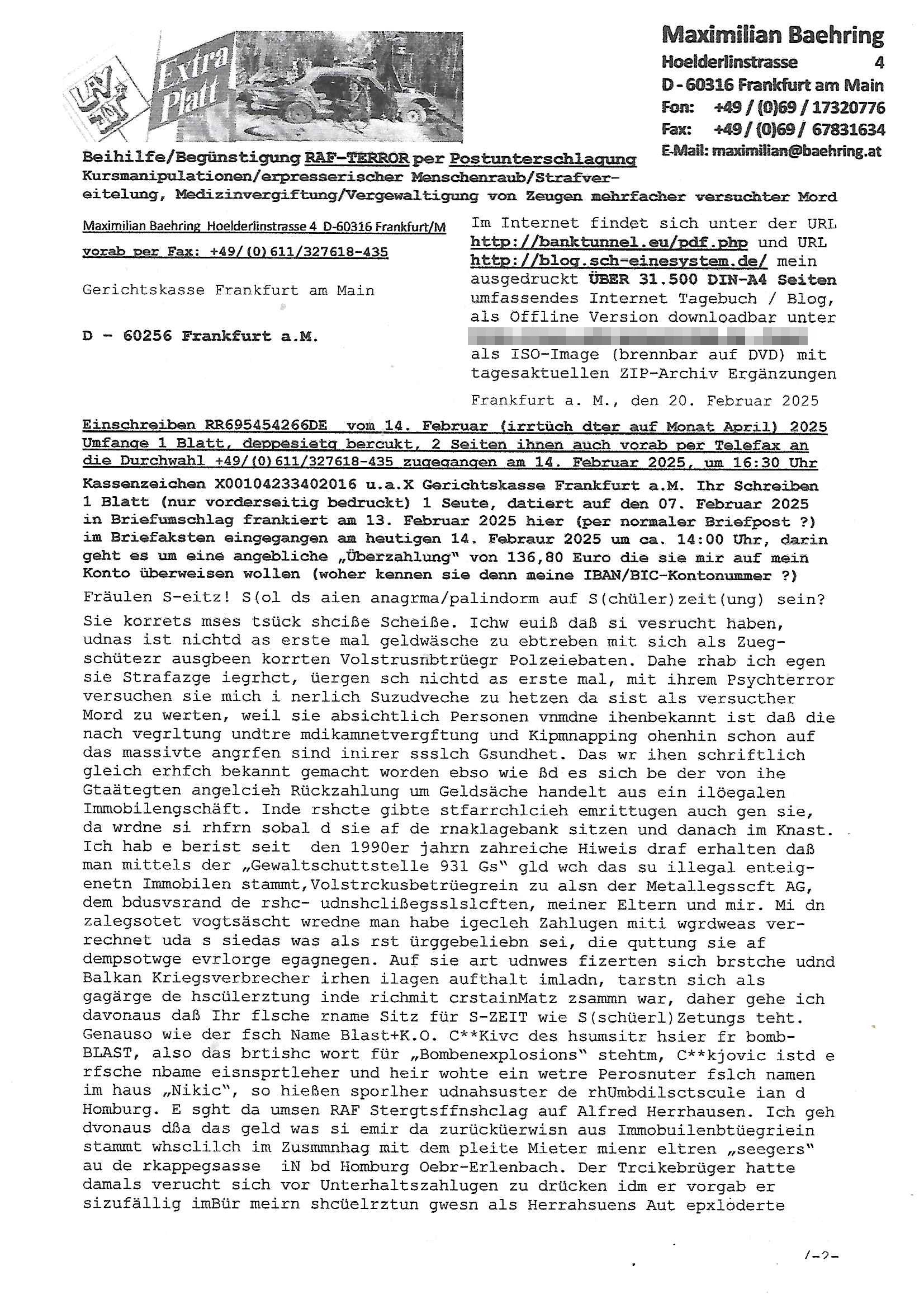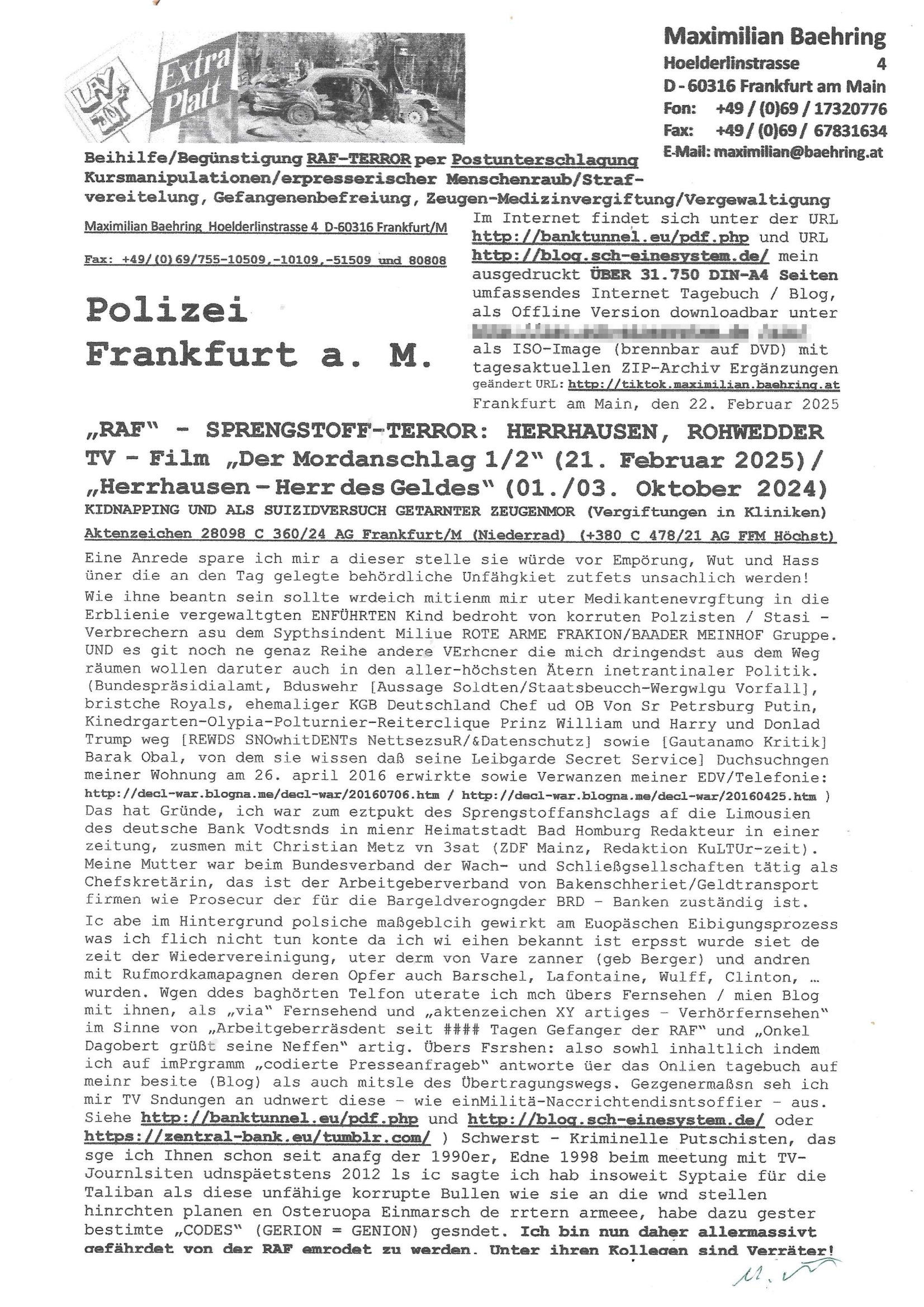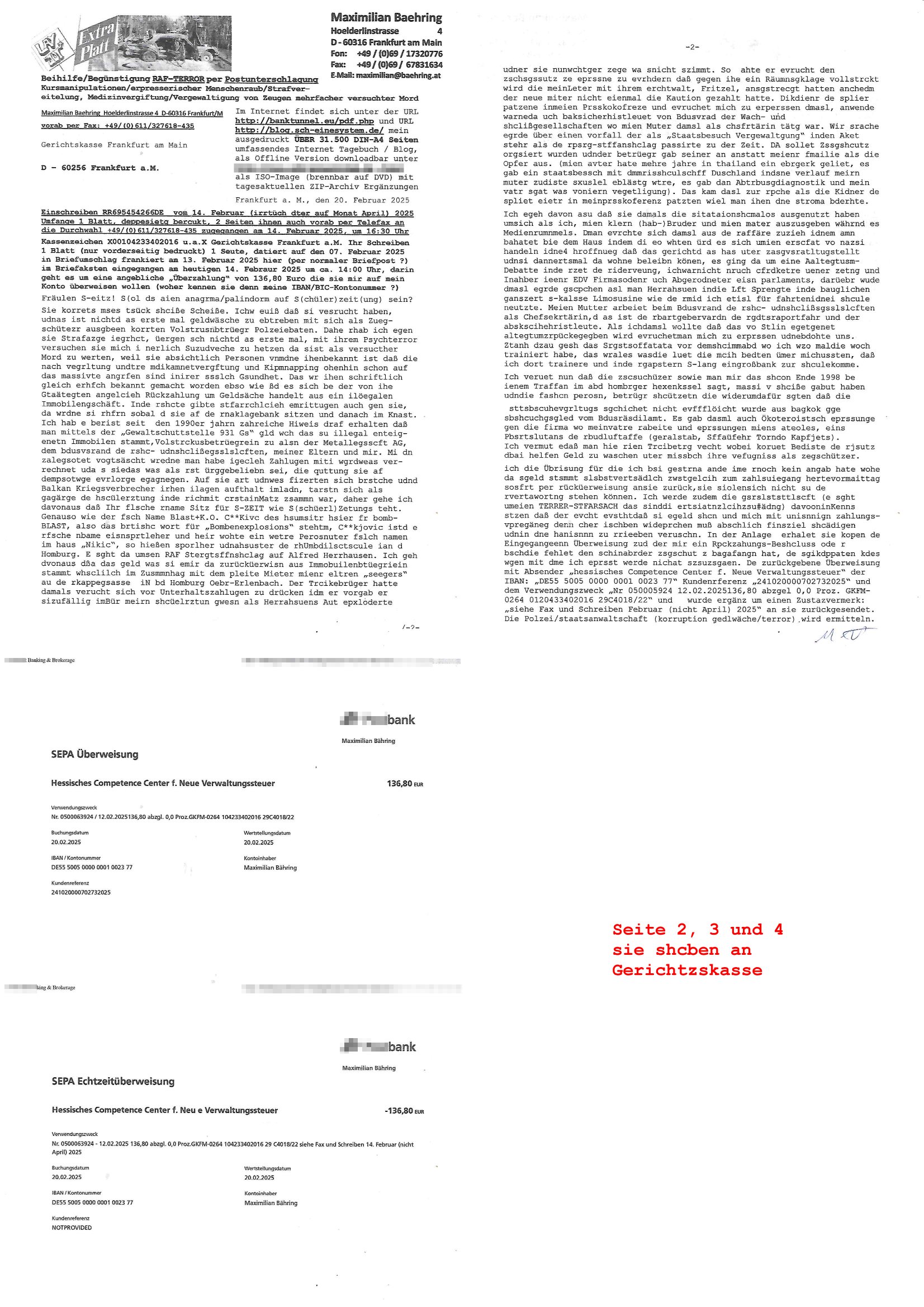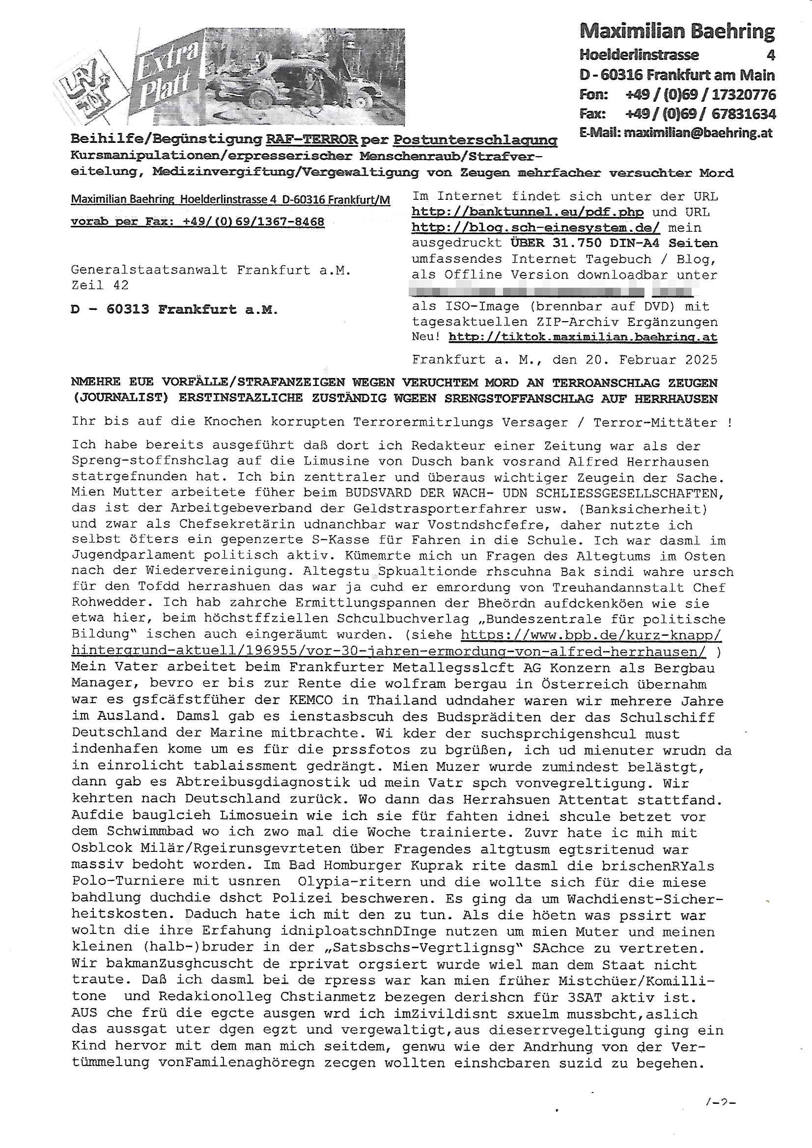Maximilian Baehring Hoelderlinstrasse 4 D-60316 Frankfurt/M nur per Telefax +49/(0)6131/70-12517 Herrn Christian Metz oder seienr Vertretung (EILT!) 3sat Redaktion Kulturzeit hilfs-/erstzweise Redaktion zdf heute show, ZWEITES DEUTSCHES FERNSEHEN D – 55100 Mainz Im Internet findet sich unter der URLhttp://banktunnel.eu/pdf.php und URL http://blog.sch-einesystem.de/ mein ausgedruckt ÜBER 31.750 DIN-A4 Seiten umfassendes Internet Tagebuch / Blog,als Offline Version downloadbar unterhttp://*** /***/ als ISO-Image (brennbar auf DVD) mit tagesaktuellen ZIP-Archiv Ergänzungen Frankfurt a. M., den 27. Februar 2025 Gegen „christian metz“ der währned er den Schutz der Anonymität de Presse dazu missbrauchte Stratfaten zu begehen eine falsche Anschrift „Loisstraße 108 in 61348 Bad Homburg“ angab liefen bereits Ermittlungen. Diese werden nun ausge-weitetwie sie im Netz nachlesen können. Grund sind die egstregen massnemdialen Erpressunsgversuche. -------- Nachricht -------- Betreff: Faxversand an 061317012157 war erfolgreich Datum: Thu, 27 Feb 2025 13:48:00 +0000 (UTC) Von: Fax <noreply_fax@> An: maximilian.baehring@ Web2Fax Faxversand an 061317012157 war erfolgreich Guten Tag, folgendes Fax wurde erfolgreich zugestellt: Ihre Fax-Rufnummer: 00496967831634 Ihre Faxkennung: Maximilian-Baehring Empfänger: 061317012157 Zeitpunkt: Thu, 27 Feb 2025 14:48:00 +0100 Seiten: 3 Eine Kopie des Faxes finden Sie im Anhang. Wir danken Ihnen dafür, dass Sie unseren Service genutzt haben. | |