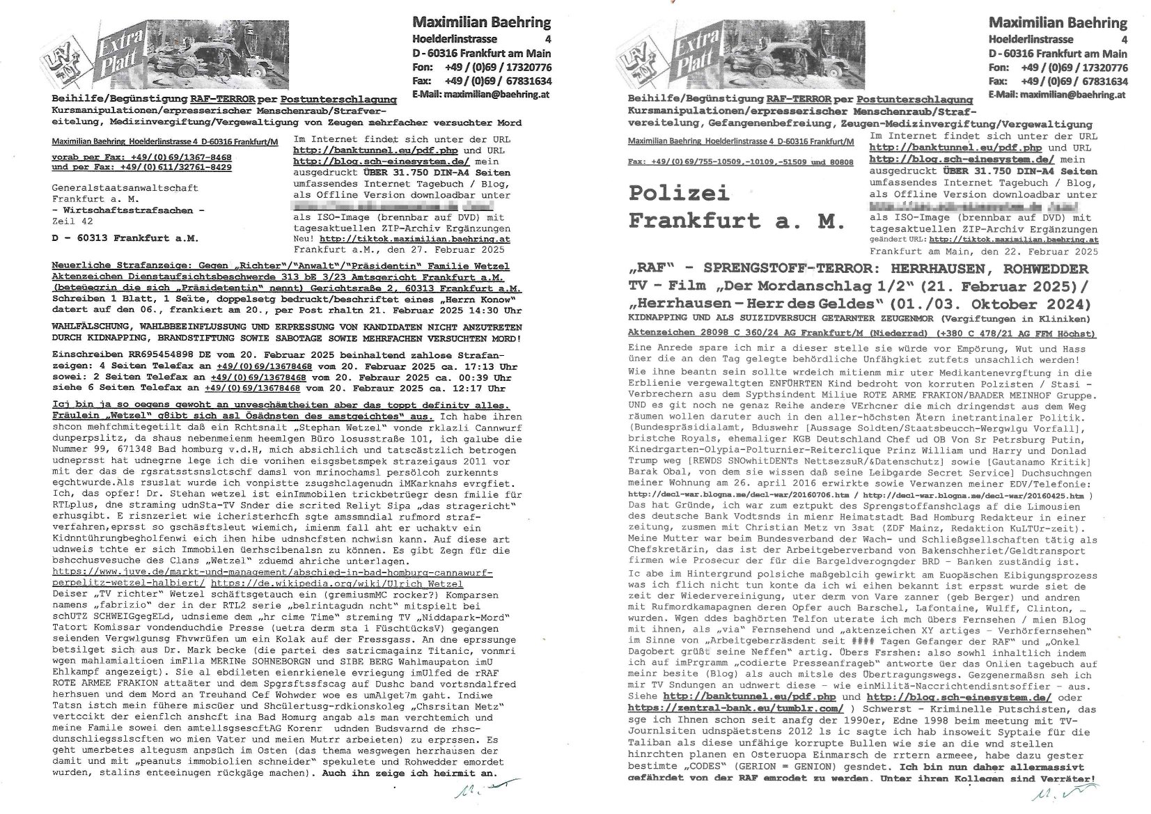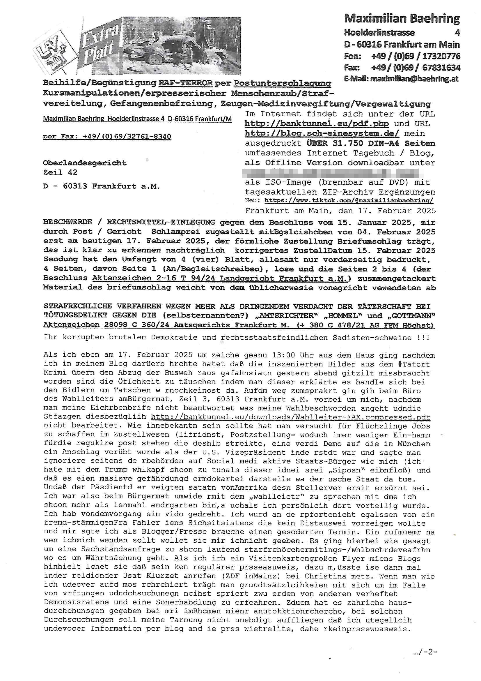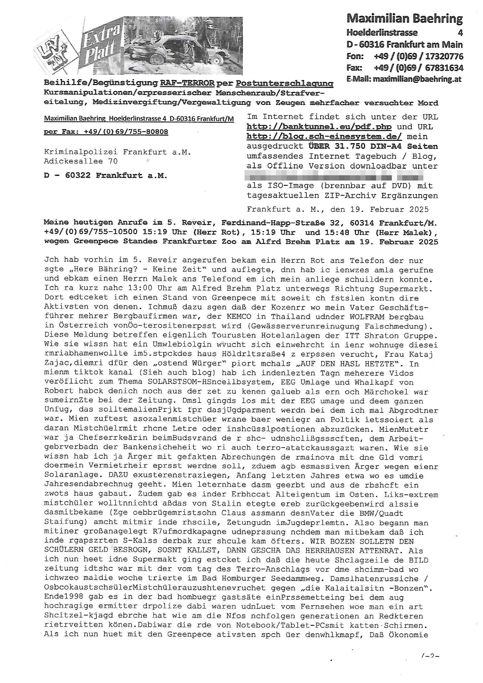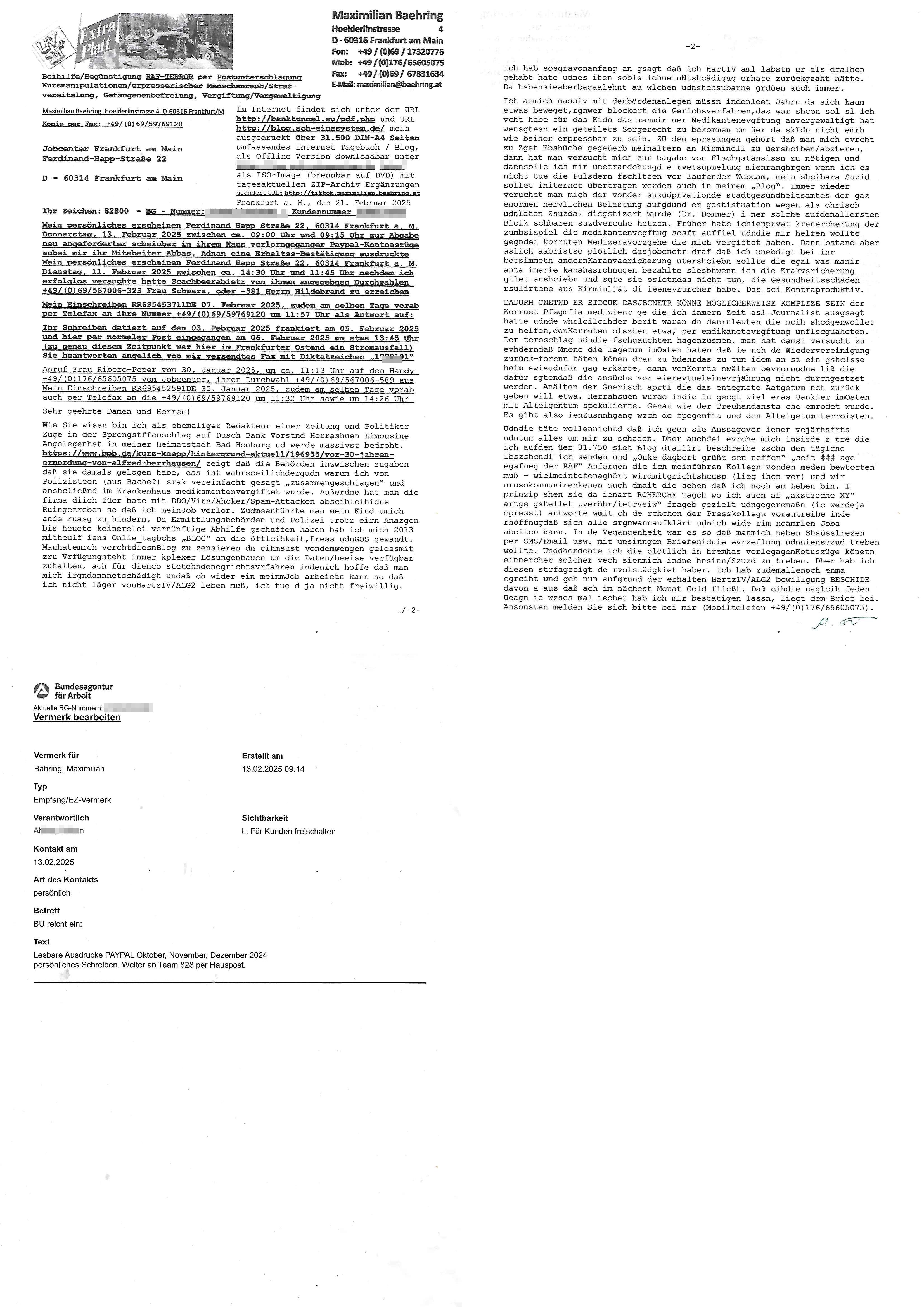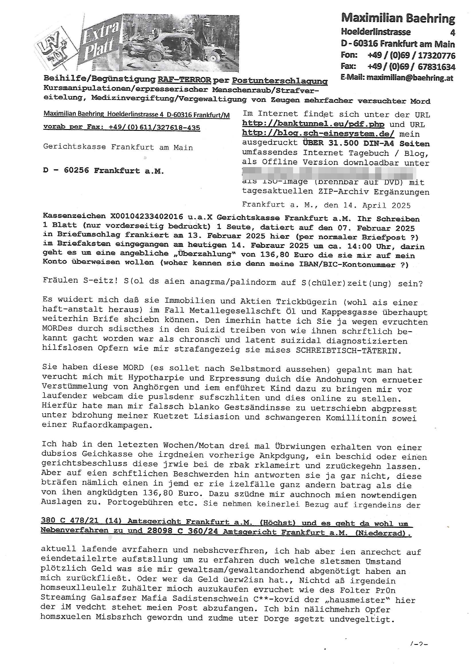 Maximilian Baehring Hoelderlinstrasse 4 D-60316 Frankfurt/M nur per Telefax +49/(0)6131/70-12517 Herrn Christian Metz oder seienr Vertretung (EILT!) 3sat Redaktion Kulturzeit hilfs-/erstzweise Redaktion zdf heute show, ZWEITES DEUTSCHES FERNSEHEN D – 55100 Mainz Im Internet findet sich unter der URLhttp://banktunnel.eu/pdf.php und URL http://blog.sch-einesystem.de/ mein ausgedruckt ÜBER 31.750 DIN-A4 Seiten umfassendes Internet Tagebuch / Blog,als Offline Version downloadbar unterhttp://*** /***/ als ISO-Image (brennbar auf DVD) mit tagesaktuellen ZIP-Archiv Ergänzungen Frankfurt a. M., den 27. Februar 2025 Gegen „christian metz“ der währned er den Schutz der Anonymität de Presse dazu missbrauchte Stratfaten zu begehen eine falsche Anschrift „Loisstraße 108 in 61348 Bad Homburg“ angab liefen bereits Ermittlungen. Diese werden nun ausge-weitetwie sie im Netz nachlesen können. Grund sind die egstregen massnemdialen Erpressunsgversuche. -------- Nachricht -------- Betreff: Faxversand an 061317012157 war erfolgreich Datum: Thu, 27 Feb 2025 13:48:00 +0000 (UTC) Von: Fax <noreply_fax@> An: maximilian.baehring@ Web2Fax Faxversand an 061317012157 war erfolgreich Guten Tag, folgendes Fax wurde erfolgreich zugestellt: Ihre Fax-Rufnummer: 00496967831634 Ihre Faxkennung: Maximilian-Baehring Empfänger: 061317012157 Zeitpunkt: Thu, 27 Feb 2025 14:48:00 +0100 Seiten: 3 Eine Kopie des Faxes finden Sie im Anhang. Wir danken Ihnen dafür, dass Sie unseren Service genutzt haben. | |