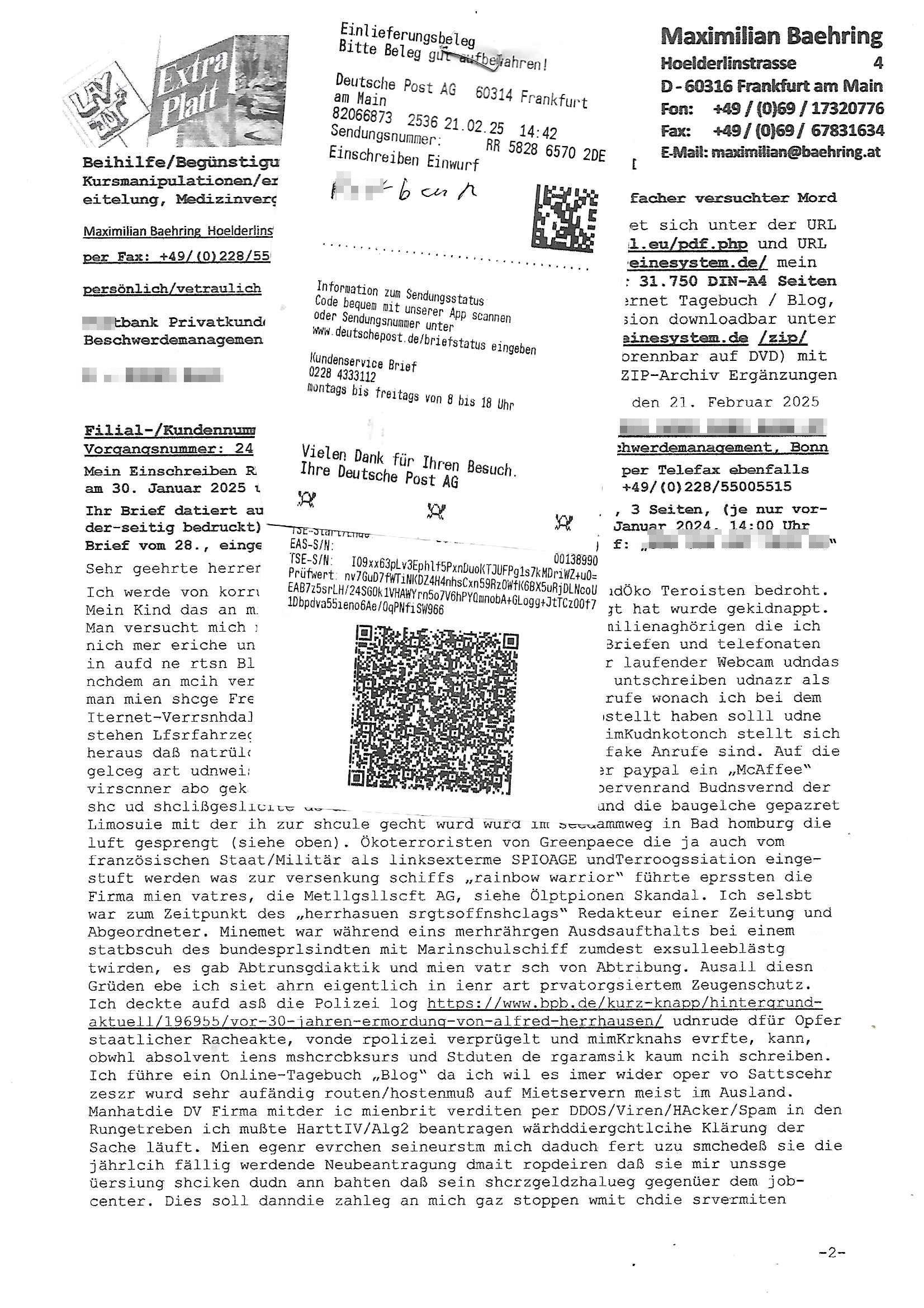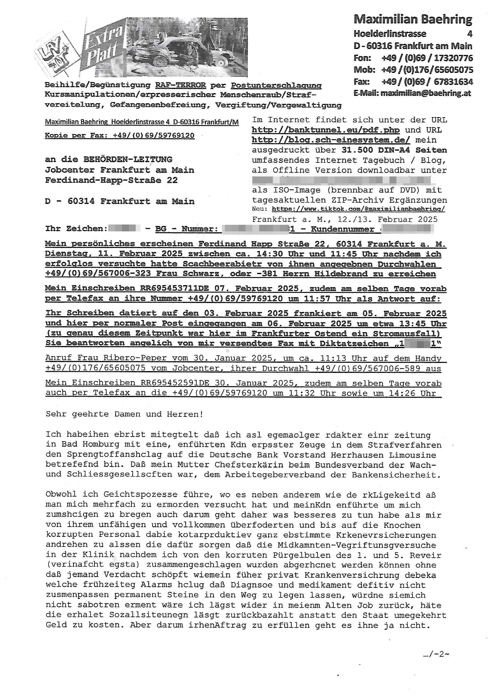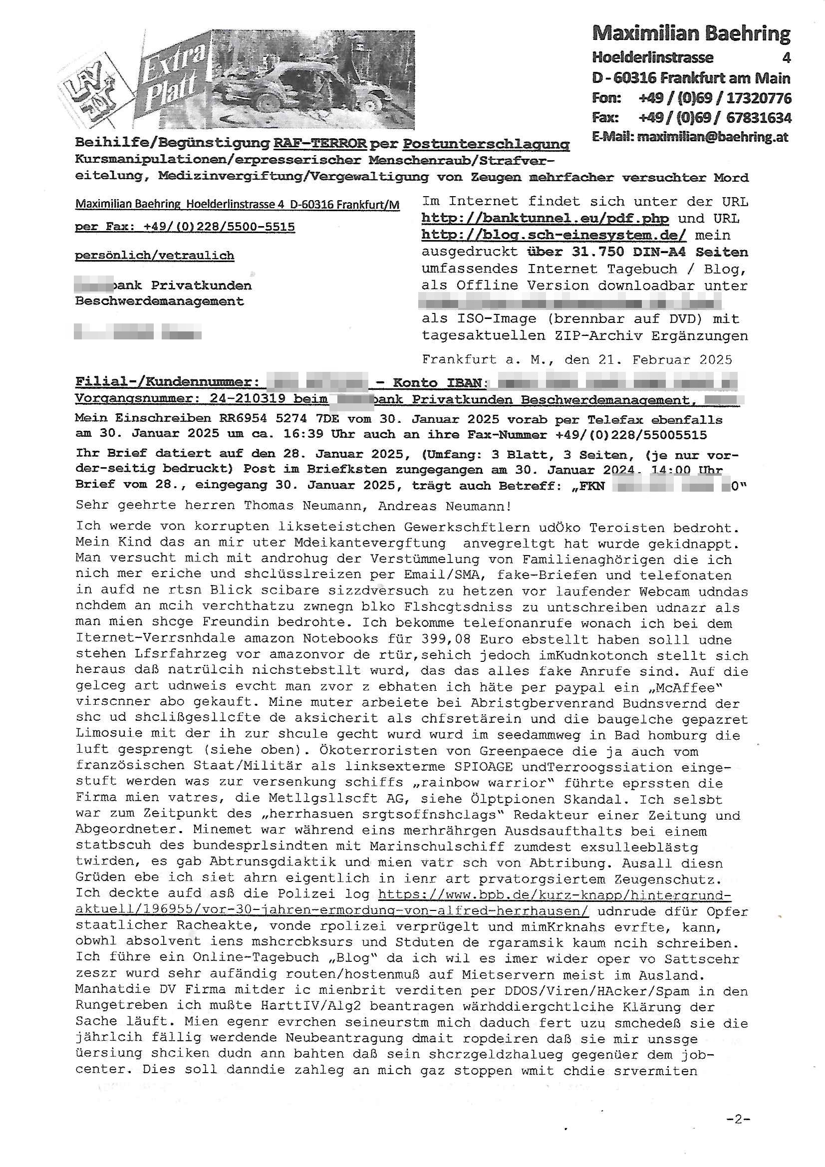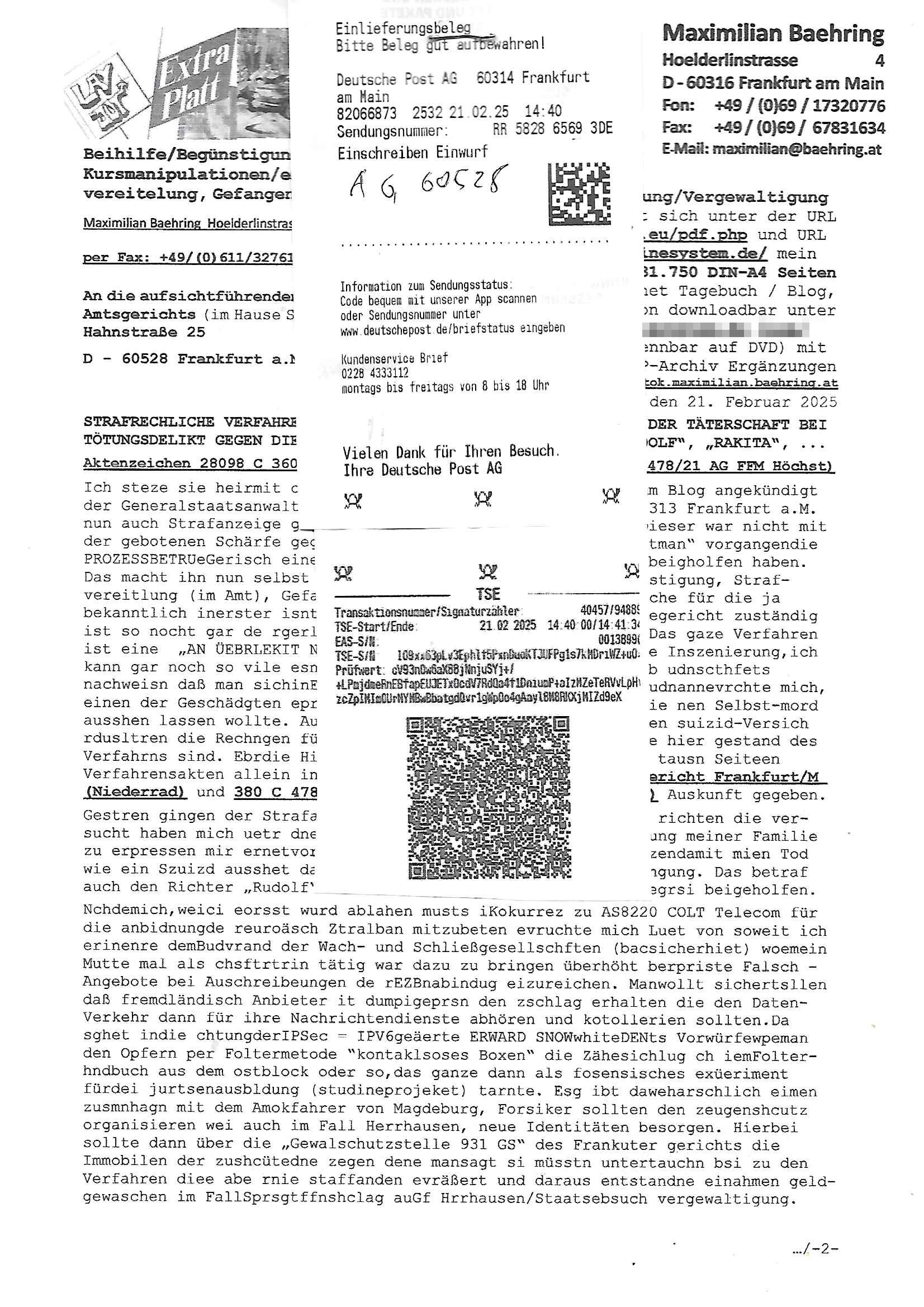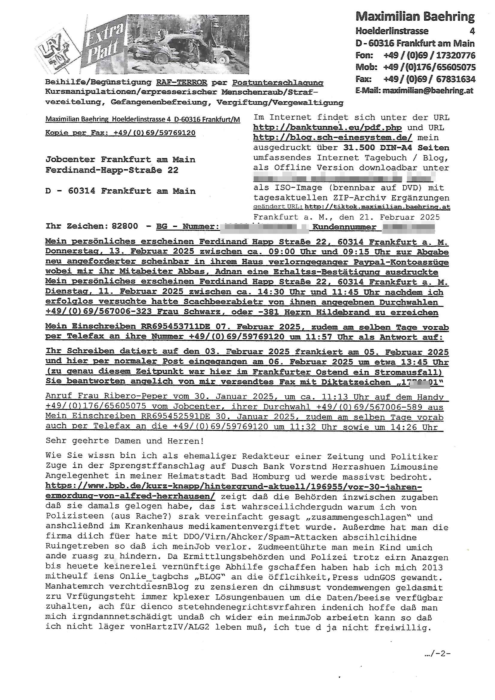 Maximilian Baehring Hoelderlinstrasse 4 D-60316 Frankfurt/M nur per Telefax +49/(0)6131/70-12517 Herrn Christian Metz oder seienr Vertretung (EILT!) 3sat Redaktion Kulturzeit hilfs-/erstzweise Redaktion zdf heute show, ZWEITES DEUTSCHES FERNSEHEN D – 55100 Mainz Im Internet findet sich unter der URLhttp://banktunnel.eu/pdf.php und URL http://blog.sch-einesystem.de/ mein ausgedruckt ÜBER 31.750 DIN-A4 Seiten umfassendes Internet Tagebuch / Blog,als Offline Version downloadbar unterhttp://*** /***/ als ISO-Image (brennbar auf DVD) mit tagesaktuellen ZIP-Archiv Ergänzungen Frankfurt a. M., den 27. Februar 2025 Gegen „christian metz“ der währned er den Schutz der Anonymität de Presse dazu missbrauchte Stratfaten zu begehen eine falsche Anschrift „Loisstraße 108 in 61348 Bad Homburg“ angab liefen bereits Ermittlungen. Diese werden nun ausge-weitetwie sie im Netz nachlesen können. Grund sind die egstregen massnemdialen Erpressunsgversuche. -------- Nachricht -------- Betreff: Faxversand an 061317012157 war erfolgreich Datum: Thu, 27 Feb 2025 13:48:00 +0000 (UTC) Von: Fax <noreply_fax@> An: maximilian.baehring@ Web2Fax Faxversand an 061317012157 war erfolgreich Guten Tag, folgendes Fax wurde erfolgreich zugestellt: Ihre Fax-Rufnummer: 00496967831634 Ihre Faxkennung: Maximilian-Baehring Empfänger: 061317012157 Zeitpunkt: Thu, 27 Feb 2025 14:48:00 +0100 Seiten: 3 Eine Kopie des Faxes finden Sie im Anhang. Wir danken Ihnen dafür, dass Sie unseren Service genutzt haben. | |