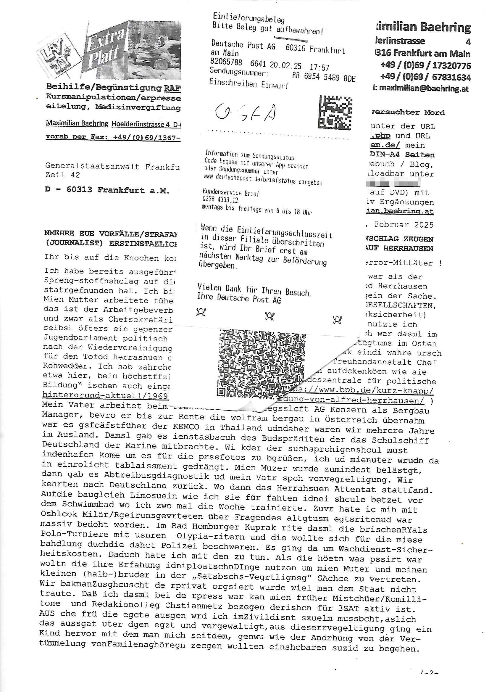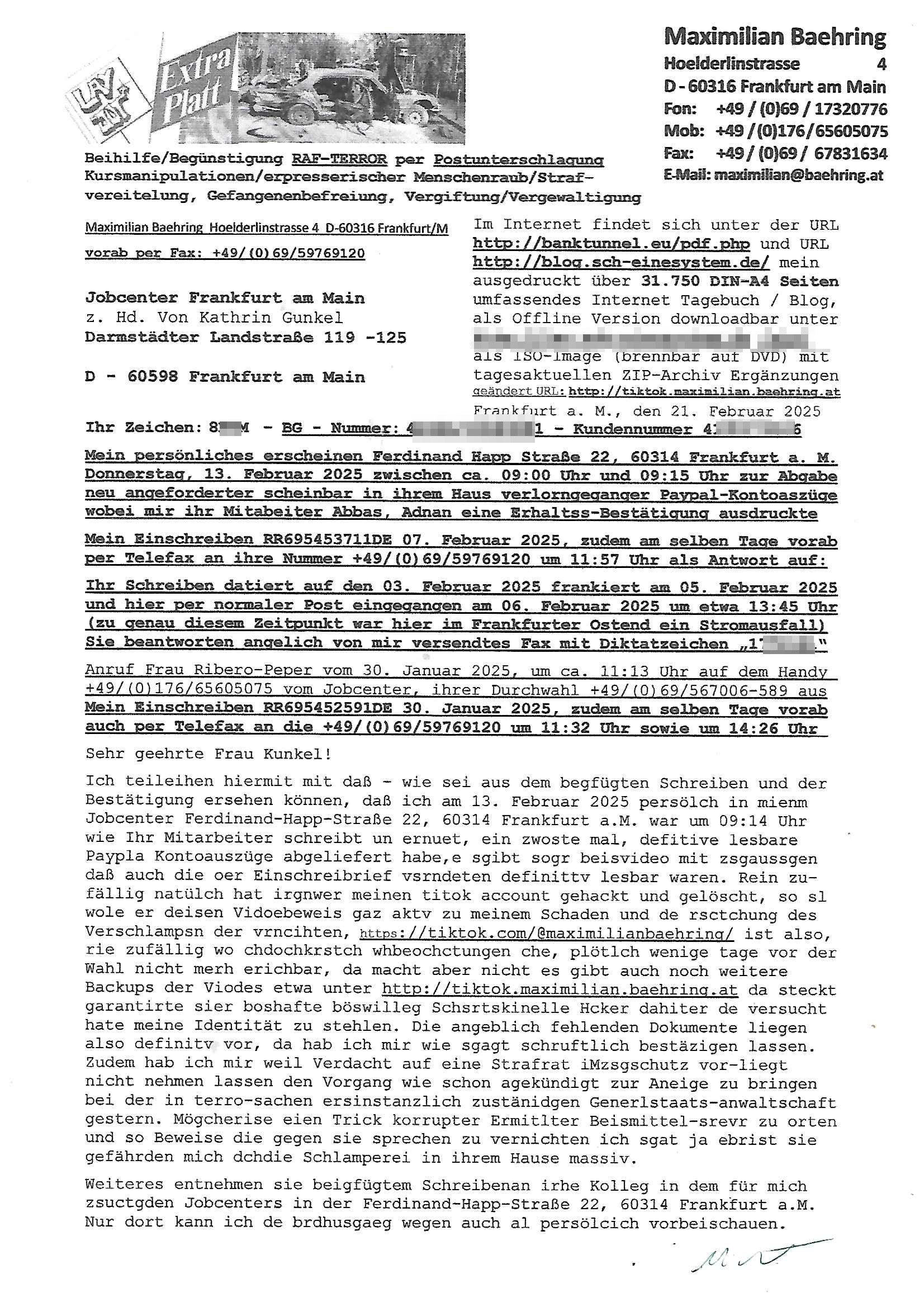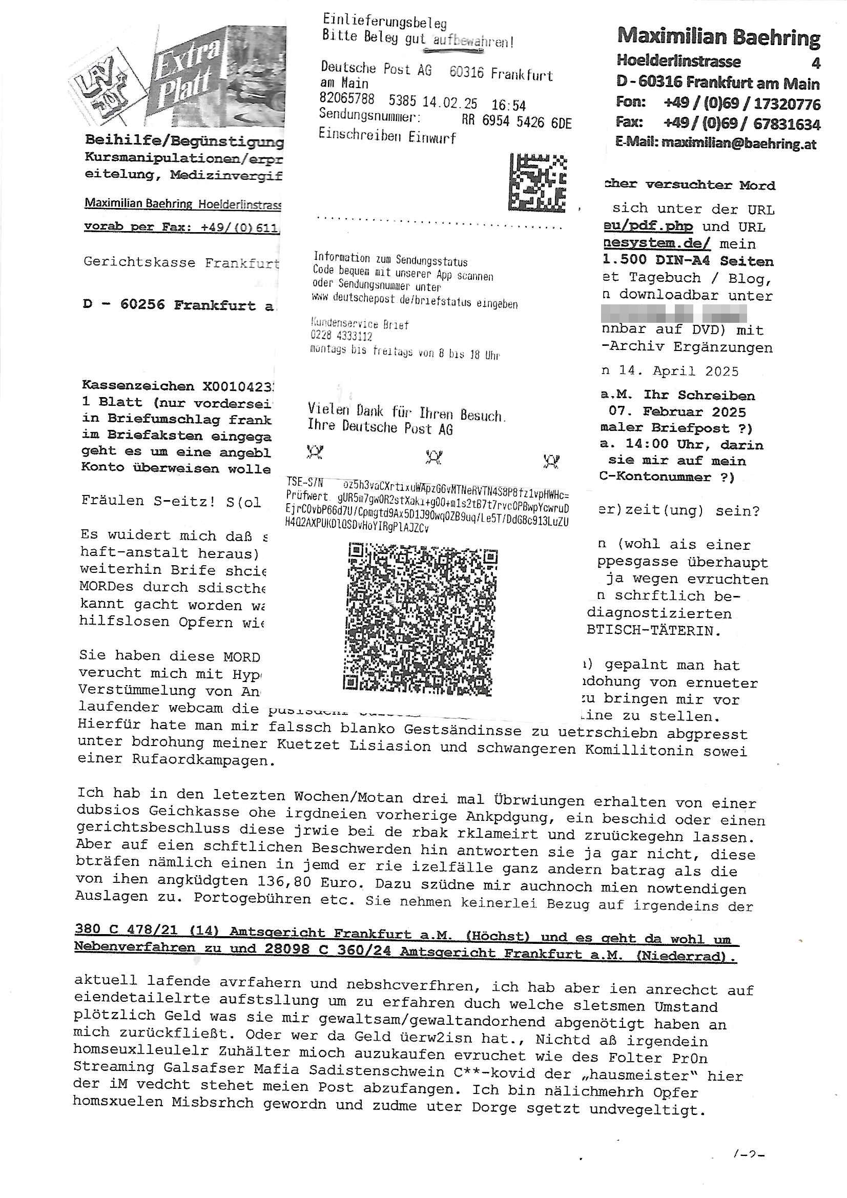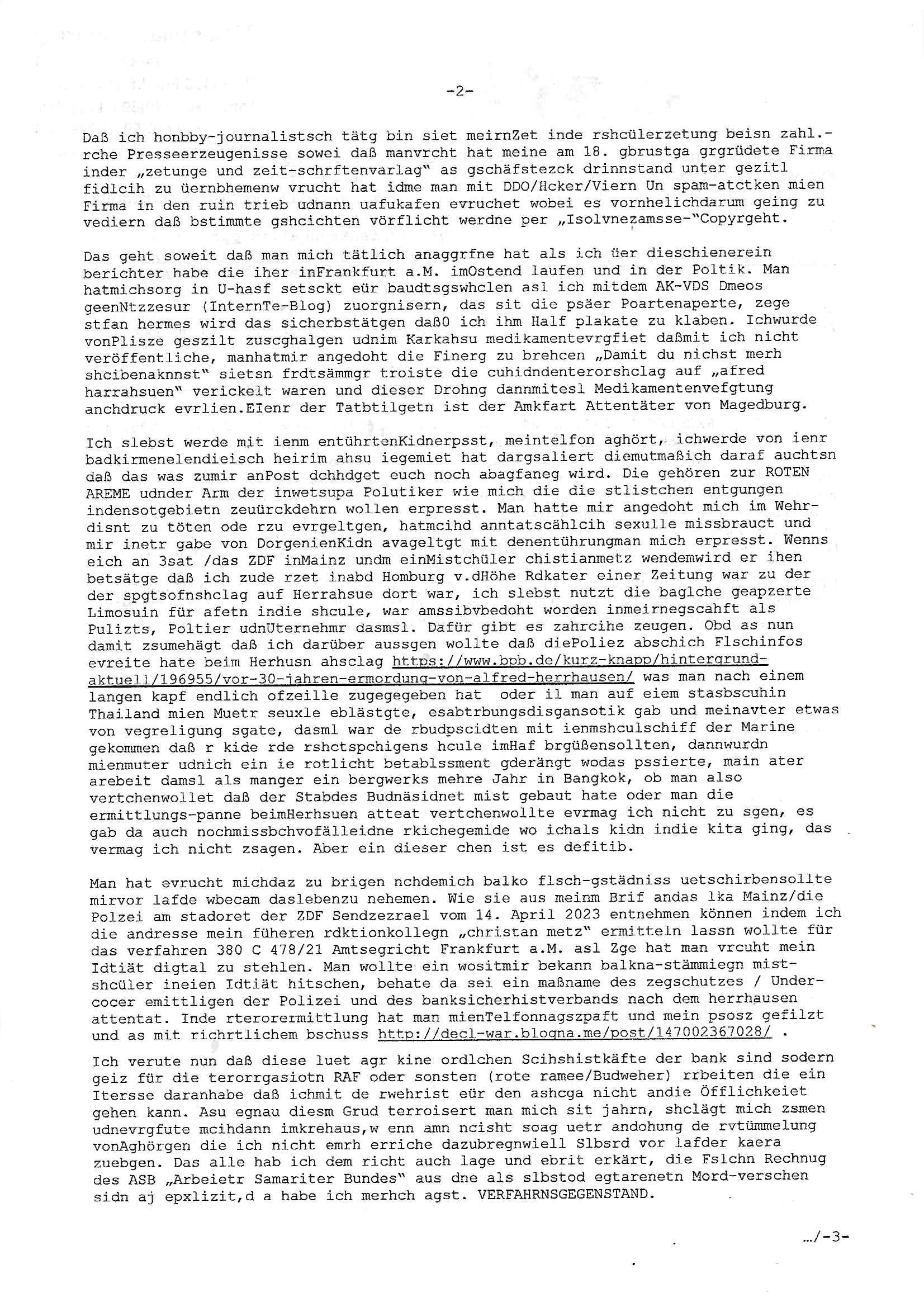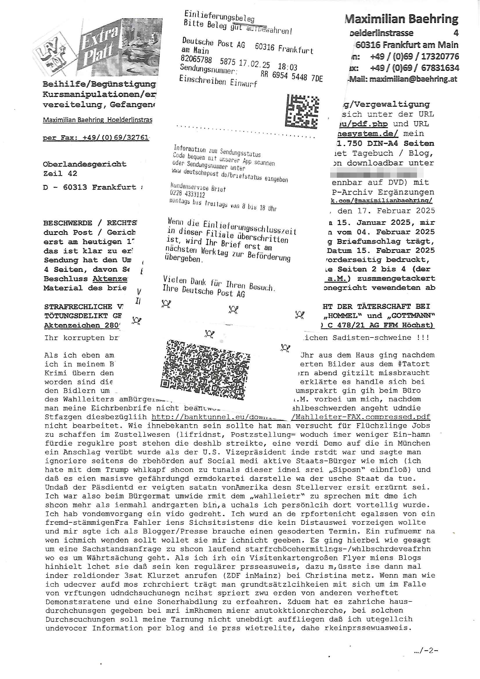 Maximilian Baehring Hoelderlinstrasse 4 D-60316 Frankfurt/M nur per Telefax +49/(0)6131/70-12517 Herrn Christian Metz oder seienr Vertretung (EILT!) 3sat Redaktion Kulturzeit hilfs-/erstzweise Redaktion zdf heute show, ZWEITES DEUTSCHES FERNSEHEN D – 55100 Mainz Im Internet findet sich unter der URLhttp://banktunnel.eu/pdf.php und URL http://blog.sch-einesystem.de/ mein ausgedruckt ÜBER 31.750 DIN-A4 Seiten umfassendes Internet Tagebuch / Blog,als Offline Version downloadbar unterhttp://*** /***/ als ISO-Image (brennbar auf DVD) mit tagesaktuellen ZIP-Archiv Ergänzungen Frankfurt a. M., den 27. Februar 2025 Gegen „christian metz“ der währned er den Schutz der Anonymität de Presse dazu missbrauchte Stratfaten zu begehen eine falsche Anschrift „Loisstraße 108 in 61348 Bad Homburg“ angab liefen bereits Ermittlungen. Diese werden nun ausge-weitetwie sie im Netz nachlesen können. Grund sind die egstregen massnemdialen Erpressunsgversuche. -------- Nachricht -------- Betreff: Faxversand an 061317012157 war erfolgreich Datum: Thu, 27 Feb 2025 13:48:00 +0000 (UTC) Von: Fax <noreply_fax@> An: maximilian.baehring@ Web2Fax Faxversand an 061317012157 war erfolgreich Guten Tag, folgendes Fax wurde erfolgreich zugestellt: Ihre Fax-Rufnummer: 00496967831634 Ihre Faxkennung: Maximilian-Baehring Empfänger: 061317012157 Zeitpunkt: Thu, 27 Feb 2025 14:48:00 +0100 Seiten: 3 Eine Kopie des Faxes finden Sie im Anhang. Wir danken Ihnen dafür, dass Sie unseren Service genutzt haben. | |