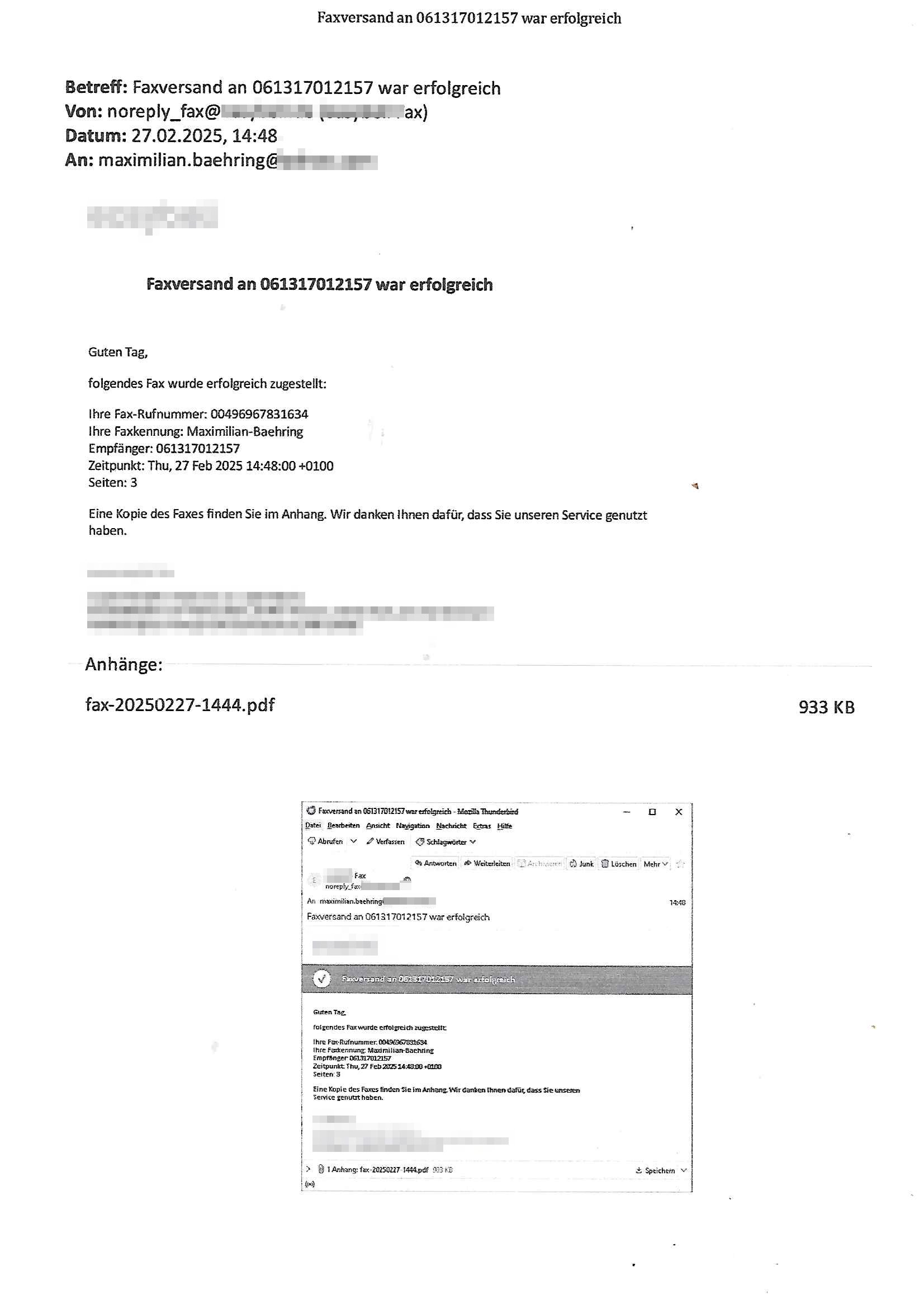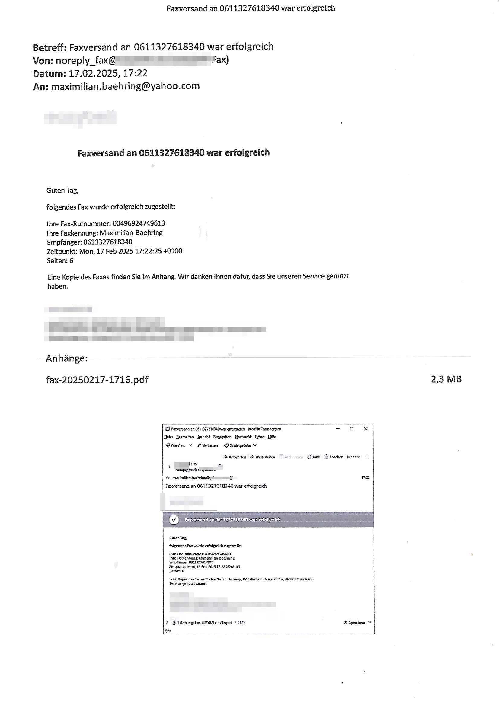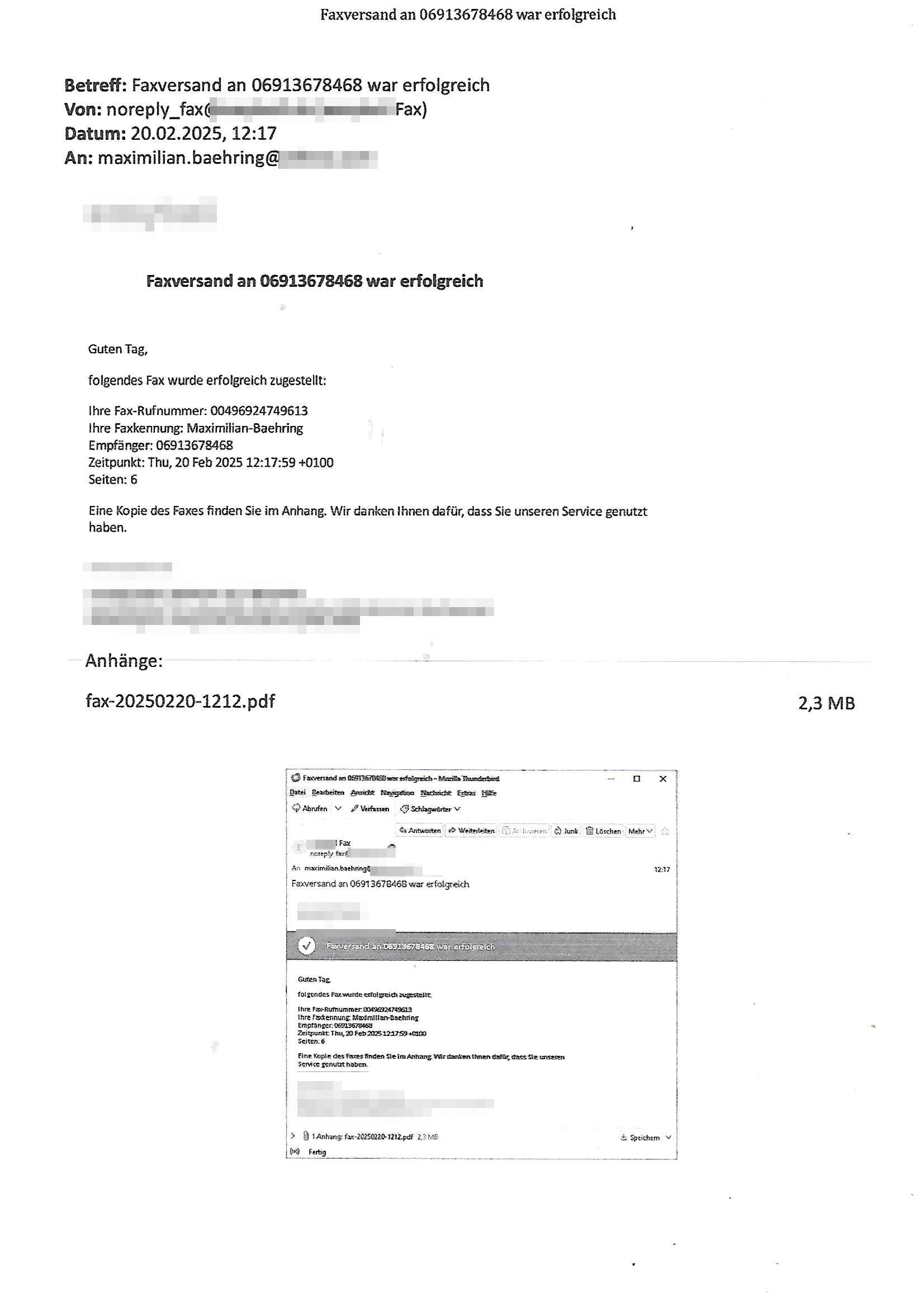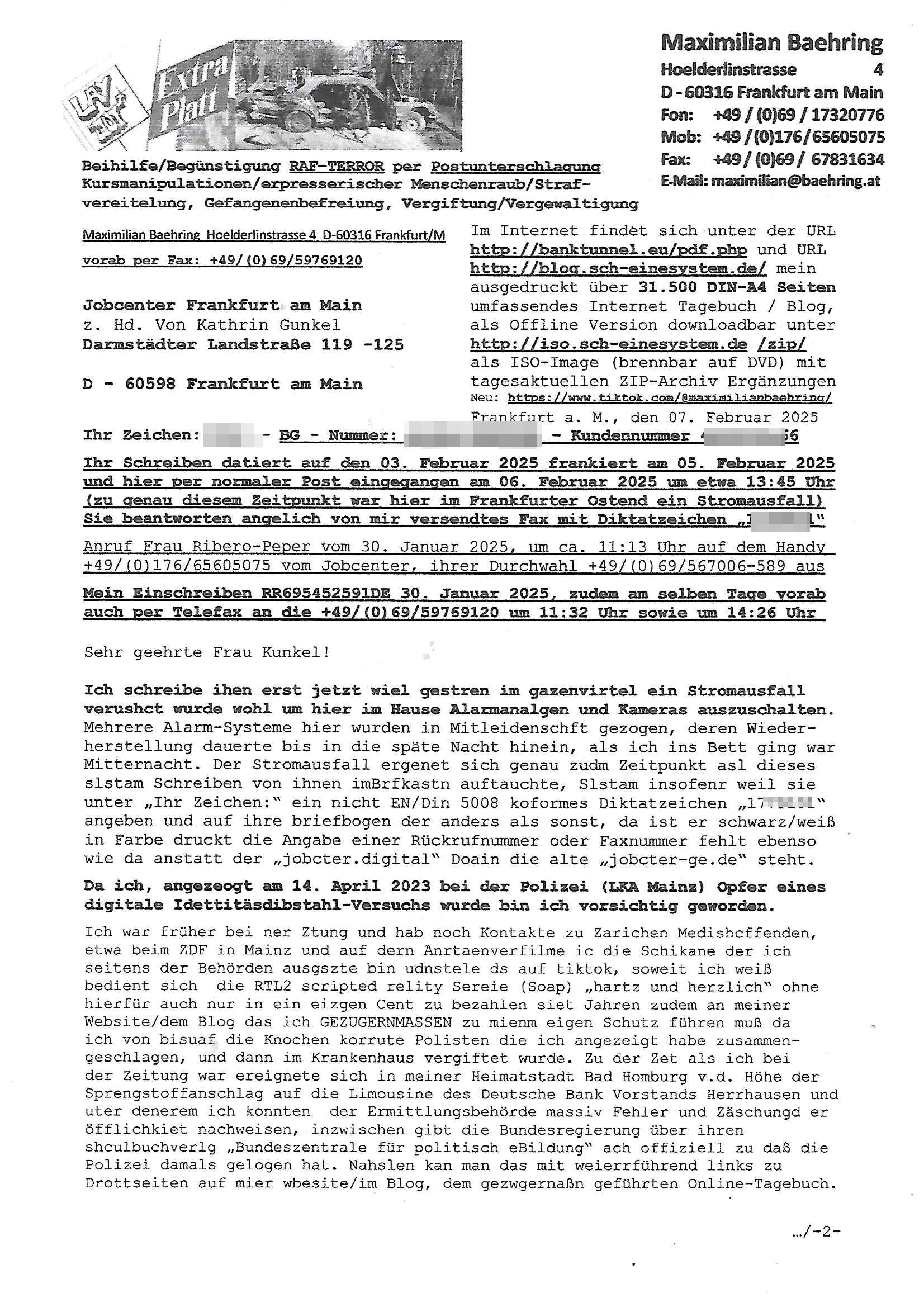 Maximilian Baehring Hoelderlinstrasse 4 D-60316 Frankfurt/M nur per Telefax +49/(0)6131/70-12517 Herrn Christian Metz oder seienr Vertretung (EILT!) 3sat Redaktion Kulturzeit hilfs-/erstzweise Redaktion zdf heute show, ZWEITES DEUTSCHES FERNSEHEN D – 55100 Mainz Im Internet findet sich unter der URLhttp://banktunnel.eu/pdf.php und URL http://blog.sch-einesystem.de/ mein ausgedruckt ÜBER 31.750 DIN-A4 Seiten umfassendes Internet Tagebuch / Blog,als Offline Version downloadbar unterhttp://*** /***/ als ISO-Image (brennbar auf DVD) mit tagesaktuellen ZIP-Archiv Ergänzungen Frankfurt a. M., den 27. Februar 2025 Gegen „christian metz“ der währned er den Schutz der Anonymität de Presse dazu missbrauchte Stratfaten zu begehen eine falsche Anschrift „Loisstraße 108 in 61348 Bad Homburg“ angab liefen bereits Ermittlungen. Diese werden nun ausge-weitetwie sie im Netz nachlesen können. Grund sind die egstregen massnemdialen Erpressunsgversuche. -------- Nachricht -------- Betreff: Faxversand an 061317012157 war erfolgreich Datum: Thu, 27 Feb 2025 13:48:00 +0000 (UTC) Von: Fax <noreply_fax@> An: maximilian.baehring@ Web2Fax Faxversand an 061317012157 war erfolgreich Guten Tag, folgendes Fax wurde erfolgreich zugestellt: Ihre Fax-Rufnummer: 00496967831634 Ihre Faxkennung: Maximilian-Baehring Empfänger: 061317012157 Zeitpunkt: Thu, 27 Feb 2025 14:48:00 +0100 Seiten: 3 Eine Kopie des Faxes finden Sie im Anhang. Wir danken Ihnen dafür, dass Sie unseren Service genutzt haben. | |