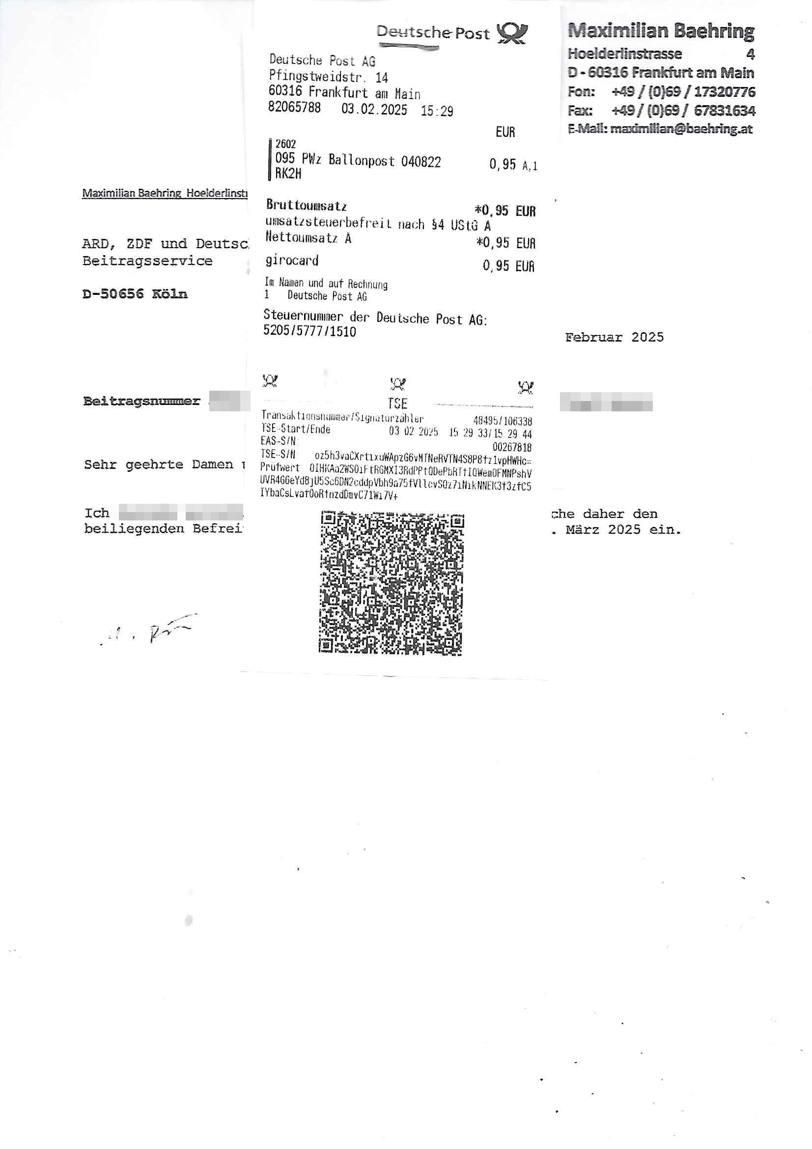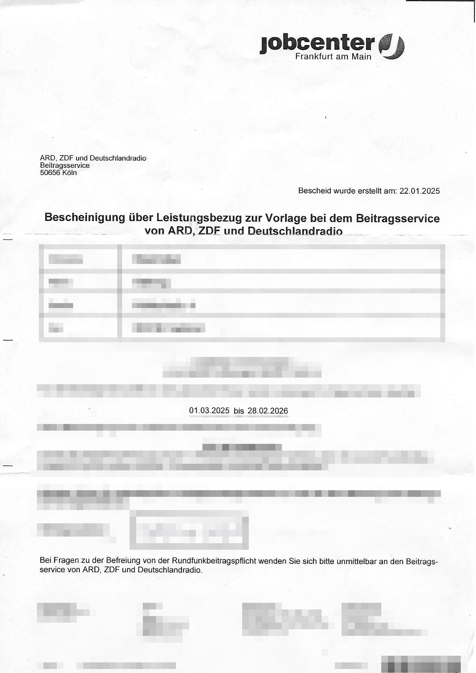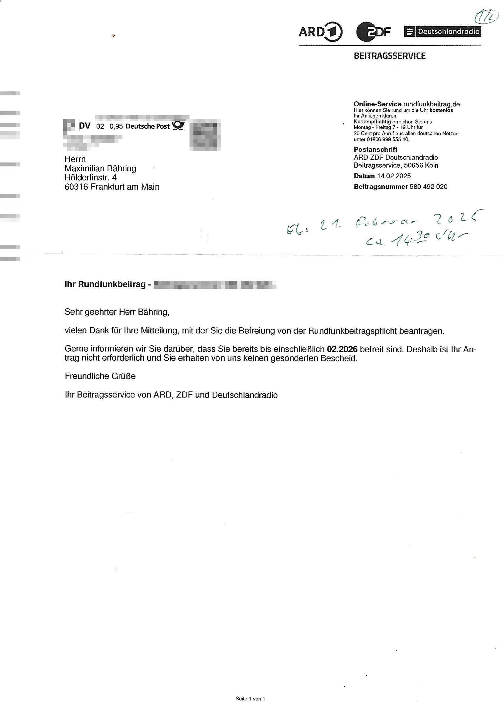 ARD, ZDF und Deutschlandradio Beitragsservice D-50656 Köln Frankfurt/M., 03. Februar 2025 Beitragsnummer *** – Befreiungsantrag wegen *** Sehr geehrte Damen und Herren! Ich ***. *** reiche *** den beiliegenden Befreiungsantrag für den Zeitraum ab dem 01. März 2025 ein. | |