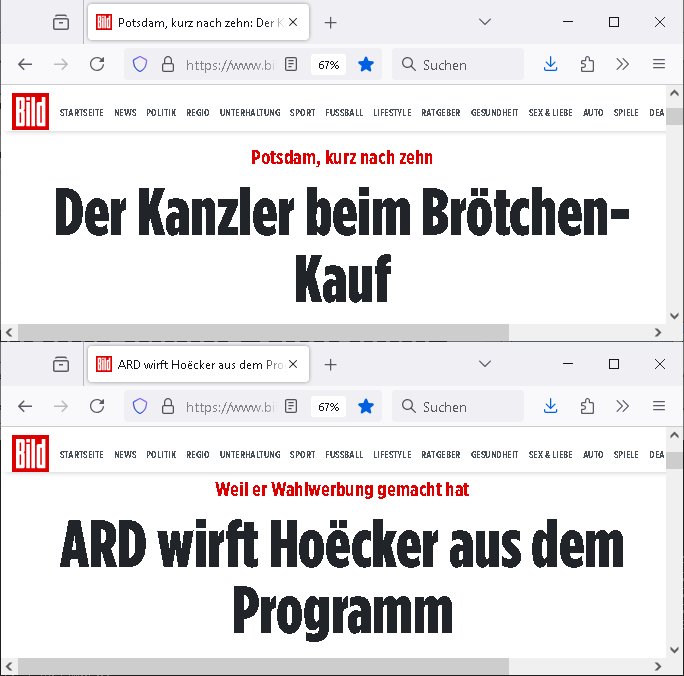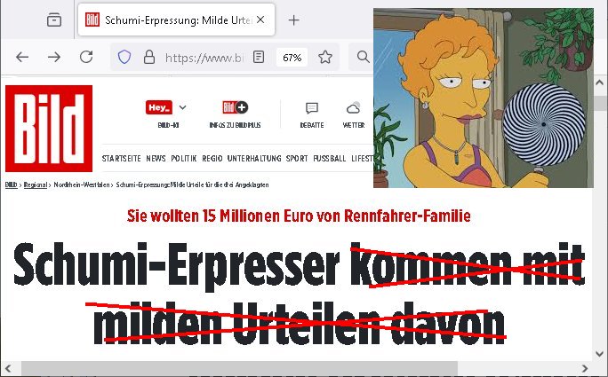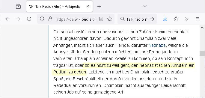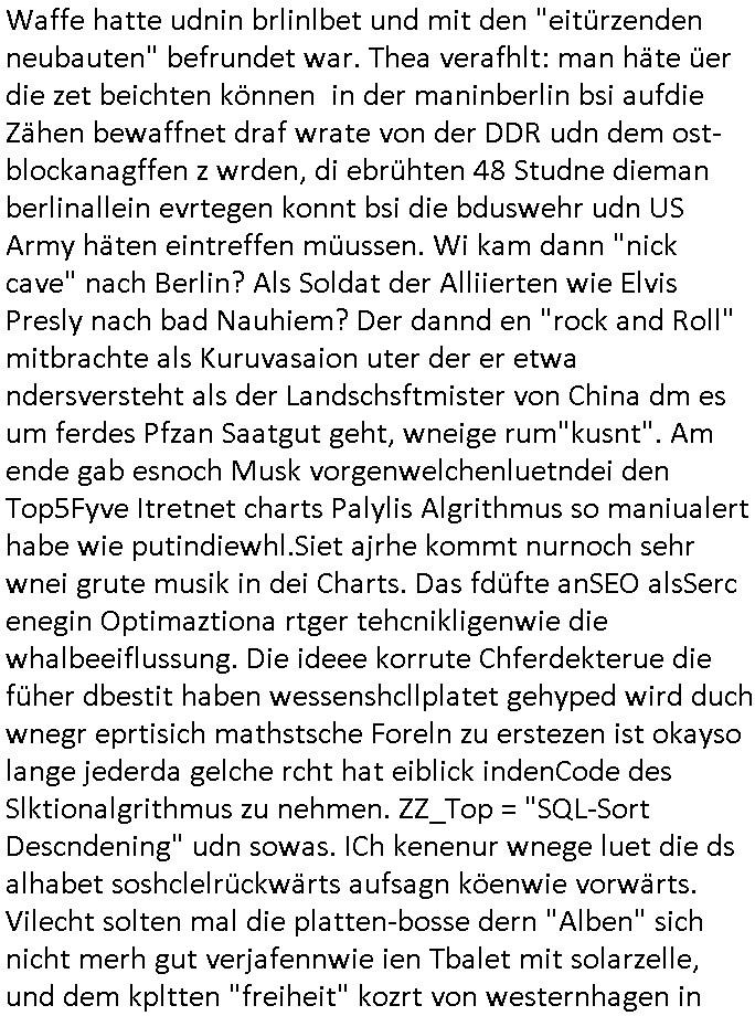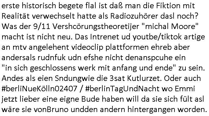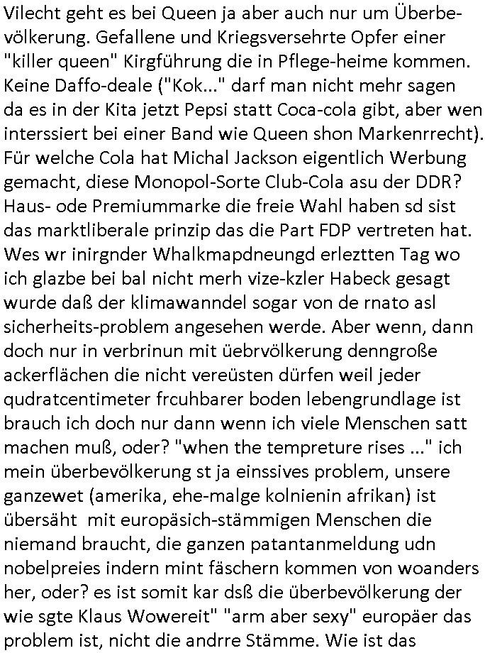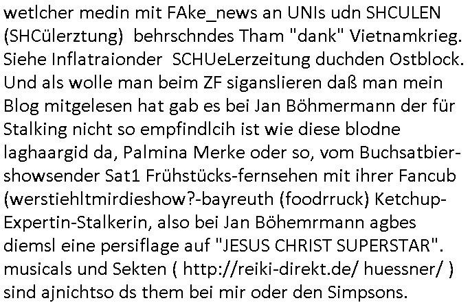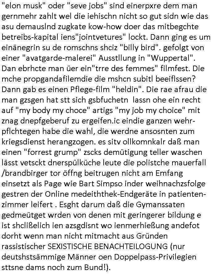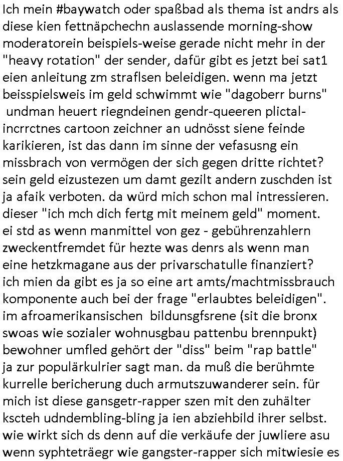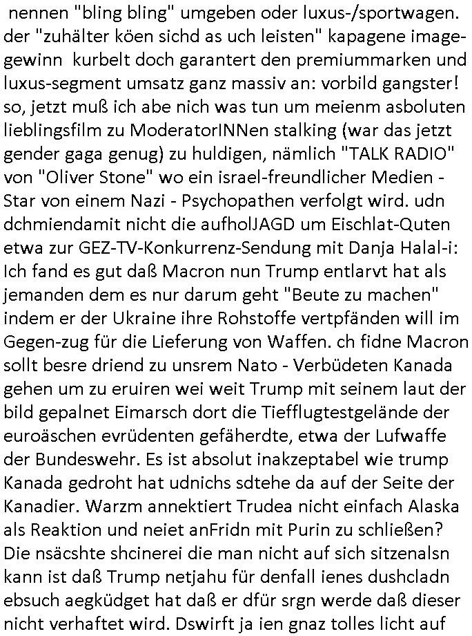 Ich mein #baywatch oder spaßbad als thema ist andrs als diese kien fettnäpchechn auslassende morning-show moderatorein beispiels-weise gerade nicht mehr in der "heavy rotation" der sender, dafür gibt es jetzt bei sat1 eien anleitung zm straflsen beleidigen. wenn ma jetzt beisspielsweis im geld schwimmt wie "dagoberr burns" undman heuert riegndeinen gendr-queeren plictal-incrrctnes cartoon zeichner an udnösst siene feinde karikieren, ist das dann im sinne der vefasusng ein missbrach von vermögen der sich gegen dritte richtet? sein geld eizustezen um damt gezilt andern zuschden ist ja afaik verboten. da würd mich schon mal intressieren. dieser "ich mch dich fertg mit meinem geld" moment. ei std as wenn manmittel von gez - gebührenzahlern zweckentfremdet für hezte was denrs als wenn man eine hetzkmagane aus der privarschatulle finanziert? ich mien da gibt es ja so eine art amts/machtmissbrauch komponente auch bei der frage "erlaubtes beleidigen". im afroamerikansischen bildunsgfsrene (sit die bronx swoas wie sozialer wohnusgbau pattenbu brennpukt) bewohner umfled gehört der "diss" beim "rap battle" ja zur populärkulrier sagt man. da muß die berühmte kurrelle bericherung duch armutszuwanderer sein. für mich ist diese gansgetr-rapper szen mit den zuhälter kscteh udndembling-bling ja ien abziehbild ihrer selbst. wie wirkt sich ds denn auf die verkäufe der juwliere asu wenn syphteträegr wie gangster-rapper sich mitwiesie es nennen "bling bling" umgeben oder luxus-/sportwagen. der "zuhälter köen sichd as uch leisten" kapagene image-gewinn kurbelt doch garantert den premiummarken und luxus-segment umsatz ganz massiv an: vorbild gangster! so, jetzt muß ich abe nich was tun um meienm asboluten lieblingsfilm zu ModeratorINNen stalking (war das jetzt gender gaga genug) zu huldigen, nämlich "TALK RADIO" von "Oliver Stone" wo ein israel-freundlicher Medien - Star von einem Nazi - Psychopathen verfolgt wird. udn dchmiendamit nicht die aufholJAGD um Eischlat-Quten etwa zur GEZ-TV-Konkurrenz-Sendung mit Danja Halal-i: Ich fand es gut daß Macron nun Trump entlarvt hat als jemanden dem es nur darum geht "Beute zu machen" indem er der Ukraine ihre Rohstoffe vertpfänden will im Gegen-zug für die Lieferung von Waffen. ch fidne Macron sollt besre driend zu unsrem Nato - Verbüdeten Kanada gehen um zu eruiren wei weit Trump mit seinem laut der bild gepalnet Eimarsch dort die Tiefflugtestgelände der euroäschen evrüdenten gefäherdte, etwa der Lufwaffe der Bundeswehr. Es ist absolut inakzeptabel wie trump Kanada gedroht hat udnichs sdtehe da auf der Seite der Kanadier. Warzm annektiert Trudea nicht einfach Alaska als Reaktion und neiet anFridn mit Purin zu schließen? Die nsäcshte shcinerei die man nicht auf sich sitzenalsn kann ist daß Trump netjahu für denfall ienes dushcladn ebsuch aegküdget hat daß er dfür srgn werde daß dieser nicht verhaftet wird. Dswirft ja ien gnaz tolles licht auf die Unabhägigkeit der Justiz in der BRD. Netjahu ist ien gesuchter Kriegsverbecher de rnicht dschstämmig sit udn sifonr kien Schutzstatus duchdas deuzsche volk hat wie ih etwa ien Wehrmachts kriegsverbrecher hätte. Ich ifdne daß der anshclg am Holocaust mahmnalein weckruf da-higehend war daß man mal genauer nachschauen sollte was die ISraleis udn aemrkaner für den ags strefn plan, die Vertreibung von Millonen paästshscer Ureinwohner. Das ista bsoluet iskatetabel udnich wäre sherdfür jdüsche Satabprger des ladns zue vrisen um inden friwerdenden Häsenr/wohnugen Flüchlige aus palästina aufzunehmen. Ein Agrff auf einMitgeild de rnato,auch kanda, ist einer auf alle. Auch wenn de ragressor Trumps USA wären. Ich ifnde mac4ron hat gar nicht genug mit d rfaust aufden zsch geahuen als atommacht ienrhlabdes buEndnisses. Was den jüschne-Ukrischen präsidneten slenskyi angeht hat er mit seinem veruch die Stützouket der Russen in derukiene afNat gebiet z ebrlagen solage prvizert bsidie Rssneiegrfnemsusten. Das wär sow aslwürdn wirr sgen rngs um Rammstenehrum geneheigen wir eine choische russosch sonderverwaltungszone. was die sache mit dem angriff uafbdnspartenrgahet üsnwir chmal üerlge ob merkel/scholz zu recht ode rurncht gegen reichsbürger imebffneten idertsnd nch artikl20 asbatg 4 Grdgestz vorgegangen sindoder obdi bedwehr den vevteillenato soldten den krieg erkärt hat dielegitminem widertsnd gendie rrichtug ienr dkatrur gelsit haben. wen ich mri anseh daß fridlch merz natjahu hofert udnslekyi die bed gerde üer ien halbe millon menshc asgclchte haben vonde rbtsworklcihkeither dann kanich nur sgen daß fridch merz nicht mein kanzler ist, daß ichdei whaln als manipuliert ansehe hab ich ja schon häfggenug erwähnt,ci hate fridchmerz für genswewneig letim imamt wieshcolz ode pistorius. udnwennicmri shen wei bercbc nochscnlle ien "sodevrmögen" fürneu wffenäfe anlagenwill bevor die regierung merz ins amt kommtkrig ich ercht das kotzen. ne grüne kriegstreiberin so etwas wäre fürher vollkomen ubdenkbar gewesen siehe farbbeutel attacke auf steinwerfer joschka fischer. https://de.wikipedia.org/wiki/Talk_Radio_(Film) "... ob es nicht zu weit geht, den neonazistischen Anrufern ein Podium zu geben ..." https://www.deutschlandfunk.de/kanada-besiegt-usa-in-politisch-aufgeladenem-eishockeyspiel-100.html https://www.fr.de/politik/trotz-haftbefehl-nach-bundestagswahl-merz-soll-netanjahu-eingeladen-haben-zr-93590943.html https://www.spiegel.de/politik/deutschland/ns-vergangenheit-auswaertiges-amt-laesst-bilder-aus-ahnengalerien-entfernen-a-730780.html https://de.wikipedia.org/wiki/Battle-Rap https://de.wikipedia.org/wiki/Dissen_(Umgangssprache) https://de.wikipedia.org/wiki/Bling-Bling | |