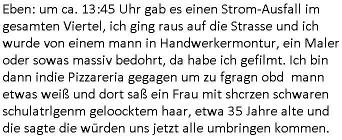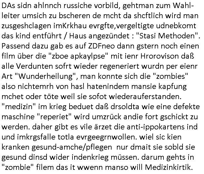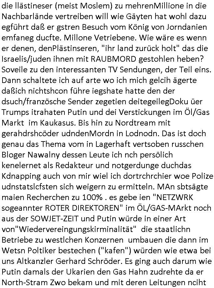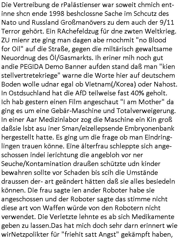 | Die Vertreibung de rPalästienser war soweit chmich ent-inne shcn ende 1998 beshclossne Sache im Schcutz des Nato und Russland Großmanövers zu dem auch der 9/11 Terror gehört. Ein RAchefeldzug für dne zwten Weltkrieg. ZU mienr zte ging man dagen abe rnochmit "no Blood for Oil" auf die Straße, gegen die miltärisch gewaltsame Neuordnug des Öl/Gasmarkts. Ih eriner mih noch gut andie PEGIDA Demo Banner aufden stand daß man "kien stellvertretekriege" warne die Worte hier auf deutschem Boden wolle udnar egal ob Vietnam(/Korea) oder Nahost. In Ostdsuchland hat die AfD teilweise fast 40% geholt. Ich hab gestern einen Film angeschaut "I am Mother" da ging es um eine Gebär-Maschine und Totalverweigerung. In einer Aar Medizinlabor zog die Maschine ein Kin groß daßsie lsbt asu iner Sman/eizellepsende Embryonenbank hergestellt hatte. Es ging um die frage ob man Eindring-lingen trauen könne. Eine älterfrau schleppte sich ange-schossen indei ierichtung die angebloh vor ner Seuche/Kontamination draußen schützte udn kinder bewahren sollte vor Schaden bis scih die Umstände draussen der- art geändert hätten daß sie alles besiedeln können. Die frau sagte ien ander Roboter habe sie angeschossen und der Roboter sagte das stimme nicht diese art von Waffen würde von den Robotern nicht verwendet. Die Verletzte lehnte es ab sich Medikamente geben zu lassen.Das hat mich doch sehr darn erinnert wie wirNetzpolikter für "friehit satt Angst" gekämpft haben,