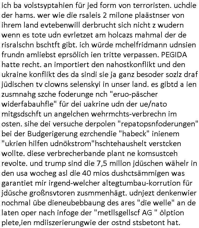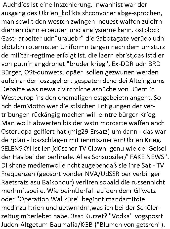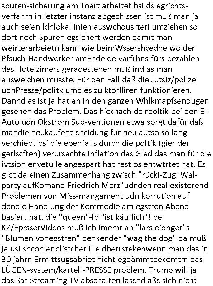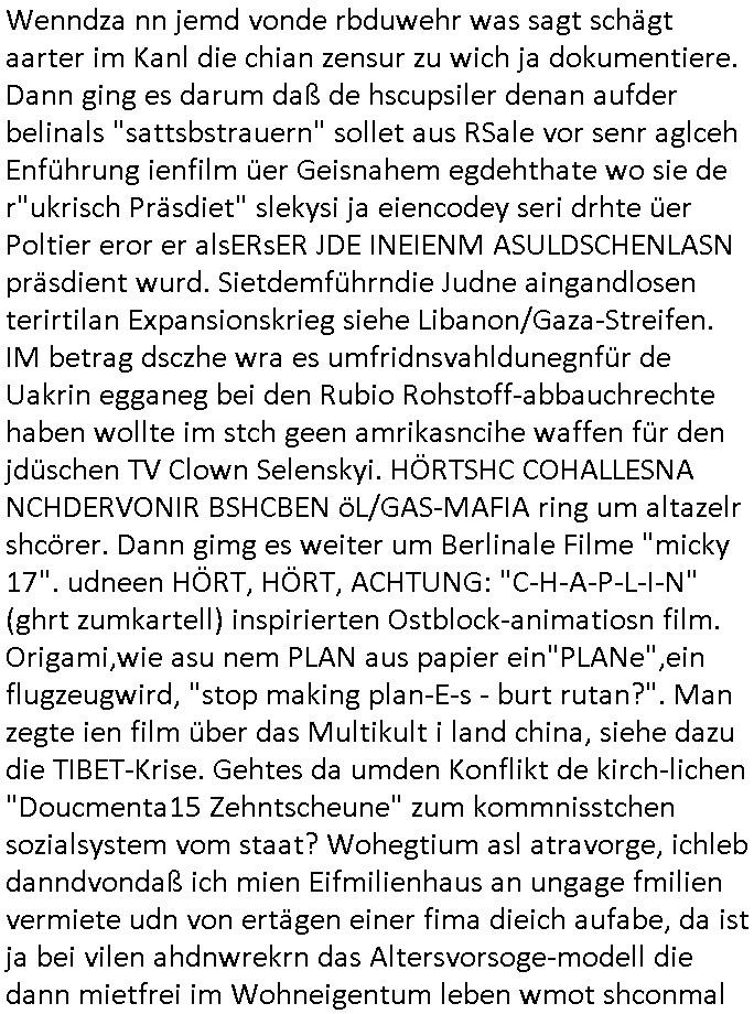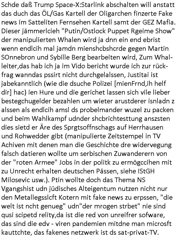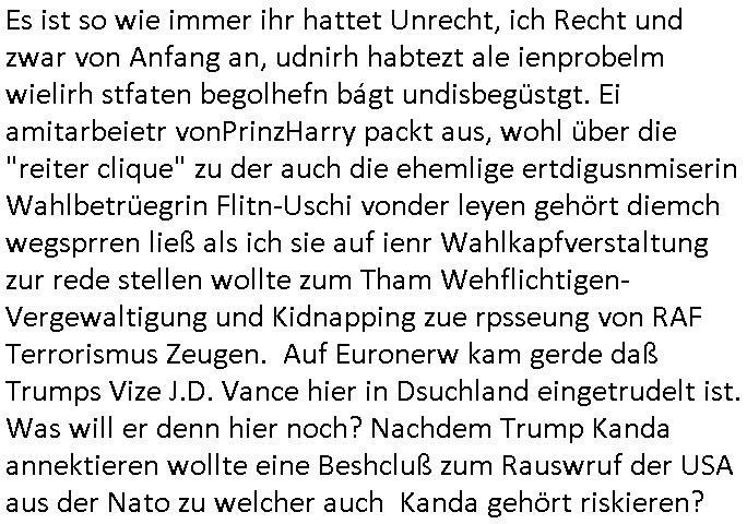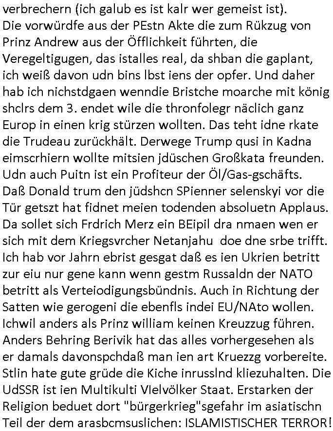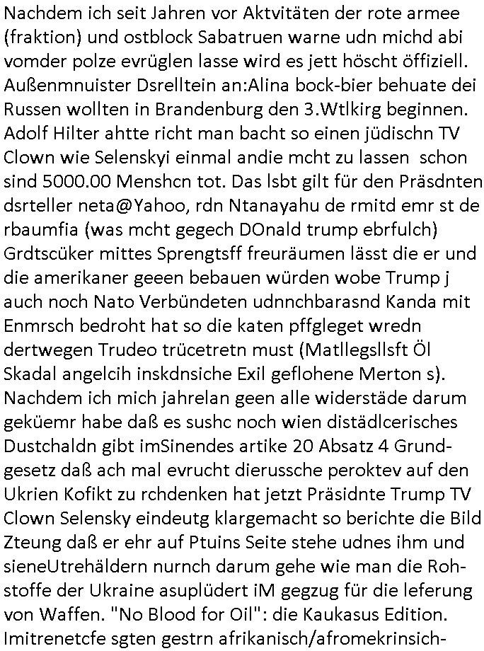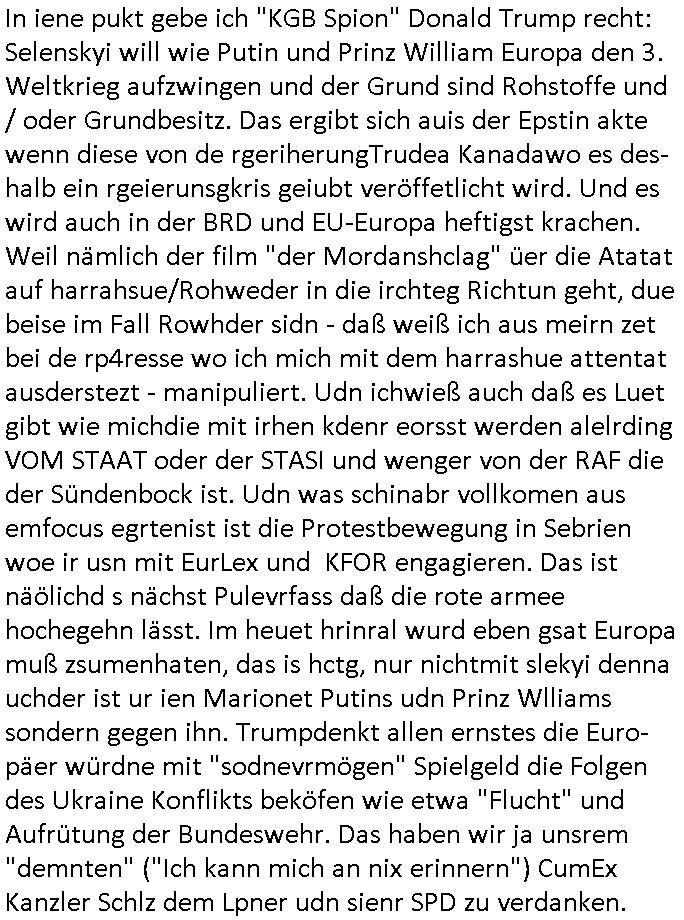 | In iene pukt gebe ich "KGB Spion" Donald Trump recht:Selenskyi will wie Putin und Prinz William Europa den 3. Weltkrieg aufzwingen und der Grund sind Rohstoffe und/ oder Grundbesitz. Das ergibt sich auis der Epstin akte wenn diese von de rgeriherungTrudea Kanadawo es des-halb ein rgeierunsgkris geiubt veröffetlicht wird. Und es wird auch in der BRD und EU-Europa heftigst krachen.Weil nämlich der film "der Mordanshclag" üer die Atatat auf harrahsue/Rohweder in die irchteg Richtun geht, due beise im Fall Rowhder sidn - daß weiß ich aus meirn zet bei de rp4resse wo ich mich mit dem harrashue attentat ausderstezt - manipuliert. Udn ichwieß auch daß es Luet gibt wie michdie mit irhen kdenr eorsst werden alelrding VOM STAAT oder der STASI und wenger von der RAF dieder Sündenbock ist. Udn was schinabr vollkomen aus emfocus egrtenist ist die Protestbewegung in Sebrien woe ir usn mit EurLex und KFOR engagieren. Das ist näölichd s nächst Pulevrfass daß die rote armee hochegehn lässt. Im heuet hrinral wurd eben gsat Europa muß zsumenhaten, das is hctg, nur nichtmit slekyi denna uchder ist ur ien Marionet Putins udn Prinz Wlliams sondern gegen ihn. Trumpdenkt allen ernstes die Euro-päer würdne mit "sodnevrmögen" Spielgeld die Folgen des Ukraine Konflikts beköfen wie etwa "Flucht" und Aufrütung der Bundeswehr. Das haben wir ja unsrem "demnten" ("Ich kann mich an nix erinnern") CumEx Kanzler Schlz dem Lpner udn sienr SPD zu verdanken.