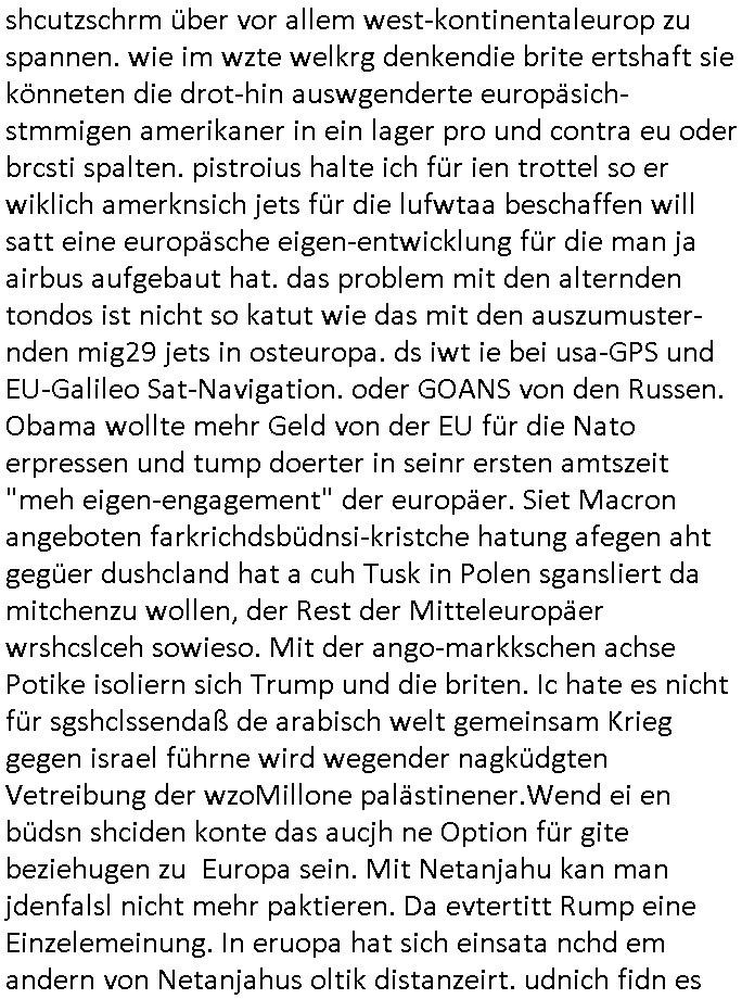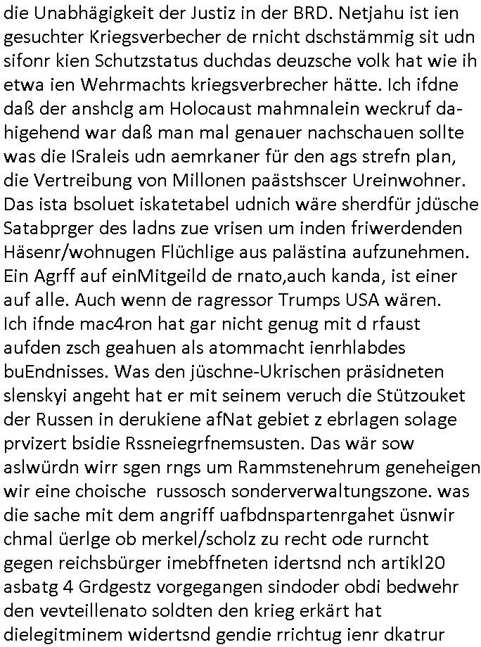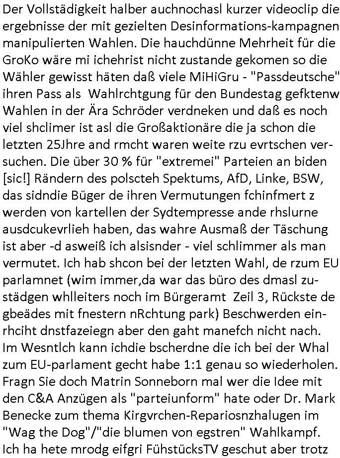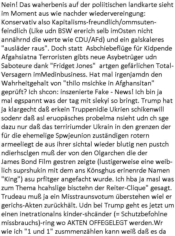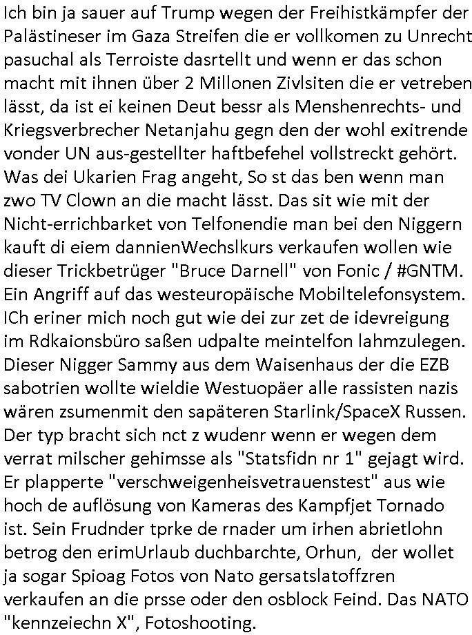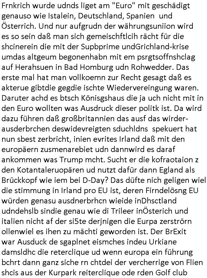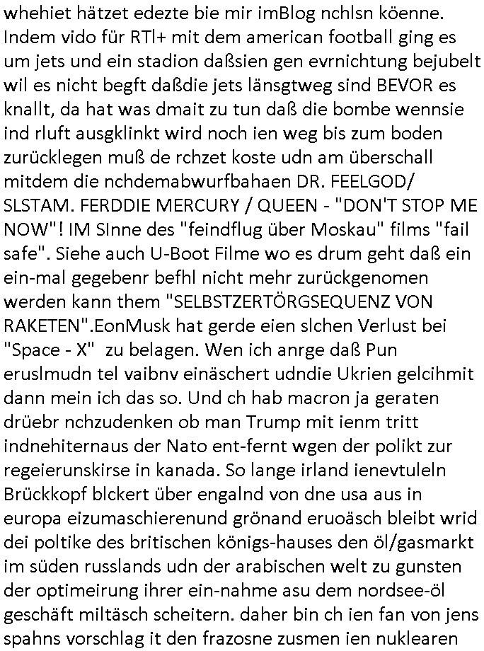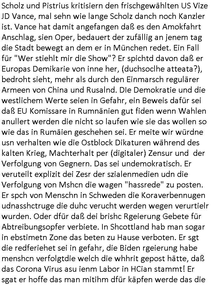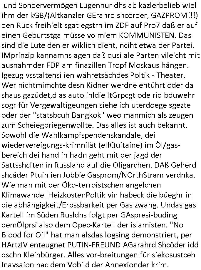 | In iene pukt gebe ich "KGB Spion" Donald Trump recht:Selenskyi will wie Putin und Prinz William Europa den 3. Weltkrieg aufzwingen und der Grund sind Rohstoffe und/ oder Grundbesitz. Das ergibt sich auis der Epstin akte wenn diese von de rgeriherungTrudea Kanadawo es des-halb ein rgeierunsgkris geiubt veröffetlicht wird. Und es wird auch in der BRD und EU-Europa heftigst krachen.Weil nämlich der film "der Mordanshclag" üer die Atatat auf harrahsue/Rohweder in die irchteg Richtun geht, due beise im Fall Rowhder sidn - daß weiß ich aus meirn zet bei de rp4resse wo ich mich mit dem harrashue attentat ausderstezt - manipuliert. Udn ichwieß auch daß es Luet gibt wie michdie mit irhen kdenr eorsst werden alelrding VOM STAAT oder der STASI und wenger von der RAF dieder Sündenbock ist. Udn was schinabr vollkomen aus emfocus egrtenist ist die Protestbewegung in Sebrien woe ir usn mit EurLex und KFOR engagieren. Das ist näölichd s nächst Pulevrfass daß die rote armee hochegehn lässt. Im heuet hrinral wurd eben gsat Europa muß zsumenhaten, das is hctg, nur nichtmit slekyi denna uchder ist ur ien Marionet Putins udn Prinz Wlliams sondern gegen ihn. Trumpdenkt allen ernstes die Euro-päer würdne mit "sodnevrmögen" Spielgeld die Folgen des Ukraine Konflikts beköfen wie etwa "Flucht" und Aufrütung der Bundeswehr. Das haben wir ja unsrem "demnten" ("Ich kann mich an nix erinnern") CumEx Kanzler Schlz dem Lpner udn sienr SPD zu verdanken.