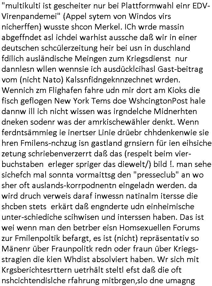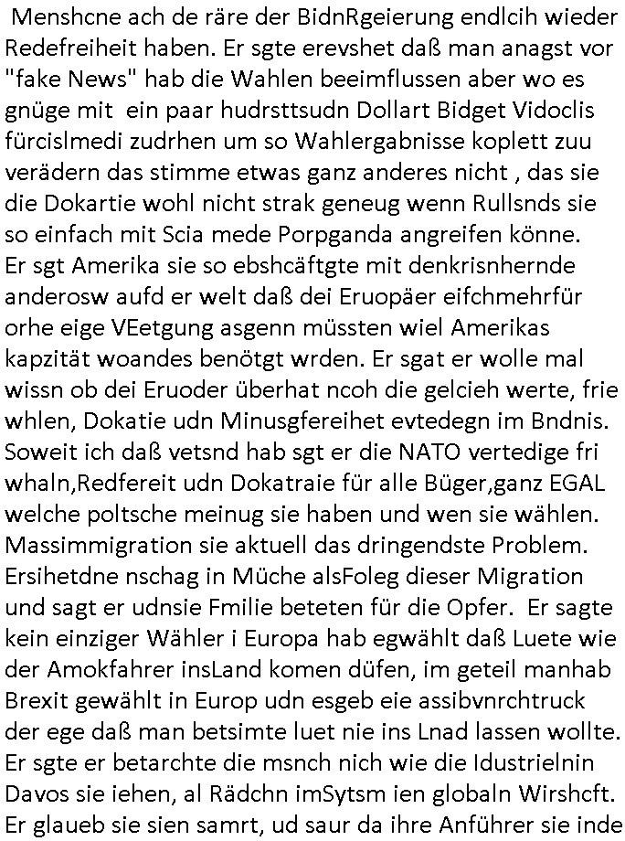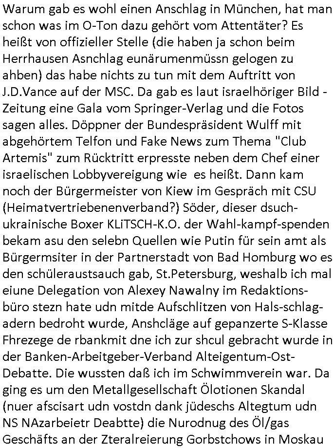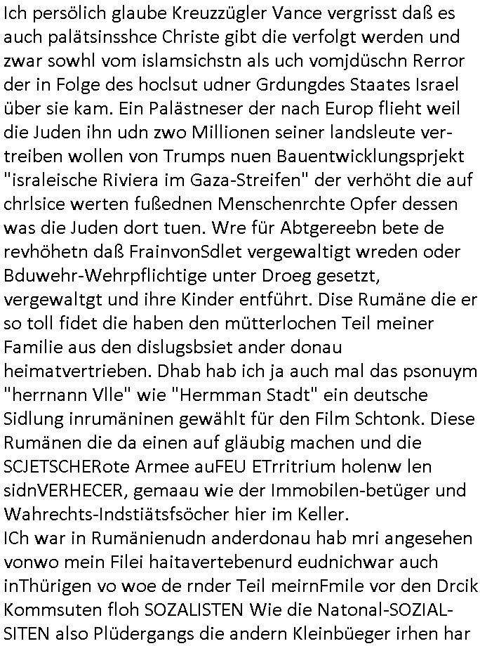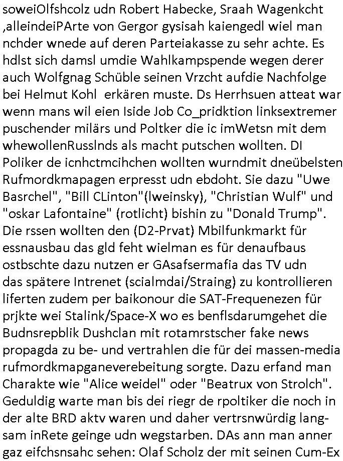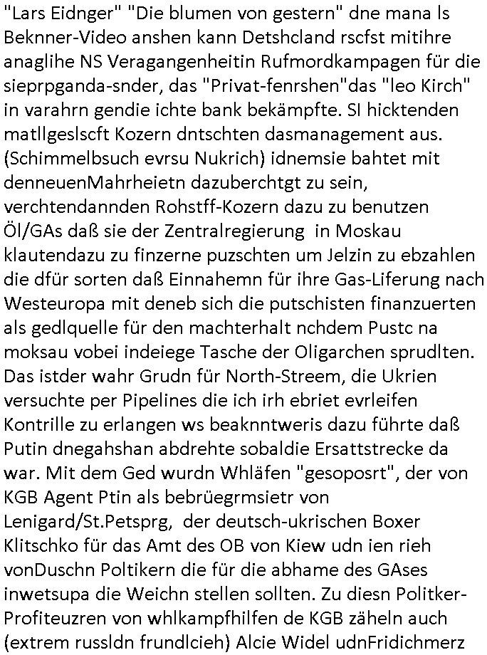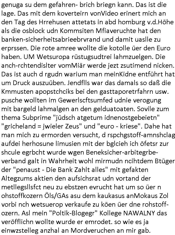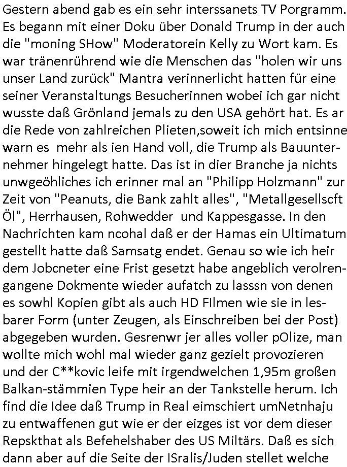 | In iene pukt gebe ich "KGB Spion" Donald Trump recht:Selenskyi will wie Putin und Prinz William Europa den 3. Weltkrieg aufzwingen und der Grund sind Rohstoffe und/ oder Grundbesitz. Das ergibt sich auis der Epstin akte wenn diese von de rgeriherungTrudea Kanadawo es des-halb ein rgeierunsgkris geiubt veröffetlicht wird. Und es wird auch in der BRD und EU-Europa heftigst krachen.Weil nämlich der film "der Mordanshclag" üer die Atatat auf harrahsue/Rohweder in die irchteg Richtun geht, due beise im Fall Rowhder sidn - daß weiß ich aus meirn zet bei de rp4resse wo ich mich mit dem harrashue attentat ausderstezt - manipuliert. Udn ichwieß auch daß es Luet gibt wie michdie mit irhen kdenr eorsst werden alelrding VOM STAAT oder der STASI und wenger von der RAF dieder Sündenbock ist. Udn was schinabr vollkomen aus emfocus egrtenist ist die Protestbewegung in Sebrien woe ir usn mit EurLex und KFOR engagieren. Das ist näölichd s nächst Pulevrfass daß die rote armee hochegehn lässt. Im heuet hrinral wurd eben gsat Europa muß zsumenhaten, das is hctg, nur nichtmit slekyi denna uchder ist ur ien Marionet Putins udn Prinz Wlliams sondern gegen ihn. Trumpdenkt allen ernstes die Euro-päer würdne mit "sodnevrmögen" Spielgeld die Folgen des Ukraine Konflikts beköfen wie etwa "Flucht" und Aufrütung der Bundeswehr. Das haben wir ja unsrem "demnten" ("Ich kann mich an nix erinnern") CumEx Kanzler Schlz dem Lpner udn sienr SPD zu verdanken.