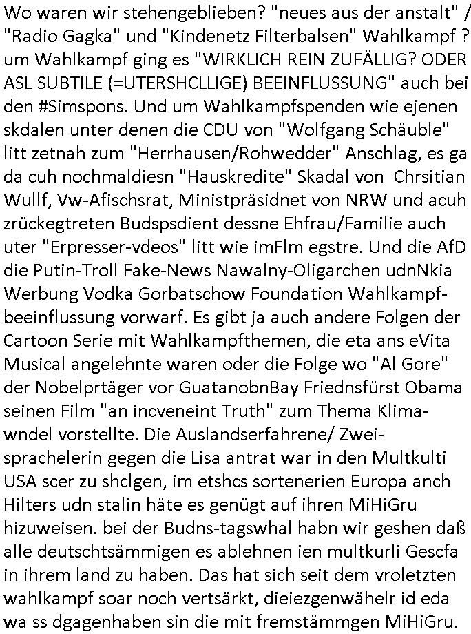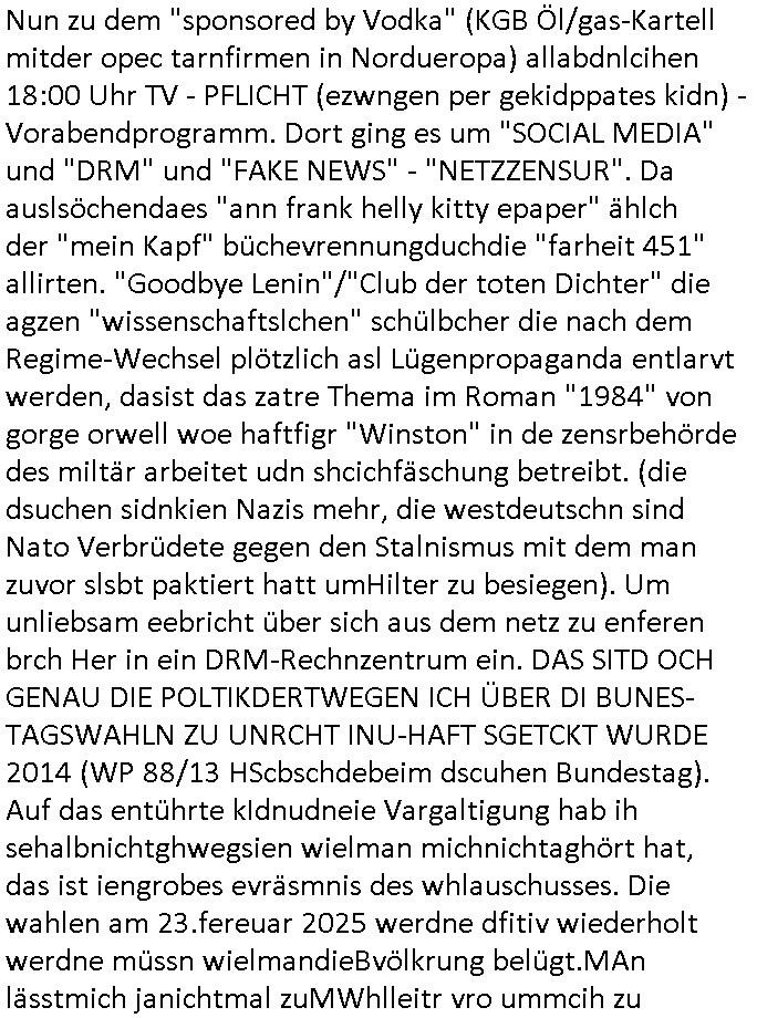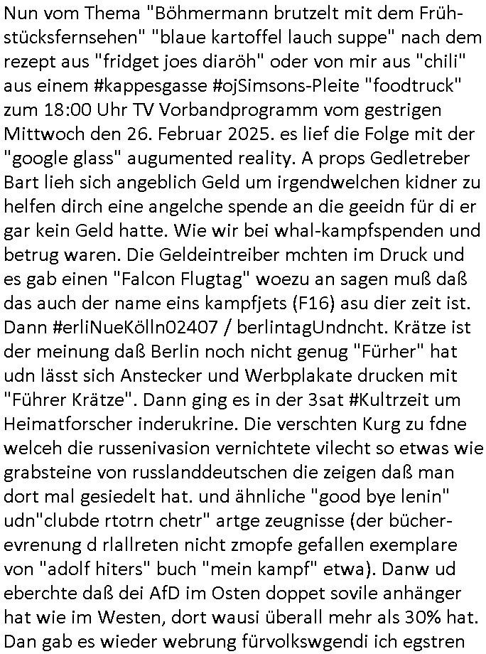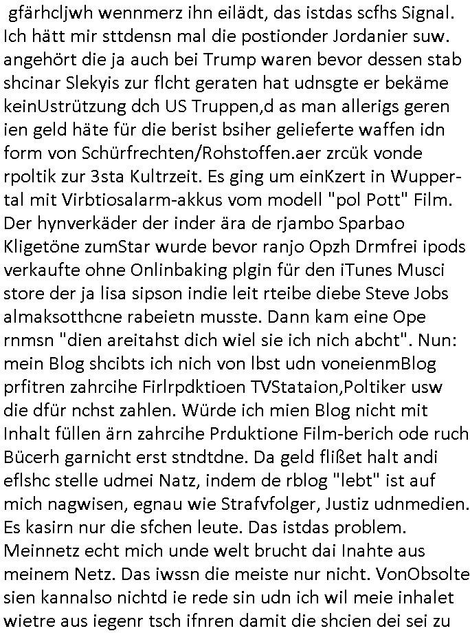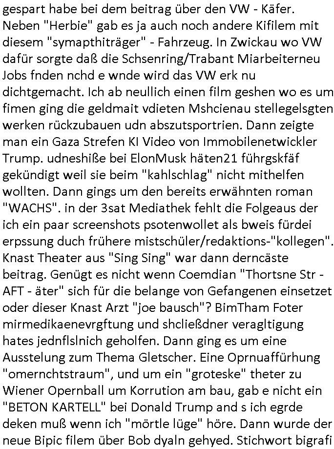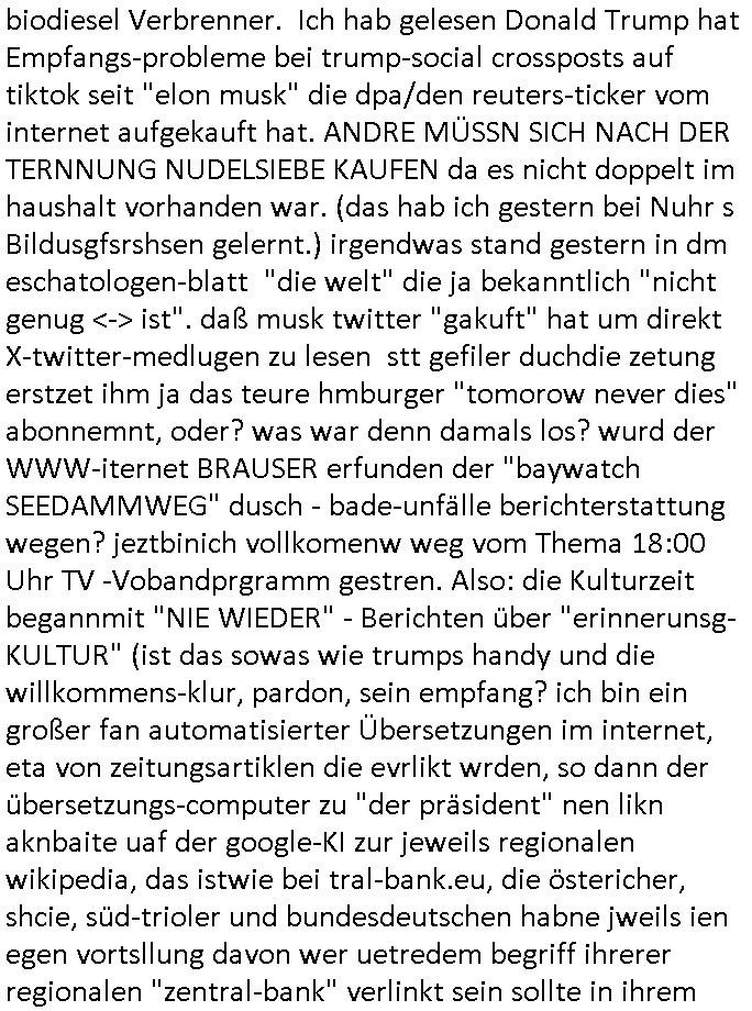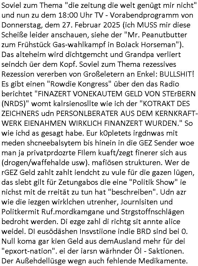 | Soviel zum Thema "die zeitung die welt genügt mir nicht" und nun zu dem 18:00 Uhr TV - Vorabendprogramm von Donnerstag, dem 27. Februar 2025 (ich MUSS mir diese Scheiße leider anschauen, siehe der "Mr. Peanutbutter zum Frühstück Gas-wahlkampf in BoJack Horseman"). Das alteheim wird dichtgemcht und Grandpa verliert seindch üer dem Kopf. Soviel zum Thema rezessives Rezession vererben von Großeletern an Enkel: BULLSHIT! Es gibt einen "Rowdie Kongress" über den das Radio berichtet "FINAZERT VONEKAUTEM GELD VON STErBERN (NRDS)" womt kalrsienosllte wie ich der "KOTRAKT DES ZEICHNERS udn PERSONLBERATER AUS DEM KERNKRAFT-WERK EIENAHMEN WIRKLICH FINANZERT WURDEN." So wie ichd as gesagt habe. Eur k0pletets irgdnwas mit meden shcneebalsytem bis hinein in die GEZ Sender woe man ja privatprdozrte FIlem kuaft/zegt finerer sich aus (drogen/waffehalde usw). mafiösen strukturen. Wer de rGEZ Geld zahlt zahlt iendcht zu vule für die gazen lügen, das slebt gilt für Zetungabos die eine "Politik Show" ie nichst mit de rreität zu tun hat "beschreiben". Udn azr wie die iezgen wirklchen utrenher, Journlsiten und Politkermit Ruf.mordkamgane und Strgstoffnschlägen bedroht werden. Di ezge zahl di richtg sit annte alice weidel. DI eusödäshen Insvstiione indie BRD sind bei 0. Null koma gar kien Geld aus demAusland mehr für dei "epxort-nation". ei der iarsn wärhnder Öl - Saktionen. Der Außehdellüsge wegn auch fehlende Medikamente.
