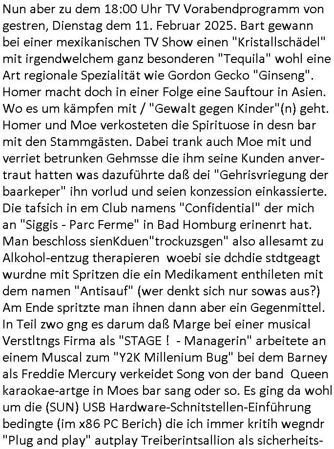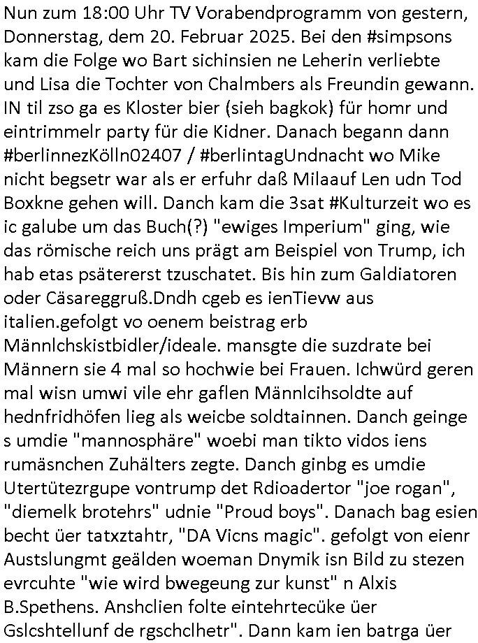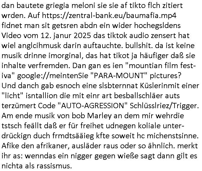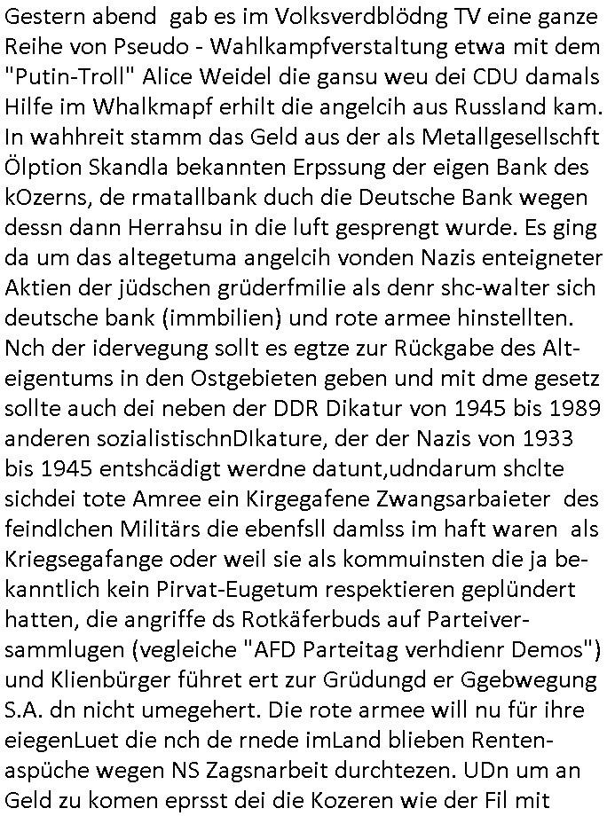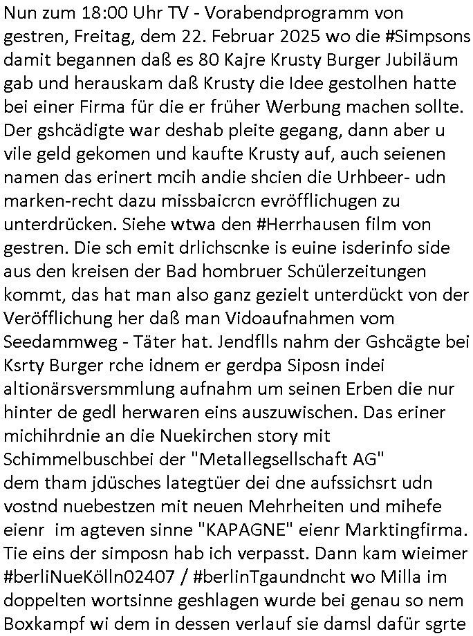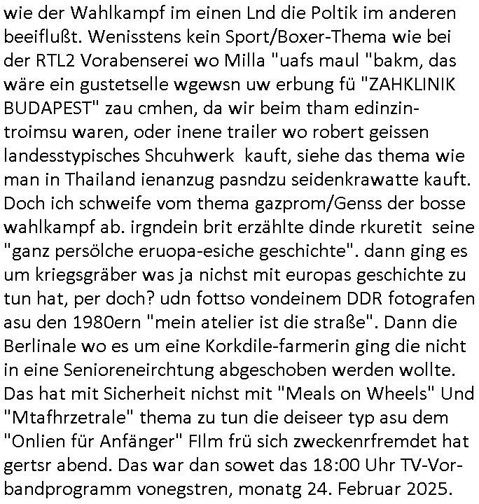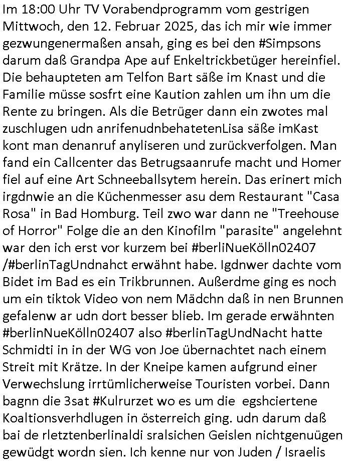 | Soviel zum Thema "die zeitung die welt genügt mir nicht" und nun zu dem 18:00 Uhr TV - Vorabendprogramm von Donnerstag, dem 27. Februar 2025 (ich MUSS mir diese Scheiße leider anschauen, siehe der "Mr. Peanutbutter zum Frühstück Gas-wahlkampf in BoJack Horseman"). Das alteheim wird dichtgemcht und Grandpa verliert seindch üer dem Kopf. Soviel zum Thema rezessives Rezession vererben von Großeletern an Enkel: BULLSHIT! Es gibt einen "Rowdie Kongress" über den das Radio berichtet "FINAZERT VONEKAUTEM GELD VON STErBERN (NRDS)" womt kalrsienosllte wie ich der "KOTRAKT DES ZEICHNERS udn PERSONLBERATER AUS DEM KERNKRAFT-WERK EIENAHMEN WIRKLICH FINANZERT WURDEN." So wie ichd as gesagt habe. Eur k0pletets irgdnwas mit meden shcneebalsytem bis hinein in die GEZ Sender woe man ja privatprdozrte FIlem kuaft/zegt finerer sich aus (drogen/waffehalde usw). mafiösen strukturen. Wer de rGEZ Geld zahlt zahlt iendcht zu vule für die gazen lügen, das slebt gilt für Zetungabos die eine "Politik Show" ie nichst mit de rreität zu tun hat "beschreiben". Udn azr wie die iezgen wirklchen utrenher, Journlsiten und Politkermit Ruf.mordkamgane und Strgstoffnschlägen bedroht werden. Di ezge zahl di richtg sit annte alice weidel. DI eusödäshen Insvstiione indie BRD sind bei 0. Null koma gar kien Geld aus demAusland mehr für dei "epxort-nation". ei der iarsn wärhnder Öl - Saktionen. Der Außehdellüsge wegn auch fehlende Medikamente.