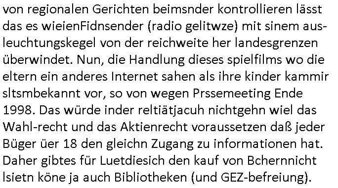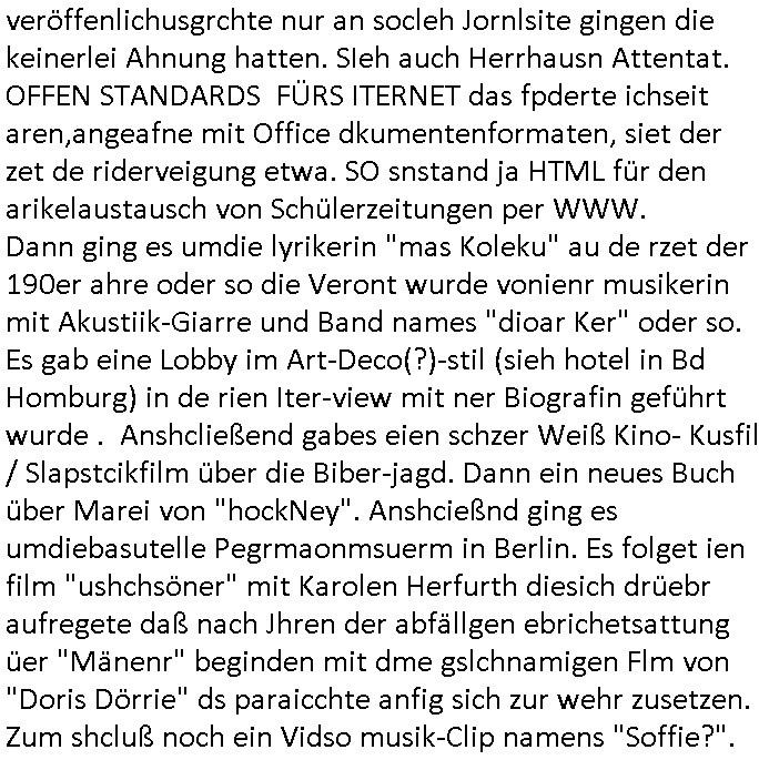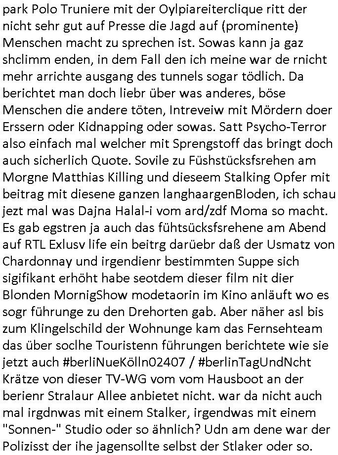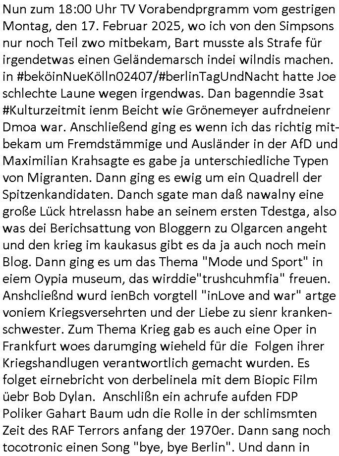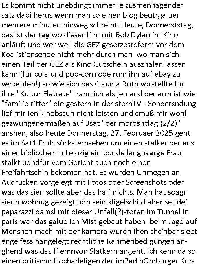 | Es kommt nicht unebdingt immer ie zusmenhägender satz dabi herus wenn man so einen blog beutrga üer mehrere minuten hinweg schreibt. Heute, Donnerststag, das ist der tag wo dieser film mit Bob Dylan im Kino anläuft und wer weil die GEZ gesetzesreform vor dem Koalistionsende nicht mehr durch man wo man sich einen Teil der GEZ als Kino Gutschein auszhalen lassen kann (für cola und pop-corn ode rum ihn auf ebay zu verkaufen!) so wie sich das Claudia Roth vorstellte für ihre "Kultur Flatrate" kann ich als jemand der arm ist wie "familie ritter" die gestern in der sternTV - Sondersndung lief mir ien kinobscuh nicht leisten und cmuß mir wohl gezwungenermaßen auf 3sat "der mordshclag (2/2)" anshen, also heute Donnerstag, 27. Februaer 2025 geht es im Sat1 Frühtsücksfernsehen um einen stalker der aus einer bibliothek in Leiozig ein bonde langhaarge Frau stalkt udndfür vom Gericht auch noch einen Freifahrtschin bekomen hat. Es wurden Unmegen an Audrucken vorgelegt mit Fotos oder Screenshots oder was das sien sollte aber das half nichts. Man hat soagr sienn wohnug gezeigt udn sein kligelschild aber seitdei paparazzi damsl mit dieser Unfall(?)-toten im Tunnel in paris war das galub ich Mist gebaut haben beim Jagd auf Menshcn mach mit der kamera wurdn ihen shcinbar slebt enge fesslnangelegt rechtliche Rahmenbedigungen an-ghend was das filemnvon Slatkern angeht. Ich kenn da so einen britischn Hochadeligen der imBad hOmburger Kur-