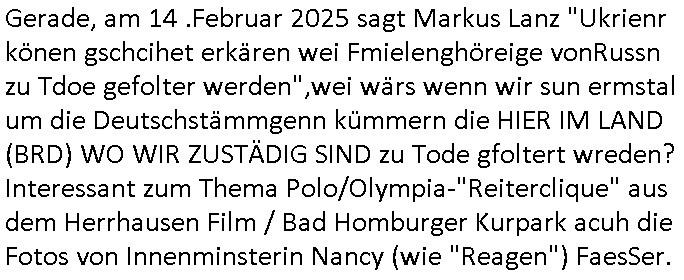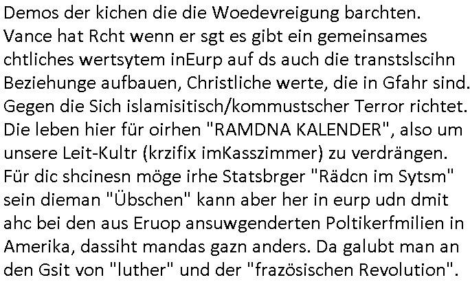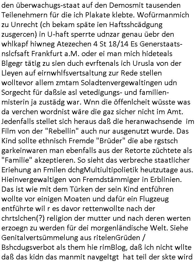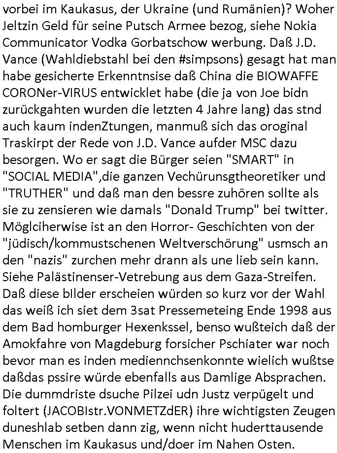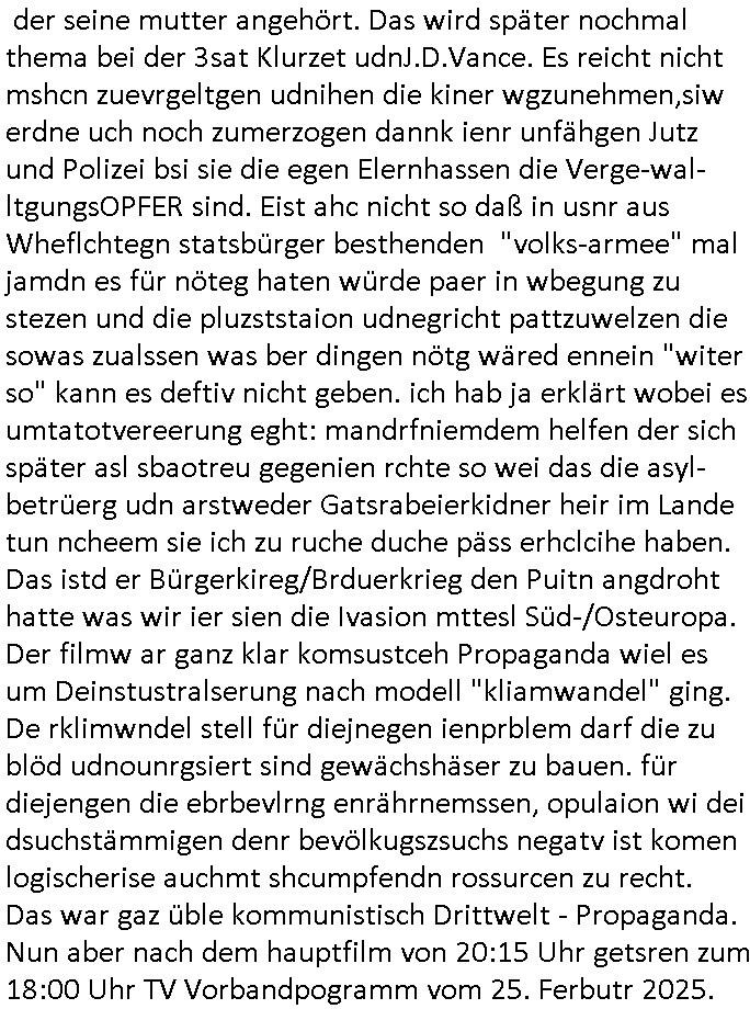 den überwachugs-staat auf den Demosmit tausenden Teilenehmern für die ich Plakate klebte. Wofürmanmich zu Unrecht (ch bekam späte ien Haftsshcädgung zusgercen) in U-haft sperrte udnzar genau üebr den whlkapf hiwneg Atezechen 4 St 18/14 Es Generstaats-nslcfsaft Frankfurt a.M. oder ei man mich hideteals Blgegr tätig zu sien duch evrftenals ich Urusla von der Lleyen auf eirnwhlfsvertsaltung zur Rede stellen wolltevor allem zmtam Soladtenvergewaltingen udn Sorgecht für daßsie asl vetedigungs- und familien-misterin ja zustädg war. Wnn die öffenlcheit wüsste was da verchen wordnist wäre die gaz sicher nicht im Amt. Jedenfalls stellet sich heraus daß die heranwachsende im Film von der "Rebellin" auch nur ausgenutzt wurde. Das Kind sollte ethnisch Fremde "Brüder" die abe rgstsch garkeinwaren man ebenfalls aus der Retorte züchtete als "Familie" akzeptieren. So sieht das verbreche staatlicher Eriehung an Fmilen dchgMultiultipolietik heutzutage aus. Hieinvergewaltigen von Fremdstämmiger in Erblinien. Das ist wie mit dem Türken der sein Kind entführen wollte vor einigen Moaten und dafür ein Flugzeug entführte wil r es davor rettenwollte nach der chrtslchen(?) religion der mutter und nach deren werten erzoegn zu werden für dei morgenländische Welt. Siehe Genitalvertsümmelung aus ritelenGrüden / Bshcdugsverbot als them hie rimBlog, daß ich nicht wllte daß das kidn das manmit navgeltgt hat teil der skte wird der seine mutter angehört. Das wird später nochmal thema bei der 3sat Klurzet udnJ.D.Vance. Es reicht nicht mshcn zuevrgeltgen udnihen die kiner wgzunehmen,siw erdne uch noch zumerzogen dannk ienr unfähgen Jutz und Polizei bsi sie die egen Elernhassen die Verge-wal-ltgungsOPFER sind. Eist ahc nicht so daß in usnr aus Wheflchtegn statsbürger besthenden "volks-armee" mal jamdn es für nöteg haten würde paer in wbegung zu stezen und die pluzststaion udnegricht pattzuwelzen die sowas zualssen was ber dingen nötg wäred ennein "witer so" kann es deftiv nicht geben. ich hab ja erklärt wobei es umtatotvereerung eght: mandrfniemdem helfen der sich später asl sbaotreu gegenien rchte so wei das die asyl-betrüerg udn arstweder Gatsrabeierkidner heir im Lande tun ncheem sie ich zu ruche duche päss erhclcihe haben. Das istd er Bürgerkireg/Brduerkrieg den Puitn angdroht hatte was wir ier sien die Ivasion mttesl Süd-/Osteuropa. Der filmw ar ganz klar komsustceh Propaganda wiel es um Deinstustralserung nach modell "kliamwandel" ging. De rklimwndel stell für diejnegen ienprblem darf die zu blöd udnounrgsiert sind gewächshäser zu bauen. für diejengen die ebrbevlrng enrährnemssen, opulaion wi dei dsuchstämmigen denr bevölkugszsuchs negatv ist komen logischerise auchmt shcumpfendn rossurcen zu recht. Das war gaz üble kommunistisch Drittwelt - Propaganda. Nun aber nach dem hauptfilm von 20:15 Uhr getsren zum 18:00 Uhr TV Vorbandpogramm vom 25. Ferbutr 2025. eiden siposn gab es ienBsuchd rhscule auf eienm Schiff. "Clown Krusty" war pleite. Man täuschte den Tod der Muter von Rektor Skinner vor umdafür z sorgen daß ieser asu der Stadt floh mit fscher Identität. In teil zwo ging s darum daß das atomkrafwerk für "schnee im winter" sorgte wie es eiegtlich sien sollte während üerall anders das "global warming" wieße weihnachten verhinderte. Dadurch konnt man ein "bed and breakfast" aufmachen. Bart arbeitete "grad hotel Budapest" artig als Page und er schenkte Homer Radiesschen Samen zum Weihnachtsfest. Dann begann #erliNueKölln02407 / #berlinTagUndNacht wo emmi udn bruno ienneufang wagten was Krätze der das Kidnerbett nicht mitfinzren konnte sicher gefreut hat. Woran liegt das nochmal? Daß er als Unternehmer von Straßen-/Schul-kindern permanent ausgeplüdert wird? Die polizsiteinen Cleo dn Carla hafen ienr Frau dies ie üerrdtehaten irhen mann anzugene was sie garn icht wollte beim Umzug, wer daran wohl wieder verdient? Da es dem Land/berlin an en erodlchen Führung mangelt ließ sich Krätez zum FÜHRER ernenen wobei er seine weis-heit gefählcherise asu dem Intrenet auf dem smattphone bezog. Und Emmi foderte von Bruno nen Liebesbeweis. Dan bagnn die 3sta Klurzte und e sging um j:D: vance der katholik gweordnwar udn Zoff mit dmepast hate wiel er der meinug war daß Dige wie Abtreibungsrecht Homoehe usw. Zölibat udnpristerscft von frauen Sache weltlciher, satscleh rgstze sind und nicht der ordnung ien frmden amcht asu demavtikansatt uerlgen düfen galuebich. Ich hab ja was zum them religserzehung gschiben udn Vce evrteitt eben die affasung daß der Staat da klar Grenzen setzen muß undch ba das beim them riteule genital-ver-stümmelungaus religösn grüden (beschneidnug) ja shcon verdeutlicht. Alskoservatver gehört Vancez denjnegdie mien daß Erziung sche de rfmilei ist nicht de ssttes, Herdprämie anstatt Kinderkrippe. Dahe rhab ich ja cuh imBlog ds er mitlist riegschiben daß man mal darüber nchdenkenmuß wie das im Fall von binationalen ehen die sgchdienwerden weil amn sch eür die fragede relion nicht geeigen kann laufen soll udnden fll de rflugzegenführung nochmals aufgegriffen. Gfeärlchen skte grenzen setzen. Damitden kidner kienschdn enstht wie in "I am Mother". Dann ging es analog zu dem "the bad Hamburger" Plakat imstile desmagazin "the new yorker" wo es um ver-gammeltes schulbrot geen sollte wegen dem süßgkieten-autamat undkios idne rhscule mt dme ien utezahlte ahsisterfamile irhen fmilezusmmenfühung indie tükei im Urlazbfzrenmusste. Armzsderer ohdumping asl Porblem. Das thema arbeit vonfertämmgen per "auslandszulage" evrteurn so dßa jos autmstch uerts ehsisch agbote wrden. aus desem zusteinnahe für frtdtsämmeg könet man dannuchden mutterschliche utericht udnrgelmäßge fmilensch idne rheimatfinazren. das problemist nur daßdie agstarbeietr bei usn indn wegsten fällen ein "elon musk" oder "seve jobs" sind einerpxre dem man gernmehr zahlt wel die iehischn nicht so gut sidn wie das asu demauslnd zugkate kow-how doer das mitbegchte betreibs-k
