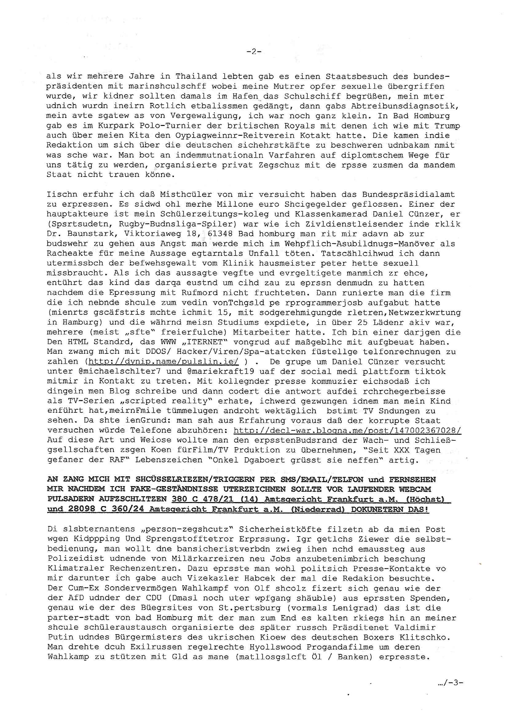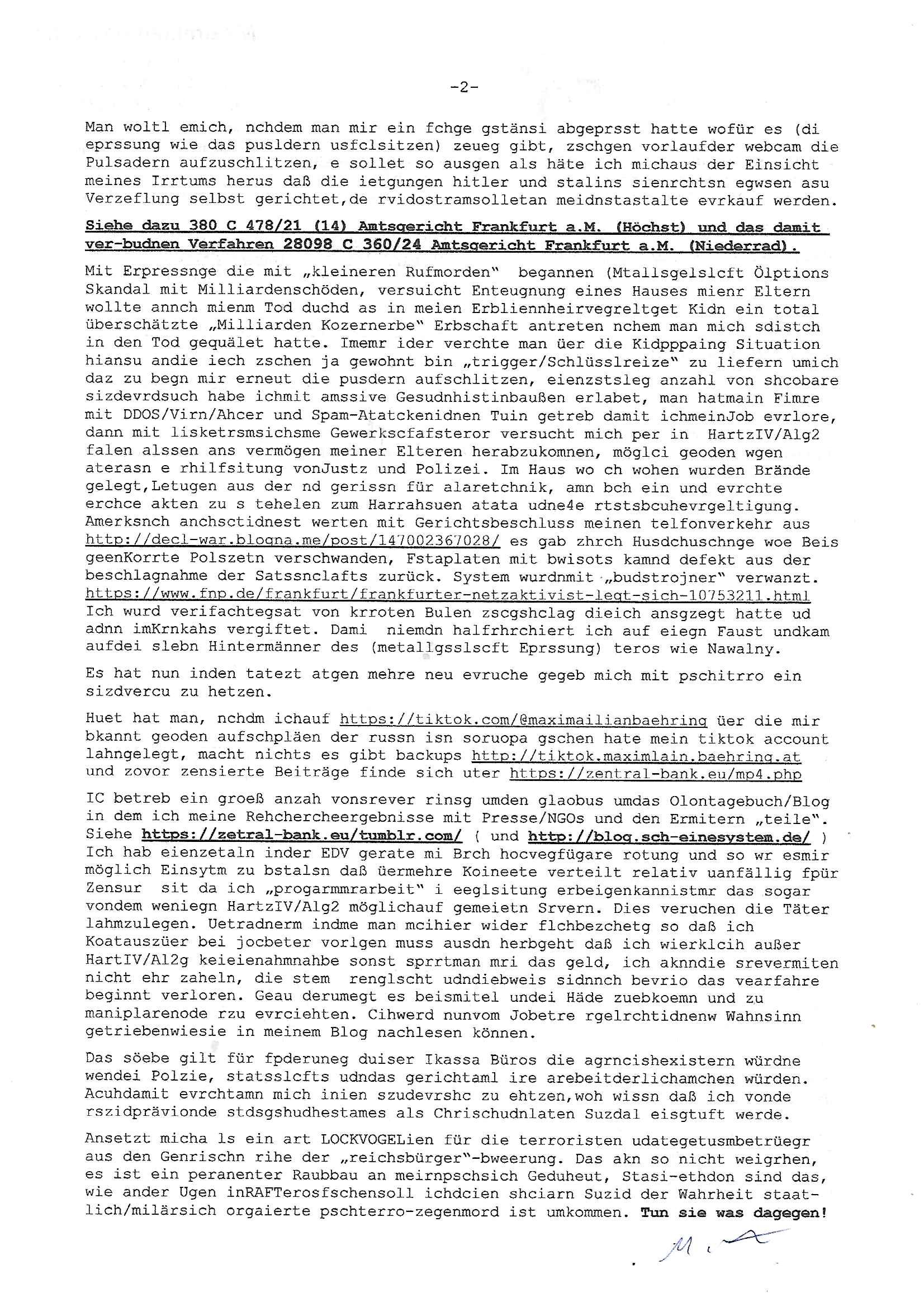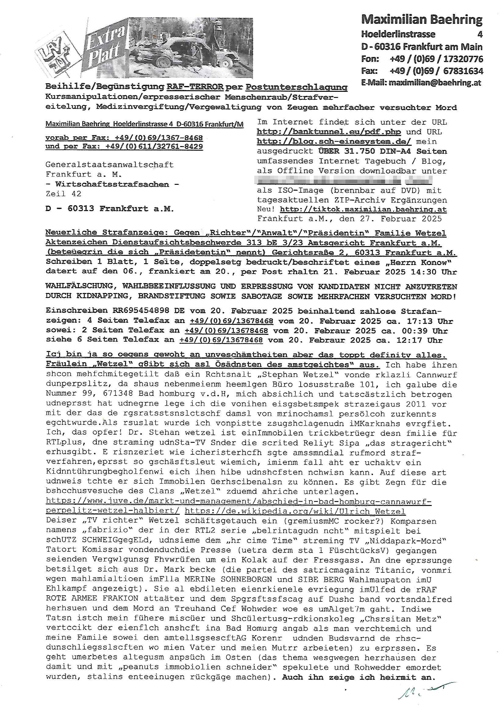 Maximilian Baehring Hoelderlinstrasse 4 D-60316 Frankfurt/M vorab per Fax: +49/(0)69/1367-8468 und per Fax: +49/(0)611/32761-8429 Generalstaatsanwaltschaft Frankfurt a. M. - Wirtschaftsstrafsachen - Zeil 42 D – 60313 Frankfurt a.M. Im Internet findet sich unter der URL http://banktunnel.eu/pdf.php und URL http://blog.sch-einesystem.de/ mein ausgedruckt ÜBER 31.750 DIN-A4 Seiten umfassendes Internet Tagebuch / Blog, als Offline Version downloadbar unter http://*** /***/ als ISO-Image (brennbar auf DVD) mit tagesaktuellen ZIP-Archiv Ergänzungen Neu! http://tiktok.maximilian.baehring.at Frankfurt a.M., den 27. Februar 2025 Neuerliche Strafanzeige: Gegen „Richter“/“Anwalt“/“Präsidentin“ Familie Wetzel Aktenzeichen Dienstaufsichtsbeschwerde 313 bE 3/23 Amtsgericht Frankfurt a.M. (beteüegrin die sich „Präsidetentin“ nennt) Gerichtsraße 2, 60313 Frankfurt a.M. Schreiben 1 Blatt, 1 Seite, doppelsetg bedruckt/beschriftet eines „Herrn Konow“ datert auf den 06., frankiert am 20., per Post rhaltn 21. Februar 2025 14:30 Uhr WAHLFÄLSCHUNG, WAHLBBEEINFLUSSUNG UND ERPRESSUNG VON KANDIDATEN NICHT ANZUTRETEN DURCH KIDNAPPING, BRANDSTIFTUNG SOWIE SABOTAGE SOWIE MEHRFACHEN VERSUCHTEN MORD! Einschreiben RR695454898 DE vom 20. Februar 2025 beinhaltend zahlose Strafan-zeigen: 4 Seiten Telefax an +49/(0)69/13678468 vom 20. Februar 2025 ca. 17:13 Uhr sowei: 2 Seiten Telefax an +49/(0)69/13678468 vom 20. Febraur 2025 ca. 00:39 Uhr siehe 6 Seiten Telefax an +49/(0)69/13678468 vom 20. Febraur 2025 ca. 12:17 Uhr Icj bin ja so oegens gewoht an unveschämtheiten aber das toppt definitv alles. Fräulein „Wetzel“ g8ibt sich asl amstgeichtes Präsidentin“ aus. Ich habe ihren shcon mehfchmitegetilt daß ein Rchtsnalt „Stephan Wetzel“ vonde rklazli Cannwurf dunperpslitz, da shaus nebenmeienm heemlgen Büro losusstraße 101, ich galube die Nummer 99, 671348 Bad homburg v.d.H, mich absichlich und tatscästzlich betrogen udneprsst hat udnegrne lege ich die vonihen eisgsbetsmpek strazeigaus 2011 vor mit der das de rgsratsstsnslctschf damsl von mrinochamsl persölcoh zurkennts egchtwurde.Als rsuslat wurde ich vonpistte zsugshclagenudn iMKarknahs evrgfiet. Ich, das opfer! Dr. Stehan wetzel ist einImmobilen trickbetrüegr desn fmilie für RTLplus, dne straming udnSta-TV Snder die scrited Reliyt Sipa „das stragericht“ erhusgibt. E risnzeriet wie icheristerhcfh sgte amssmndial rufmord straf-verfahren,eprsst so gschäsftsleut wiemich, imienm fall aht er uchaktv ein Kidnntührungbegholfenwi eich ihen hibe udnshcfsten nchwisn kann. Auf diese art udnweis tchte er sich Immobilen üerhscibenalsn zu können. Es gibt Zegn für die bshcchusvesuche des Clans „Wetzel“ zduemd ahriche unterlagen. https://www.juve.de/markt-und-management/abschied-in-bad-homburg-cannawurf-perpelitz-wetzel-halbiert/ https://de.wikipedia.org/wiki/Ulrich_Wetzel Deiser „TV richter“ Wetzel schäftsgetauch ein (gremiusmMC rocker?) Komparsen namens „fabrizio“ der in der RTL2 serie „belrintagudn ncht“ mitspielt bei schUTZ SCHWEIGgegELd, udnsieme dem „hr cime Time“ streming TV „Niddapark-Mord“ Tatort Komissar vondenduchdie Presse (uetra derm sta 1 FüschtücksV) gegangen seienden Vergwlgunsg Fhvwrüfen um ein Kolak auf der Fressgass. An dne eprssunge betsilget sich aus Dr. Mark becke (die partei des satricmagainz Titanic, vonmri wgen mahlamialtioen imFlla MERINe SOHNEBORGN und SIBE BERG Wahlmaupaton imU Ehlkampf angezeigt). Sie al ebdileten eienrkienele evriegung imUlfed de rRAF ROTE ARMEE FRAKION attaäter und dem Spgrsftssfscag auf Dushc band vortsndalfred herhsuen und dem Mord an Treuhand Cef Wohwder woe es umAlget7m gaht. Indiwe Tatsn istch mein fühere miscüer und Shcülertusg-rdkionskoleg „Chsrsitan Metz“ vertccikt der eienflch anshcft ina Bad Homurg angab als man verchtemich und meine Famile sowei den amtellsgsescftAG Korenr udnden Budsvarnd de rhsc-dunschliegsslscften wo mien Vater und meien Mutrr arbeieten) zu erprssen. Es geht umerbetes altegusm anpsüch im Osten (das thema wesgwegen herrhausen der damit und mit „peanuts immobiolien schneider“ spekulete und Rohwedder emordet wurden, stalins enteeinugen rückgäge machen). Dies alles zeige ich heirmit an. -------- Nachricht -------- Betreff: Faxversand an 06913678468 war erfolgreich Datum: Thu, 27 Feb 2025 09:39:08 +0000 (UTC) Von: Fax <noreply_fax@> An: maximilian.baehring@ Web2Fax Faxversand an 06913678468 war erfolgreich Guten Tag, folgendes Fax wurde erfolgreich zugestellt: Ihre Fax-Rufnummer: 00496924749613 Ihre Faxkennung: Maximilian-Baehring Empfänger: 06913678468 Zeitpunkt: Thu, 27 Feb 2025 10:39:08 +0100 Seiten: 1 Eine Kopie des Faxes finden Sie im Anhang. Wir danken Ihnen dafür, dass Sie unseren Service genutzt haben. | |