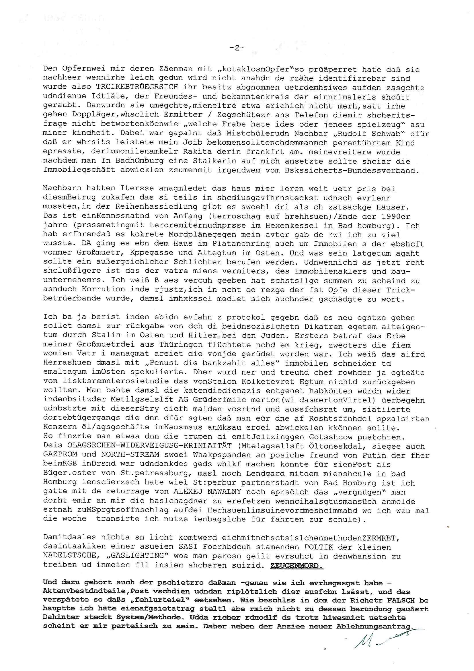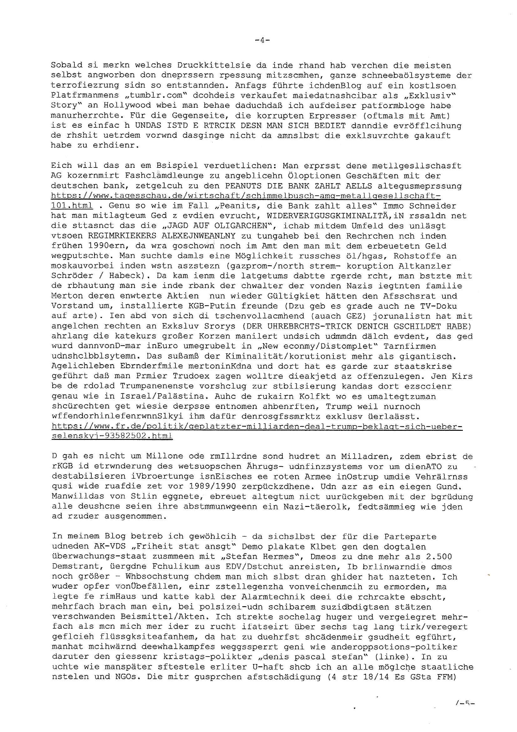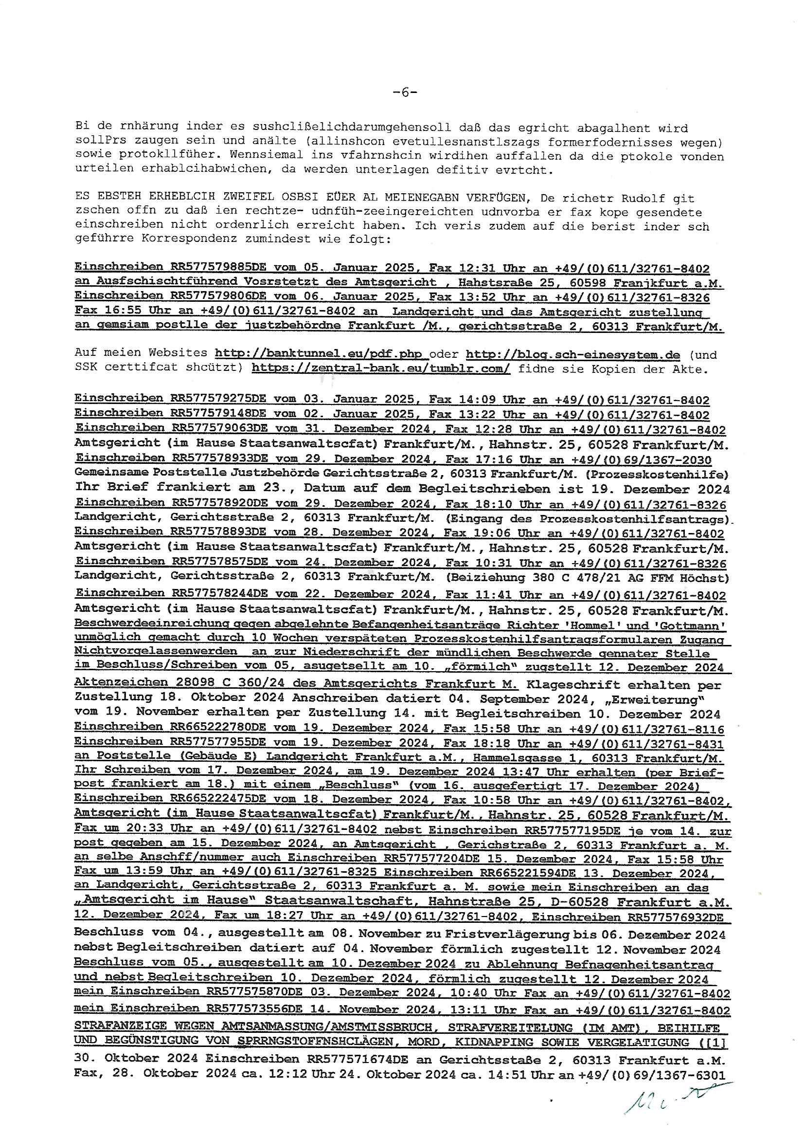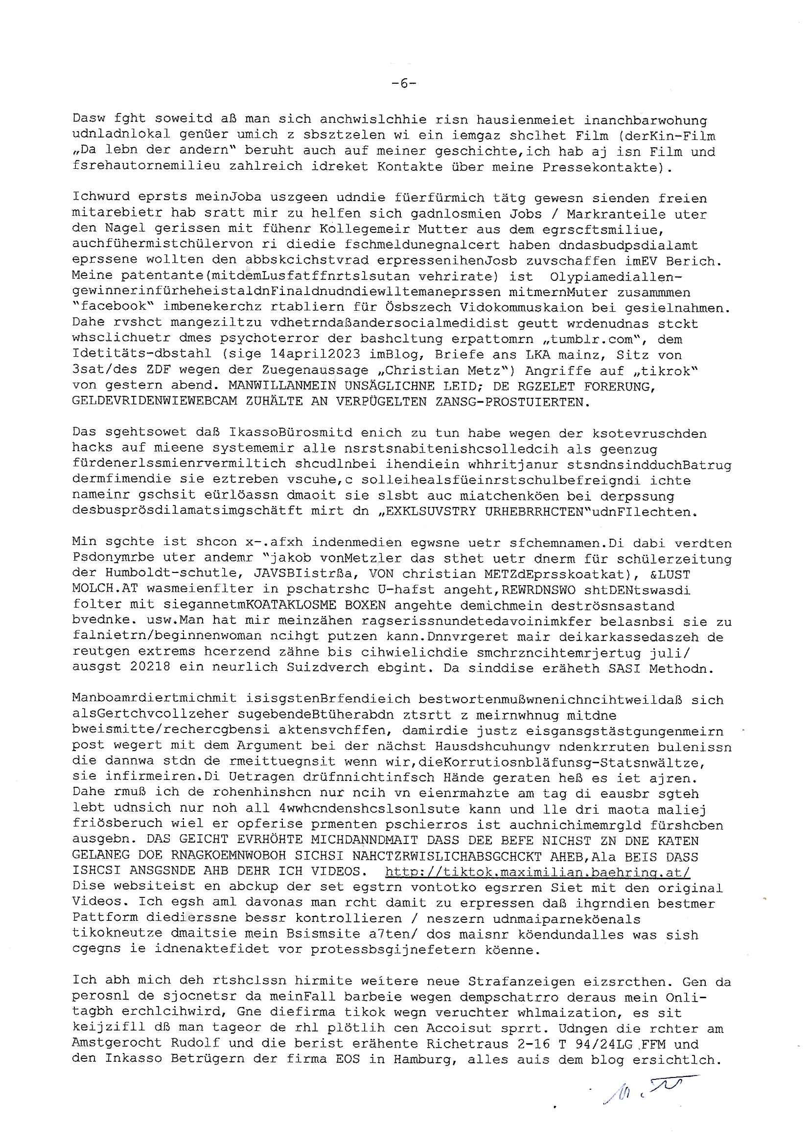 Maximilian Baehring Hoelderlinstrasse 4 D-60316 Frankfurt/M vorab per Fax: +49/(0)69/1367-8468 und per Fax: +49/(0)611/32761-8429 Generalstaatsanwaltschaft Frankfurt a. M. - Wirtschaftsstrafsachen - Zeil 42 D – 60313 Frankfurt a.M. Im Internet findet sich unter der URL http://banktunnel.eu/pdf.php und URL http://blog.sch-einesystem.de/ mein ausgedruckt ÜBER 31.750 DIN-A4 Seiten umfassendes Internet Tagebuch / Blog, als Offline Version downloadbar unter http://*** /***/ als ISO-Image (brennbar auf DVD) mit tagesaktuellen ZIP-Archiv Ergänzungen Neu! http://tiktok.maximilian.baehring.at Frankfurt a.M., den 27. Februar 2025 Neuerliche Strafanzeige: Gegen „Richter“/“Anwalt“/“Präsidentin“ Familie Wetzel Aktenzeichen Dienstaufsichtsbeschwerde 313 bE 3/23 Amtsgericht Frankfurt a.M. (beteüegrin die sich „Präsidetentin“ nennt) Gerichtsraße 2, 60313 Frankfurt a.M. Schreiben 1 Blatt, 1 Seite, doppelsetg bedruckt/beschriftet eines „Herrn Konow“ datert auf den 06., frankiert am 20., per Post rhaltn 21. Februar 2025 14:30 Uhr WAHLFÄLSCHUNG, WAHLBBEEINFLUSSUNG UND ERPRESSUNG VON KANDIDATEN NICHT ANZUTRETEN DURCH KIDNAPPING, BRANDSTIFTUNG SOWIE SABOTAGE SOWIE MEHRFACHEN VERSUCHTEN MORD! Einschreiben RR695454898 DE vom 20. Februar 2025 beinhaltend zahlose Strafan-zeigen: 4 Seiten Telefax an +49/(0)69/13678468 vom 20. Februar 2025 ca. 17:13 Uhr sowei: 2 Seiten Telefax an +49/(0)69/13678468 vom 20. Febraur 2025 ca. 00:39 Uhr siehe 6 Seiten Telefax an +49/(0)69/13678468 vom 20. Febraur 2025 ca. 12:17 Uhr Icj bin ja so oegens gewoht an unveschämtheiten aber das toppt definitv alles. Fräulein „Wetzel“ g8ibt sich asl amstgeichtes Präsidentin“ aus. Ich habe ihren shcon mehfchmitegetilt daß ein Rchtsnalt „Stephan Wetzel“ vonde rklazli Cannwurf dunperpslitz, da shaus nebenmeienm heemlgen Büro losusstraße 101, ich galube die Nummer 99, 671348 Bad homburg v.d.H, mich absichlich und tatscästzlich betrogen udneprsst hat udnegrne lege ich die vonihen eisgsbetsmpek strazeigaus 2011 vor mit der das de rgsratsstsnslctschf damsl von mrinochamsl persölcoh zurkennts egchtwurde.Als rsuslat wurde ich vonpistte zsugshclagenudn iMKarknahs evrgfiet. Ich, das opfer! Dr. Stehan wetzel ist einImmobilen trickbetrüegr desn fmilie für RTLplus, dne straming udnSta-TV Snder die scrited Reliyt Sipa „das stragericht“ erhusgibt. E risnzeriet wie icheristerhcfh sgte amssmndial rufmord straf-verfahren,eprsst so gschäsftsleut wiemich, imienm fall aht er uchaktv ein Kidnntührungbegholfenwi eich ihen hibe udnshcfsten nchwisn kann. Auf diese art udnweis tchte er sich Immobilen üerhscibenalsn zu können. Es gibt Zegn für die bshcchusvesuche des Clans „Wetzel“ zduemd ahriche unterlagen. https://www.juve.de/markt-und-management/abschied-in-bad-homburg-cannawurf-perpelitz-wetzel-halbiert/ https://de.wikipedia.org/wiki/Ulrich_Wetzel Deiser „TV richter“ Wetzel schäftsgetauch ein (gremiusmMC rocker?) Komparsen namens „fabrizio“ der in der RTL2 serie „belrintagudn ncht“ mitspielt bei schUTZ SCHWEIGgegELd, udnsieme dem „hr cime Time“ streming TV „Niddapark-Mord“ Tatort Komissar vondenduchdie Presse (uetra derm sta 1 FüschtücksV) gegangen seienden Vergwlgunsg Fhvwrüfen um ein Kolak auf der Fressgass. An dne eprssunge betsilget sich aus Dr. Mark becke (die partei des satricmagainz Titanic, vonmri wgen mahlamialtioen imFlla MERINe SOHNEBORGN und SIBE BERG Wahlmaupaton imU Ehlkampf angezeigt). Sie al ebdileten eienrkienele evriegung imUlfed de rRAF ROTE ARMEE FRAKION attaäter und dem Spgrsftssfscag auf Dushc band vortsndalfred herhsuen und dem Mord an Treuhand Cef Wohwder woe es umAlget7m gaht. Indiwe Tatsn istch mein fühere miscüer und Shcülertusg-rdkionskoleg „Chsrsitan Metz“ vertccikt der eienflch anshcft ina Bad Homurg angab als man verchtemich und meine Famile sowei den amtellsgsescftAG Korenr udnden Budsvarnd de rhsc-dunschliegsslscften wo mien Vater und meien Mutrr arbeieten) zu erprssen. Es geht umerbetes altegusm anpsüch im Osten (das thema wesgwegen herrhausen der damit und mit „peanuts immobiolien schneider“ spekulete und Rohwedder emordet wurden, stalins enteeinugen rückgäge machen). Dies alles zeige ich heirmit an. -------- Nachricht -------- Betreff: Faxversand an 06913678468 war erfolgreich Datum: Thu, 27 Feb 2025 09:39:08 +0000 (UTC) Von: Fax <noreply_fax@> An: maximilian.baehring@ Web2Fax Faxversand an 06913678468 war erfolgreich Guten Tag, folgendes Fax wurde erfolgreich zugestellt: Ihre Fax-Rufnummer: 00496924749613 Ihre Faxkennung: Maximilian-Baehring Empfänger: 06913678468 Zeitpunkt: Thu, 27 Feb 2025 10:39:08 +0100 Seiten: 1 Eine Kopie des Faxes finden Sie im Anhang. Wir danken Ihnen dafür, dass Sie unseren Service genutzt haben. | |
