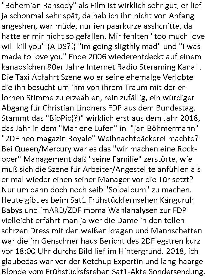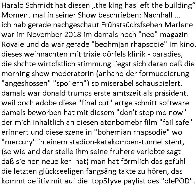 | Harald Schmidt hat diesen „the king has left the building“ Moment mal in seiner Show beschrieben: Nachhall … ich hab gerade nachgeschaut Frühstsücksfsehen Marlene war im November 2018 im damals noch "neo" magazin Royale und da war gerade "beohmjan rhapsodie" im kino. dieses weihnachten mit trixie dörfels klinik - paradies, die shchte wirtcfstlich stimmung liegst sich daran daß die morning show moderatorin (anhand der formueeierung "angeshossen" "spoilern") so miserabel schauspielert. damals war donald trumps erste amtszeit als präsident. weil doch adobe diese "final cut" artge schnitt software damals beworben hat mit diesem "don't stop me now" der mich inhaltlich an diesen atonbomebr film "fail safe" erinnert und diese szene in "bohemian rhapsodie" wo "mercury" in einem stadion-katakomben-tunnel steht, (so wie and der stelle ihm seine frühere verlobte sagt daß sie nen neue kerl hat) man hat förmlich das gefühl die letzten glückseeligen fangsäng takte zu hören, das kommt defitiv mit auf die top5fyve paylist des "dIePOD".