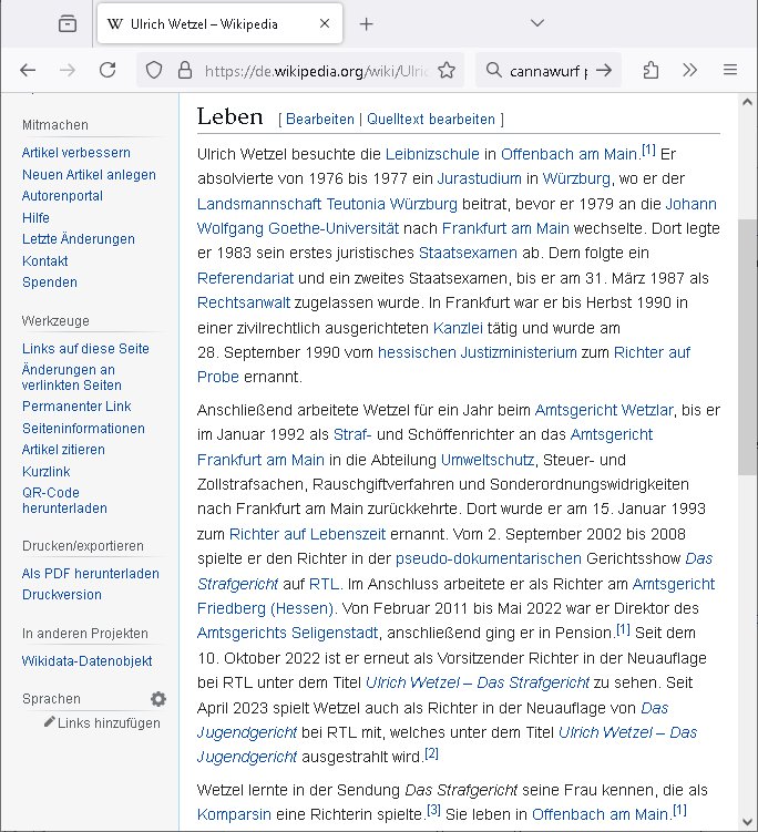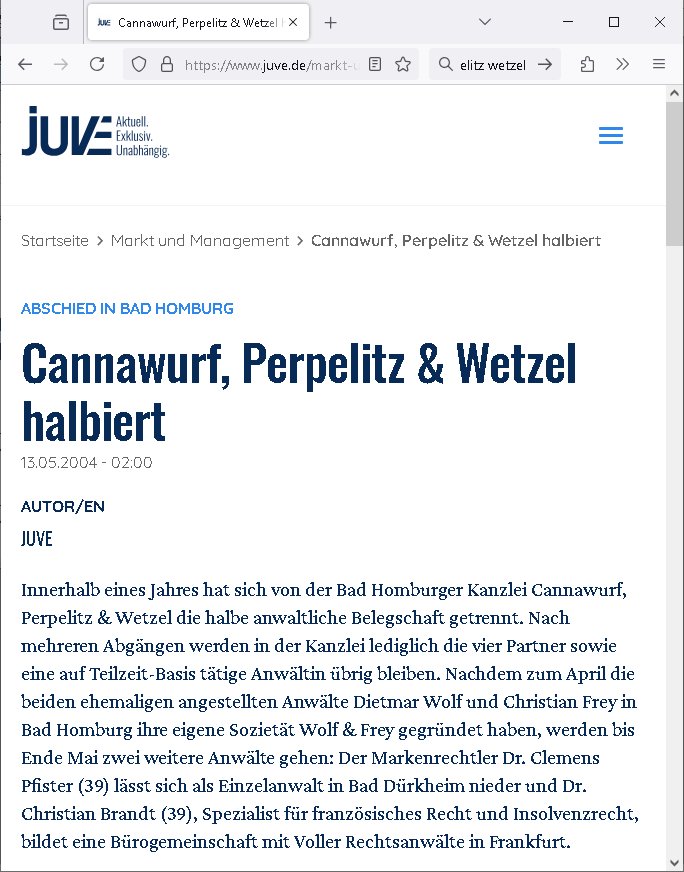" ... verwandt oder verschwägert ..." https://www.juve.de/markt-und-management/abschied-in-bad-homburg-cannawurf-perpelitz-wetzel-halbiert/ https://de.wikipedia.org/wiki/Ulrich_Wetzel http://tabea-lara.blogna.me | |