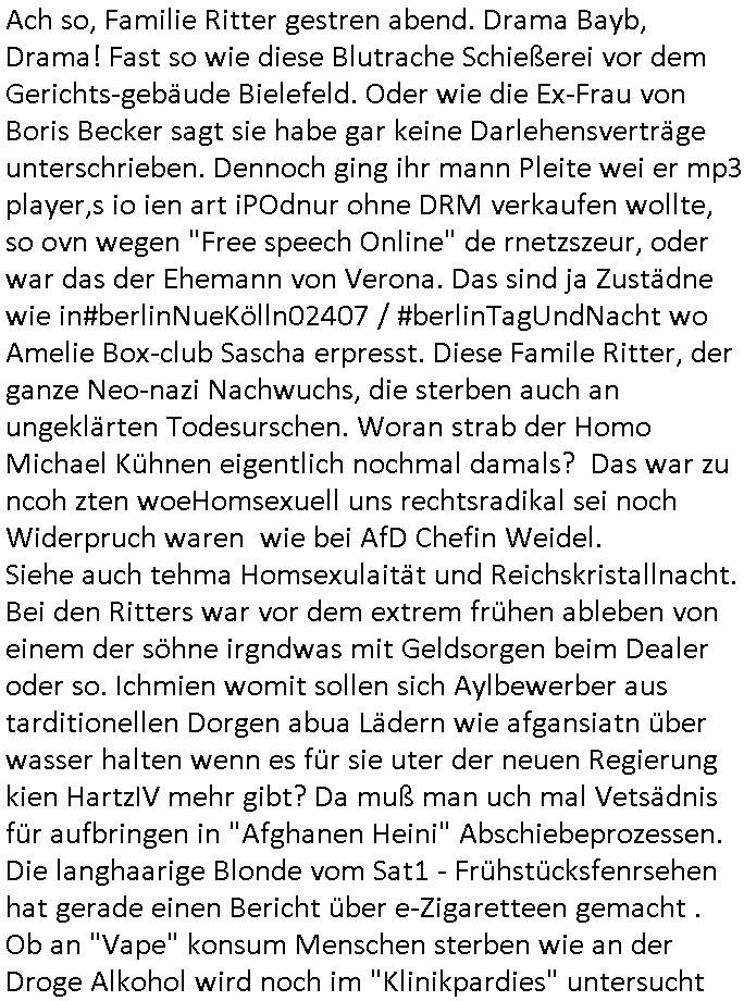 | Ach so, Familie Ritter gestren abend. Drama Bayb, Drama! Fast so wie diese Blutrache Schießerei vor dem Gerichts-gebäude Bielefeld. Oder wie die Ex-Frau von Boris Becker sagt sie habe gar keine Darlehensverträge unterschrieben. Dennoch ging ihr mann Pleite wei er mp3 player,s io ien art iPOdnur ohne DRM verkaufen wollte, so ovn wegen "Free speech Online" de rnetzszeur, oder war das der Ehemann von Verona. Das sind ja Zustädne wie in#berlinNueKölln02407 / #berlinTagUndNacht wo Amelie Box-club Sascha erpresst. Diese Famile Ritter, der ganze Neo-nazi Nachwuchs, die sterben auch an ungeklärten Todesurschen. Woran strab der Homo Michael Kühnen eigentlich nochmal damals? Das war zu ncoh zten woeHomsexuell uns rechtsradikal sei noch Widerpruch waren wie bei AfD Chefin Weidel. Siehe auch tehma Homsexulaität und Reichskristallnacht. Bei den Ritters war vor dem extrem frühen ableben von einem der söhne irgndwas mit Geldsorgen beim Dealer oder so. Ichmien womit sollen sich Aylbewerber aus tarditionellen Dorgen abua Lädern wie afgansiatn über wasser halten wenn es für sie uter der neuen Regierung kien HartzIV mehr gibt? Da muß man uch mal Vetsädnis für aufbringen in "Afghanen Heini" Abschiebeprozessen. Die langhaarige Blonde vom Sat1 - Frühstücksfenrsehen hat gerade einen Bericht über e-Zigaretteen gemacht . Ob an "Vape" konsum Menschen sterben wie an der Droge Alkohol wird noch im "Klinikpardies" untersucht