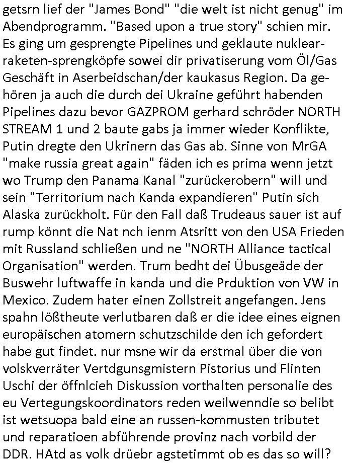 | getsrn lief der "James Bond" "die welt ist nicht genug" im Abendprogramm. "Based upon a true story" schien mir. Es ging um gesprengte Pipelines und geklaute nuklear-raketen-sprengköpfe sowei dir privatiserung vom Öl/Gas Geschäft in Aserbeidschan/der kaukasus Region. Da ge-hören ja auch die durch dei Ukraine geführt habenden Pipelines dazu bevor GAZPROM gerhard schröder NORTH STREAM 1 und 2 baute gabs ja immer wieder Konflikte, Putin dregte den Ukrinern das Gas ab. Sinne von MrGA "make russia great again" fäden ich es prima wenn jetzt wo Trump den Panama Kanal "zurückerobern" will und sein "Territorium nach Kanda expandieren" Putin sich Alaska zurückholt. Für den Fall daß Trudeaus sauer ist auf rump könnt die Nat nch ienm Atsritt von den USA Frieden mit Russland schließen und ne "NORTH Alliance tactical Organisation" werden. Trum bedht dei Übusgeäde der Buswehr luftwaffe in kanda und die Prduktion von VW in Mexico. Zudem hater einen Zollstreit angefangen. Jens spahn lößtheute verlutbaren daß er die idee eines eignen europäischen atomern schutzschilde den ich gefordert habe gut findet. nur msne wir da erstmal über die von volskverräter Vertdgunsgmistern Pistorius und Flinten Uschi der öffnlcieh Diskussion vorthalten personalie des eu Vertegungskoordinators reden weilwenndie so belibt ist wetsuopa bald eine an russen-kommusten tributet und reparatioen abführende provinz nach vorbild der DDR. HAtd as volk drüebr agstetimmt ob es das so will?
