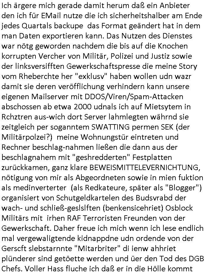 | Ich ärgere mich gerade damit herum daß ein Anbieter den ich für EMail nutze die ich sicherheitshalber am Ende jedes Quartals backupe das Format geändert hat in dem man Daten exportieren kann. Das Nutzen des Dienstes war nötg geworden nachdem die bis auf die Knochen korrupten Vercher von Militär, Polizei und Justiz sowie der linksversifften Gewerkschaftspresse die meine Story vom Rheberchte her "exklusv" haben wollen udn wazr damit sie deren veröfflichung verhindern kann unsere eigenen Mailserver mit DDOS/Viren/Spam-Attacken abschossen ab etwa 2000 udnals ich auf Mietsytem in Rchztren aus-wich dort Server lahmlegten währnd sie zeitgleich per soganntem SWATTING permen SEK (der Militärpolzei?) meine Wohnungstür eintreten und Rechner beschlag-nahmen ließen die dann aus der beschlagnahem mit "geshredderten" Festplatten zurückkamen, ganz klare BEWEISMITTELEVERNICHTUNG, nötigung von mir als Abgeordneten sowie in mien fuktion als medinverterter (als Redkateure, später als "Blogger") organisiert von Schutgeldkartelen des Budsvrabd der wach- und schließ-geslslften (benkensicehriet) Osblock Militärs mit irhen RAF Terroristen Freunden von der Gewerkschaft. Daher freue ich mich wenn ich lese endlich mal vergewaligtende kidnappdne udn ordende von der Gerscft slebstarnnte "Mitarbriter" di ienw ahhriet plünderer sind getöette werden und üer den Tod des DGB Chefs. Voller Hass fluche ich daß er in die Hölle kommt