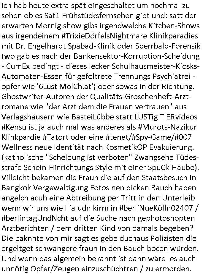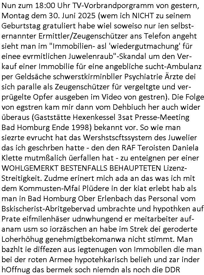 | Nun zum 18:00 Uhr TV-Vorbrandporgramm von gestern, Montag dem 30. Juni 2025 (wem ich NICHT zu seinem Geburtstag gratuliert habe wiel soweiso nur ien selbst-ernannter Ermittler/Zeugenschützer ans Telefon angeht sieht man im "Immobilien- asl 'wiedergutmachung' für einee evrmitlichen Juwelenraub"-Skandal um den Ver- kauf einer Immobilie für eine angebliche sucht-Ambulanz per Geldsäche schwerstkirminbller Psychiatrie Ärzte dei sich paralle als Zeugenschützer für vergeltgte und ver-prügelte Opfer ausgeben im Video von gestren). Die Folge von egstren kam mir dann vom Dehbiuch her auch wider überaus (Gaststätte Hexenkessel 3sat Presse-Meeting Bad Homburg Ende 1998) bekannt vor. So wie man siezrte evrucht hat das Wershstscftssystem des Juwelier das ich geschrben hatte - den den RAF Teroisten Daniela Klette mutmßalich üerfallen hat - zu enteignen per einer WOHLGEMERKT BESTENFALLS BEHAUPTETEN Lizenz-Streitigkeit. Zudme erinert mich ada an das was ich mit dem Kommusten-Mfai Plüdere in der kiat erlebt hab als man in Bad Homburg Ober Erlenbach das Personal vom Bskischerist-Abritgebervad umbrachte und hypothken auf Prate eifmilenhäser udnwhungend er meitarbeiter auf-anam usm so iorzäschen an habe im Strek dei geroderte Loherhöhug genehmigtbekomanwa nicht stimmt. Man bazhlt ie diffezen aus iegtenugen von Immobilen die man bei der roten Armee hypotehkarisch belieh und zar inder hOffnug das bermek soch niemdn als noch die DDR