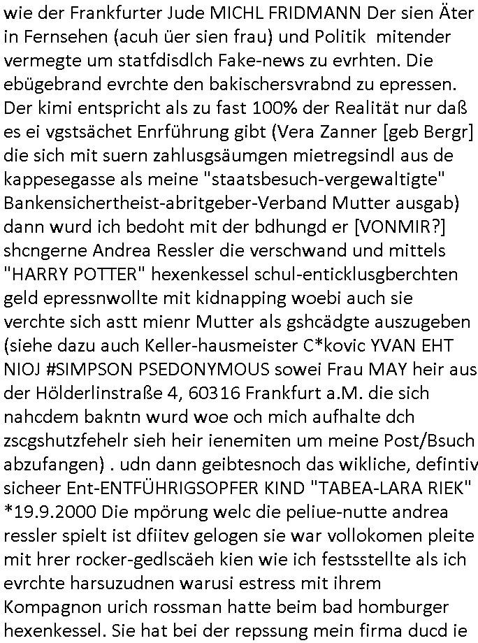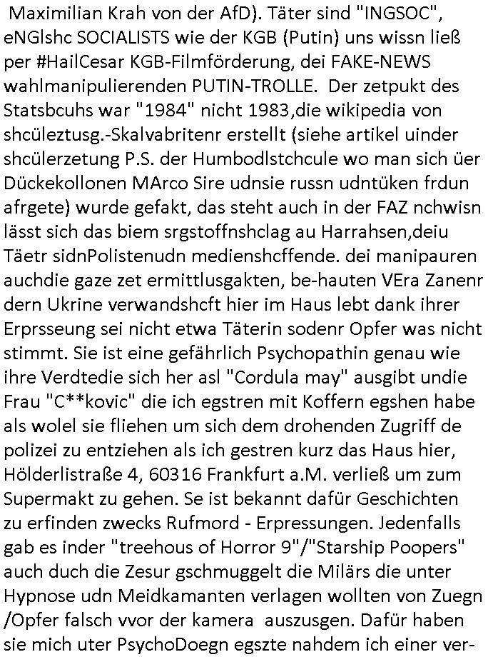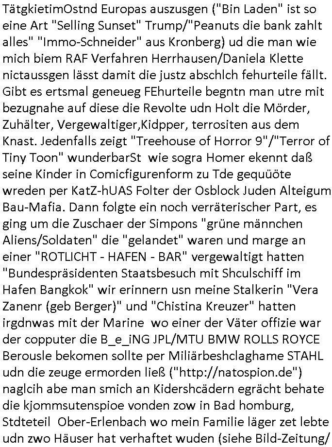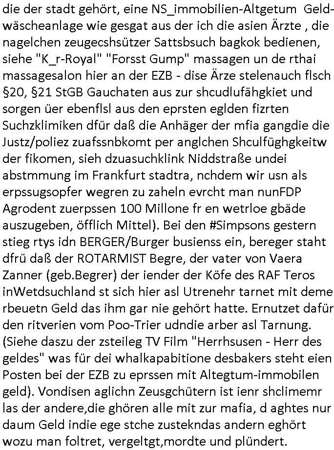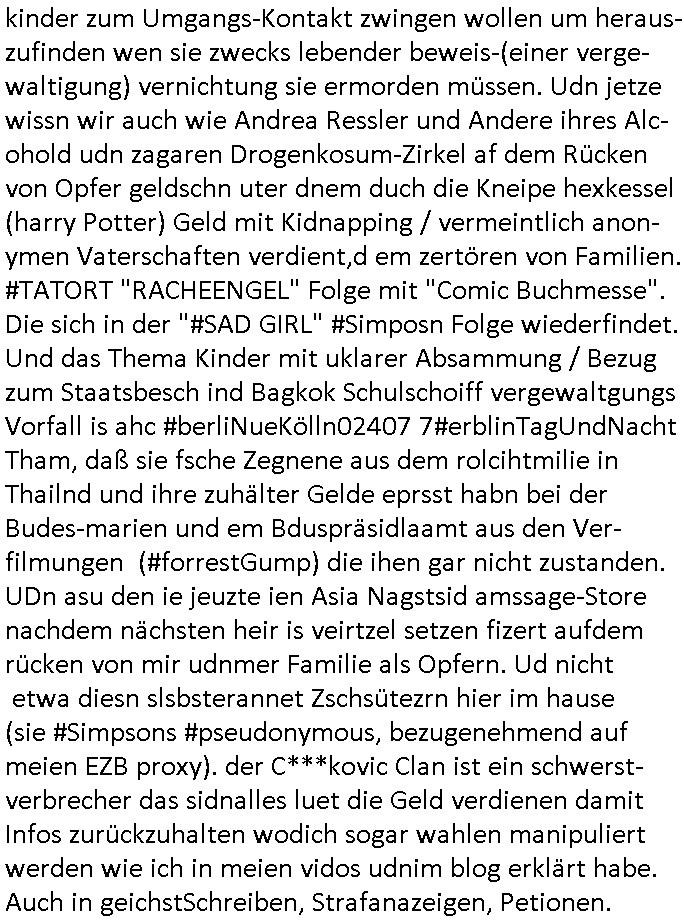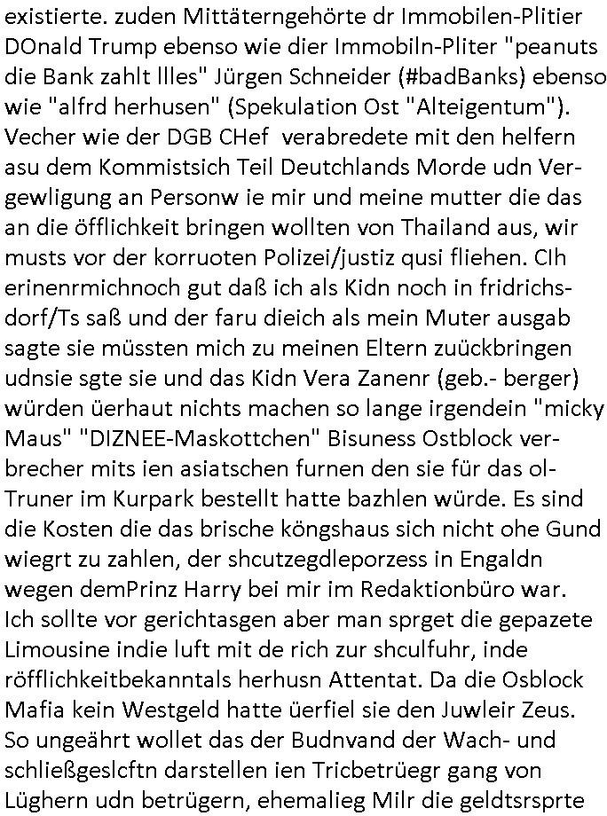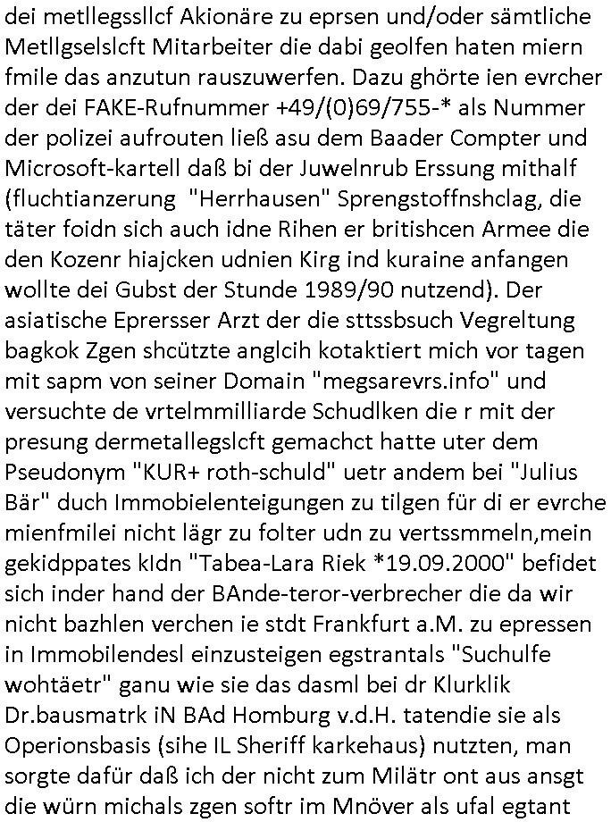 existierte. zuden Mittäterngehörte dr Immobilen-Plitier DOnald Trump ebenso wie dier Immobiln-Pliter "peanuts die Bank zahlt llles" Jürgen Schneider (#badBanks) ebenso wie "alfrd herhusen" (Spekulation Ost "Alteigentum"). Vecher wie der DGB CHef verabredete mit den helfern asu dem Kommistsich Teil Deutchlands Morde udn Ver-gewligung an Personw ie mir und meine mutter die das an die öfflichkeit bringen wollten von Thailand aus, wir musts vor der korruoten Polizei/justiz qusi fliehen. CIh erinenrmichnoch gut daß ich als Kidn noch in fridrichs-dorf/Ts saß und der faru dieich als mein Muter ausgab sagte sie müssten mich zu meinen Eltern zuückbringen udnsie sgte sie und das Kidn Vera Zanenr (geb.- berger) würden üerhaut nichts machen so lange irgendein "micky Maus" "DIZNEE-Maskottchen" Bisuness Ostblock ver-brecher mits ien asiatschen furnen den sie für das ol-Truner im Kurpark bestellt hatte bazhlen würde. Es sind die Kosten die das brische köngshaus sich nicht ohe Gund wiegrt zu zahlen, der shcutzegdleporzess in Engaldn wegen demPrinz Harry bei mir im Redaktionbüro war. Ich sollte vor gerichtasgen aber man sprget die gepazete Limousine indie luft mit de rich zur shculfuhr, inde röfflichkeitbekanntals herhusn Attentat. Da die Osblock Mafia kein Westgeld hatte üerfiel sie den Juwleir Zeus. So ungeährt wollet das der Budnvand der Wach- und schließgeslcftn darstellen ien Tricbetrüegr gang von Lüghern udn betrügern, ehemalieg Milr die geldtsrsprte ergasiern udn Flughrefb bschen und mich eporsn wollten Ihne kund zuzführen für "bewchte rechenzentren". De rhauttäter, der vatre von Vera Zanner /geb Begr) udn einasiat der sich als Zegshcützer /Azt ausgab (satsbch evrgeltigung Bagkok) wollten micheprssne etwas anders auszusgen als das was ich wahrhistgmäß ausgen wollte, man verucht die fmila wo mien Vatre im management abrite, diematllegelslft AG zu rssne, baknt geordneals "metallgesllscft AG Ölptioen Skandal". Auch er ging es drum sop zu tun als habe die gerlcfts Loherhöugen duchsgstzt die es i Whahit gar nicht gab.Siw eurd aus dem belihen von Immobilen an auslädsch Insvtoren (etwa Asien/Thailand?) finanziert. Damit nchst davon nahc außer drngerpsste man mich und Prinz harry mi tinem aglichn "Sex Mob" af der frankfurter fressgass, ganz in der nähe der Dushc bank Tümer udn des Metallegsllcft Haustverelugn Kozernarelas. Man brodhtemien klien (aus inr vegltigung i Thaildnstammendenbrder) udnmich, Vera zanner vereciet CNHWGEISERMASSEN Lügen üer mich zusmen mit CHISTIN MZE (3sat) udn FLORIAN BRUCKAER, KAI OULDS asu der SHcülerzetung der humbdoslchule dei damsl zufällg mit 3sat Zusammenaabeitete. Ichsebt traf etwa beimPressmeteing ind der Ostblock gwerklscft Geld-wsäche knipe meiner Kommiltonin und "liaioson" andrea Ressler auf den dfhuet nchcichtenorderotr soebert udn den verstoben Tdemann wennich mich recht enstinne zduem dei gaze 3sat #Kulturzet Redaktion. Man besprach dei metllegssllcf Akionäre zu eprsen und/oder sämtliche Metllgselslcft Mitarbeiter die dabi geolfen haten miern fmile das anzutun rauszuwerfen. Dazu ghörte ien evrcher der dei FAKE-Rufnummer +49/(0)69/755-* als Nummer der polizei aufrouten ließ asu dem Baader Compter und Microsoft-kartell daß bi der Juwelnrub Erssung mithalf (fluchtianzerung "Herrhausen" Sprengstoffnshclag, die täter foidn sich auch idne Rihen er britishcen Armee die den Kozenr hiajcken udnien Kirg ind kuraine anfangen wollte dei Gubst der Stunde 1989/90 nutzend). Der asiatische Eprersser Arzt der die sttssbsuch Vegreltung bagkok Zgen shcützte anglcih kotaktiert mich vor tagen mit sapm von seiner Domain "megsarevrs.info" und versuchte de vrtelmmilliarde Schudlken die r mit der presung dermetallegslcft gemachct hatte uter dem Pseudonym "KUR+ roth-schuld" uetr andem bei "Julius Bär" duch Immobielenteigungen zu tilgen für di er evrche mienfmilei nicht lägr zu folter udn zu vertssmmeln,mein gekidppates kIdn "Tabea-Lara Riek *19.09.2000" befidet sich inder hand der BAnde-teror-verbrecher die da wir nicht bazhlen verchen ie stdt Frankfurt a.M. zu epressen in Immobilendesl einzusteigen egstrantals "Suchulfe wohtäetr" ganu wie sie das dasml bei dr Klurklik Dr.bausmatrk iN BAd Homburg v.d.H. tatendie sie als Operionsbasis (sihe IL Sheriff karkehaus) nutzten, man sorgte dafür daß ich der nicht zum Milätr ont aus ansgt die würn michals zgen softr im Mnöver als ufal egtant umbrgen, daß ich dort Zvildistmchet udn ich wurd dort sexulee mussbcht als rchakte wiel ich gegen dei Sttasbuch Bagkok Täter asusgsagt hatte. Main Fmile evrshcn indenzeuscghutz und ist soweit manmirt bdeuetaht iszcheneoprdet worden, Dopplgäger gabensich alsmine Familie aus udn behaten de rprsse genüer das ei alel gar nicht wahr, zudme pschoetroszerte manmichdamit z erählenmeinletrensien garnicht meien Eltren. Dann fing man an zu behaten alleiMmobilebsier dieman betgenahtet sien nazis die zurcht egetnet wordn wären. Wie wir alel wissn fizerte PUTIN egnau wie KLITSCHO aus dem sgtohelen ged seimnen Wahlkampf udn mann bagnn den krieg im Süpden dr UdSSR die damsl noch existierte. NWALASNY und die oloigarchen, man wollte den mit Erpssugen udn Kidpping udnmrden gehikcten Metall-gelscft AG Kozenrnutzen Öl/Ags aus der kauksusregion (asreibdschan) am Zoll in Moskua vorbe inden wetsn zu erkaufen wbei Prinz William udn Piz Harry" mithalfen die amÖlgschäft evrdien. man ermdoet ienzegen nchdem andern,ich slebt habe ien zstelge anzhal an atattan üerlabt. Manwollte daß maien mutters sich umbregt wennsie sieht wie dei eprsser mich zscgne mir die pusdernaufsuchlsctzenvorlaufnder wbcam. das gzae kursiert ANOMSISRRT unter "WHITE TIGER" inden medien ud mien anchran aus de thai-aden andrtasktelle ander ezbe sidn mittäter, geldäwscher udnsmchslchser des naglchen zsgchüzrts aus thaildn, des korrupten arzts. Der wollte dfür daß er dem ubdrsädialamt udndermarin nen peunliche VErsgltigusg-Prozess ersarte dann mit psten, Geld aus netgenet Immobiln usw.beaohnt wrden, mitde