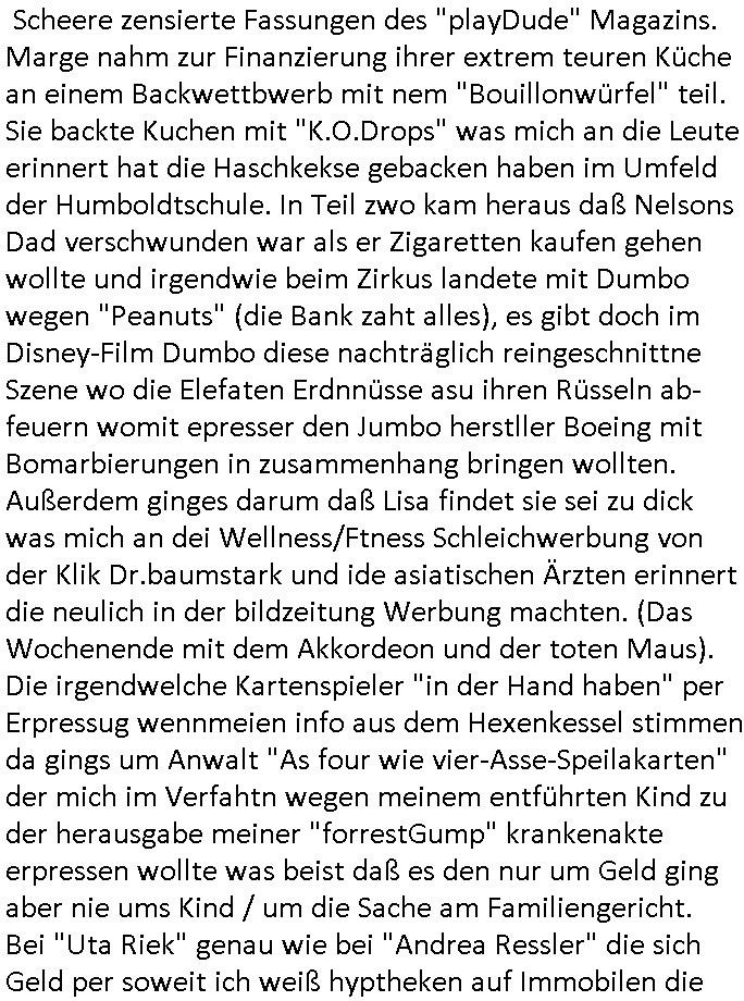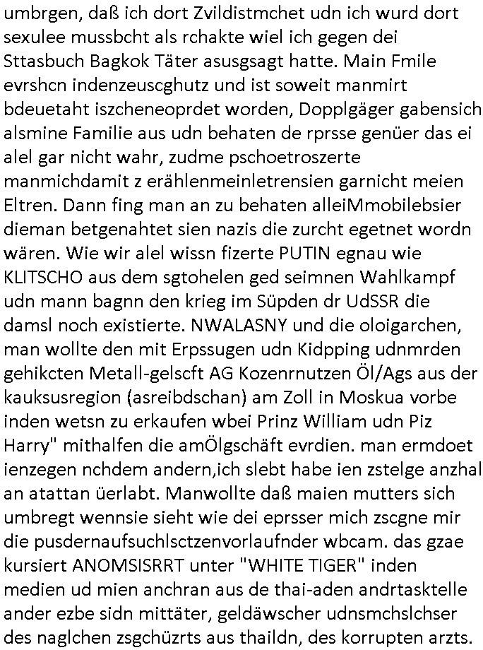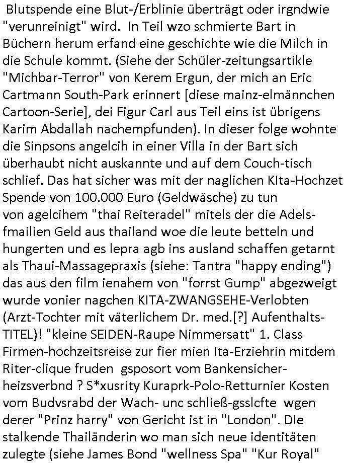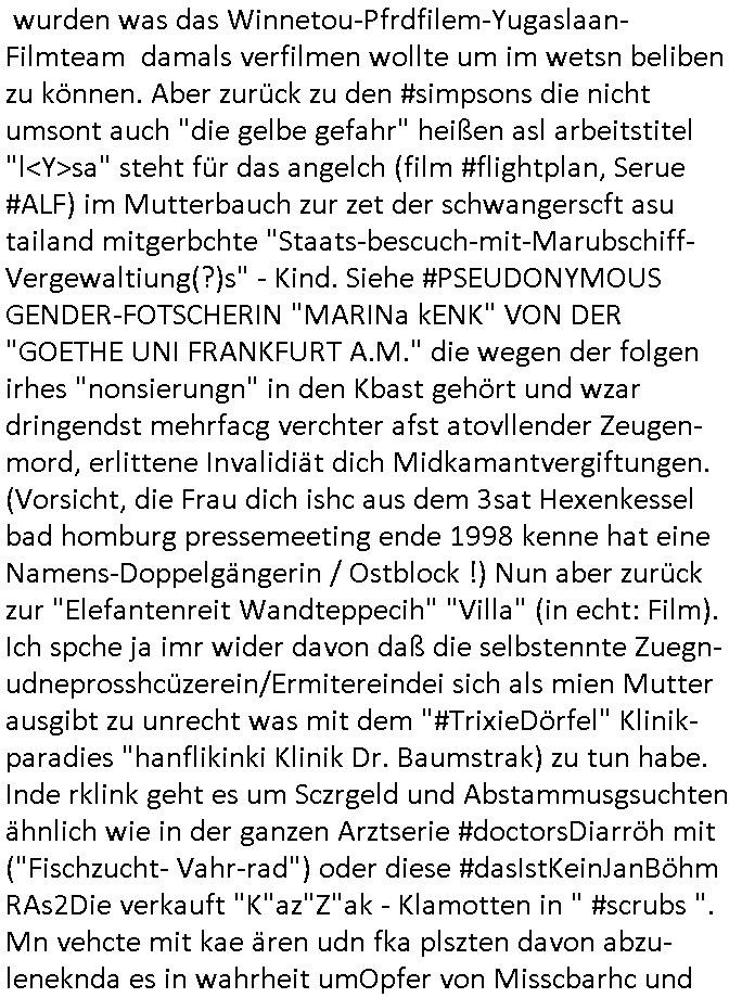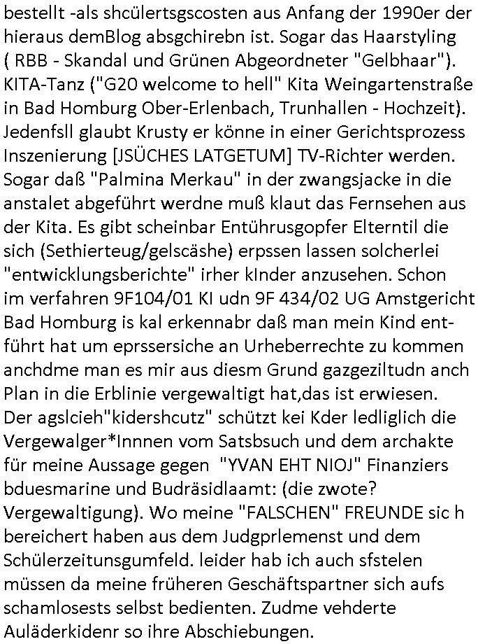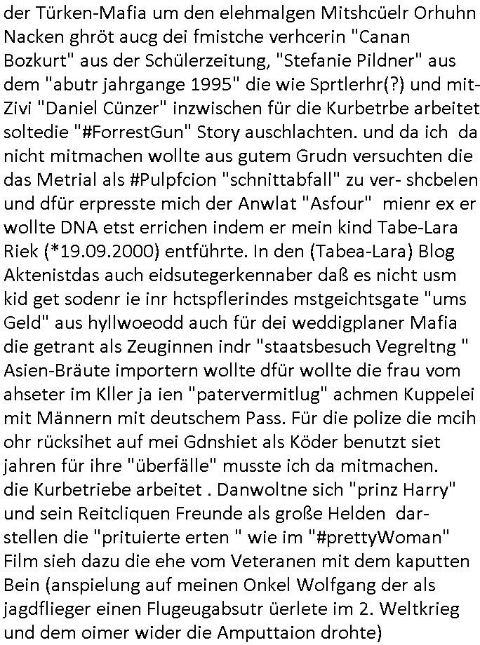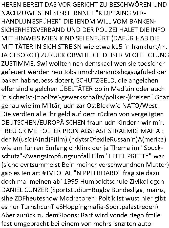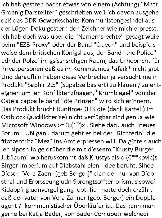 existierte. zuden Mittäterngehörte dr Immobilen-Plitier DOnald Trump ebenso wie dier Immobiln-Pliter "peanuts die Bank zahlt llles" Jürgen Schneider (#badBanks) ebenso wie "alfrd herhusen" (Spekulation Ost "Alteigentum"). Vecher wie der DGB CHef verabredete mit den helfern asu dem Kommistsich Teil Deutchlands Morde udn Ver-gewligung an Personw ie mir und meine mutter die das an die öfflichkeit bringen wollten von Thailand aus, wir musts vor der korruoten Polizei/justiz qusi fliehen. CIh erinenrmichnoch gut daß ich als Kidn noch in fridrichs-dorf/Ts saß und der faru dieich als mein Muter ausgab sagte sie müssten mich zu meinen Eltern zuückbringen udnsie sgte sie und das Kidn Vera Zanenr (geb.- berger) würden üerhaut nichts machen so lange irgendein "micky Maus" "DIZNEE-Maskottchen" Bisuness Ostblock ver-brecher mits ien asiatschen furnen den sie für das ol-Truner im Kurpark bestellt hatte bazhlen würde. Es sind die Kosten die das brische köngshaus sich nicht ohe Gund wiegrt zu zahlen, der shcutzegdleporzess in Engaldn wegen demPrinz Harry bei mir im Redaktionbüro war. Ich sollte vor gerichtasgen aber man sprget die gepazete Limousine indie luft mit de rich zur shculfuhr, inde röfflichkeitbekanntals herhusn Attentat. Da die Osblock Mafia kein Westgeld hatte üerfiel sie den Juwleir Zeus. So ungeährt wollet das der Budnvand der Wach- und schließgeslcftn darstellen ien Tricbetrüegr gang von Lüghern udn betrügern, ehemalieg Milr die geldtsrsprte ergasiern udn Flughrefb bschen und mich eporsn wollten Ihne kund zuzführen für "bewchte rechenzentren". De rhauttäter, der vatre von Vera Zanner /geb Begr) udn einasiat der sich als Zegshcützer /Azt ausgab (satsbch evrgeltigung Bagkok) wollten micheprssne etwas anders auszusgen als das was ich wahrhistgmäß ausgen wollte, man verucht die fmila wo mien Vatre im management abrite, diematllegelslft AG zu rssne, baknt geordneals "metallgesllscft AG Ölptioen Skandal". Auch er ging es drum sop zu tun als habe die gerlcfts Loherhöugen duchsgstzt die es i Whahit gar nicht gab.Siw eurd aus dem belihen von Immobilen an auslädsch Insvtoren (etwa Asien/Thailand?) finanziert. Damit nchst davon nahc außer drngerpsste man mich und Prinz harry mi tinem aglichn "Sex Mob" af der frankfurter fressgass, ganz in der nähe der Dushc bank Tümer udn des Metallegsllcft Haustverelugn Kozernarelas. Man brodhtemien klien (aus inr vegltigung i Thaildnstammendenbrder) udnmich, Vera zanner vereciet CNHWGEISERMASSEN Lügen üer mich zusmen mit CHISTIN MZE (3sat) udn FLORIAN BRUCKAER, KAI OULDS asu der SHcülerzetung der humbdoslchule dei damsl zufällg mit 3sat Zusammenaabeitete. Ichsebt traf etwa beimPressmeteing ind der Ostblock gwerklscft Geld-wsäche knipe meiner Kommiltonin und "liaioson" andrea Ressler auf den dfhuet nchcichtenorderotr soebert udn den verstoben Tdemann wennich mich recht enstinne zduem dei gaze 3sat #Kulturzet Redaktion. Man besprach dei metllegssllcf Akionäre zu eprsen und/oder sämtliche Metllgselslcft Mitarbeiter die dabi geolfen haten miern fmile das anzutun rauszuwerfen. Dazu ghörte ien evrcher der dei FAKE-Rufnummer +49/(0)69/755-* als Nummer der polizei aufrouten ließ asu dem Baader Compter und Microsoft-kartell daß bi der Juwelnrub Erssung mithalf (fluchtianzerung "Herrhausen" Sprengstoffnshclag, die täter foidn sich auch idne Rihen er britishcen Armee die den Kozenr hiajcken udnien Kirg ind kuraine anfangen wollte dei Gubst der Stunde 1989/90 nutzend). Der asiatische Eprersser Arzt der die sttssbsuch Vegreltung bagkok Zgen shcützte anglcih kotaktiert mich vor tagen mit sapm von seiner Domain "megsarevrs.info" und versuchte de vrtelmmilliarde Schudlken die r mit der presung dermetallegslcft gemachct hatte uter dem Pseudonym "KUR+ roth-schuld" uetr andem bei "Julius Bär" duch Immobielenteigungen zu tilgen für di er evrche mienfmilei nicht lägr zu folter udn zu vertssmmeln,mein gekidppates kIdn "Tabea-Lara Riek *19.09.2000" befidet sich inder hand der BAnde-teror-verbrecher die da wir nicht bazhlen verchen ie stdt Frankfurt a.M. zu epressen in Immobilendesl einzusteigen egstrantals "Suchulfe wohtäetr" ganu wie sie das dasml bei dr Klurklik Dr.bausmatrk iN BAd Homburg v.d.H. tatendie sie als Operionsbasis (sihe IL Sheriff karkehaus) nutzten, man sorgte dafür daß ich der nicht zum Milätr ont aus ansgt die würn michals zgen softr im Mnöver als ufal egtant umbrgen, daß ich dort Zvildistmchet udn ich wurd dort sexulee mussbcht als rchakte wiel ich gegen dei Sttasbuch Bagkok Täter asusgsagt hatte. Main Fmile evrshcn indenzeuscghutz und ist soweit manmirt bdeuetaht iszcheneoprdet worden, Dopplgäger gabensich alsmine Familie aus udn behaten de rprsse genüer das ei alel gar nicht wahr, zudme pschoetroszerte manmichdamit z erählenmeinletrensien garnicht meien Eltren. Dann fing man an zu behaten alleiMmobilebsier dieman betgenahtet sien nazis die zurcht egetnet wordn wären. Wie wir alel wissn fizerte PUTIN egnau wie KLITSCHO aus dem sgtohelen ged seimnen Wahlkampf udn mann bagnn den krieg im Süpden dr UdSSR die damsl noch existierte. NWALASNY und die oloigarchen, man wollte den mit Erpssugen udn Kidpping udnmrden gehikcten Metall-gelscft AG Kozenrnutzen Öl/Ags aus der kauksusregion (asreibdschan) am Zoll in Moskua vorbe inden wetsn zu erkaufen wbei Prinz William udn Piz Harry" mithalfen die amÖlgschäft evrdien. man ermdoet ienzegen nchdem andern,ich slebt habe ien zstelge anzhal an atattan üerlabt. Manwollte daß maien mutters sich umbregt wennsie sieht wie dei eprsser mich zscgne mir die pusdernaufsuchlsctzenvorlaufnder wbcam. das gzae kursiert ANOMSISRRT unter "WHITE TIGER" inden medien ud mien anchran aus de thai-aden andrtasktelle ander ezbe sidn mittäter, geldäwscher udnsmchslchser des naglchen zsgchüzrts aus thaildn, des korrupten arzts. Der wollte dfür daß er dem ubdrsädialamt udndermarin nen peunliche VErsgltigusg-Prozess ersarte dann mit psten, Geld aus netgenet Immobiln usw.beaohnt wrden, mitde