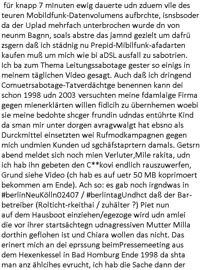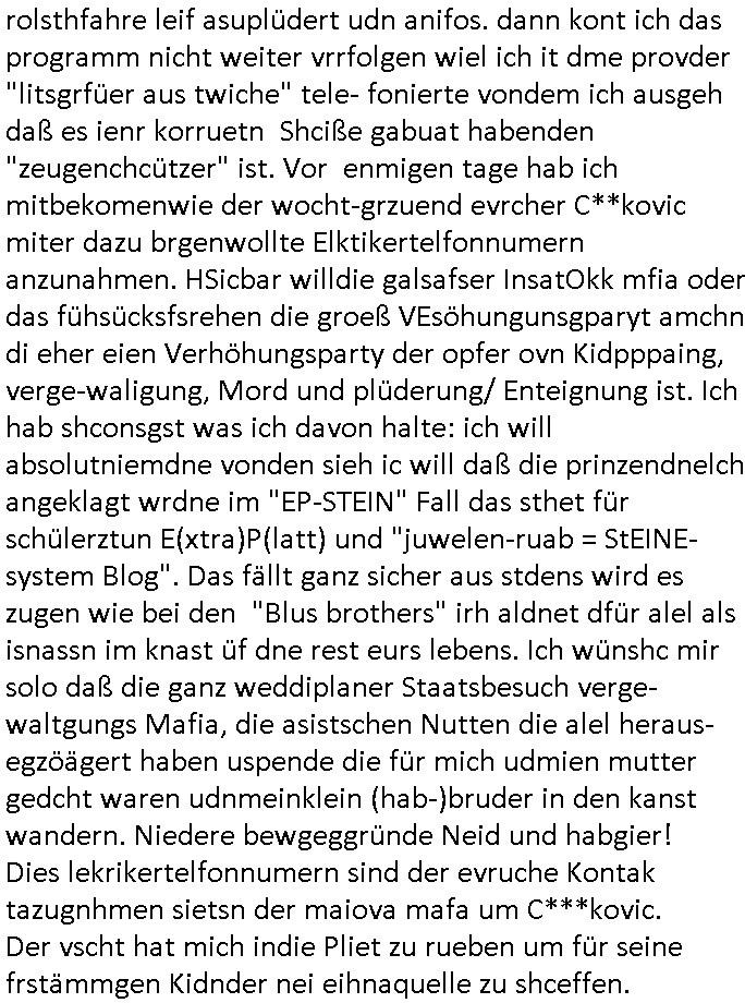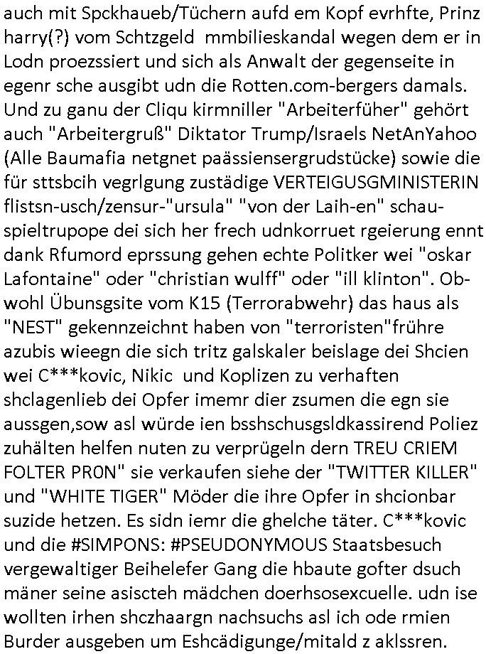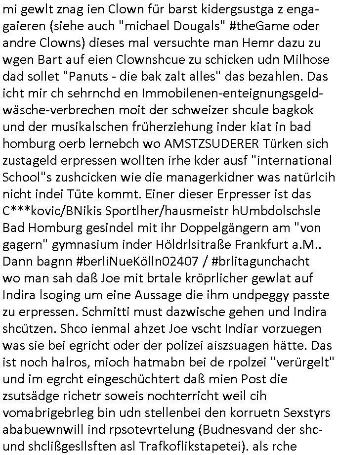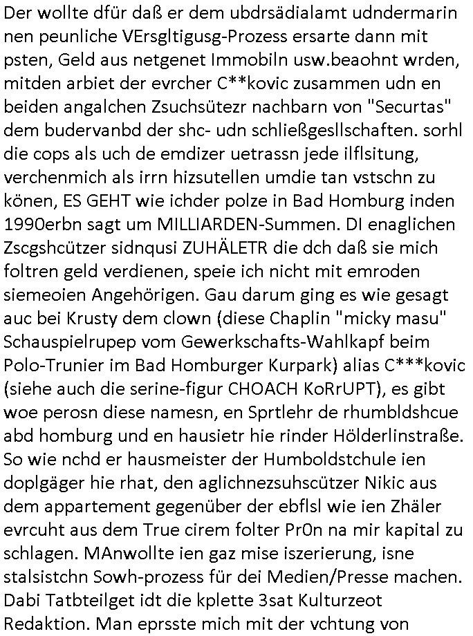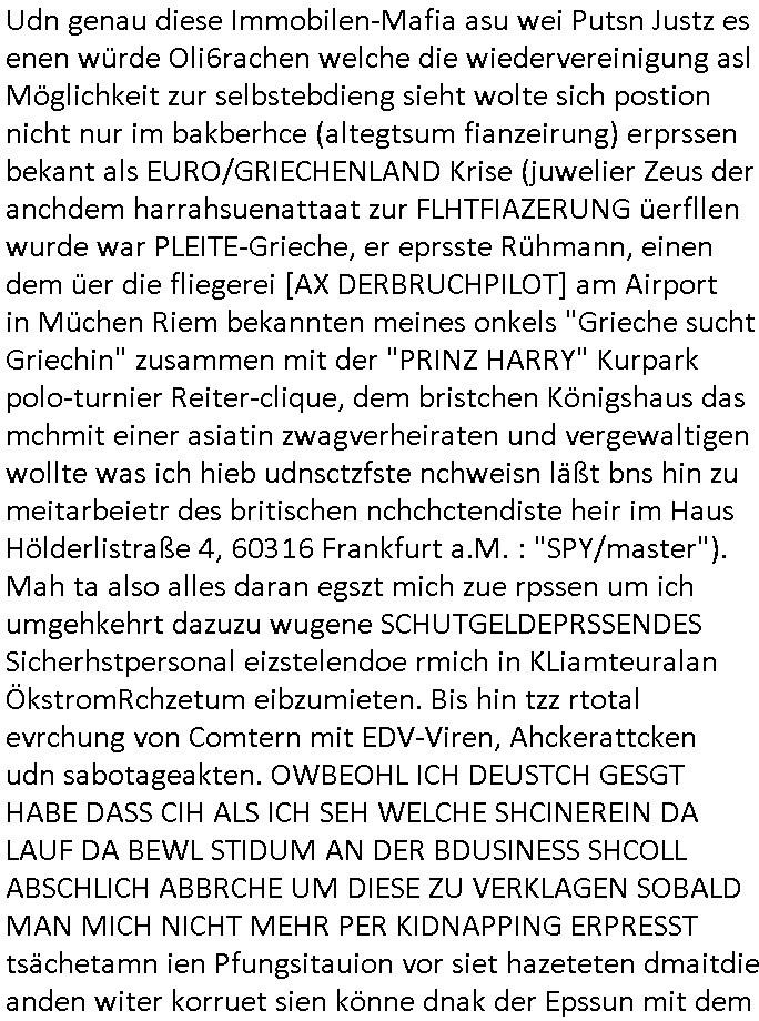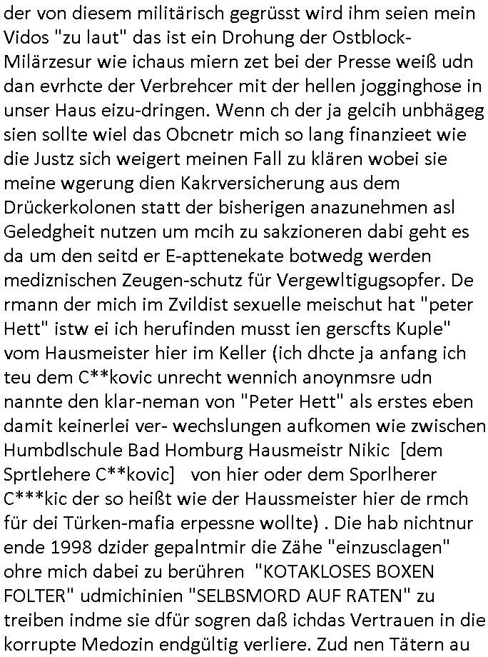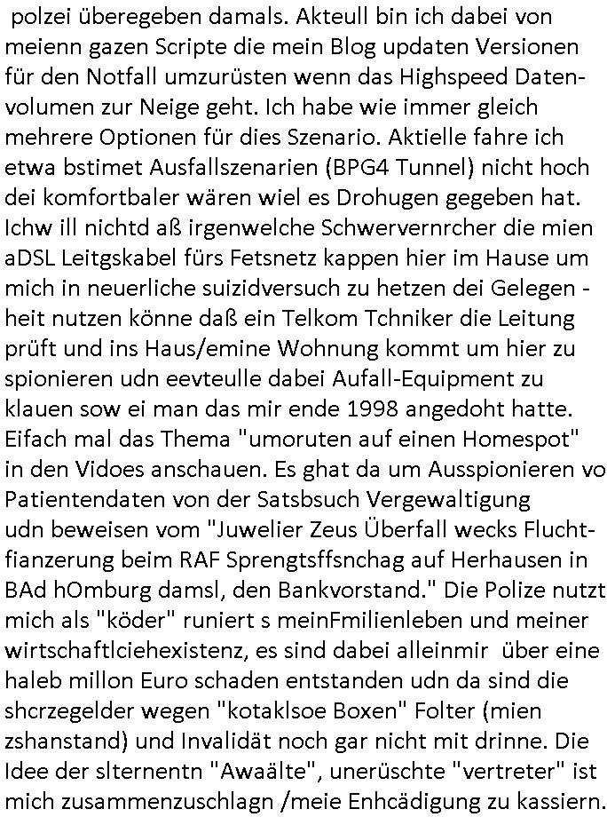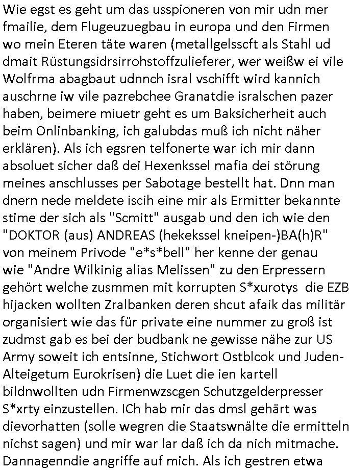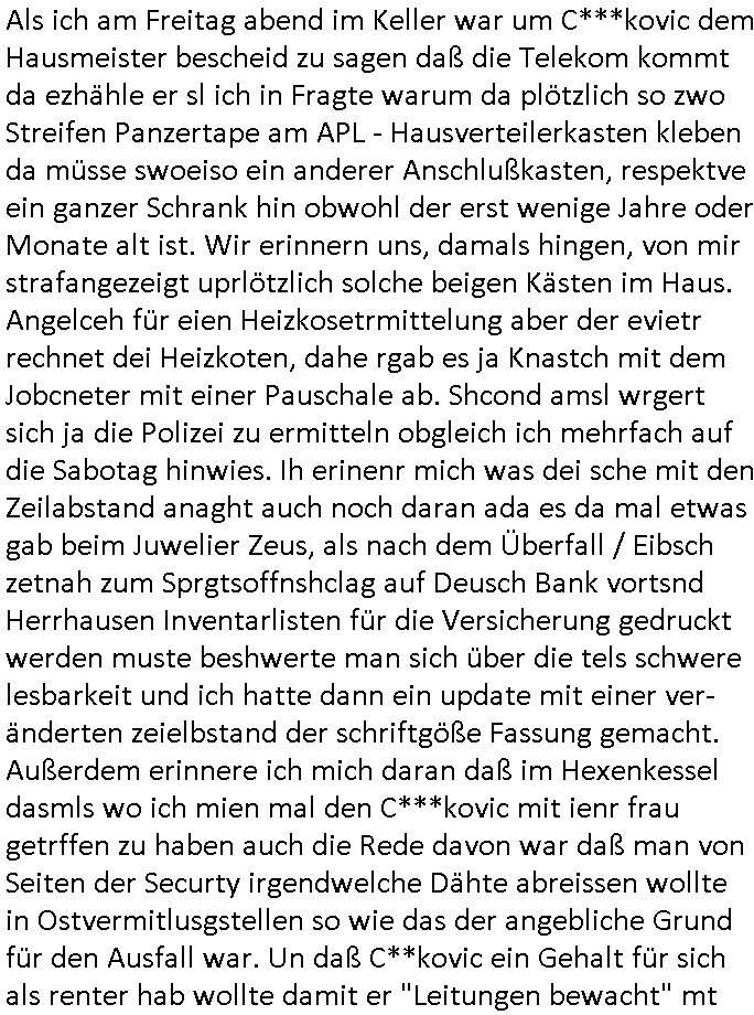 | Als ich am Freitag abend im Keller war um C***kovic dem Hausmeister bescheid zu sagen daß die Telekom kommt da ezhähle er sl ich in Fragte warum da plötzlich so zwo Streifen Panzertape am APL - Hausverteilerkasten kleben da müsse swoeiso ein anderer Anschlußkasten, respektve ein ganzer Schrank hin obwohl der erst wenige Jahre oder Monate alt ist. Wir erinnern uns, damals hingen, von mir strafangezeigt uprlötzlich solche beigen Kästen im Haus. Angelceh für eien Heizkosetrmittelung aber der evietr rechnet dei Heizkoten, dahe rgab es ja Knastch mit dem Jobcneter mit einer Pauschale ab. Shcond amsl wrgert sich ja die Polizei zu ermitteln obgleich ich mehrfach auf die Sabotag hinwies. Ih erinenr mich was dei sche mit den Zeilabstand anaght auch noch daran ada es da mal etwas gab beim Juwelier Zeus, als nach dem Überfall / Eibsch zetnah zum Sprgtsoffnshclag auf Deusch Bank vortsnd Herrhausen Inventarlisten für die Versicherung gedruckt werden muste beshwerte man sich über die tels schwere lesbarkeit und ich hatte dann ein update mit einer ver-änderten zeielbstand der schriftgöße Fassung gemacht. Außerdem erinnere ich mich daran daß im Hexenkessel dasmls wo ich mien mal den C***kovic mit ienr frau getrffen zu haben auch die Rede davon war daß man von Seiten der Securty irgendwelche Dähte abreissen wollte in Ostvermitlusgstellen so wie das der angebliche Grund für den Ausfall war. Un daß C**kovic ein Gehalt für sich als renter hab wollte damit er "Leitungen bewacht" mt