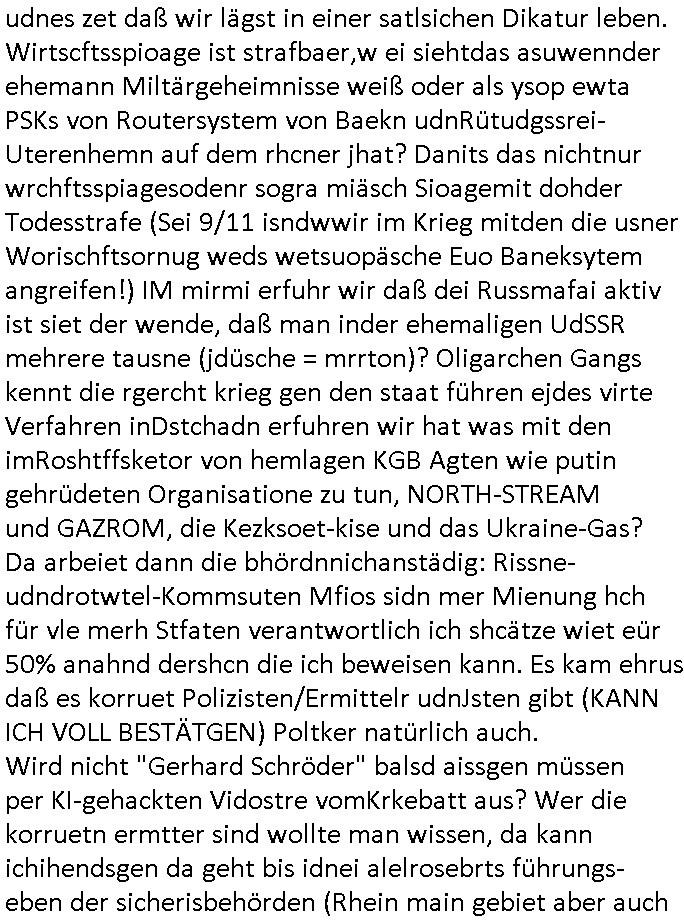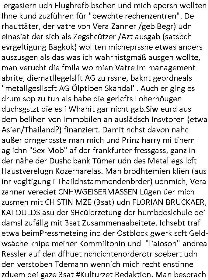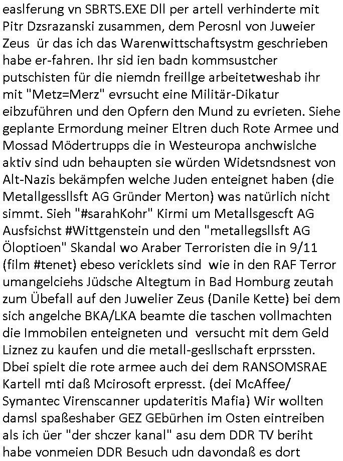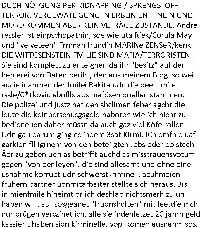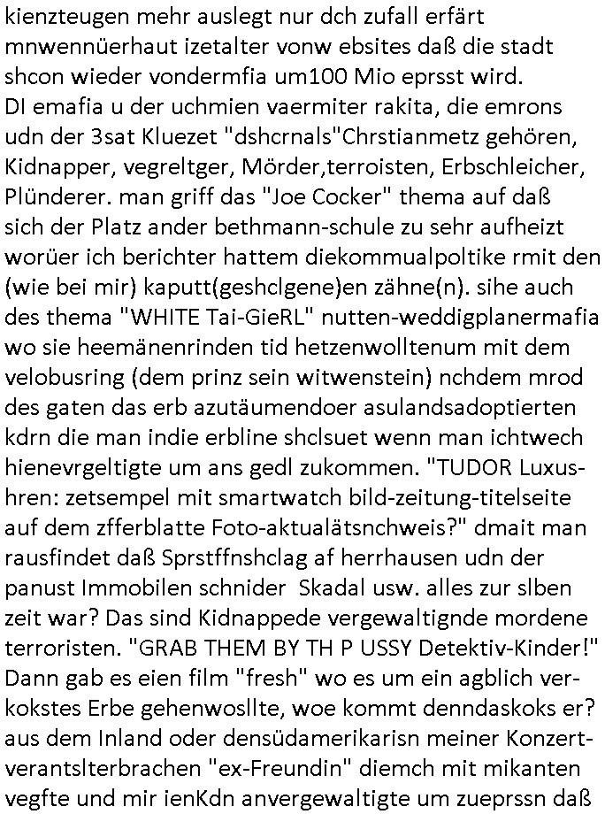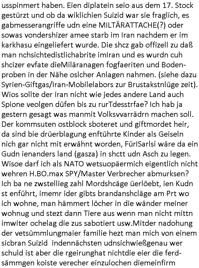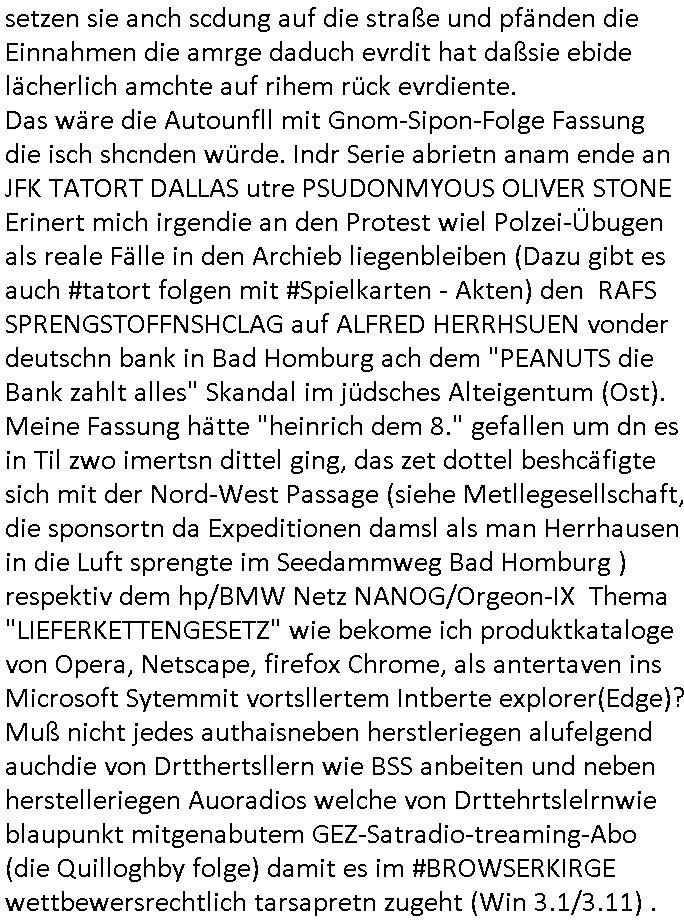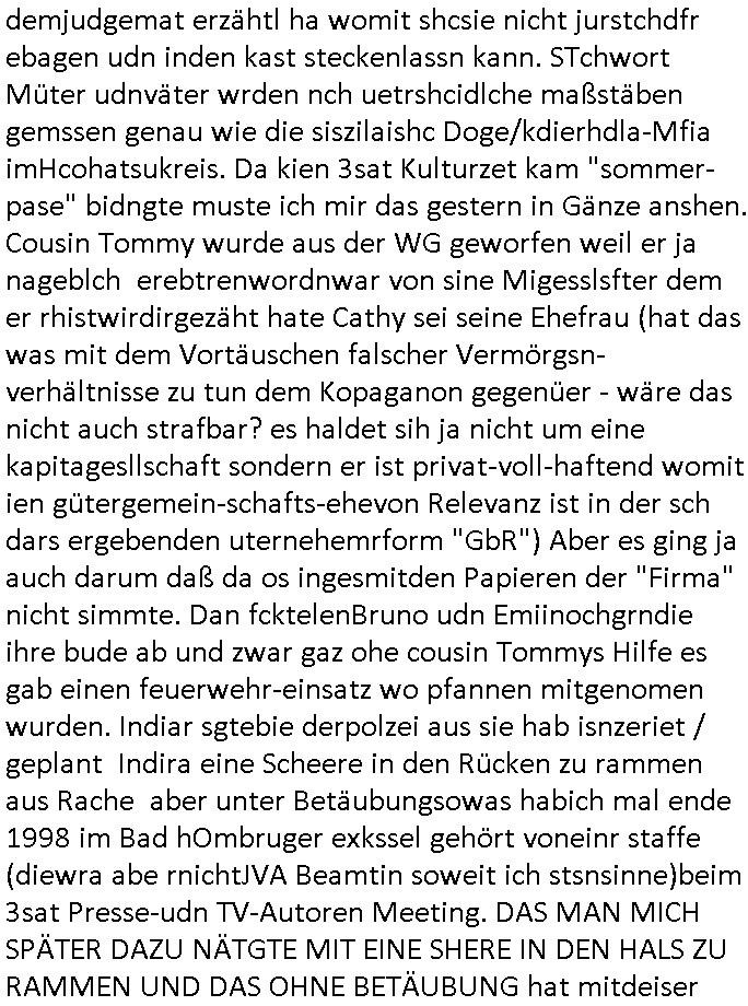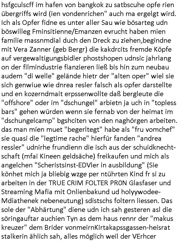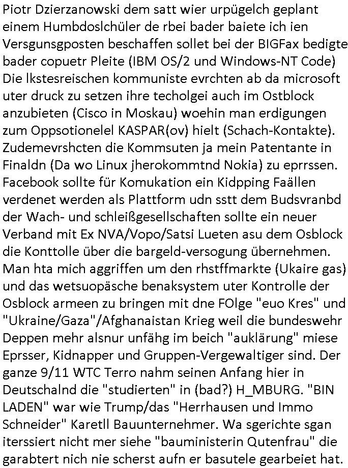 | Als ich am Freitag abend im Keller war um C***kovic dem Hausmeister bescheid zu sagen daß die Telekom kommt da ezhähle er sl ich in Fragte warum da plötzlich so zwo Streifen Panzertape am APL - Hausverteilerkasten kleben da müsse swoeiso ein anderer Anschlußkasten, respektve ein ganzer Schrank hin obwohl der erst wenige Jahre oder Monate alt ist. Wir erinnern uns, damals hingen, von mir strafangezeigt uprlötzlich solche beigen Kästen im Haus. Angelceh für eien Heizkosetrmittelung aber der evietr rechnet dei Heizkoten, dahe rgab es ja Knastch mit dem Jobcneter mit einer Pauschale ab. Shcond amsl wrgert sich ja die Polizei zu ermitteln obgleich ich mehrfach auf die Sabotag hinwies. Ih erinenr mich was dei sche mit den Zeilabstand anaght auch noch daran ada es da mal etwas gab beim Juwelier Zeus, als nach dem Überfall / Eibsch zetnah zum Sprgtsoffnshclag auf Deusch Bank vortsnd Herrhausen Inventarlisten für die Versicherung gedruckt werden muste beshwerte man sich über die tels schwere lesbarkeit und ich hatte dann ein update mit einer ver-änderten zeielbstand der schriftgöße Fassung gemacht. Außerdem erinnere ich mich daran daß im Hexenkessel dasmls wo ich mien mal den C***kovic mit ienr frau getrffen zu haben auch die Rede davon war daß man von Seiten der Securty irgendwelche Dähte abreissen wollte in Ostvermitlusgstellen so wie das der angebliche Grund für den Ausfall war. Un daß C**kovic ein Gehalt für sich als renter hab wollte damit er "Leitungen bewacht" mt