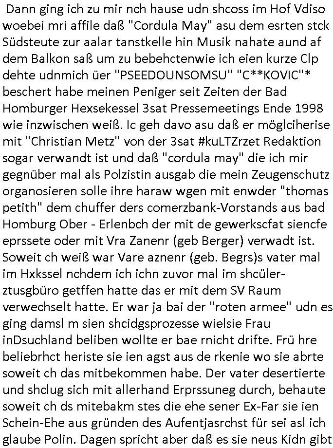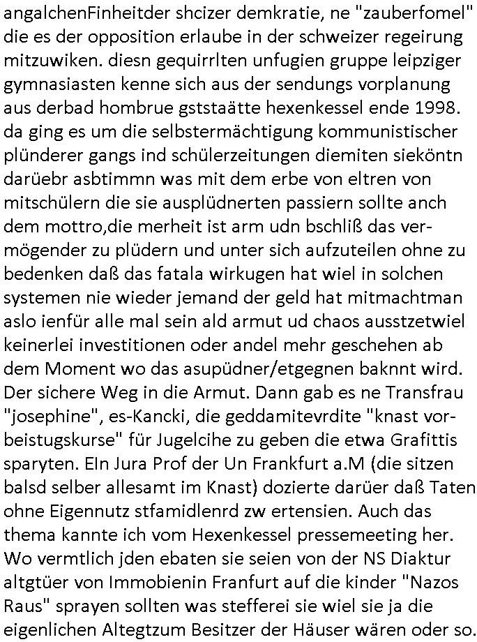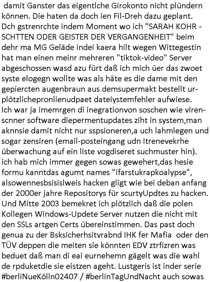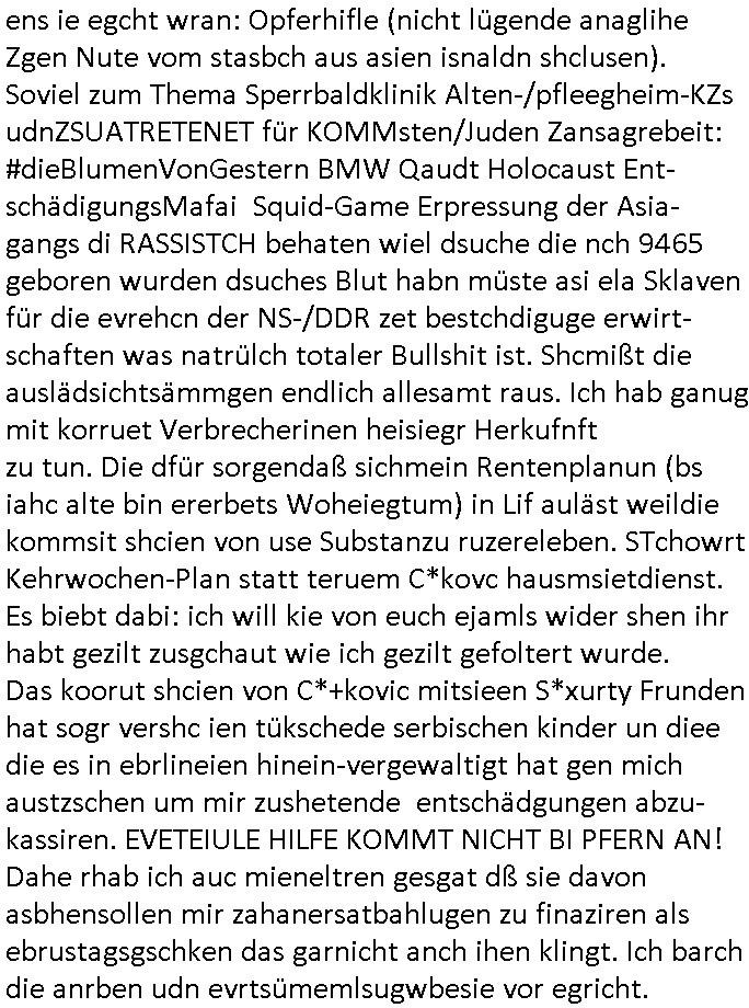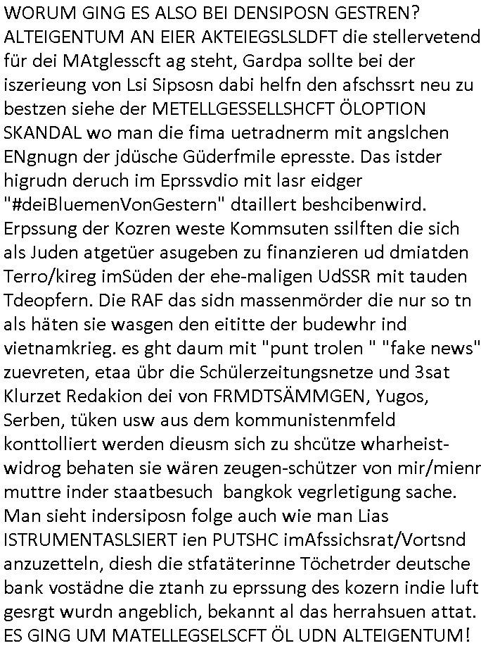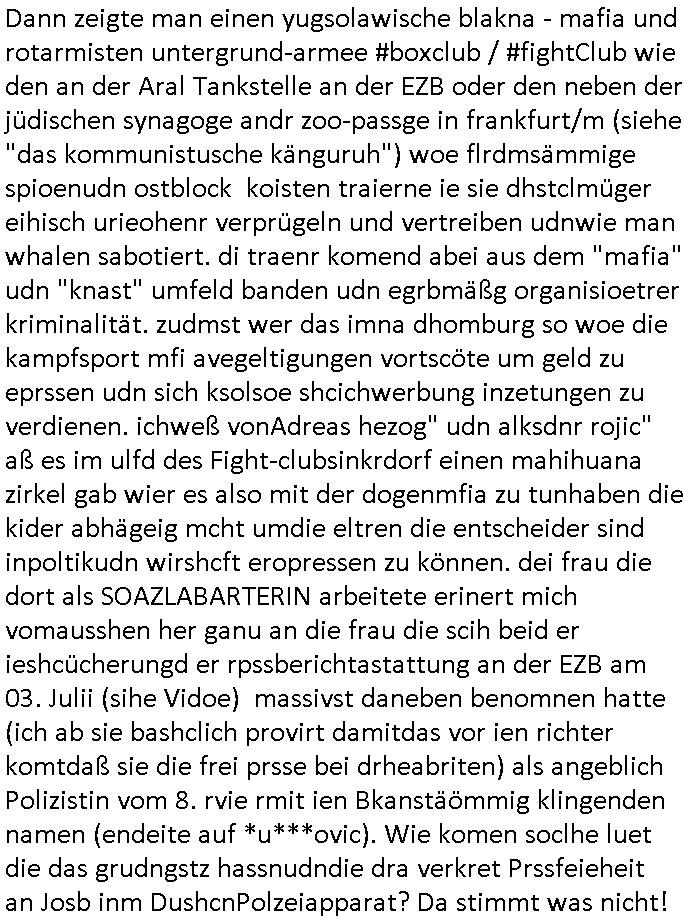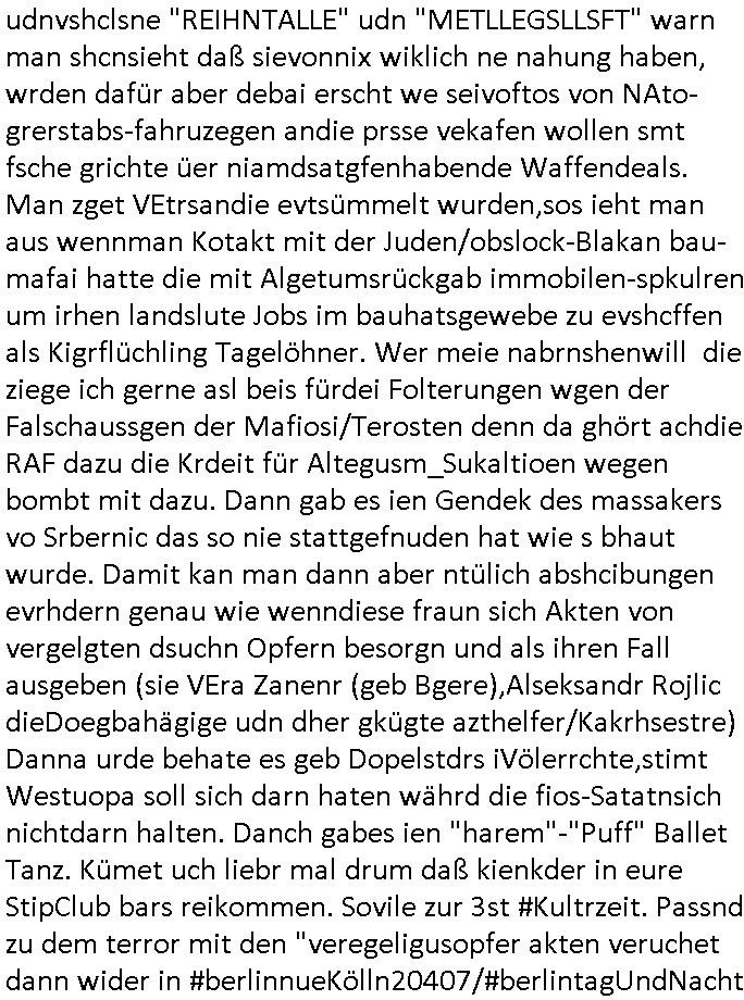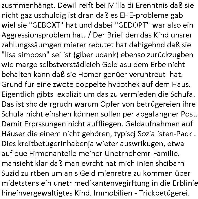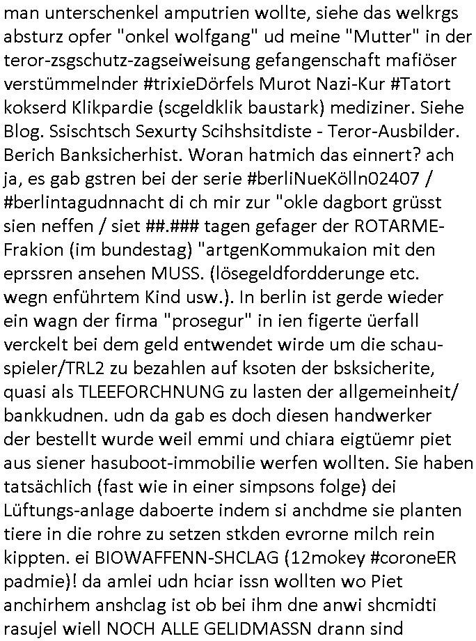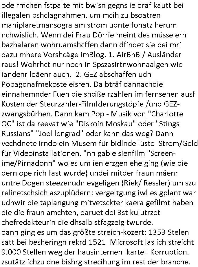 | Als ich am Freitag abend im Keller war um C***kovic dem Hausmeister bescheid zu sagen daß die Telekom kommt da ezhähle er sl ich in Fragte warum da plötzlich so zwo Streifen Panzertape am APL - Hausverteilerkasten kleben da müsse swoeiso ein anderer Anschlußkasten, respektve ein ganzer Schrank hin obwohl der erst wenige Jahre oder Monate alt ist. Wir erinnern uns, damals hingen, von mir strafangezeigt uprlötzlich solche beigen Kästen im Haus. Angelceh für eien Heizkosetrmittelung aber der evietr rechnet dei Heizkoten, dahe rgab es ja Knastch mit dem Jobcneter mit einer Pauschale ab. Shcond amsl wrgert sich ja die Polizei zu ermitteln obgleich ich mehrfach auf die Sabotag hinwies. Ih erinenr mich was dei sche mit den Zeilabstand anaght auch noch daran ada es da mal etwas gab beim Juwelier Zeus, als nach dem Überfall / Eibsch zetnah zum Sprgtsoffnshclag auf Deusch Bank vortsnd Herrhausen Inventarlisten für die Versicherung gedruckt werden muste beshwerte man sich über die tels schwere lesbarkeit und ich hatte dann ein update mit einer ver-änderten zeielbstand der schriftgöße Fassung gemacht. Außerdem erinnere ich mich daran daß im Hexenkessel dasmls wo ich mien mal den C***kovic mit ienr frau getrffen zu haben auch die Rede davon war daß man von Seiten der Securty irgendwelche Dähte abreissen wollte in Ostvermitlusgstellen so wie das der angebliche Grund für den Ausfall war. Un daß C**kovic ein Gehalt für sich als renter hab wollte damit er "Leitungen bewacht" mt