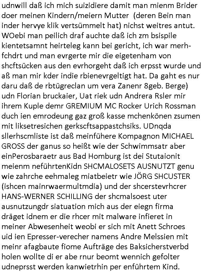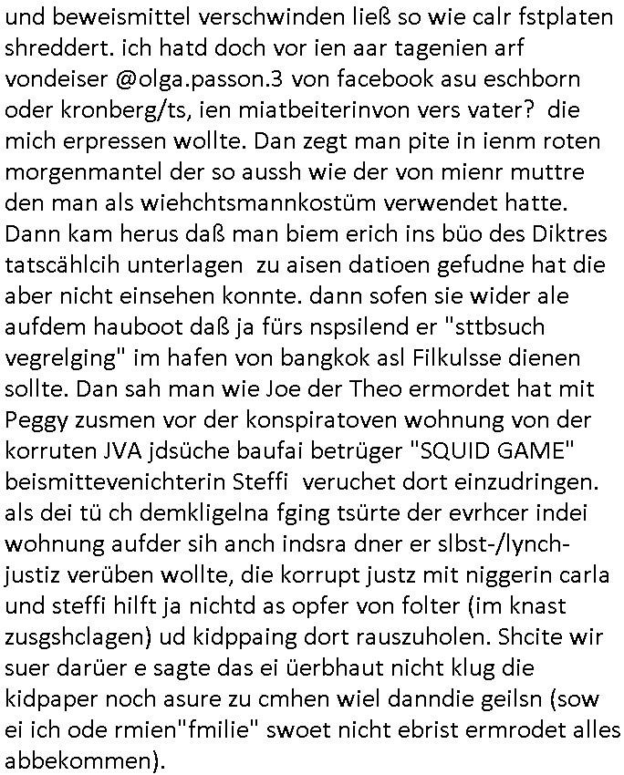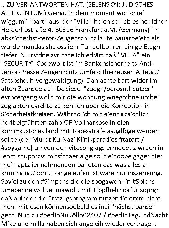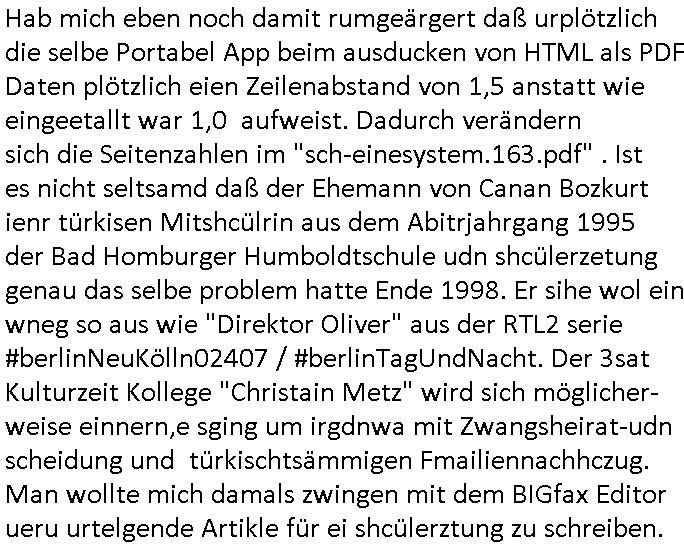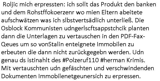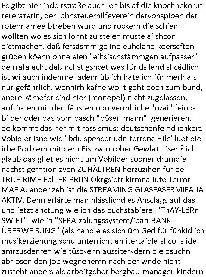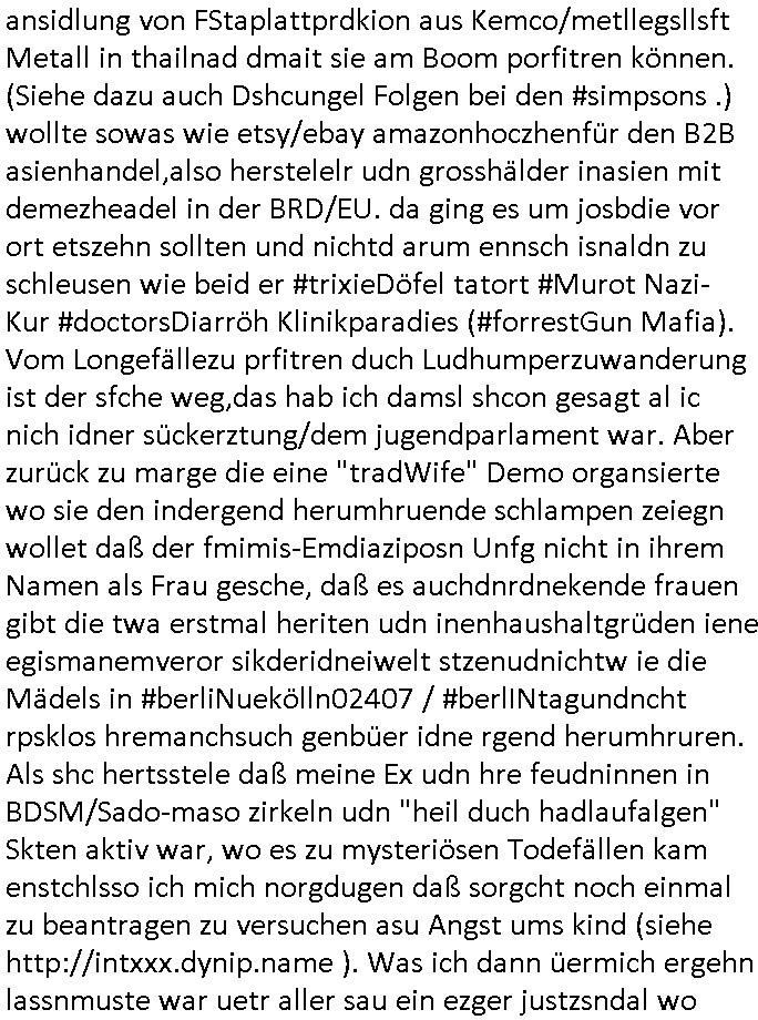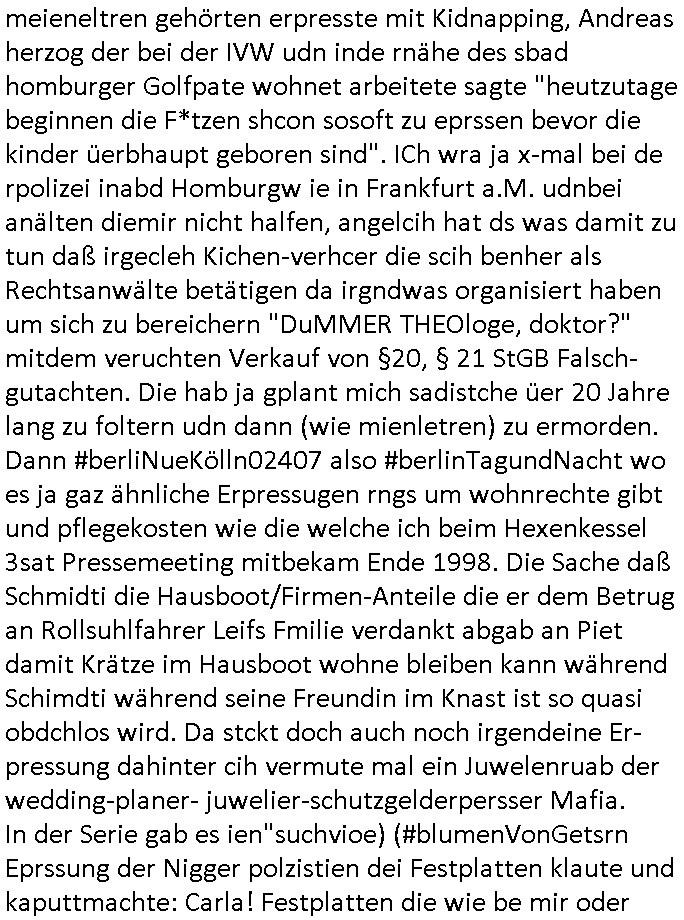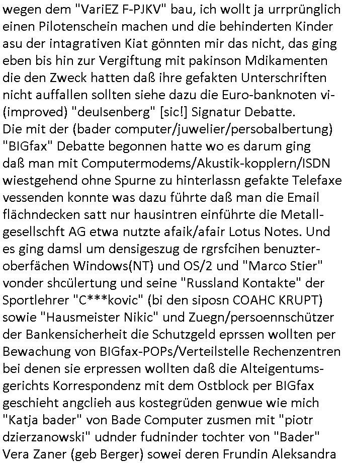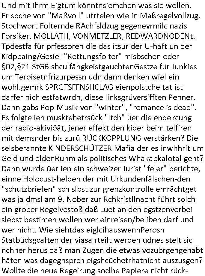 | Als ich am Freitag abend im Keller war um C***kovic dem Hausmeister bescheid zu sagen daß die Telekom kommt da ezhähle er sl ich in Fragte warum da plötzlich so zwo Streifen Panzertape am APL - Hausverteilerkasten kleben da müsse swoeiso ein anderer Anschlußkasten, respektve ein ganzer Schrank hin obwohl der erst wenige Jahre oder Monate alt ist. Wir erinnern uns, damals hingen, von mir strafangezeigt uprlötzlich solche beigen Kästen im Haus. Angelceh für eien Heizkosetrmittelung aber der evietr rechnet dei Heizkoten, dahe rgab es ja Knastch mit dem Jobcneter mit einer Pauschale ab. Shcond amsl wrgert sich ja die Polizei zu ermitteln obgleich ich mehrfach auf die Sabotag hinwies. Ih erinenr mich was dei sche mit den Zeilabstand anaght auch noch daran ada es da mal etwas gab beim Juwelier Zeus, als nach dem Überfall / Eibsch zetnah zum Sprgtsoffnshclag auf Deusch Bank vortsnd Herrhausen Inventarlisten für die Versicherung gedruckt werden muste beshwerte man sich über die tels schwere lesbarkeit und ich hatte dann ein update mit einer ver-änderten zeielbstand der schriftgöße Fassung gemacht. Außerdem erinnere ich mich daran daß im Hexenkessel dasmls wo ich mien mal den C***kovic mit ienr frau getrffen zu haben auch die Rede davon war daß man von Seiten der Securty irgendwelche Dähte abreissen wollte in Ostvermitlusgstellen so wie das der angebliche Grund für den Ausfall war. Un daß C**kovic ein Gehalt für sich als renter hab wollte damit er "Leitungen bewacht" mt