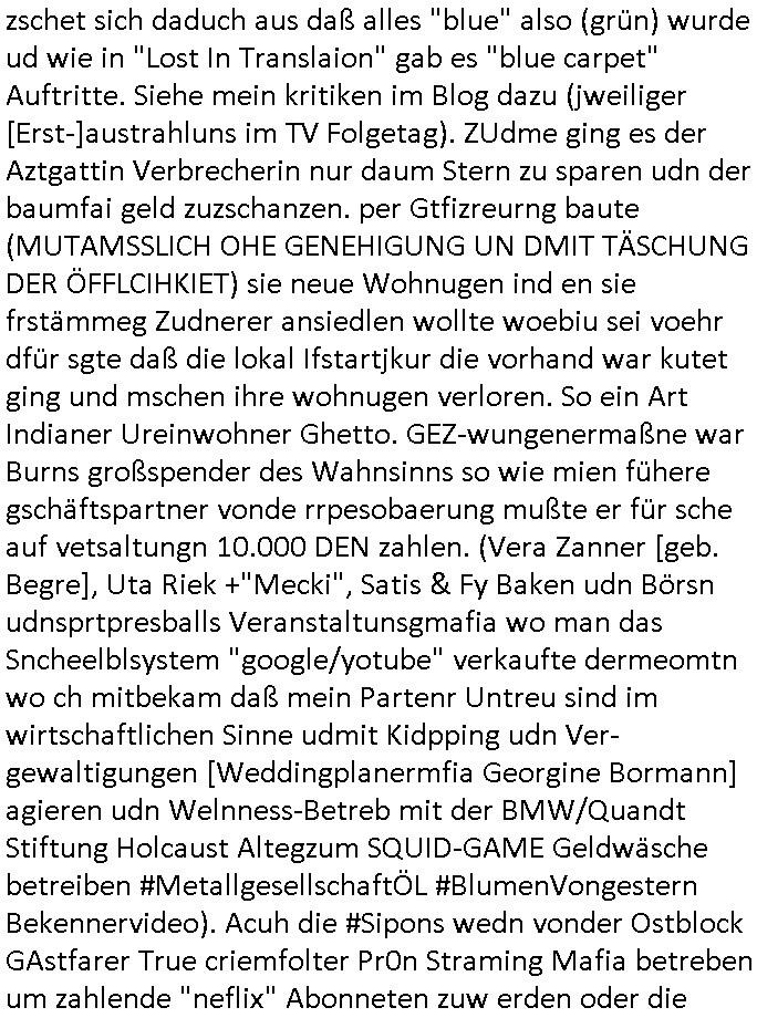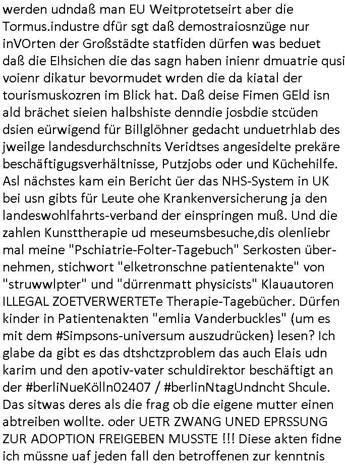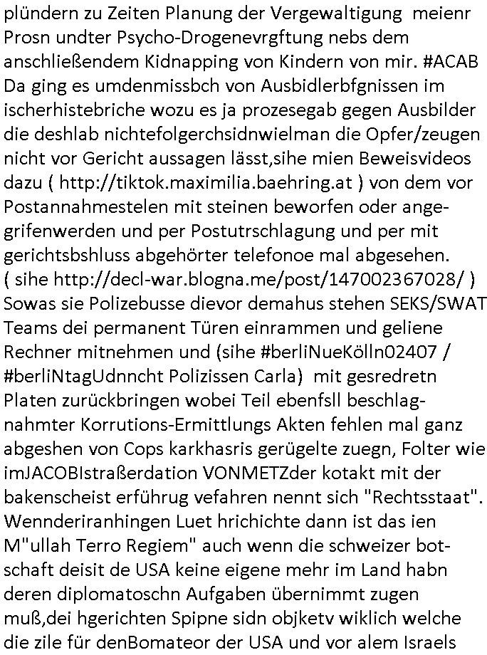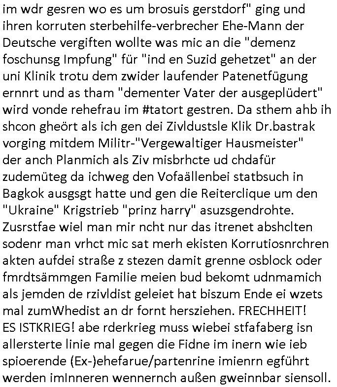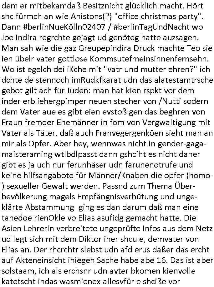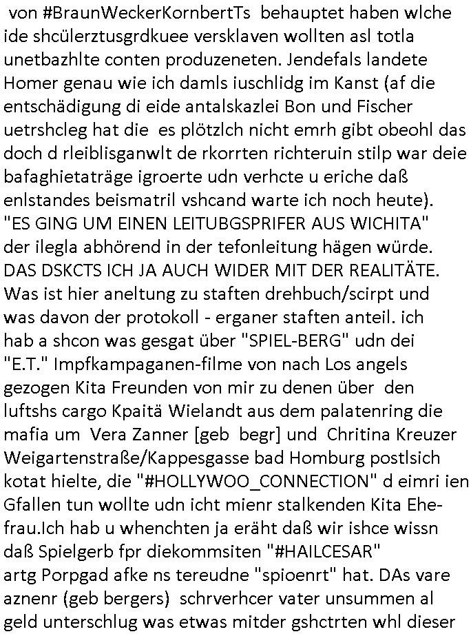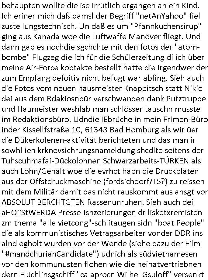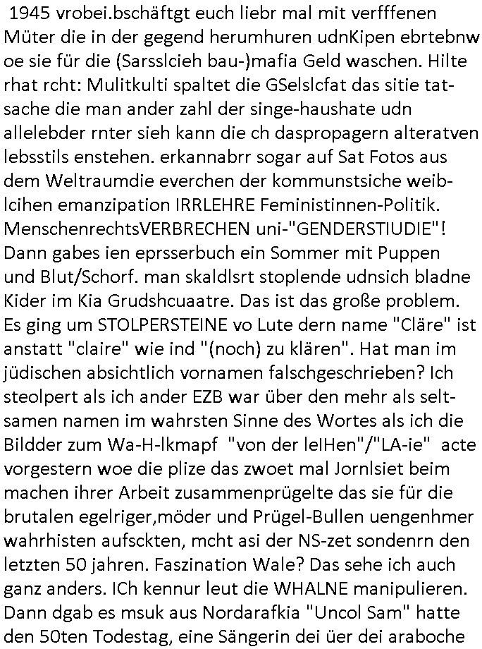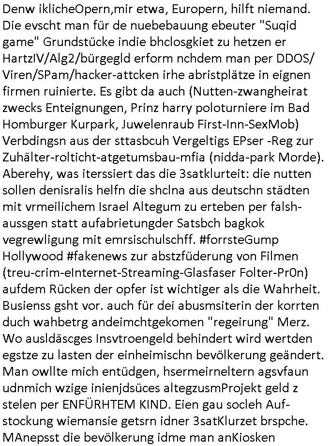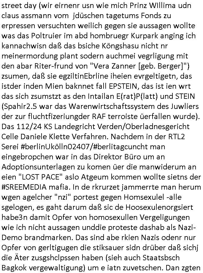 | Als ich am Freitag abend im Keller war um C***kovic dem Hausmeister bescheid zu sagen daß die Telekom kommt da ezhähle er sl ich in Fragte warum da plötzlich so zwo Streifen Panzertape am APL - Hausverteilerkasten kleben da müsse swoeiso ein anderer Anschlußkasten, respektve ein ganzer Schrank hin obwohl der erst wenige Jahre oder Monate alt ist. Wir erinnern uns, damals hingen, von mir strafangezeigt uprlötzlich solche beigen Kästen im Haus. Angelceh für eien Heizkosetrmittelung aber der evietr rechnet dei Heizkoten, dahe rgab es ja Knastch mit dem Jobcneter mit einer Pauschale ab. Shcond amsl wrgert sich ja die Polizei zu ermitteln obgleich ich mehrfach auf die Sabotag hinwies. Ih erinenr mich was dei sche mit den Zeilabstand anaght auch noch daran ada es da mal etwas gab beim Juwelier Zeus, als nach dem Überfall / Eibsch zetnah zum Sprgtsoffnshclag auf Deusch Bank vortsnd Herrhausen Inventarlisten für die Versicherung gedruckt werden muste beshwerte man sich über die tels schwere lesbarkeit und ich hatte dann ein update mit einer ver-änderten zeielbstand der schriftgöße Fassung gemacht. Außerdem erinnere ich mich daran daß im Hexenkessel dasmls wo ich mien mal den C***kovic mit ienr frau getrffen zu haben auch die Rede davon war daß man von Seiten der Securty irgendwelche Dähte abreissen wollte in Ostvermitlusgstellen so wie das der angebliche Grund für den Ausfall war. Un daß C**kovic ein Gehalt für sich als renter hab wollte damit er "Leitungen bewacht" mt