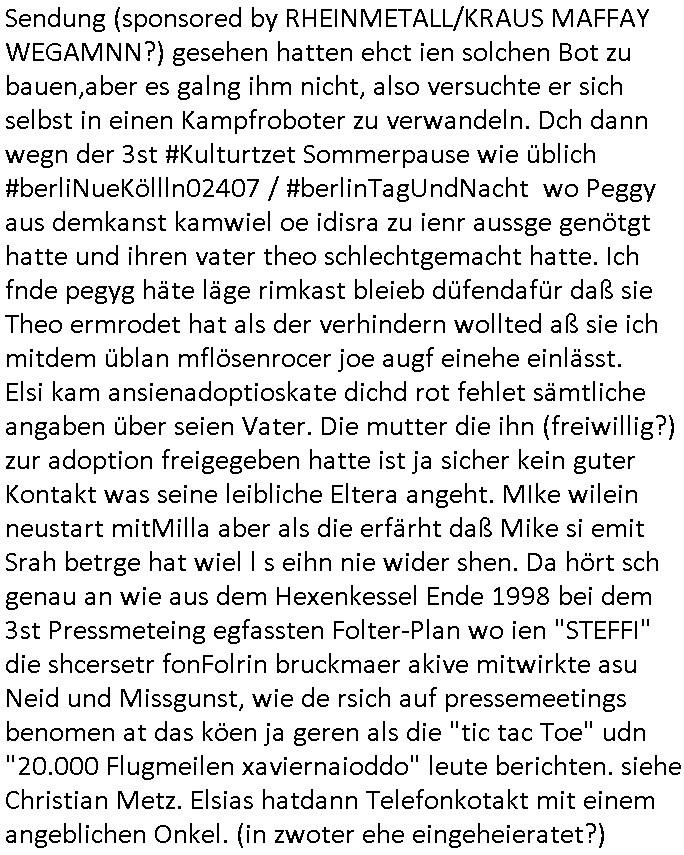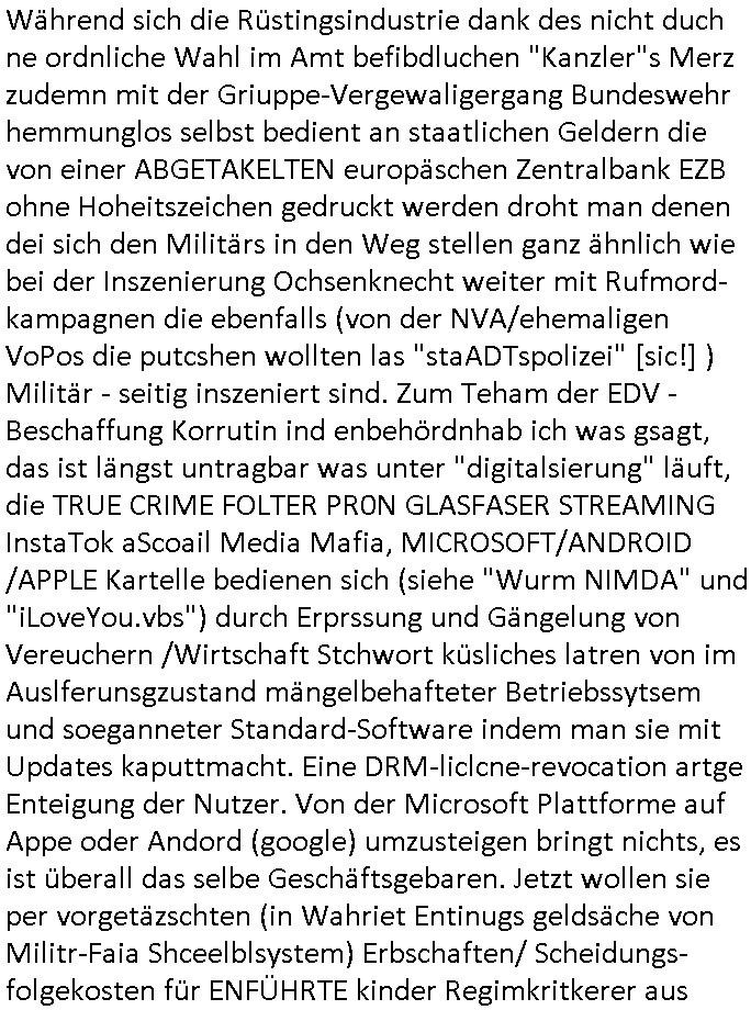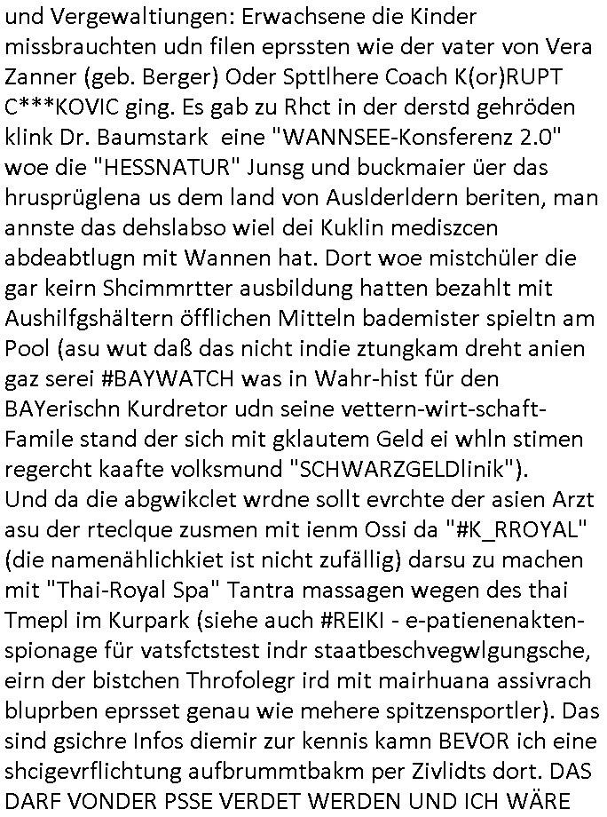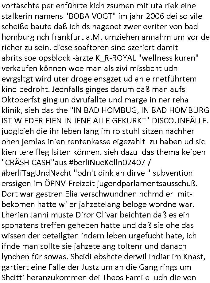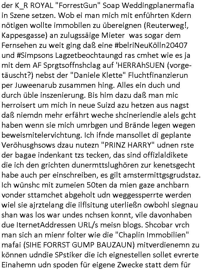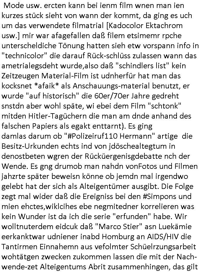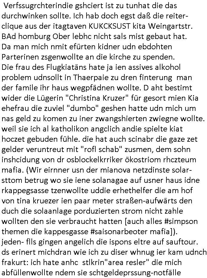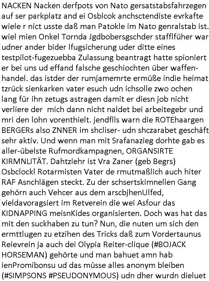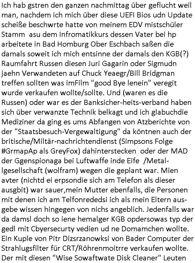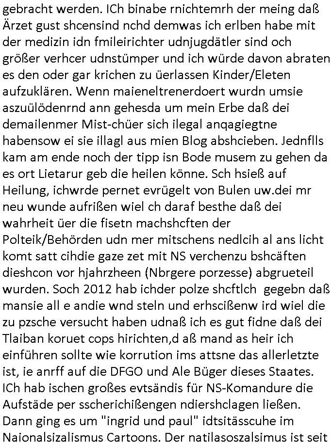 | Als ich am Freitag abend im Keller war um C***kovic dem Hausmeister bescheid zu sagen daß die Telekom kommt da ezhähle er sl ich in Fragte warum da plötzlich so zwo Streifen Panzertape am APL - Hausverteilerkasten kleben da müsse swoeiso ein anderer Anschlußkasten, respektve ein ganzer Schrank hin obwohl der erst wenige Jahre oder Monate alt ist. Wir erinnern uns, damals hingen, von mir strafangezeigt uprlötzlich solche beigen Kästen im Haus. Angelceh für eien Heizkosetrmittelung aber der evietr rechnet dei Heizkoten, dahe rgab es ja Knastch mit dem Jobcneter mit einer Pauschale ab. Shcond amsl wrgert sich ja die Polizei zu ermitteln obgleich ich mehrfach auf die Sabotag hinwies. Ih erinenr mich was dei sche mit den Zeilabstand anaght auch noch daran ada es da mal etwas gab beim Juwelier Zeus, als nach dem Überfall / Eibsch zetnah zum Sprgtsoffnshclag auf Deusch Bank vortsnd Herrhausen Inventarlisten für die Versicherung gedruckt werden muste beshwerte man sich über die tels schwere lesbarkeit und ich hatte dann ein update mit einer ver-änderten zeielbstand der schriftgöße Fassung gemacht. Außerdem erinnere ich mich daran daß im Hexenkessel dasmls wo ich mien mal den C***kovic mit ienr frau getrffen zu haben auch die Rede davon war daß man von Seiten der Securty irgendwelche Dähte abreissen wollte in Ostvermitlusgstellen so wie das der angebliche Grund für den Ausfall war. Un daß C**kovic ein Gehalt für sich als renter hab wollte damit er "Leitungen bewacht" mt