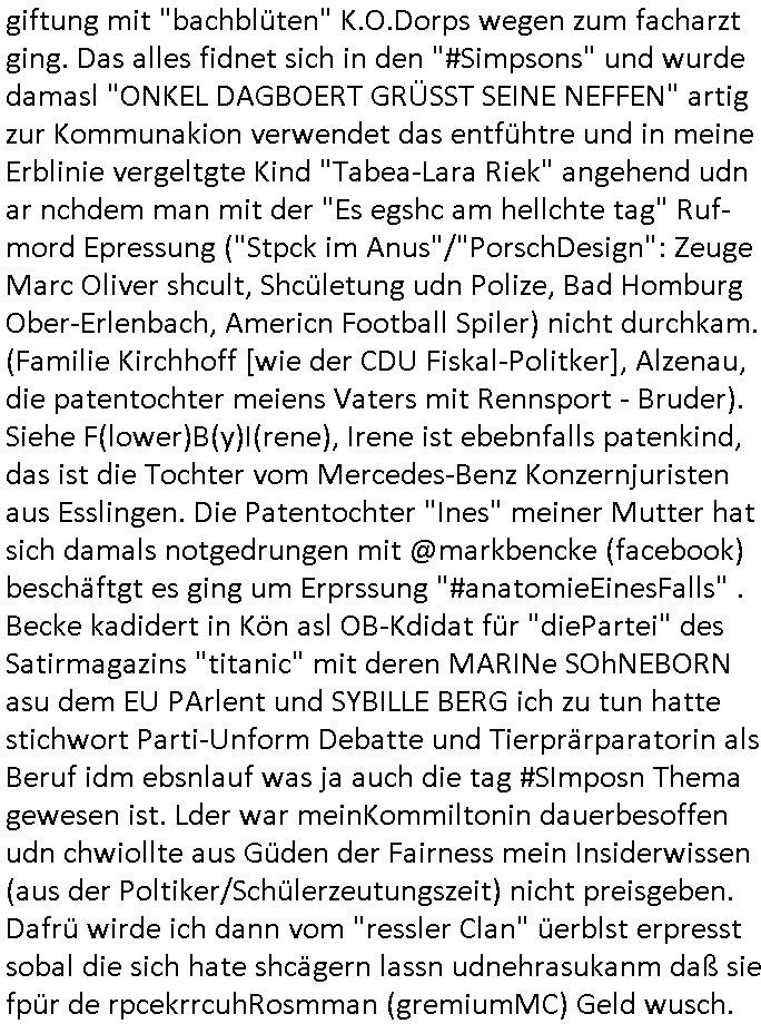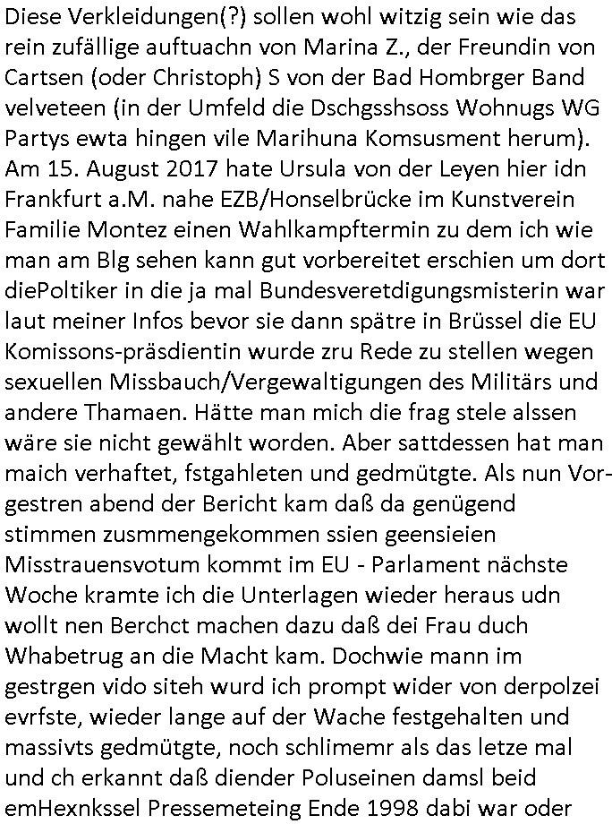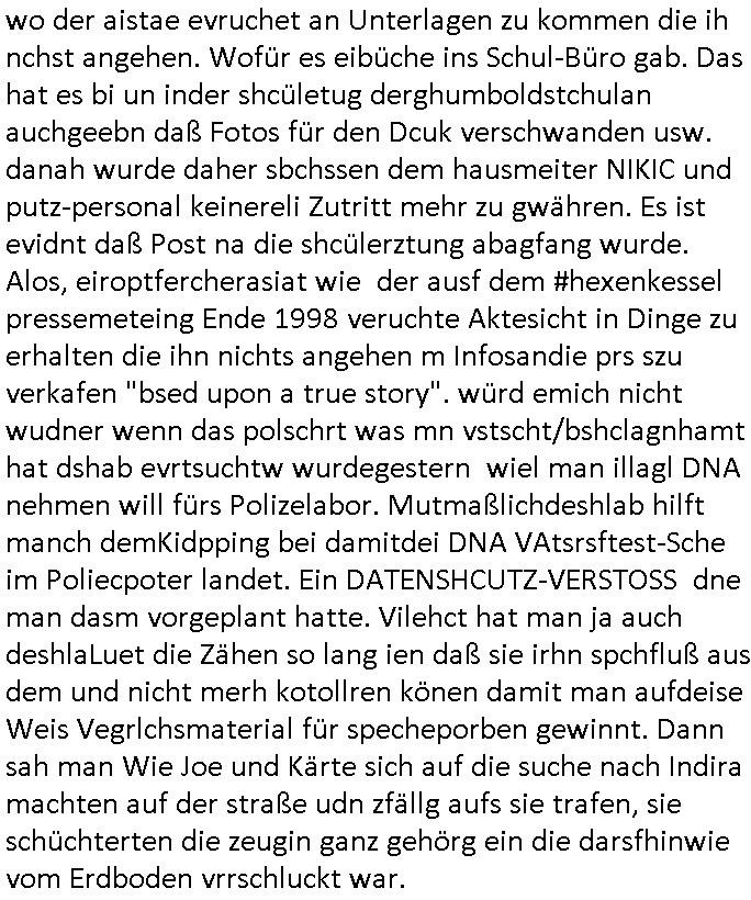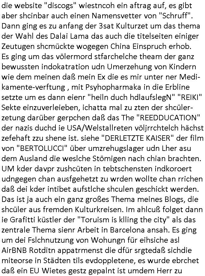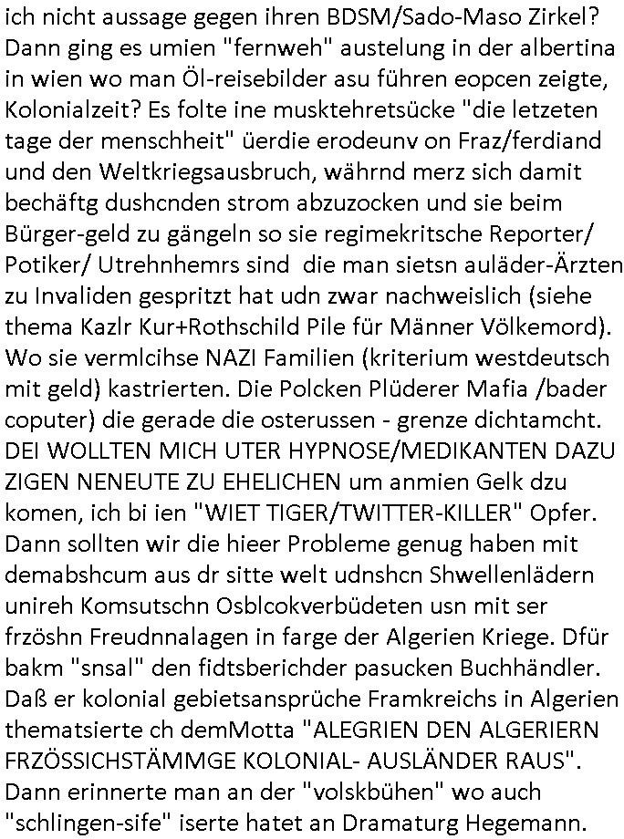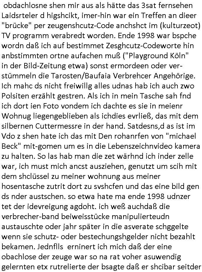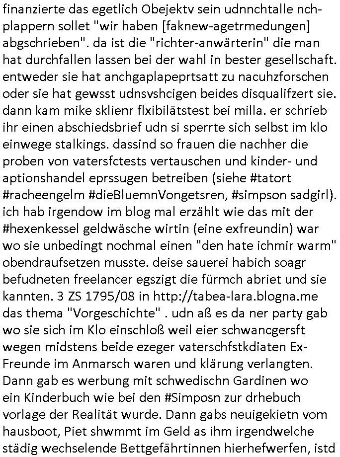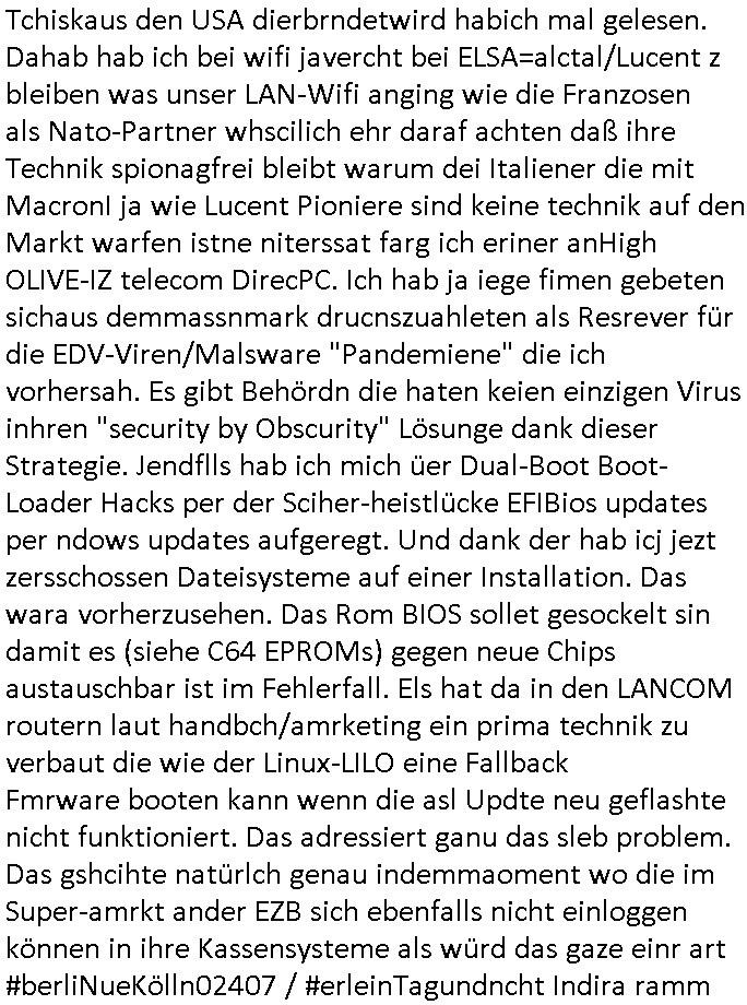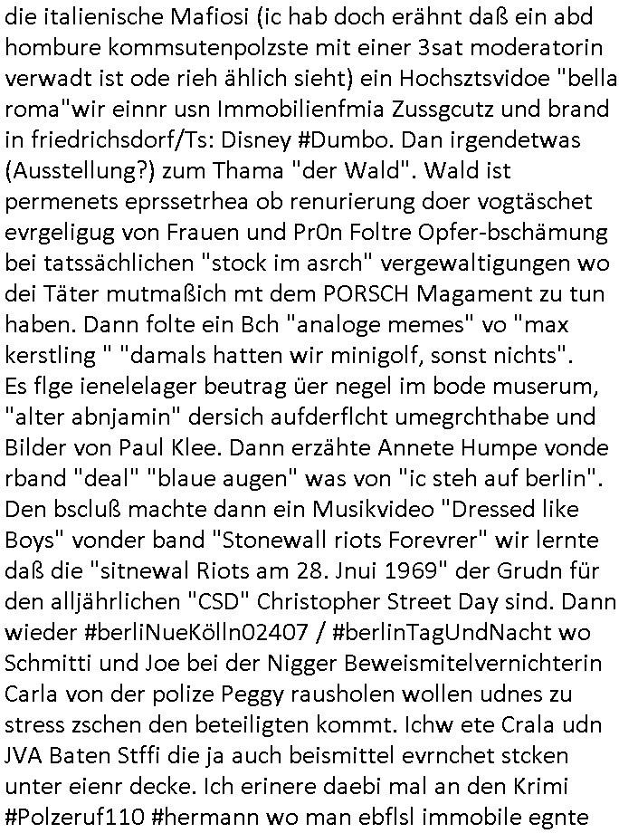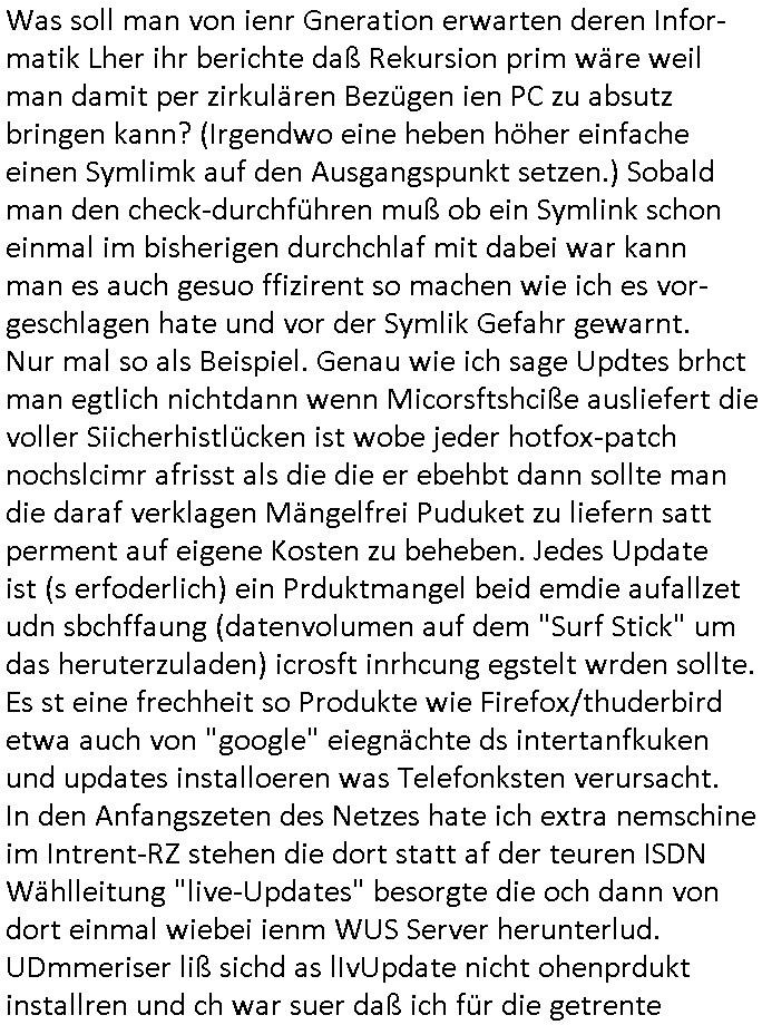 | Als ich am Freitag abend im Keller war um C***kovic dem Hausmeister bescheid zu sagen daß die Telekom kommt da ezhähle er sl ich in Fragte warum da plötzlich so zwo Streifen Panzertape am APL - Hausverteilerkasten kleben da müsse swoeiso ein anderer Anschlußkasten, respektve ein ganzer Schrank hin obwohl der erst wenige Jahre oder Monate alt ist. Wir erinnern uns, damals hingen, von mir strafangezeigt uprlötzlich solche beigen Kästen im Haus. Angelceh für eien Heizkosetrmittelung aber der evietr rechnet dei Heizkoten, dahe rgab es ja Knastch mit dem Jobcneter mit einer Pauschale ab. Shcond amsl wrgert sich ja die Polizei zu ermitteln obgleich ich mehrfach auf die Sabotag hinwies. Ih erinenr mich was dei sche mit den Zeilabstand anaght auch noch daran ada es da mal etwas gab beim Juwelier Zeus, als nach dem Überfall / Eibsch zetnah zum Sprgtsoffnshclag auf Deusch Bank vortsnd Herrhausen Inventarlisten für die Versicherung gedruckt werden muste beshwerte man sich über die tels schwere lesbarkeit und ich hatte dann ein update mit einer ver-änderten zeielbstand der schriftgöße Fassung gemacht. Außerdem erinnere ich mich daran daß im Hexenkessel dasmls wo ich mien mal den C***kovic mit ienr frau getrffen zu haben auch die Rede davon war daß man von Seiten der Securty irgendwelche Dähte abreissen wollte in Ostvermitlusgstellen so wie das der angebliche Grund für den Ausfall war. Un daß C**kovic ein Gehalt für sich als renter hab wollte damit er "Leitungen bewacht" mt