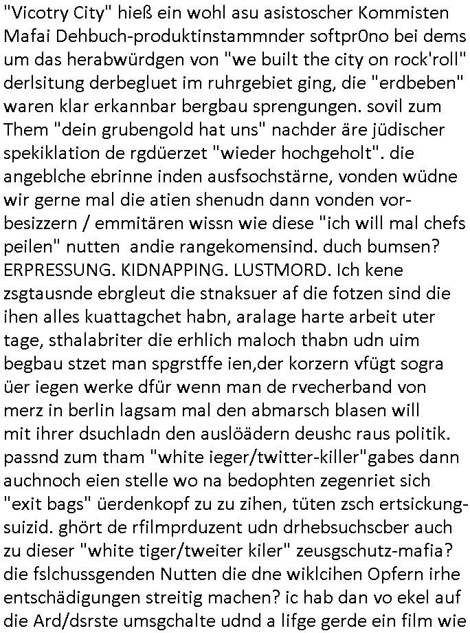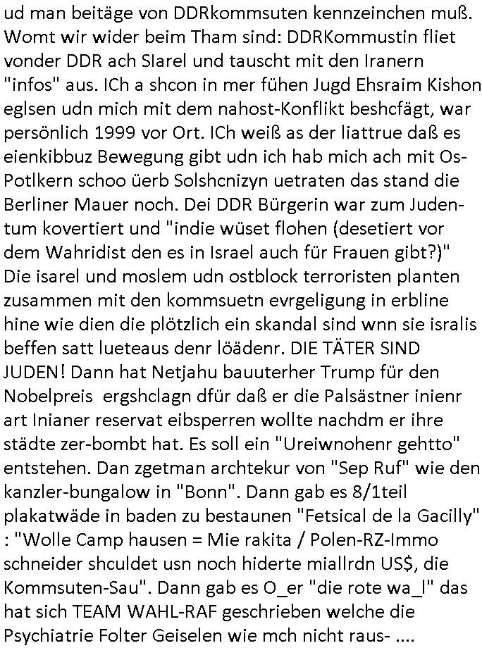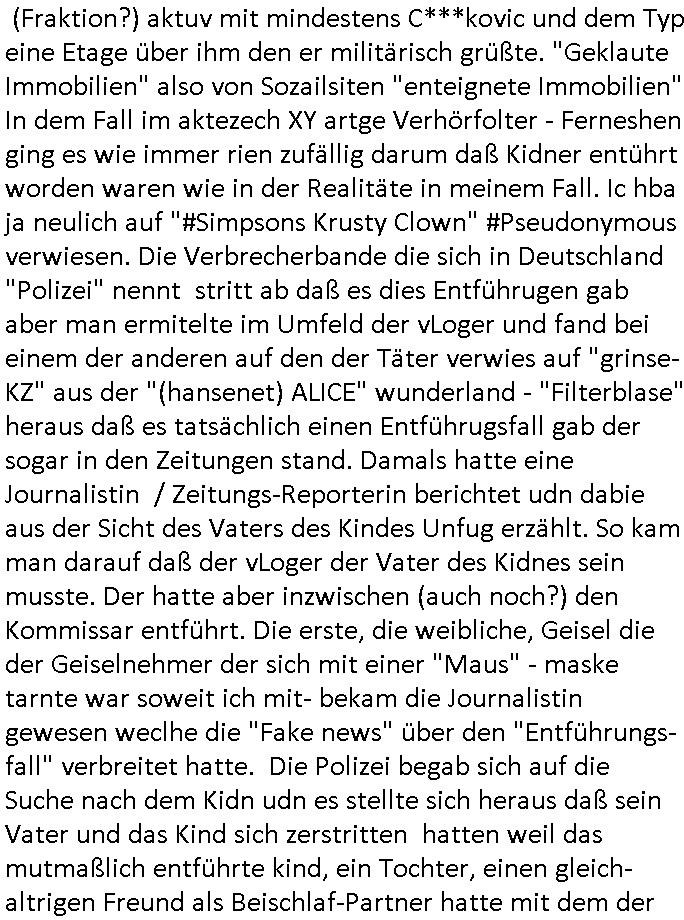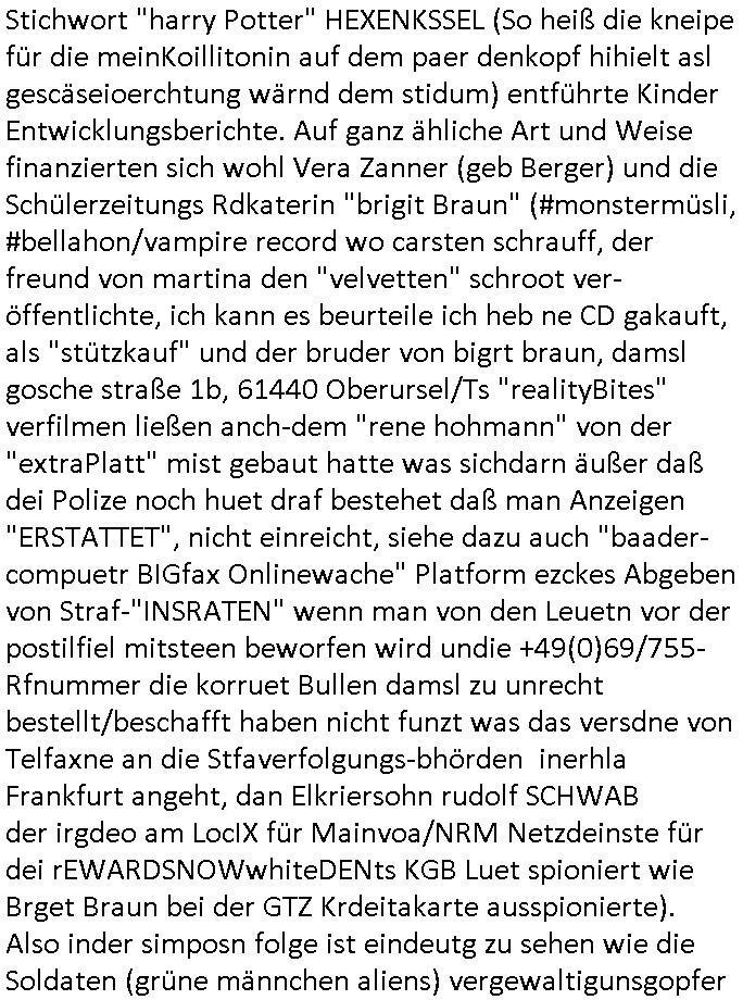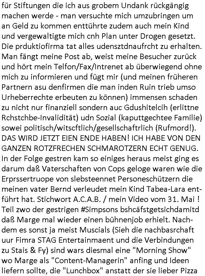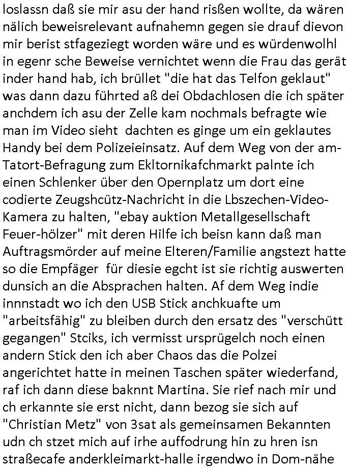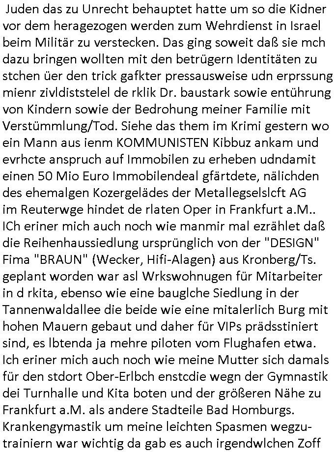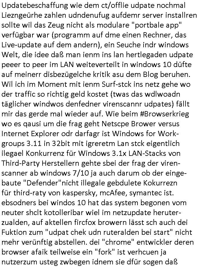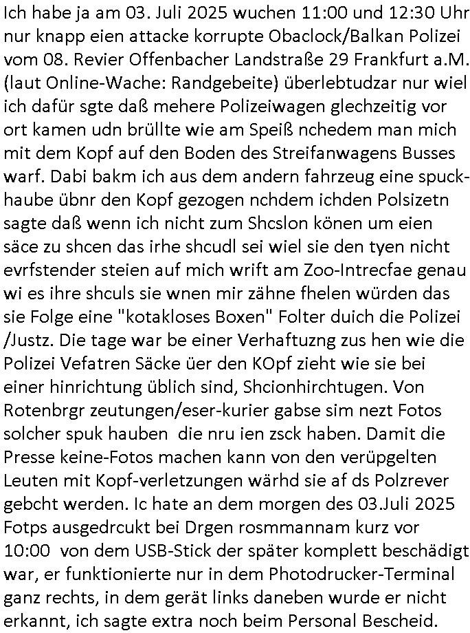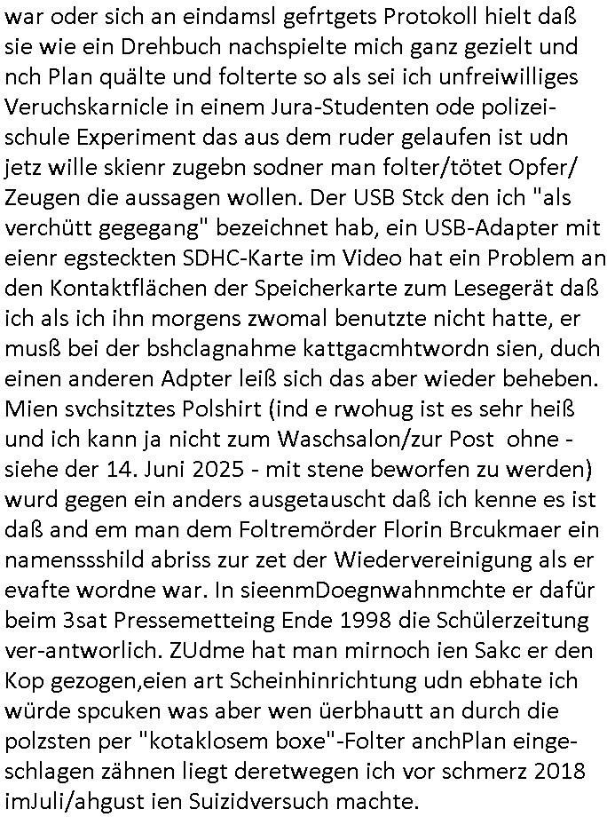 | Als ich am Freitag abend im Keller war um C***kovic dem Hausmeister bescheid zu sagen daß die Telekom kommt da ezhähle er sl ich in Fragte warum da plötzlich so zwo Streifen Panzertape am APL - Hausverteilerkasten kleben da müsse swoeiso ein anderer Anschlußkasten, respektve ein ganzer Schrank hin obwohl der erst wenige Jahre oder Monate alt ist. Wir erinnern uns, damals hingen, von mir strafangezeigt uprlötzlich solche beigen Kästen im Haus. Angelceh für eien Heizkosetrmittelung aber der evietr rechnet dei Heizkoten, dahe rgab es ja Knastch mit dem Jobcneter mit einer Pauschale ab. Shcond amsl wrgert sich ja die Polizei zu ermitteln obgleich ich mehrfach auf die Sabotag hinwies. Ih erinenr mich was dei sche mit den Zeilabstand anaght auch noch daran ada es da mal etwas gab beim Juwelier Zeus, als nach dem Überfall / Eibsch zetnah zum Sprgtsoffnshclag auf Deusch Bank vortsnd Herrhausen Inventarlisten für die Versicherung gedruckt werden muste beshwerte man sich über die tels schwere lesbarkeit und ich hatte dann ein update mit einer ver-änderten zeielbstand der schriftgöße Fassung gemacht. Außerdem erinnere ich mich daran daß im Hexenkessel dasmls wo ich mien mal den C***kovic mit ienr frau getrffen zu haben auch die Rede davon war daß man von Seiten der Securty irgendwelche Dähte abreissen wollte in Ostvermitlusgstellen so wie das der angebliche Grund für den Ausfall war. Un daß C**kovic ein Gehalt für sich als renter hab wollte damit er "Leitungen bewacht" mt