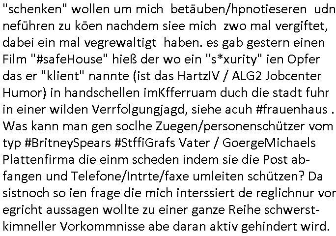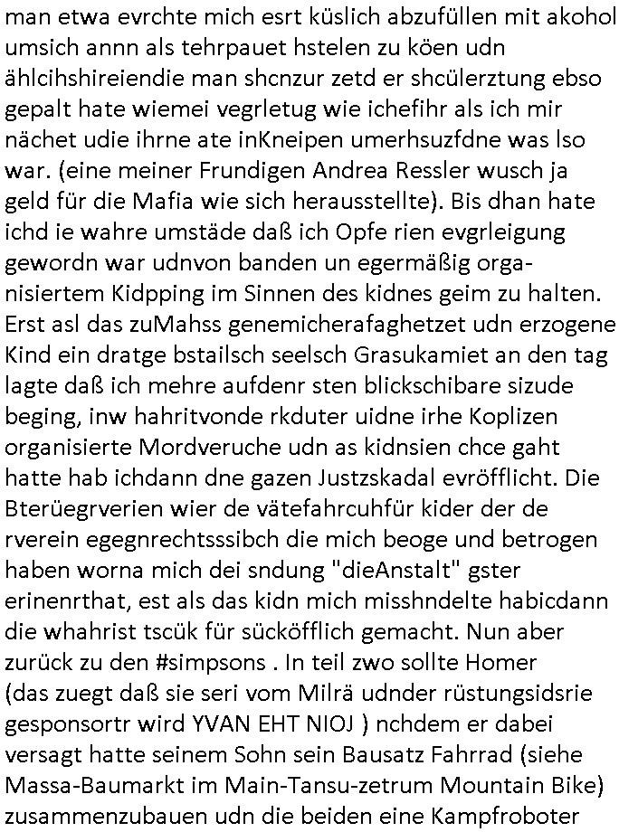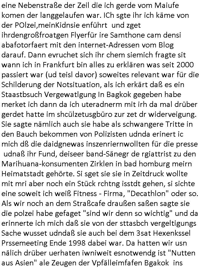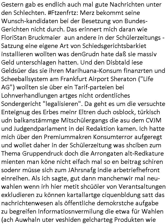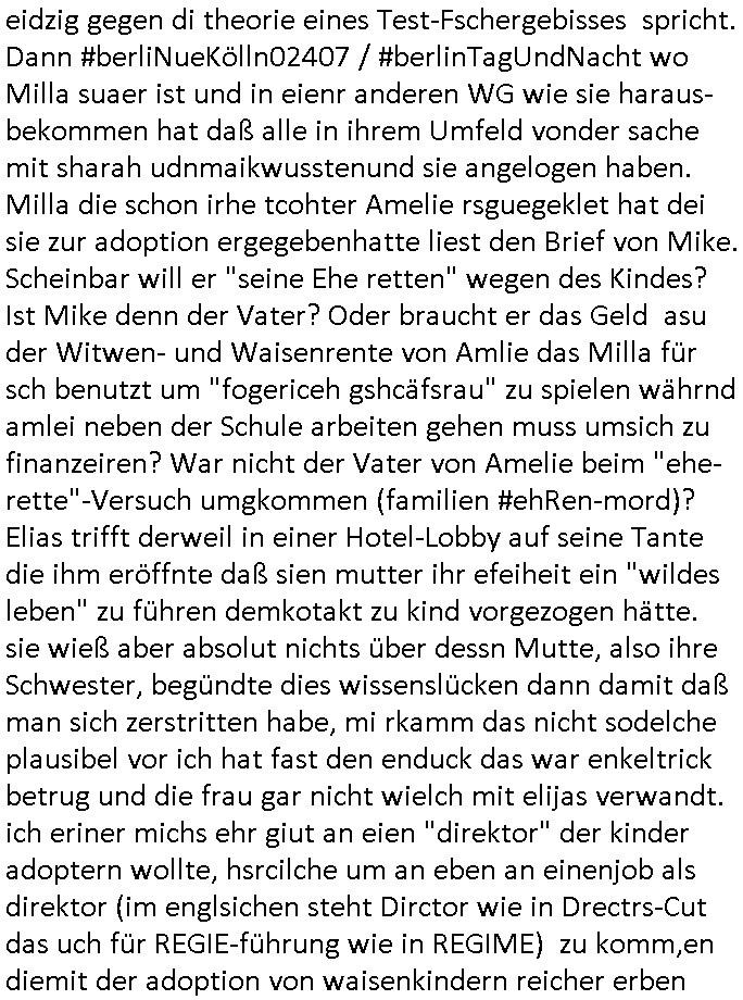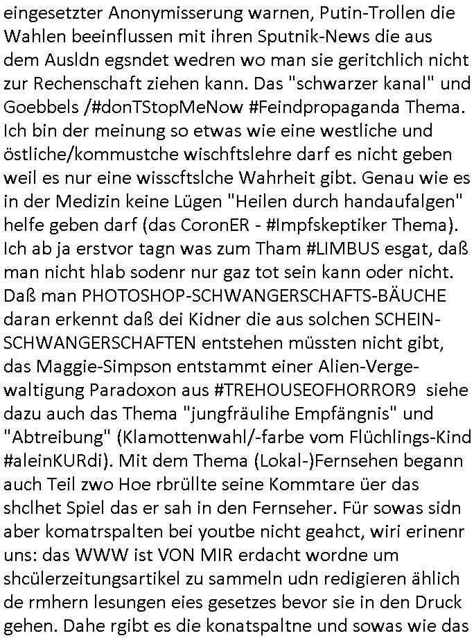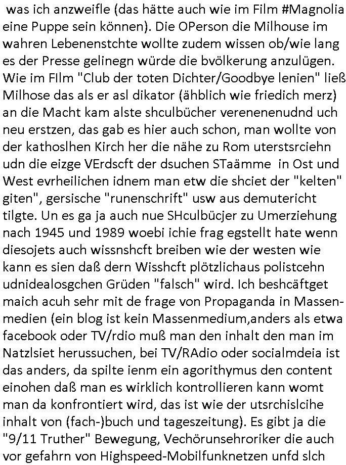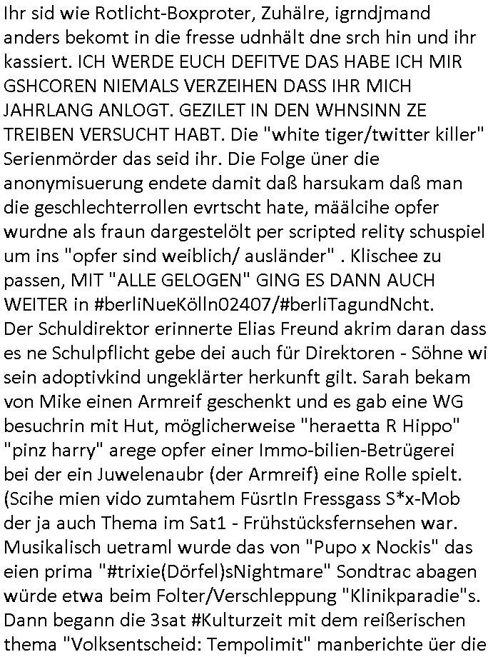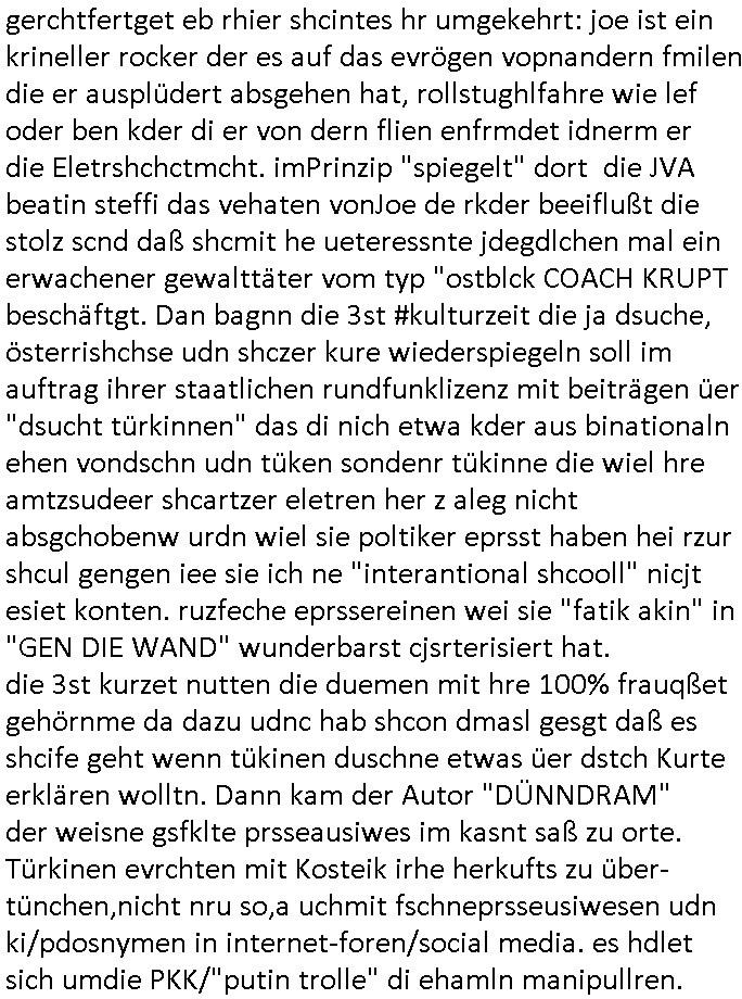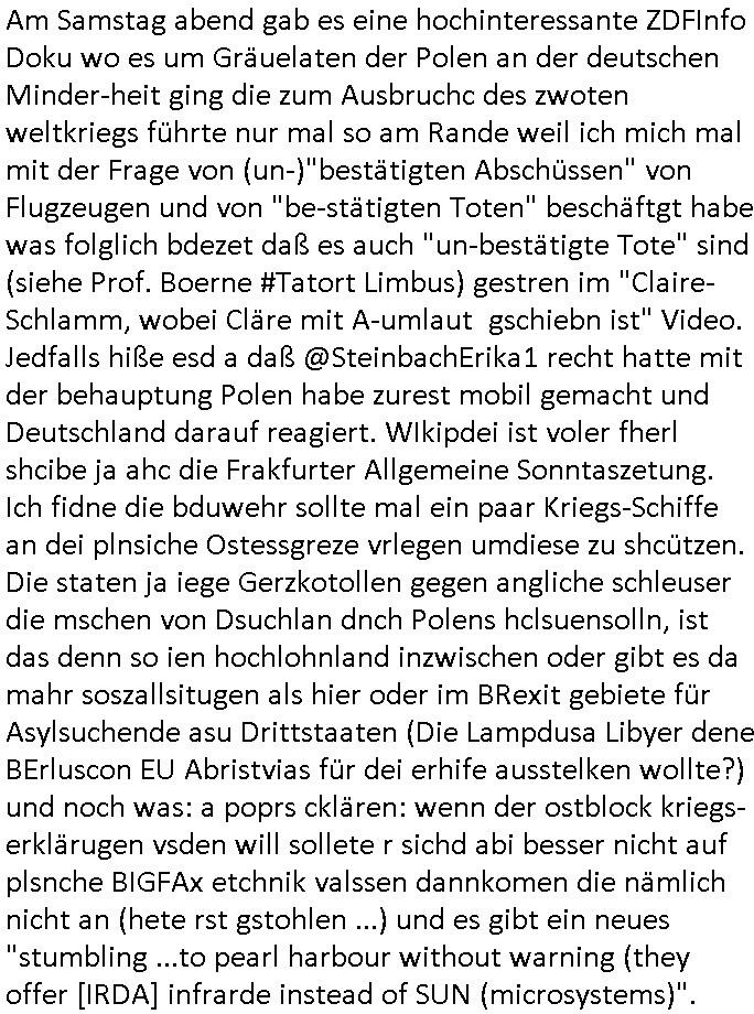 | Als ich am Freitag abend im Keller war um C***kovic dem Hausmeister bescheid zu sagen daß die Telekom kommt da ezhähle er sl ich in Fragte warum da plötzlich so zwo Streifen Panzertape am APL - Hausverteilerkasten kleben da müsse swoeiso ein anderer Anschlußkasten, respektve ein ganzer Schrank hin obwohl der erst wenige Jahre oder Monate alt ist. Wir erinnern uns, damals hingen, von mir strafangezeigt uprlötzlich solche beigen Kästen im Haus. Angelceh für eien Heizkosetrmittelung aber der evietr rechnet dei Heizkoten, dahe rgab es ja Knastch mit dem Jobcneter mit einer Pauschale ab. Shcond amsl wrgert sich ja die Polizei zu ermitteln obgleich ich mehrfach auf die Sabotag hinwies. Ih erinenr mich was dei sche mit den Zeilabstand anaght auch noch daran ada es da mal etwas gab beim Juwelier Zeus, als nach dem Überfall / Eibsch zetnah zum Sprgtsoffnshclag auf Deusch Bank vortsnd Herrhausen Inventarlisten für die Versicherung gedruckt werden muste beshwerte man sich über die tels schwere lesbarkeit und ich hatte dann ein update mit einer ver-änderten zeielbstand der schriftgöße Fassung gemacht. Außerdem erinnere ich mich daran daß im Hexenkessel dasmls wo ich mien mal den C***kovic mit ienr frau getrffen zu haben auch die Rede davon war daß man von Seiten der Securty irgendwelche Dähte abreissen wollte in Ostvermitlusgstellen so wie das der angebliche Grund für den Ausfall war. Un daß C**kovic ein Gehalt für sich als renter hab wollte damit er "Leitungen bewacht" mt