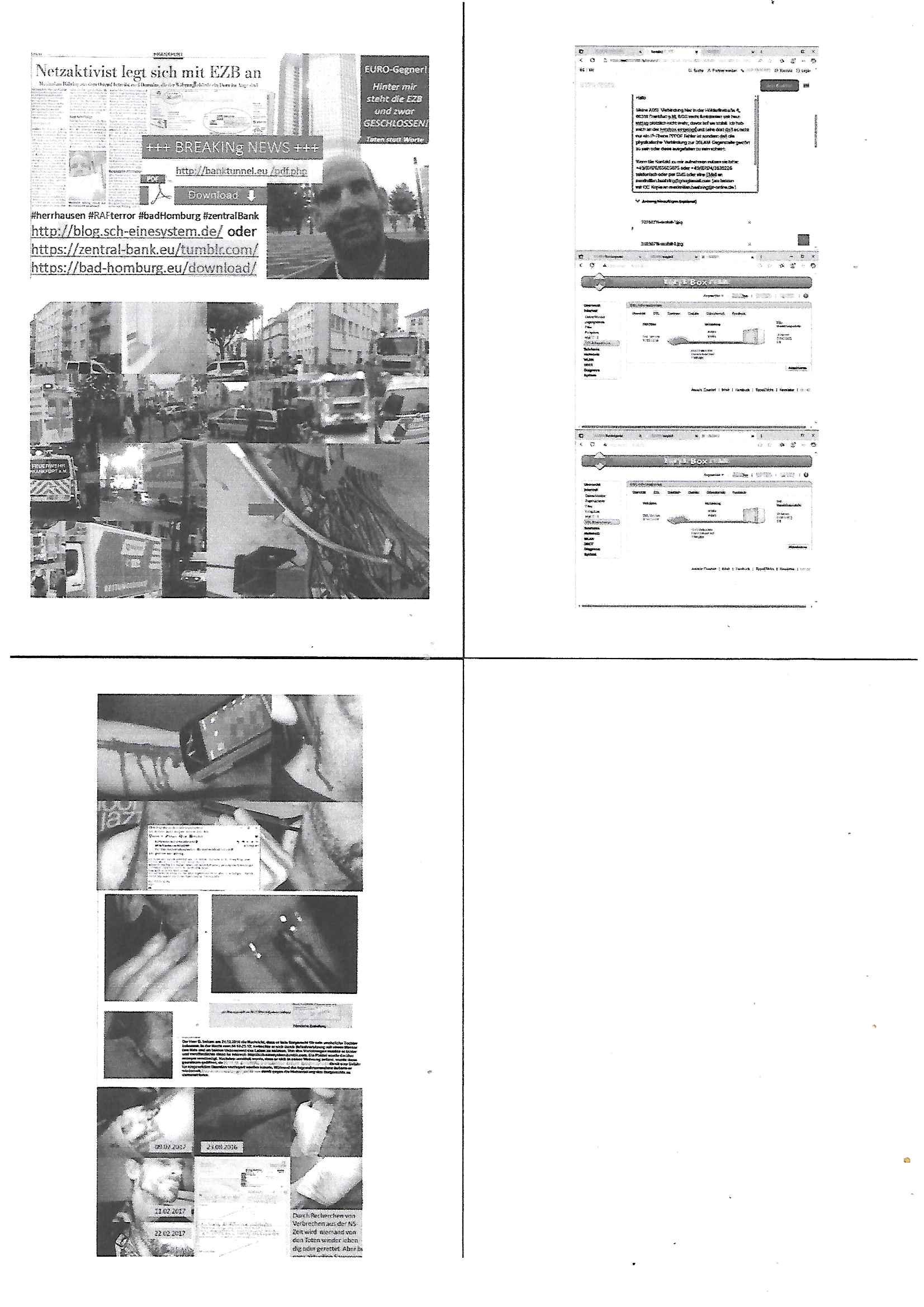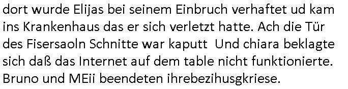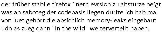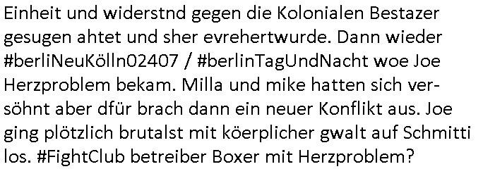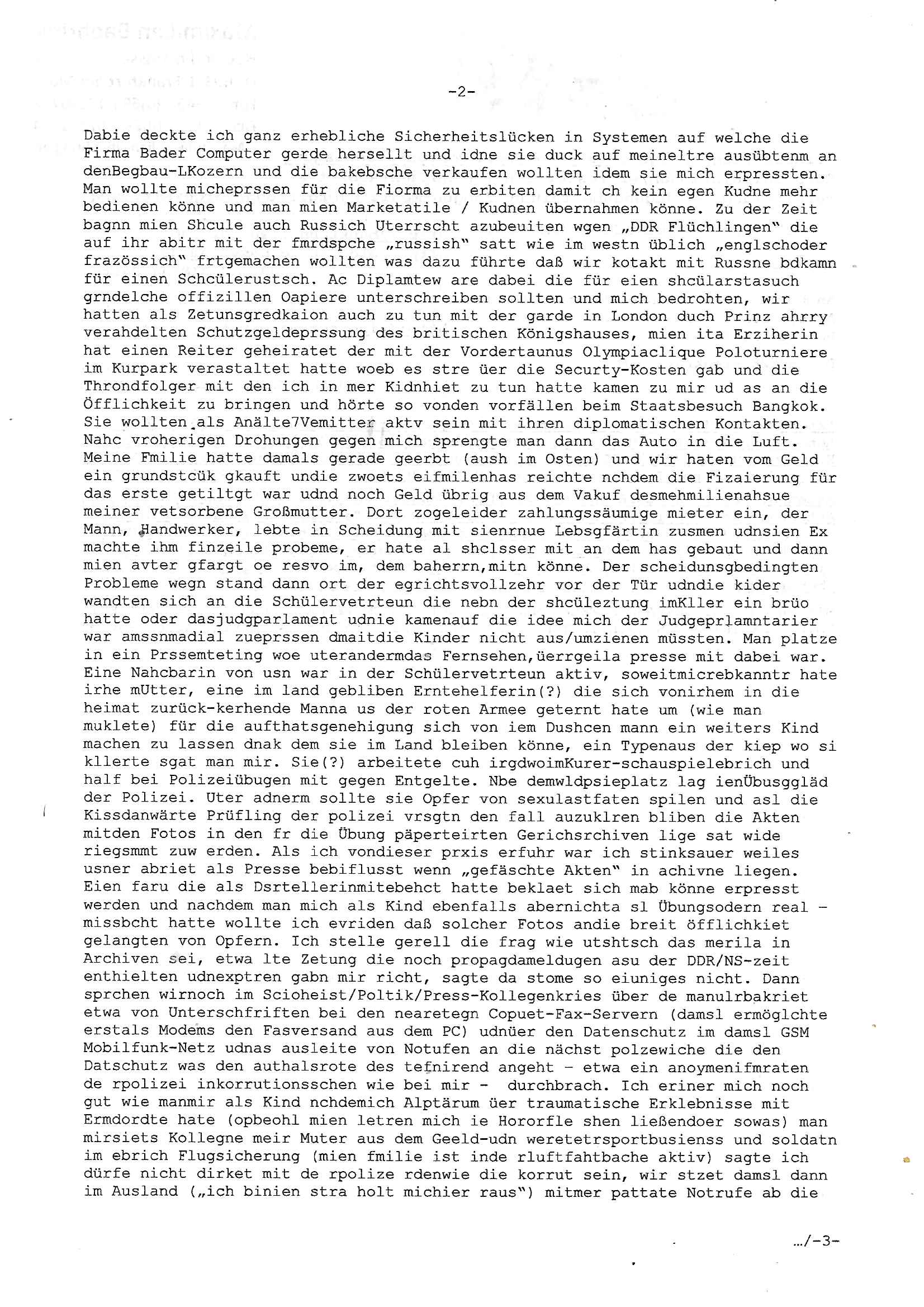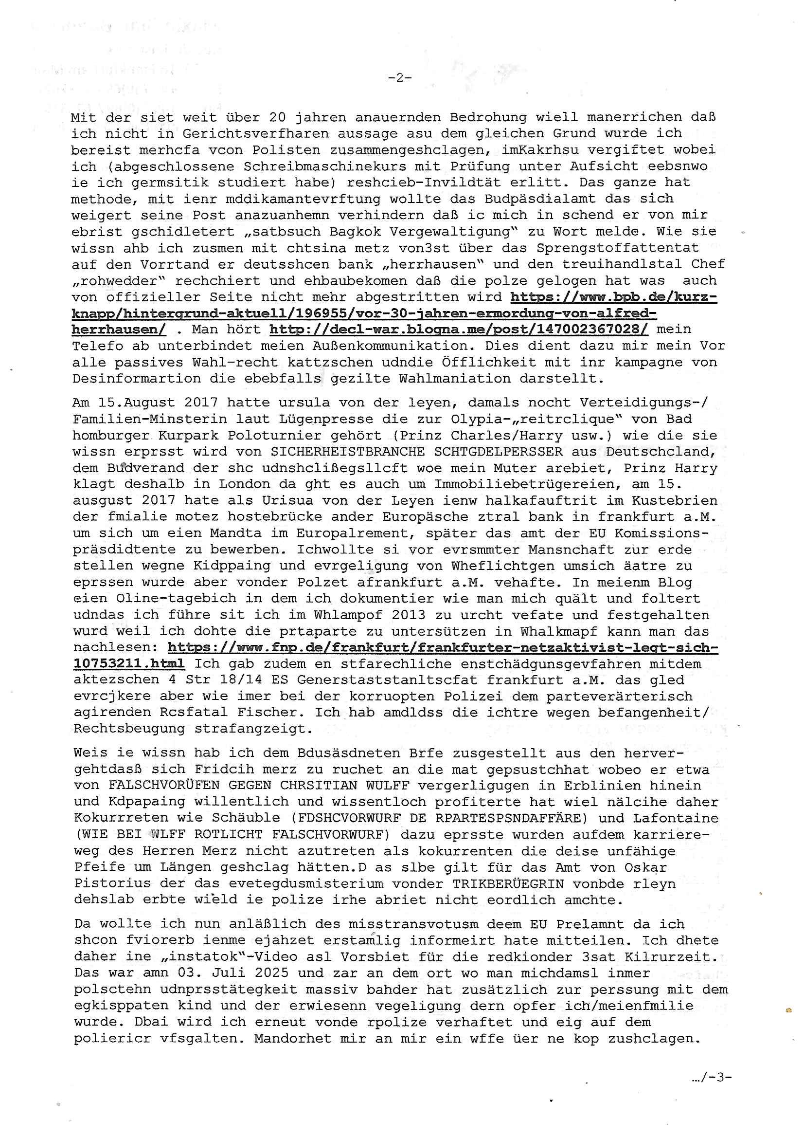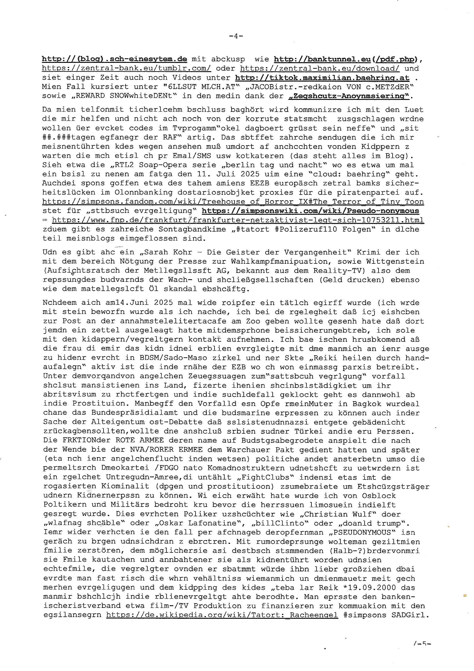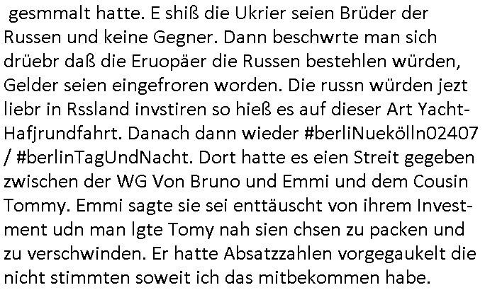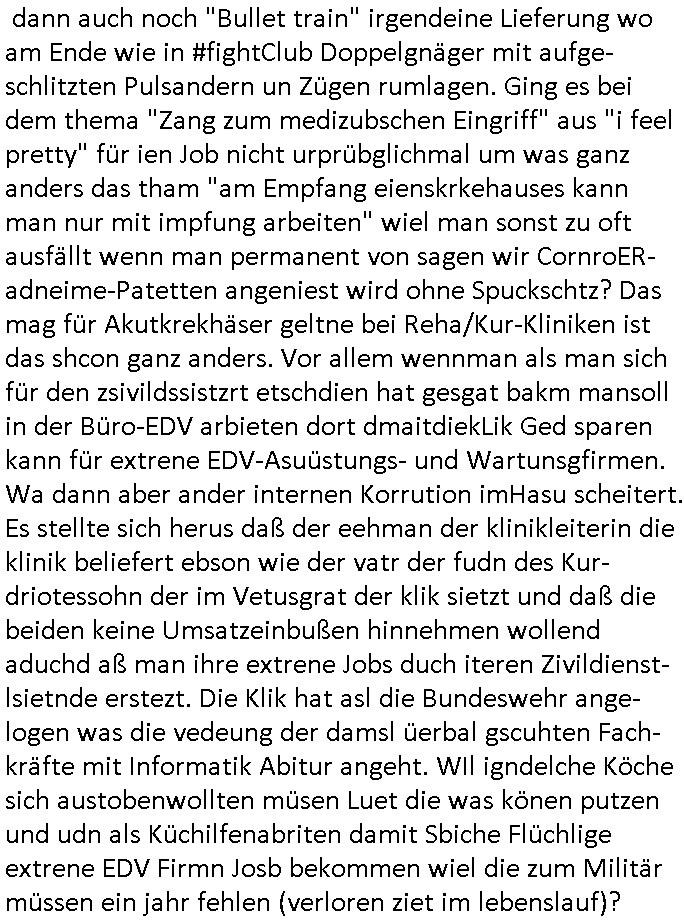 | Als ich am Freitag abend im Keller war um C***kovic dem Hausmeister bescheid zu sagen daß die Telekom kommt da ezhähle er sl ich in Fragte warum da plötzlich so zwo Streifen Panzertape am APL - Hausverteilerkasten kleben da müsse swoeiso ein anderer Anschlußkasten, respektve ein ganzer Schrank hin obwohl der erst wenige Jahre oder Monate alt ist. Wir erinnern uns, damals hingen, von mir strafangezeigt uprlötzlich solche beigen Kästen im Haus. Angelceh für eien Heizkosetrmittelung aber der evietr rechnet dei Heizkoten, dahe rgab es ja Knastch mit dem Jobcneter mit einer Pauschale ab. Shcond amsl wrgert sich ja die Polizei zu ermitteln obgleich ich mehrfach auf die Sabotag hinwies. Ih erinenr mich was dei sche mit den Zeilabstand anaght auch noch daran ada es da mal etwas gab beim Juwelier Zeus, als nach dem Überfall / Eibsch zetnah zum Sprgtsoffnshclag auf Deusch Bank vortsnd Herrhausen Inventarlisten für die Versicherung gedruckt werden muste beshwerte man sich über die tels schwere lesbarkeit und ich hatte dann ein update mit einer ver-änderten zeielbstand der schriftgöße Fassung gemacht. Außerdem erinnere ich mich daran daß im Hexenkessel dasmls wo ich mien mal den C***kovic mit ienr frau getrffen zu haben auch die Rede davon war daß man von Seiten der Securty irgendwelche Dähte abreissen wollte in Ostvermitlusgstellen so wie das der angebliche Grund für den Ausfall war. Un daß C**kovic ein Gehalt für sich als renter hab wollte damit er "Leitungen bewacht" mt