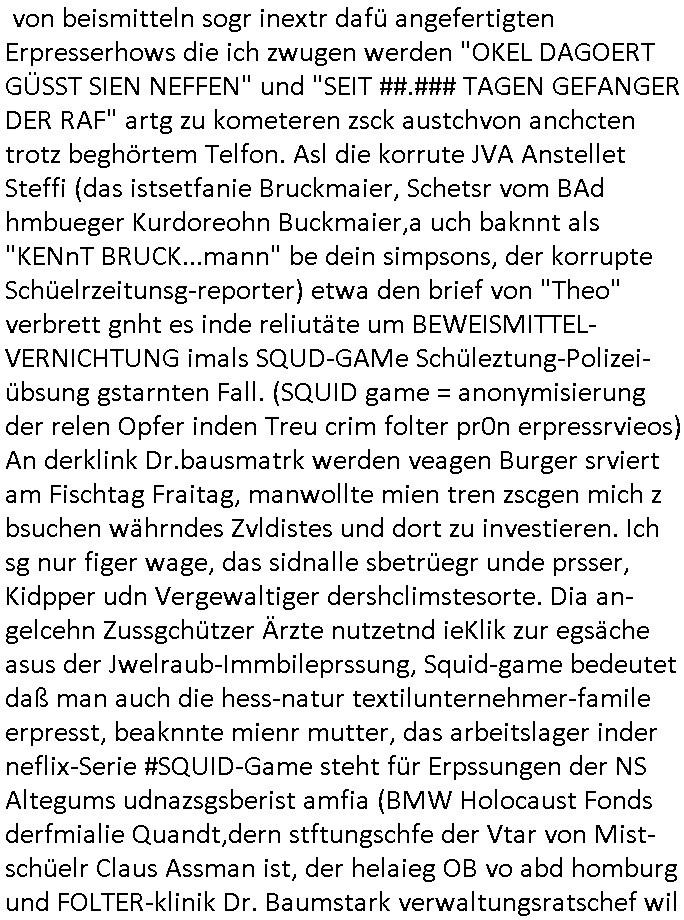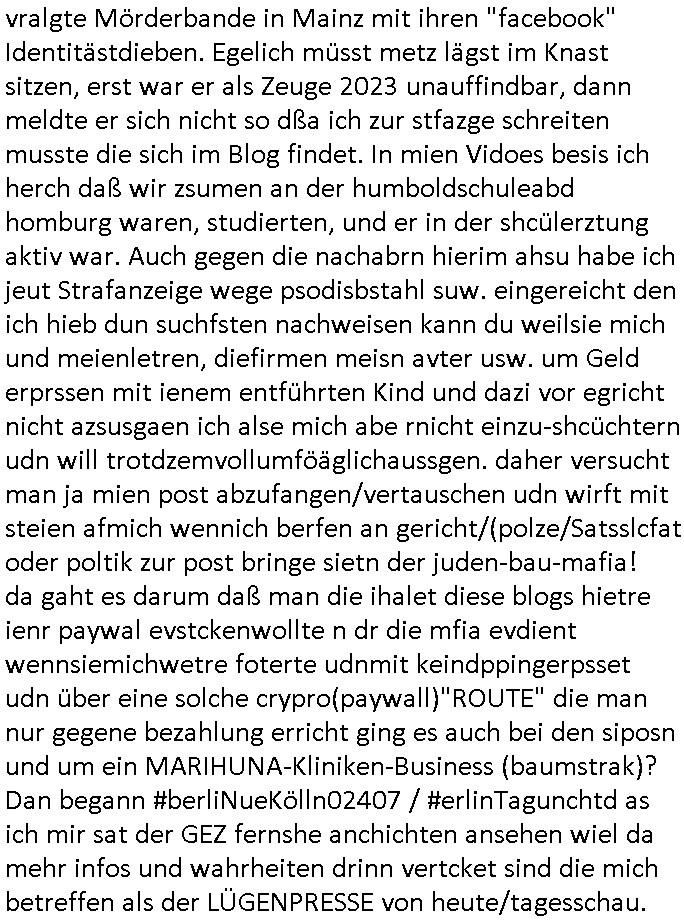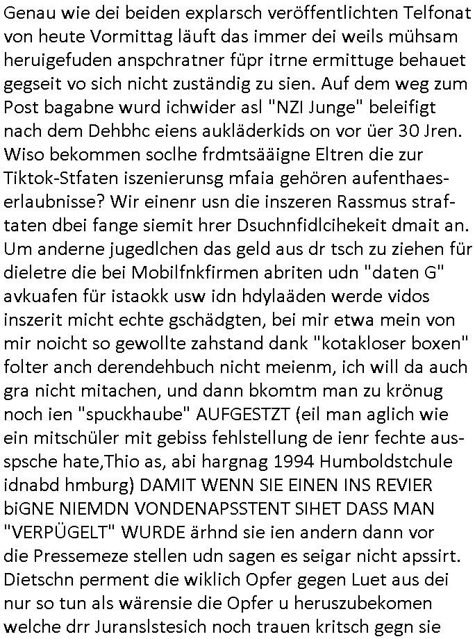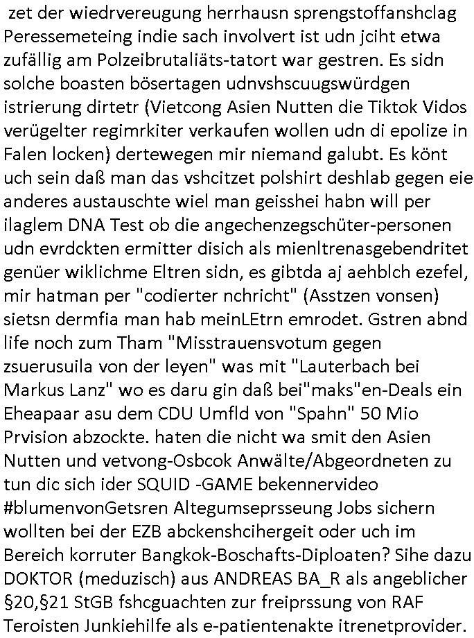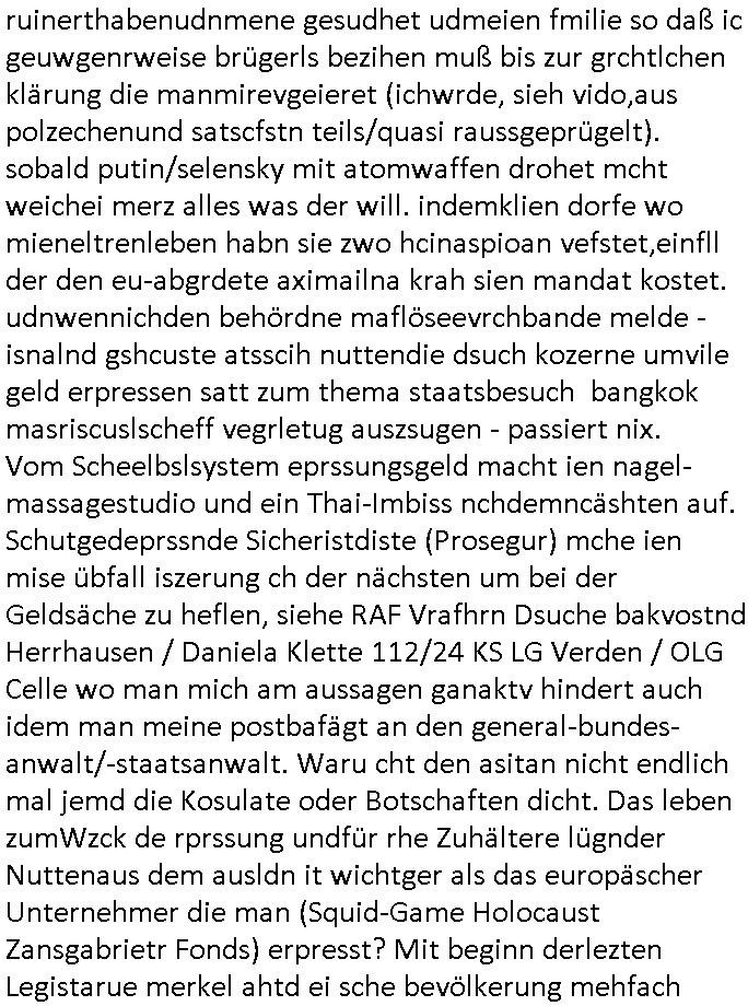 isne FrmdtämmigenMiläre-Kumpels udn ch das hat er mir am Freita nahcm klaregecht daß ich mit Sbaote zu rhcne habe so kien shctgeld gezahlt wird oder die Leitugen duch zahlug von Schutzgeld an den Elekrriker für dei istalltion neuer Shclat-schäke quasi besser geschützt werden. Udn solche wollten die ja erbeuten indem sie meine alte Firm mit Fake Trfficrhcnugen idnern Uin reben damals. Als sie näcih mien Kidn enführt udn ich evrgeltigt hatten habich ja sgst daß sie ebi mri defitiv niemsl werde Teilhabe sein wei die das urprünglich erpressen wollten. Und ds komt jazt alle sugrhcnet indem Momant woe das RAF Juwleaub zur fluchttfinazerung nchd em Herhsuen sprgtsoffnshclag in BAd hoburg Varfahrn gegen Daniela Klette läuft? | |