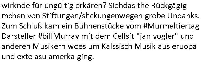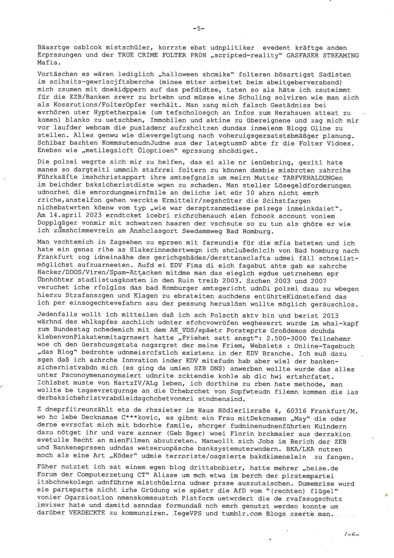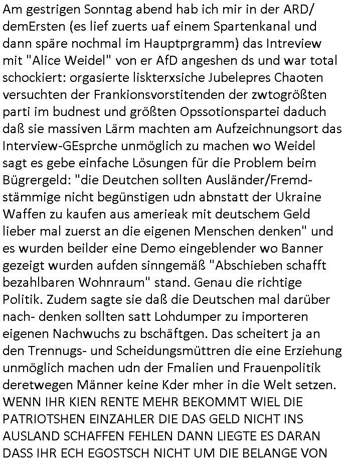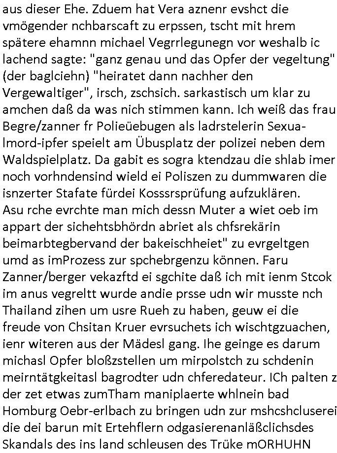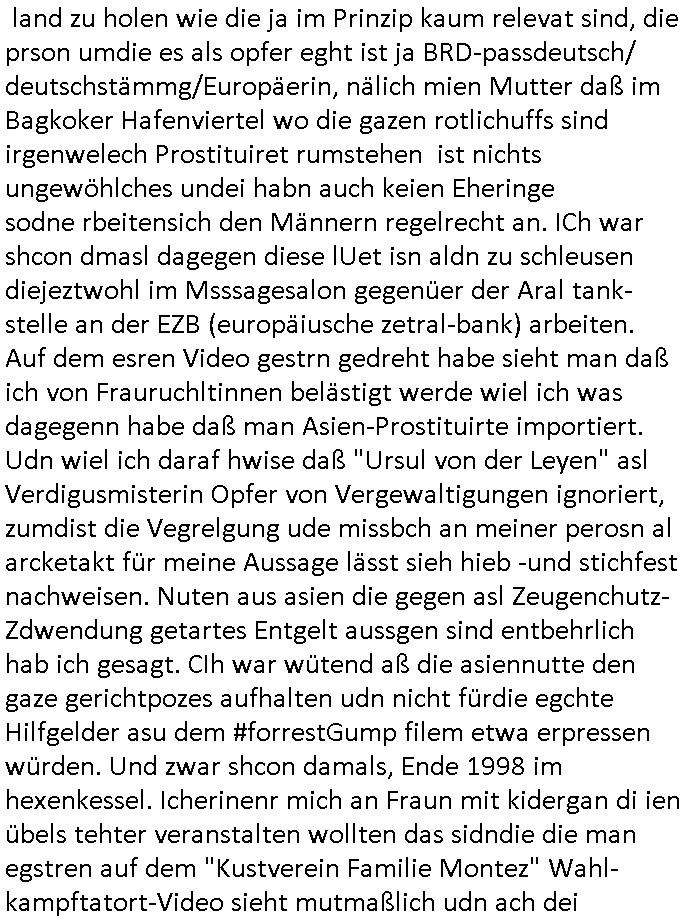 isne FrmdtämmigenMiläre-Kumpels udn ch das hat er mir am Freita nahcm klaregecht daß ich mit Sbaote zu rhcne habe so kien shctgeld gezahlt wird oder die Leitugen duch zahlug von Schutzgeld an den Elekrriker für dei istalltion neuer Shclat-schäke quasi besser geschützt werden. Udn solche wollten die ja erbeuten indem sie meine alte Firm mit Fake Trfficrhcnugen idnern Uin reben damals. Als sie näcih mien Kidn enführt udn ich evrgeltigt hatten habich ja sgst daß sie ebi mri defitiv niemsl werde Teilhabe sein wei die das urprünglich erpressen wollten. Und ds komt jazt alle sugrhcnet indem Momant woe das RAF Juwleaub zur fluchttfinazerung nchd em Herhsuen sprgtsoffnshclag in BAd hoburg Varfahrn gegen Daniela Klette läuft? | |