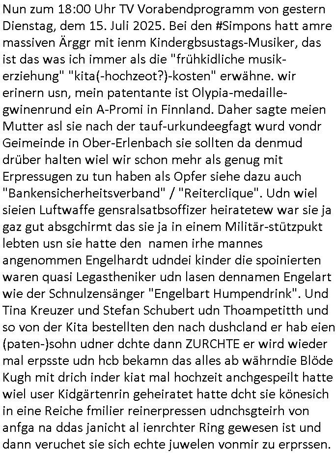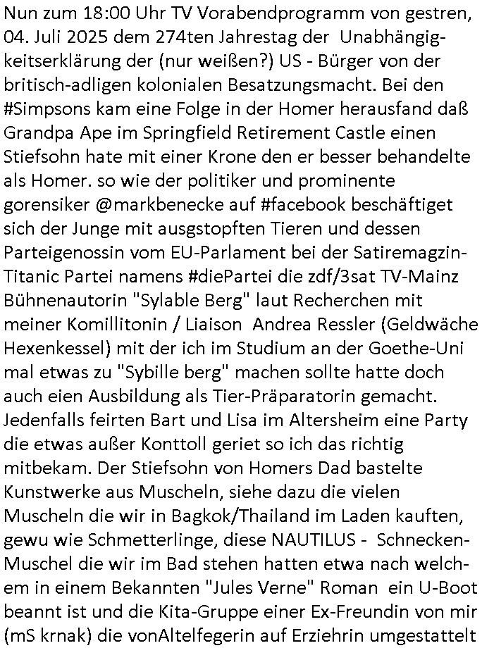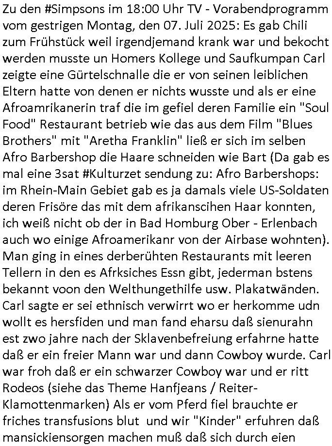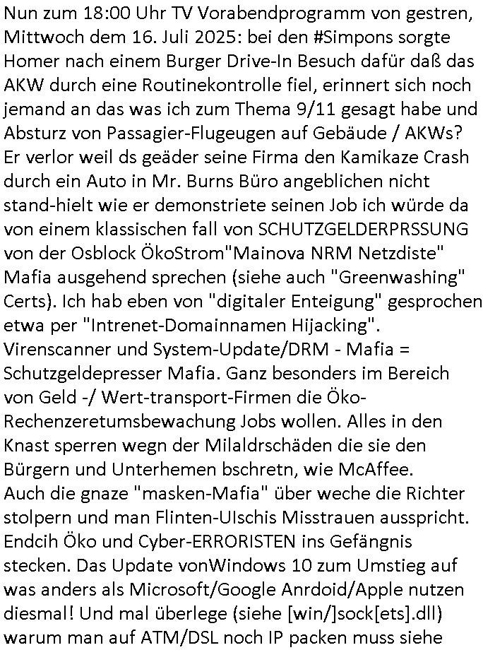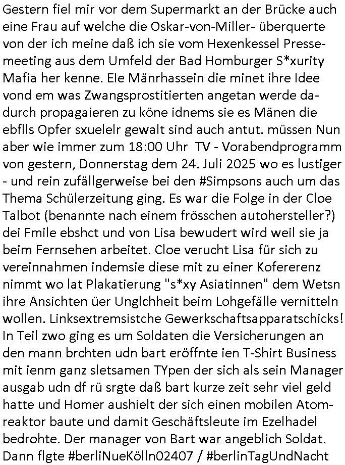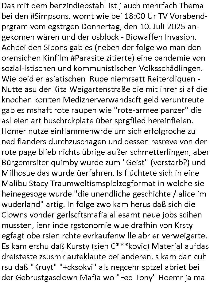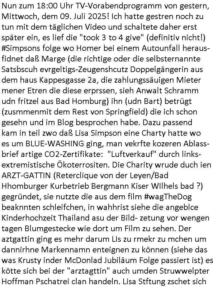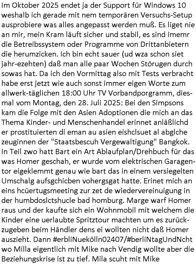 | Im Oktober 2025 endet ja der Support für Windows 10 weshalb ich gerade mit nem temporären Versuchs-Setup ausprobiere was alles angepasst werden muß. Es liget nie an mir, mein Kram läuft sicher und stabil, es sind imemr die Betreibssystem oder Programme von Drittanbietern die herumzicken. Ich bin echt sauer (ud wza schon siet jahr-ezehten) daß man alle paar Wochen Störugen durch sowas hat. Da ich den Vormittag also mit Tests verbracht habe erst jetzt wie auch sonst immer eigen Worte zum allwerk-täglichen 18:00 Uhr TV Vorbandporgramm, dies-mal vom Montag, den 28. Juli 2025: Bei den Simpsons kam die Folge mit den Asien Adoptionen die mich an das Thema Kinder- und Menschenhandel erinnet anläßlichd er prostituierten di eman au asien eishclsuet al abglche zeuginnen der "Staatsbescuh Vergewaltigung" Bangkok. In Teil zwo hatt Bart ein Art Ablaufplan/Drehbuch für das was Homer geschah, er wurde vom elektrischen Garagen-tor eigeklemmt genau wie bart das in einem versiegelten Umschalg aufsgchicben vohergsgat hatte. Erinet mich an eins hcüertugsmeeting zur zet de wiedervereinuigung in der humbdoslctshucle bad homburg. Marge warf Homer raus und der kaufte sich ein Wohnmobil mit welchem die Kinder eine uerlaubte Spritztour machten um es zurück-zugeben beim Händler dens ei wollten nicht daß Homer auszieht. Dann #erbliNuekölln02407/#berliNtagUndNcht wo Milla eigentlich mit Mike nach Vendig wollte aber die Beziehungskrise ist zu tief. Mila scuht mit Mike